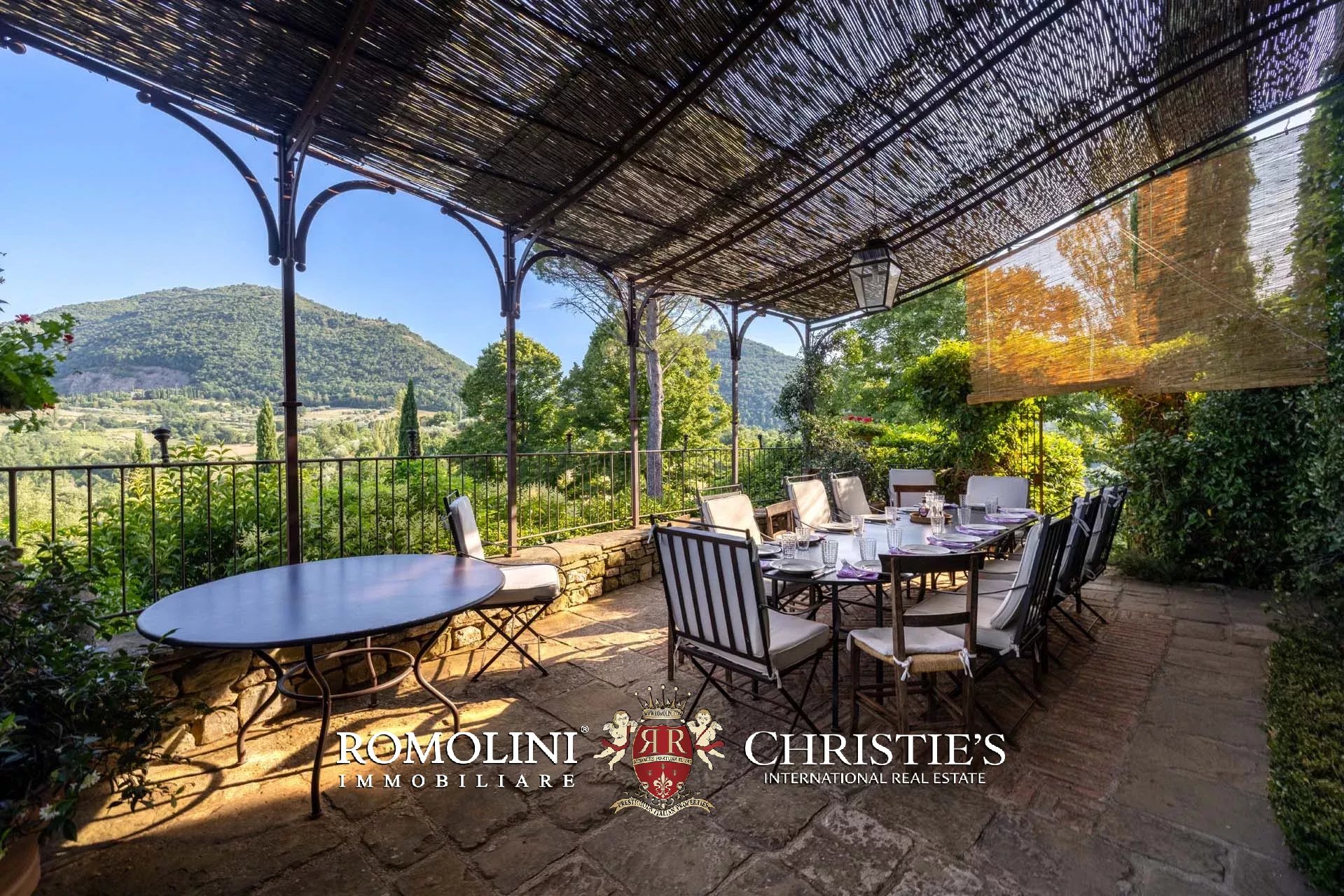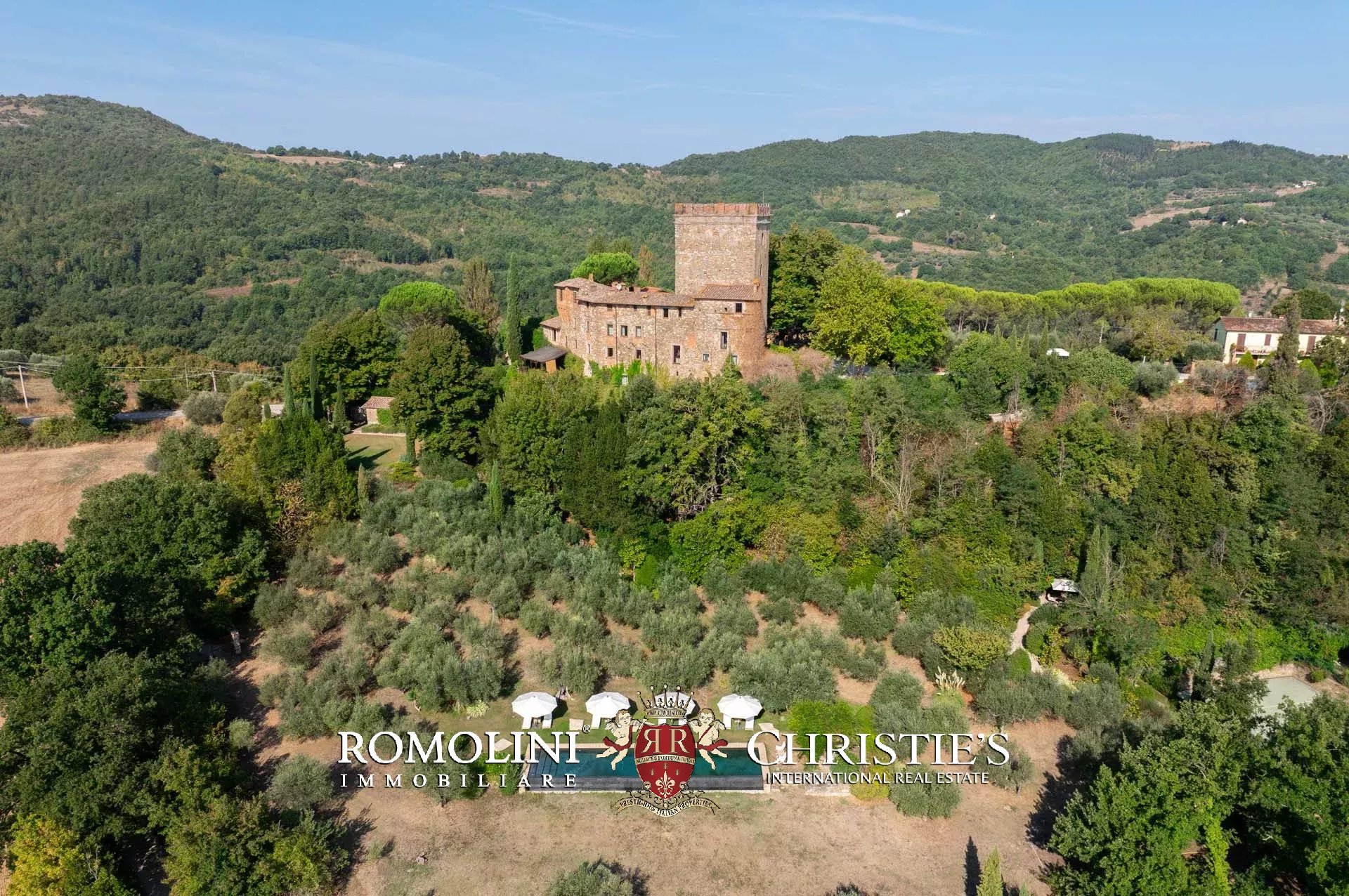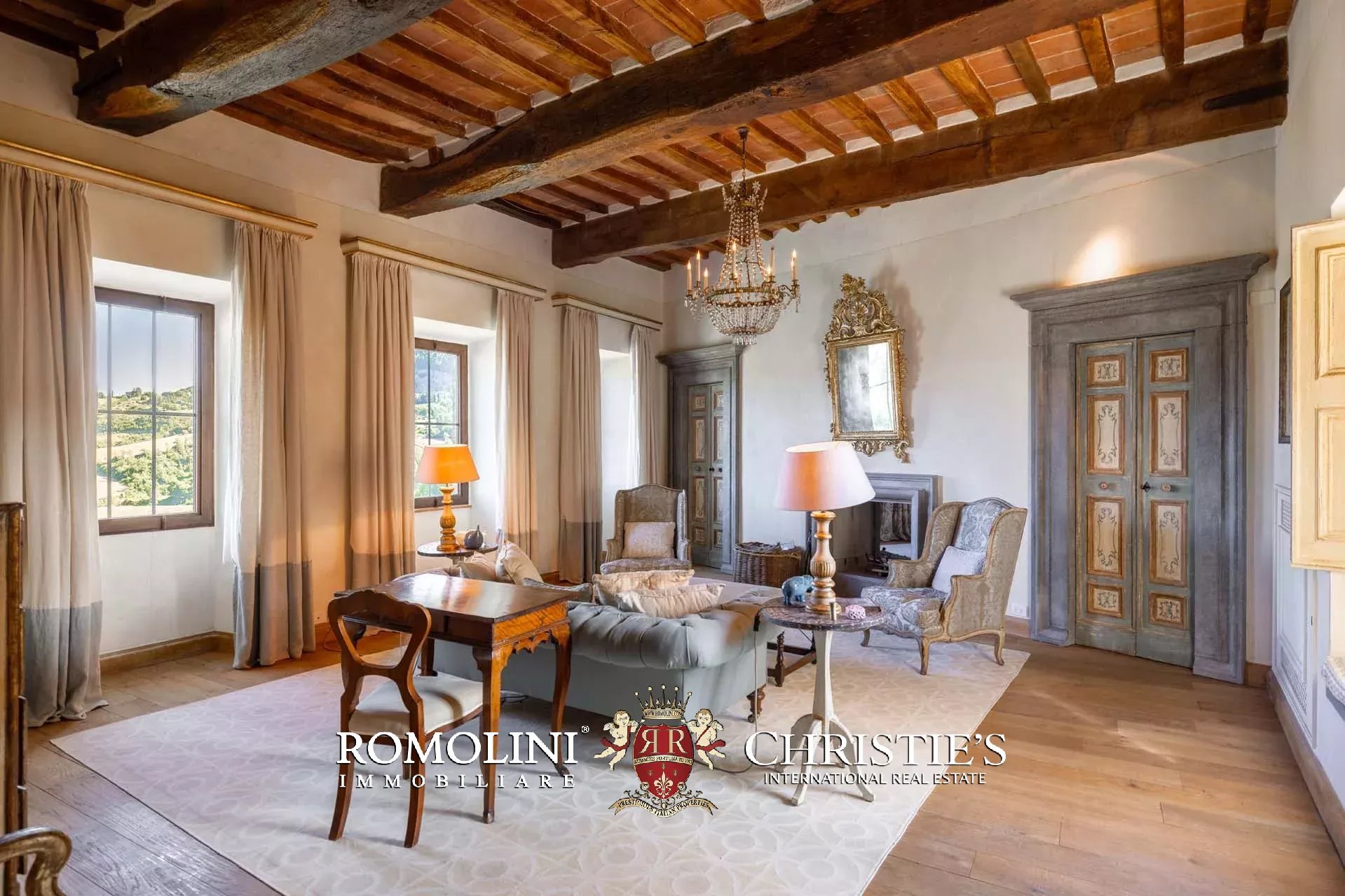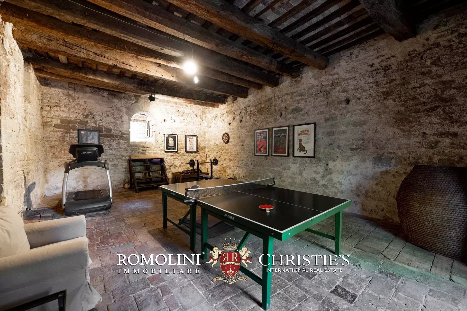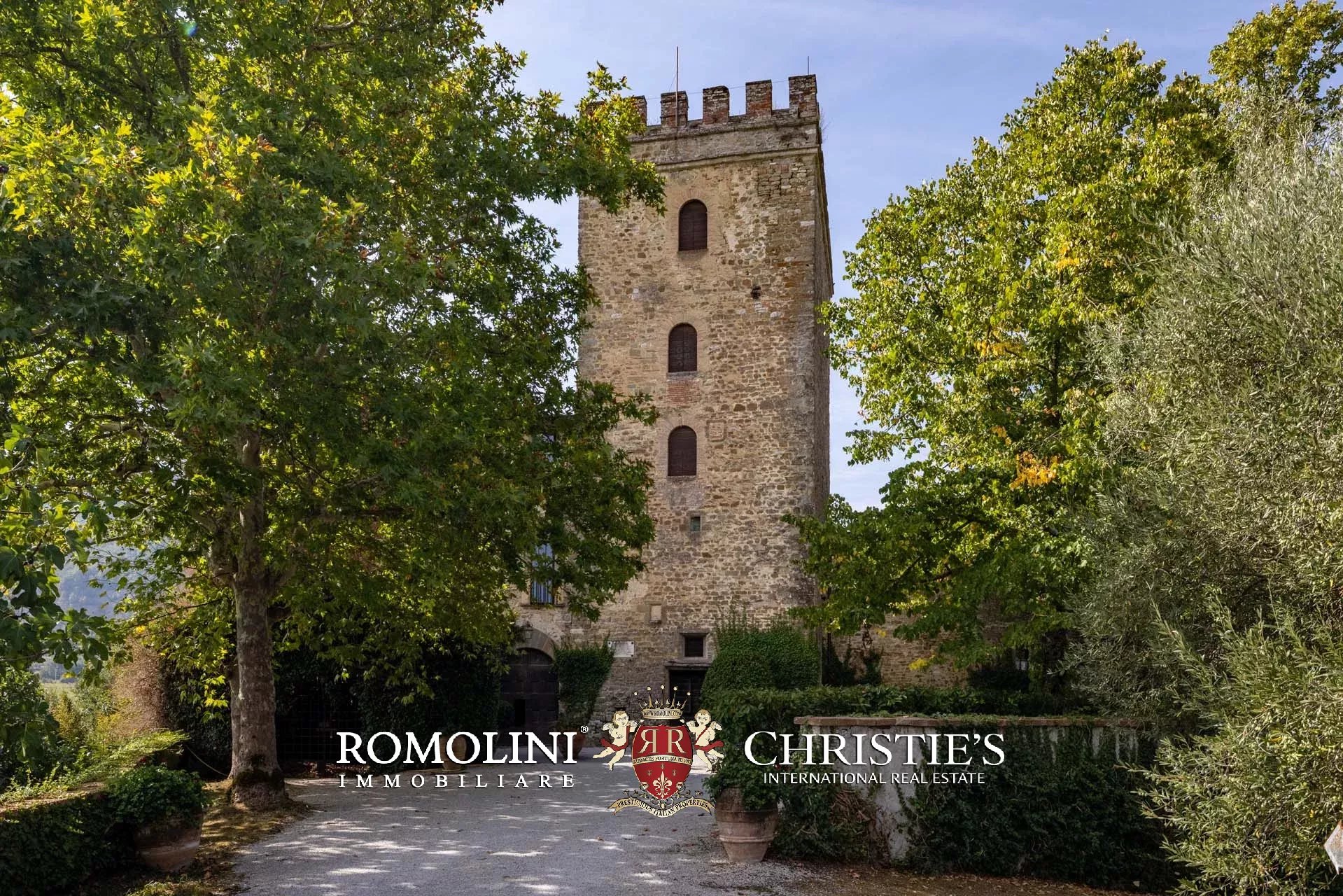 In a very panoramic position in the hills of Umbria, a few kilometers from Perugia, restored medieval castle for sale. The building (over 2,600 m²) boasts a history dating back almost a thousand years and has been finely restored by the current owners, who have turned it into a luxury residence with 21 guest bedrooms. Over 55.0 ha of land surrounds the building and includes a tennis court, infinity pool, and olive trees.