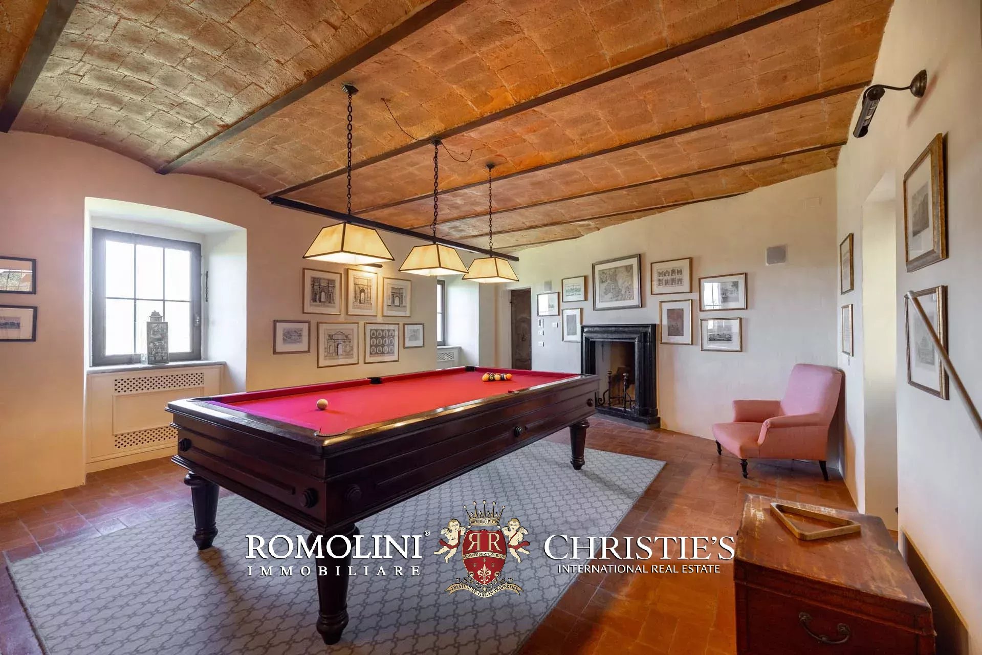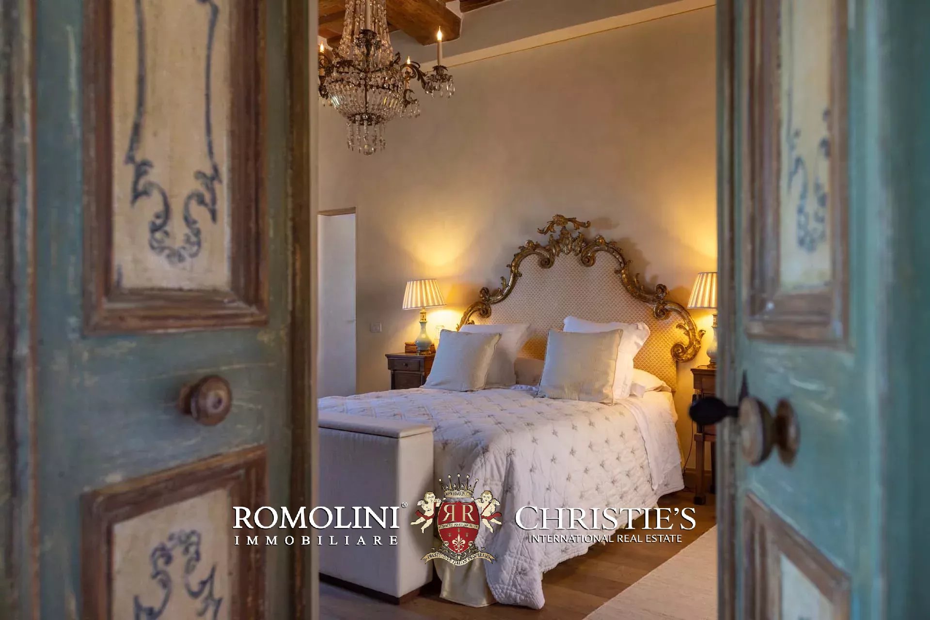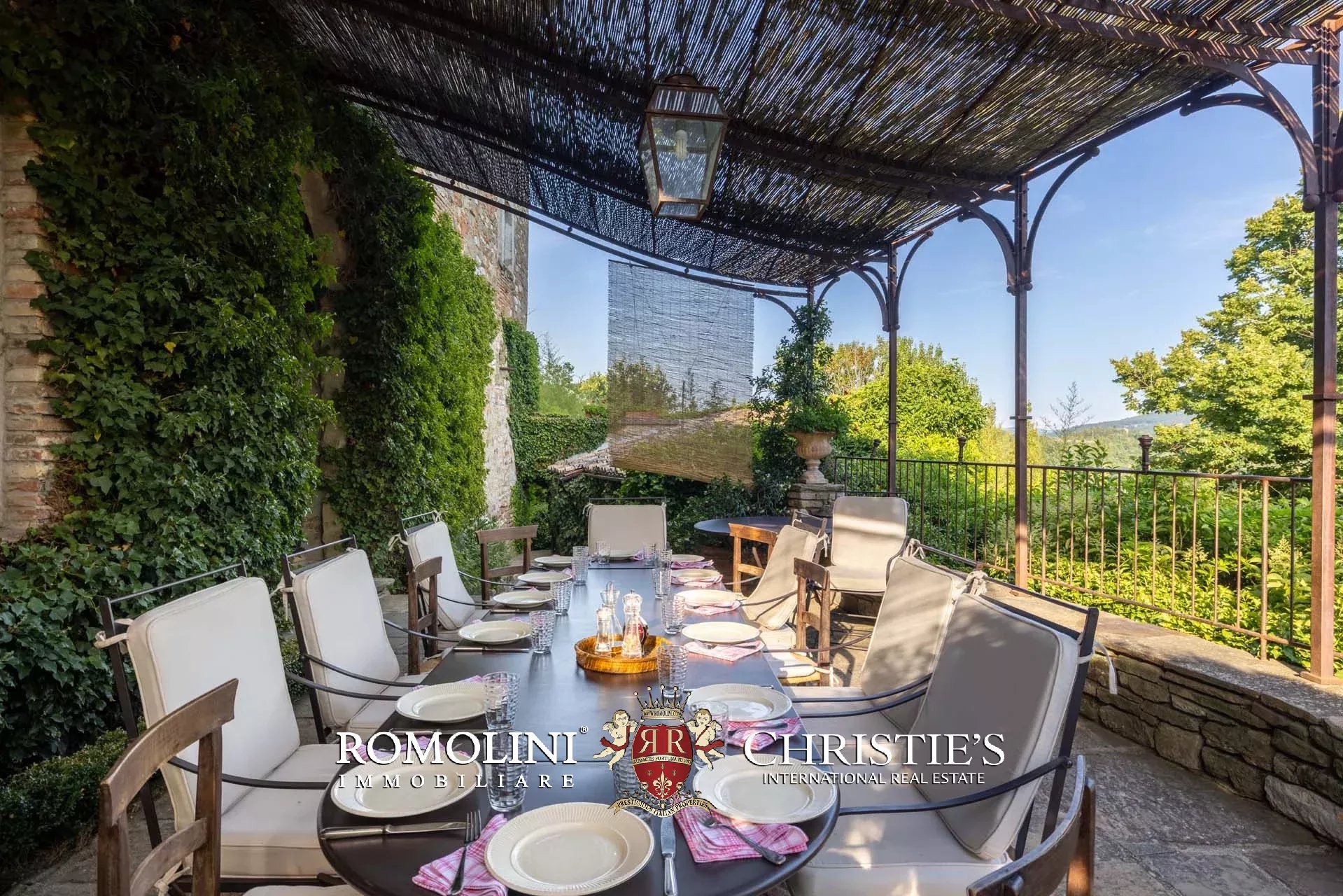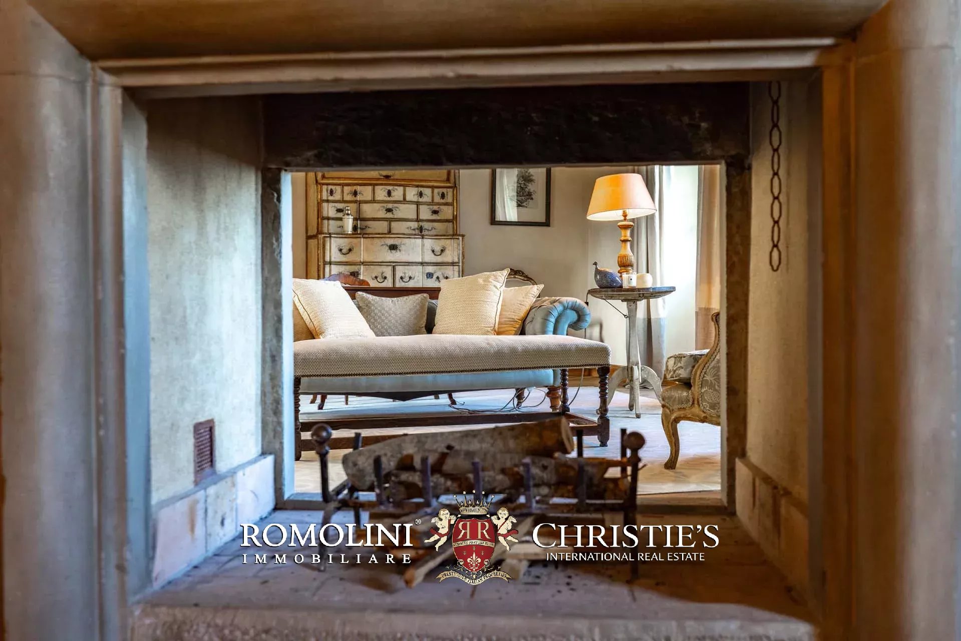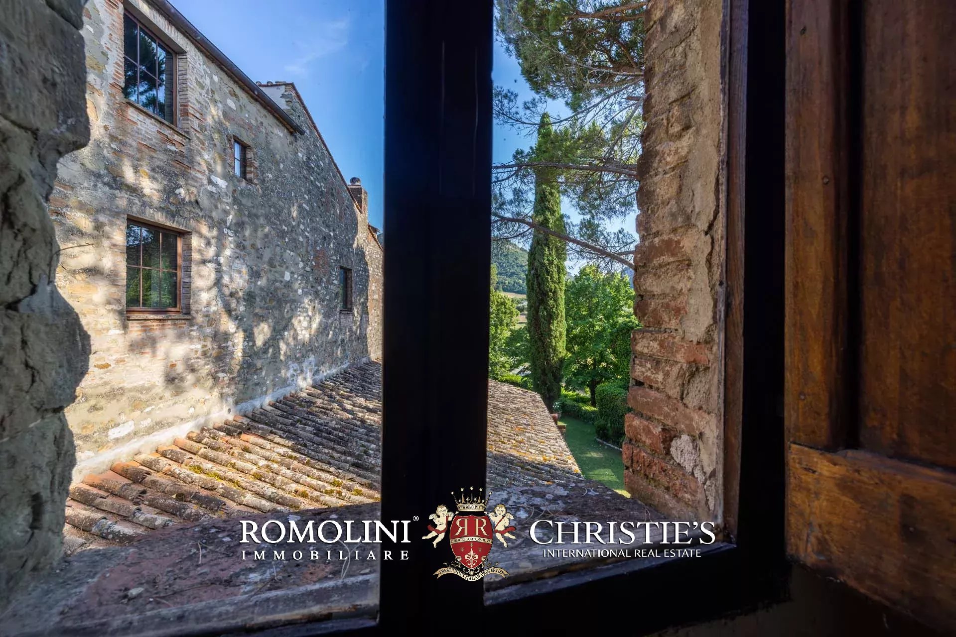 In a very panoramic position in the hills of Umbria, a few kilometers from Perugia, restored medieval castle for sale. The building (over 2,600 m²) boasts a history dating back almost a thousand years and has been finely restored by the current owners, who have turned it into a luxury residence with 21 guest bedrooms. Over 55.0 ha of land surrounds the building and includes a tennis court, infinity pool, and olive trees.