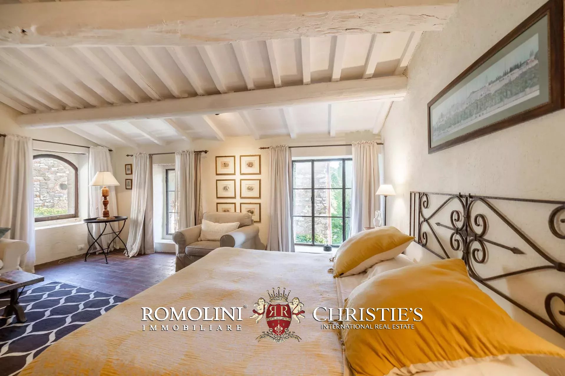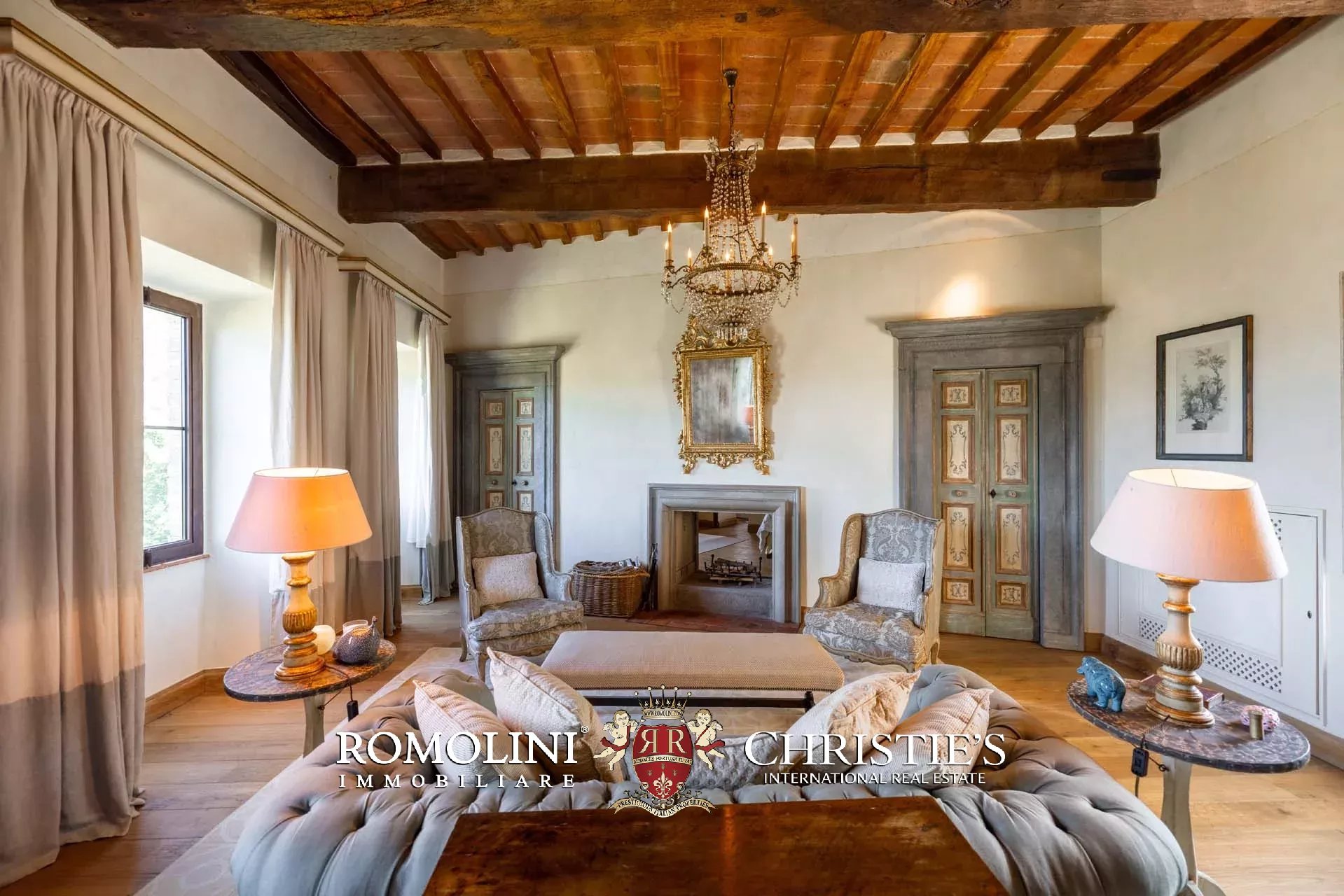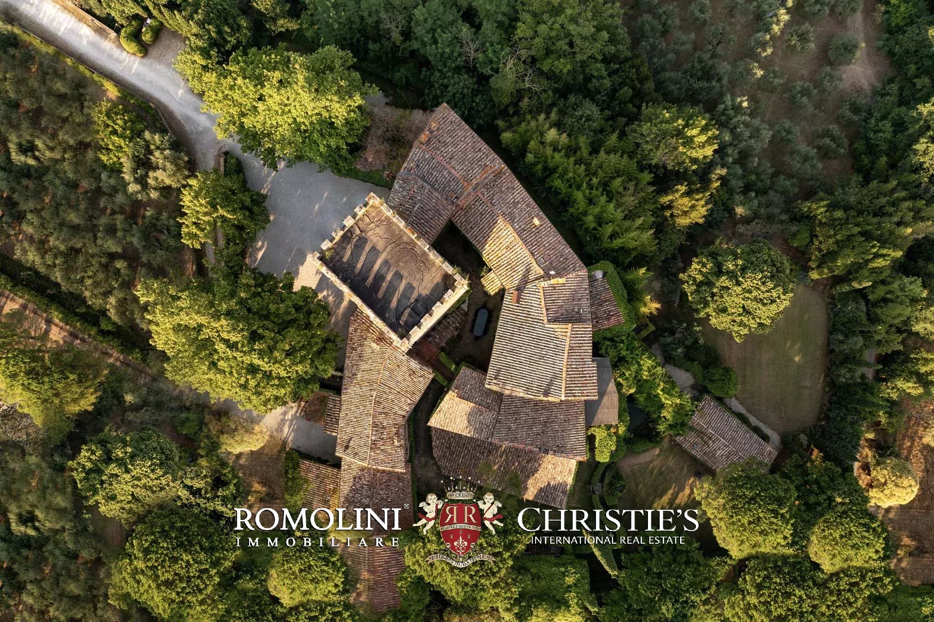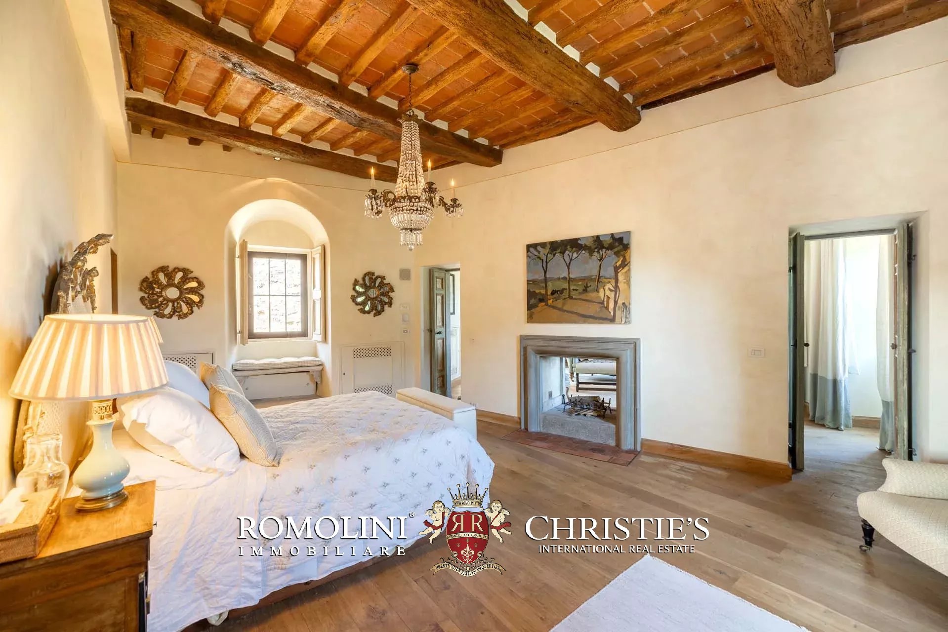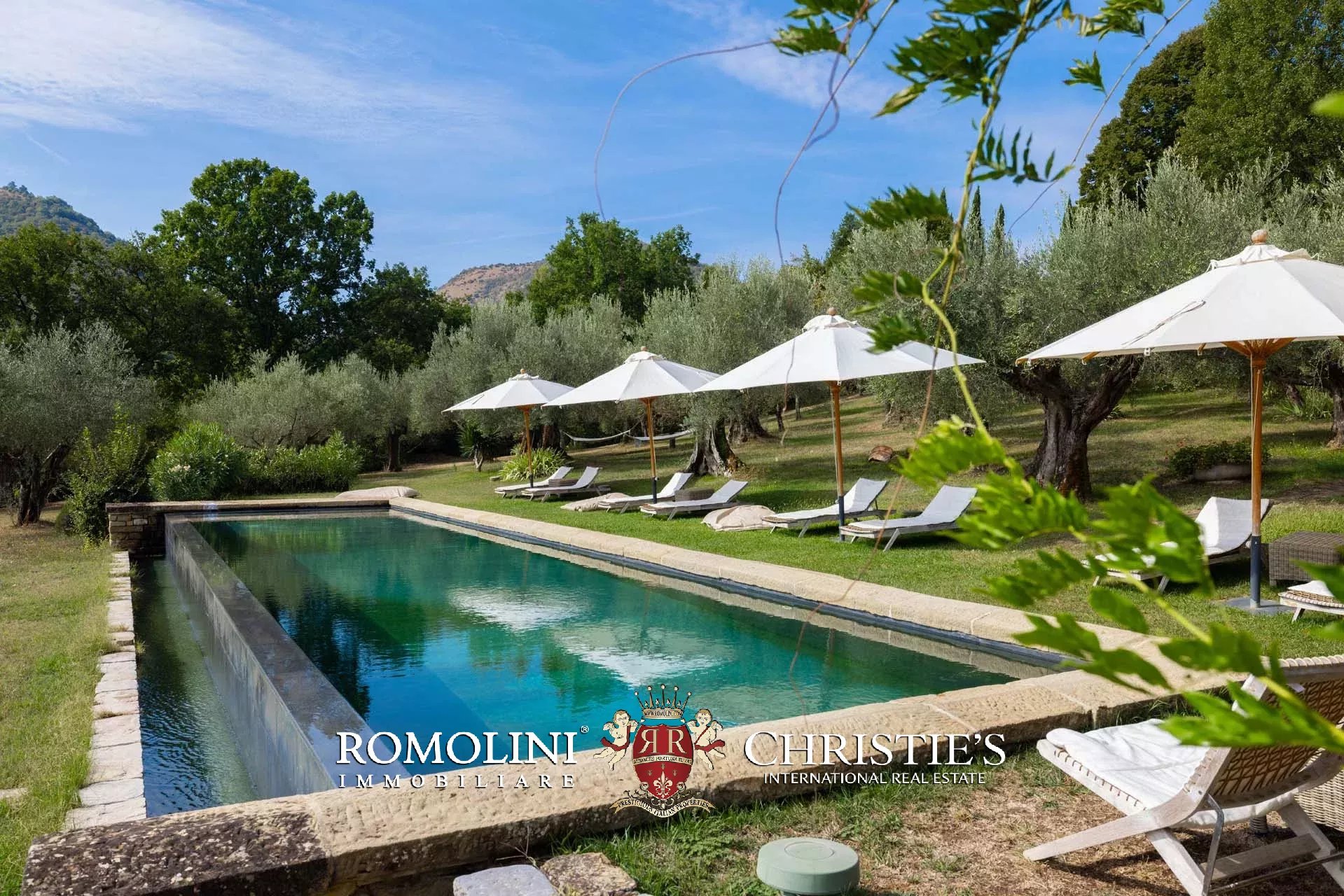 In a very panoramic position in the hills of Umbria, a few kilometers from Perugia, restored medieval castle for sale. The building (over 2,600 m²) boasts a history dating back almost a thousand years and has been finely restored by the current owners, who have turned it into a luxury residence with 21 guest bedrooms. Over 55.0 ha of land surrounds the building and includes a tennis court, infinity pool, and olive trees.