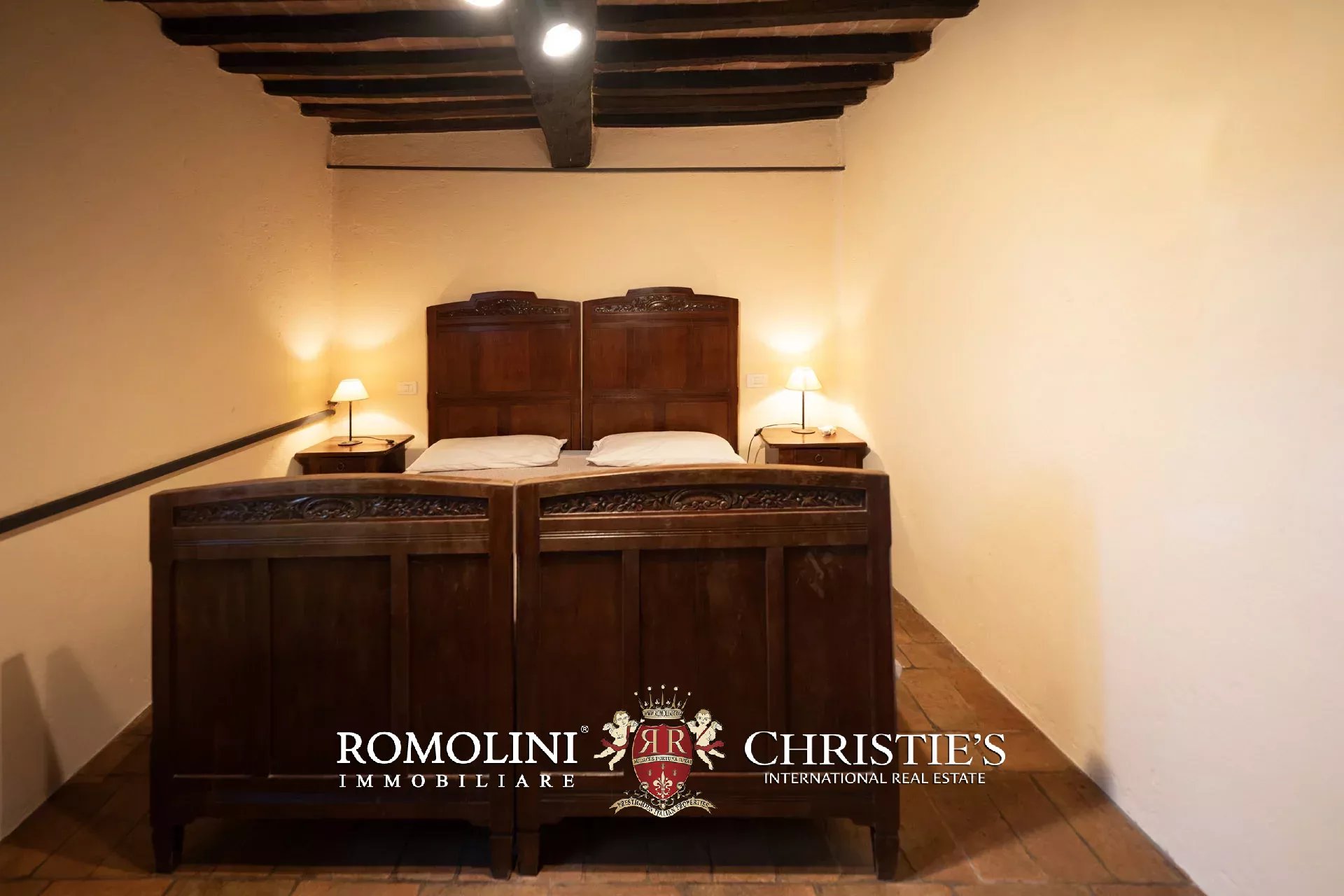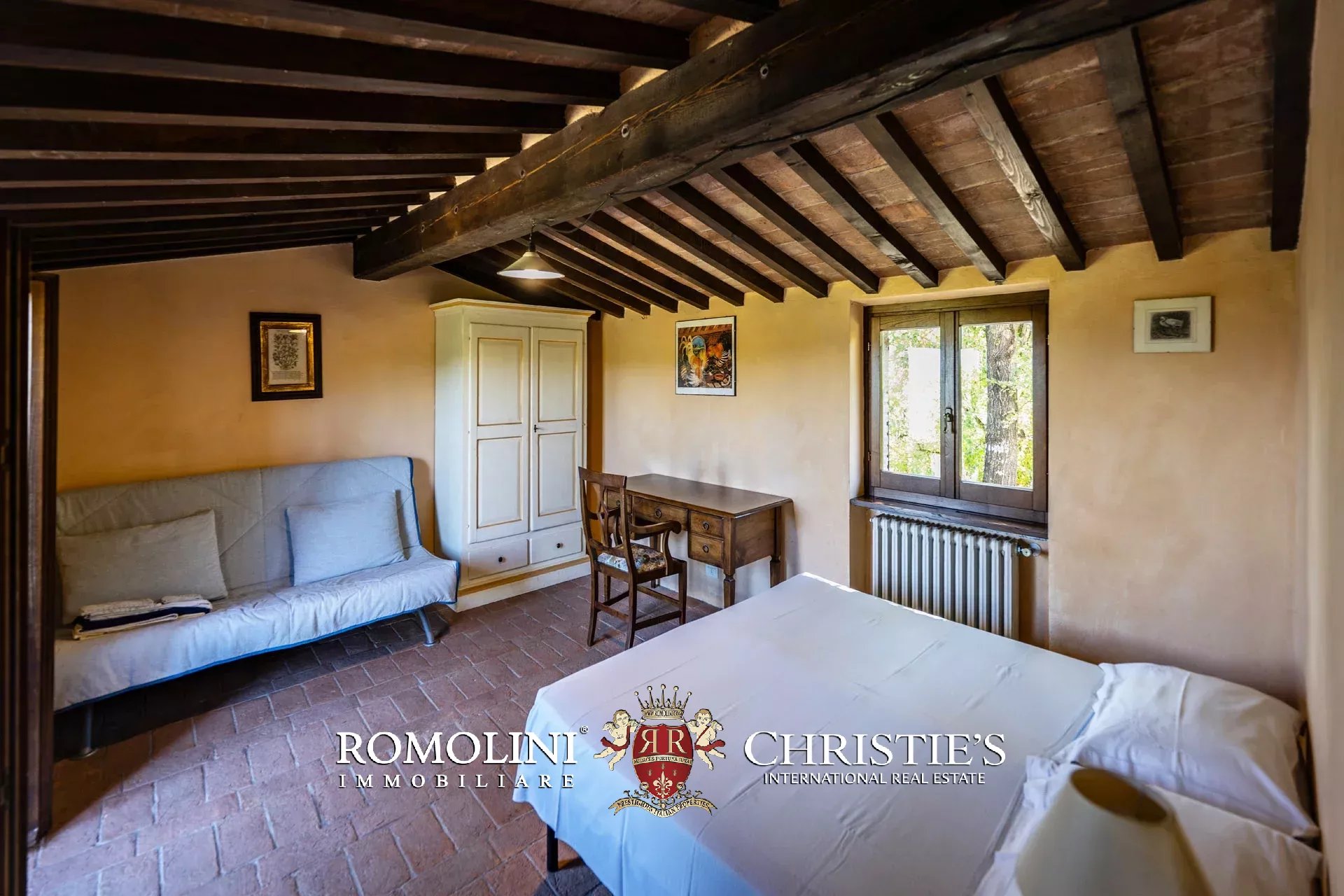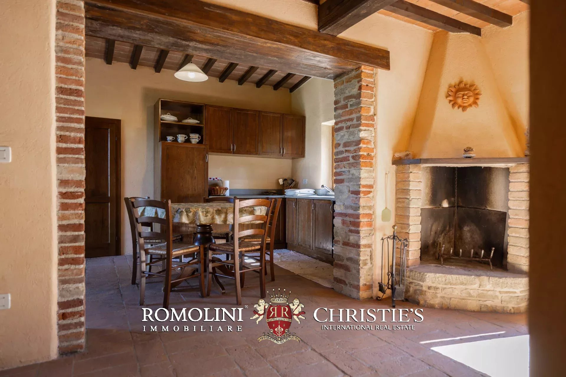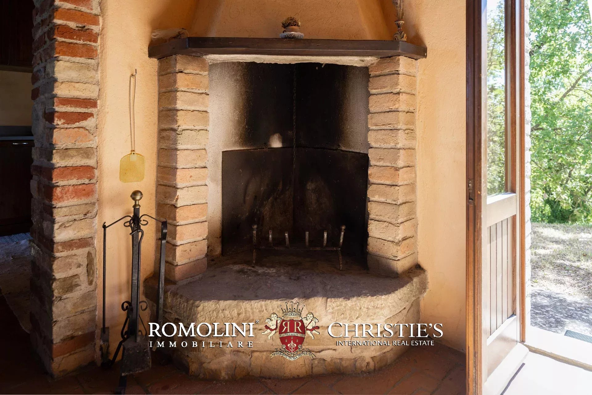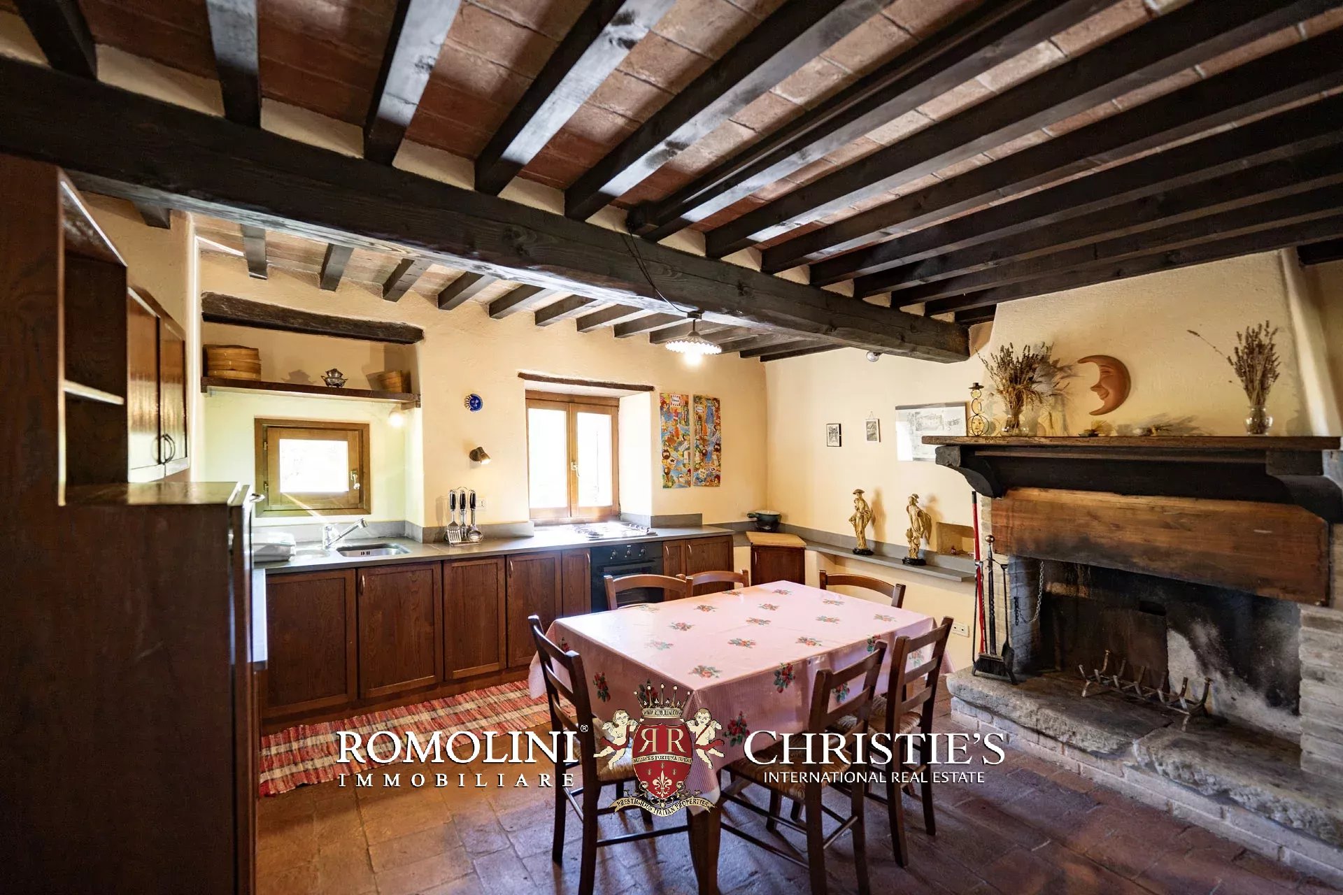 The interior spaces preserve intact the elegance of the original finishes thanks to a careful and respectful restoration. Tuscan terracotta floors, exposed chestnut beams, period fireplaces and stone walls give warmth and authenticity to the rooms. Furnishings, composed partly of early 20th-century furniture and partly of creations by local artisans, are included in the sale. Large openings encourage natural light and frame striking views of the surrounding countryside.