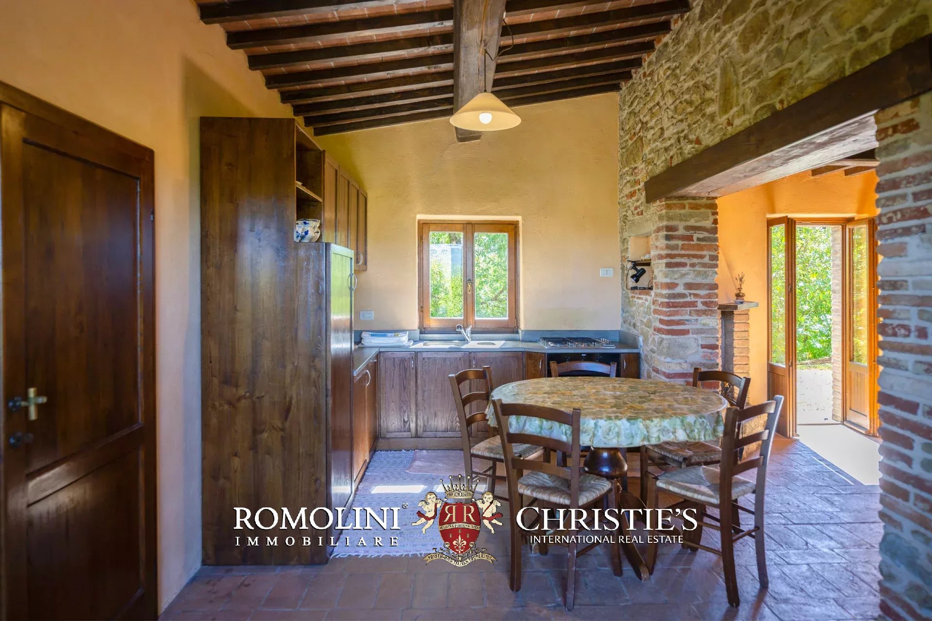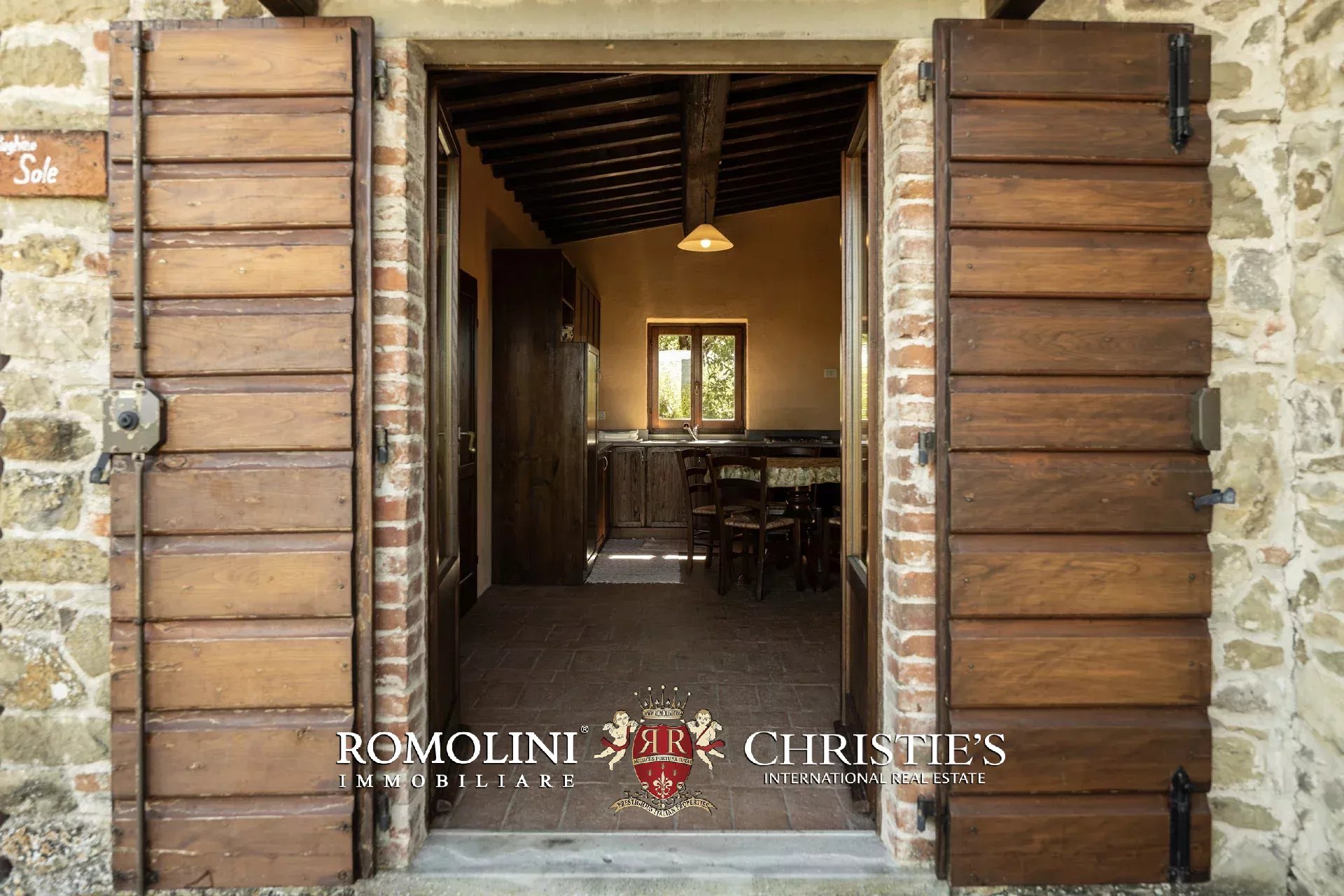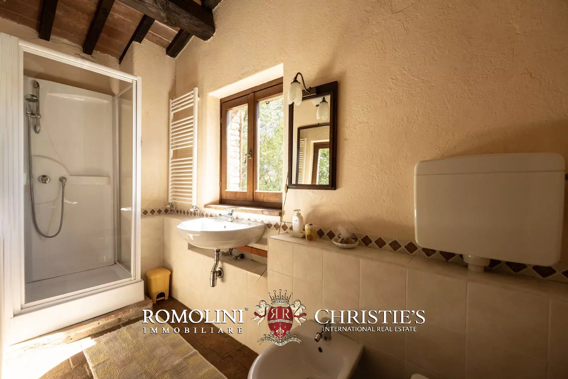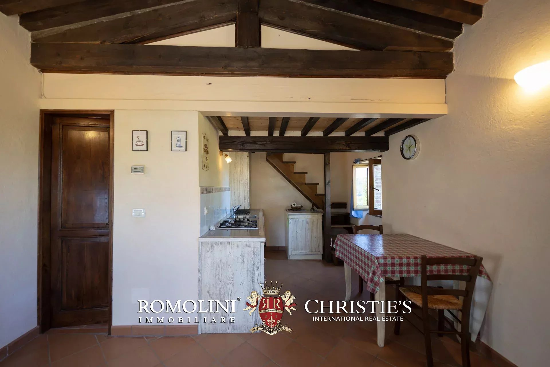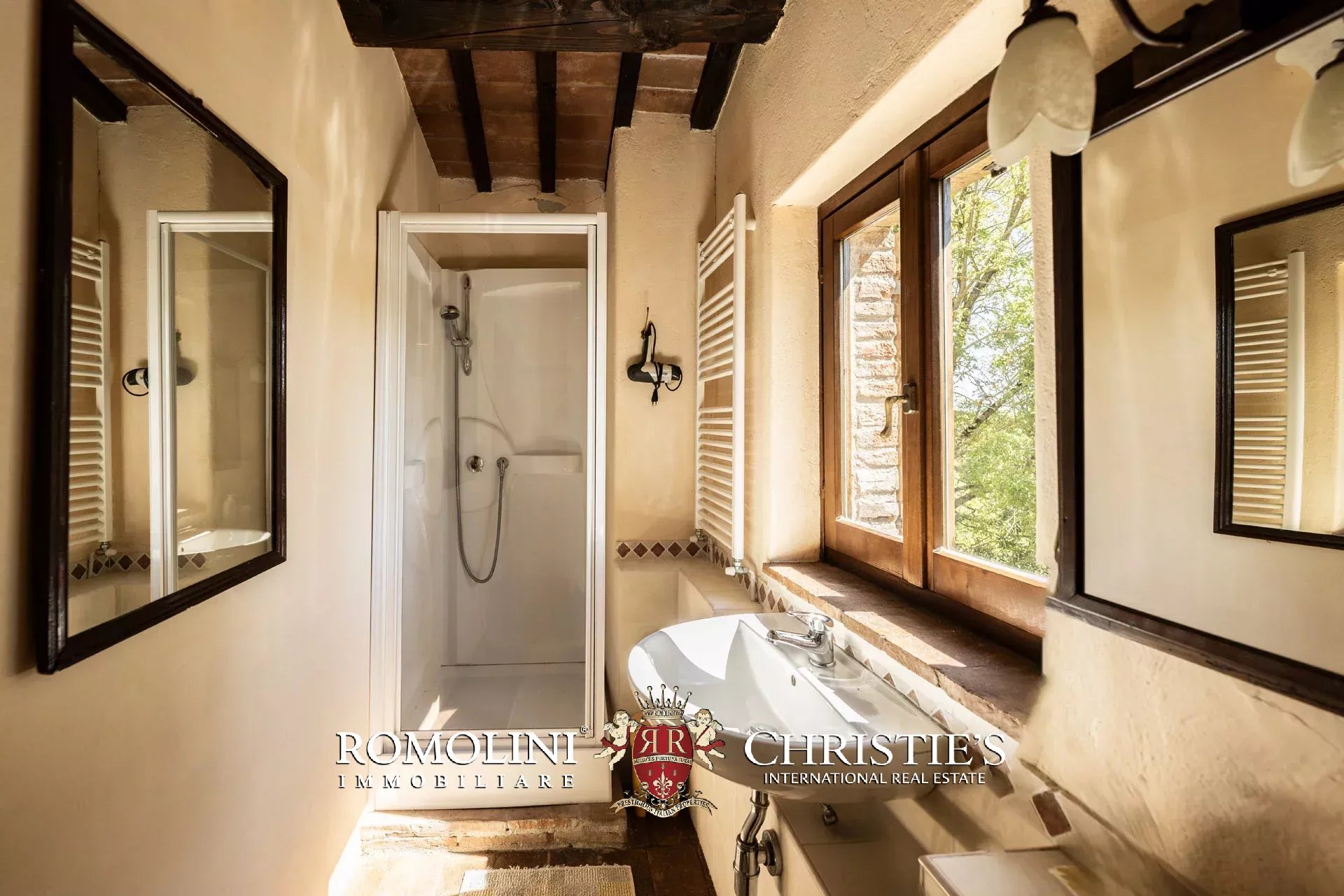 The interior spaces preserve intact the elegance of the original finishes thanks to a careful and respectful restoration. Tuscan terracotta floors, exposed chestnut beams, period fireplaces and stone walls give warmth and authenticity to the rooms. Furnishings, composed partly of early 20th-century furniture and partly of creations by local artisans, are included in the sale. Large openings encourage natural light and frame striking views of the surrounding countryside.