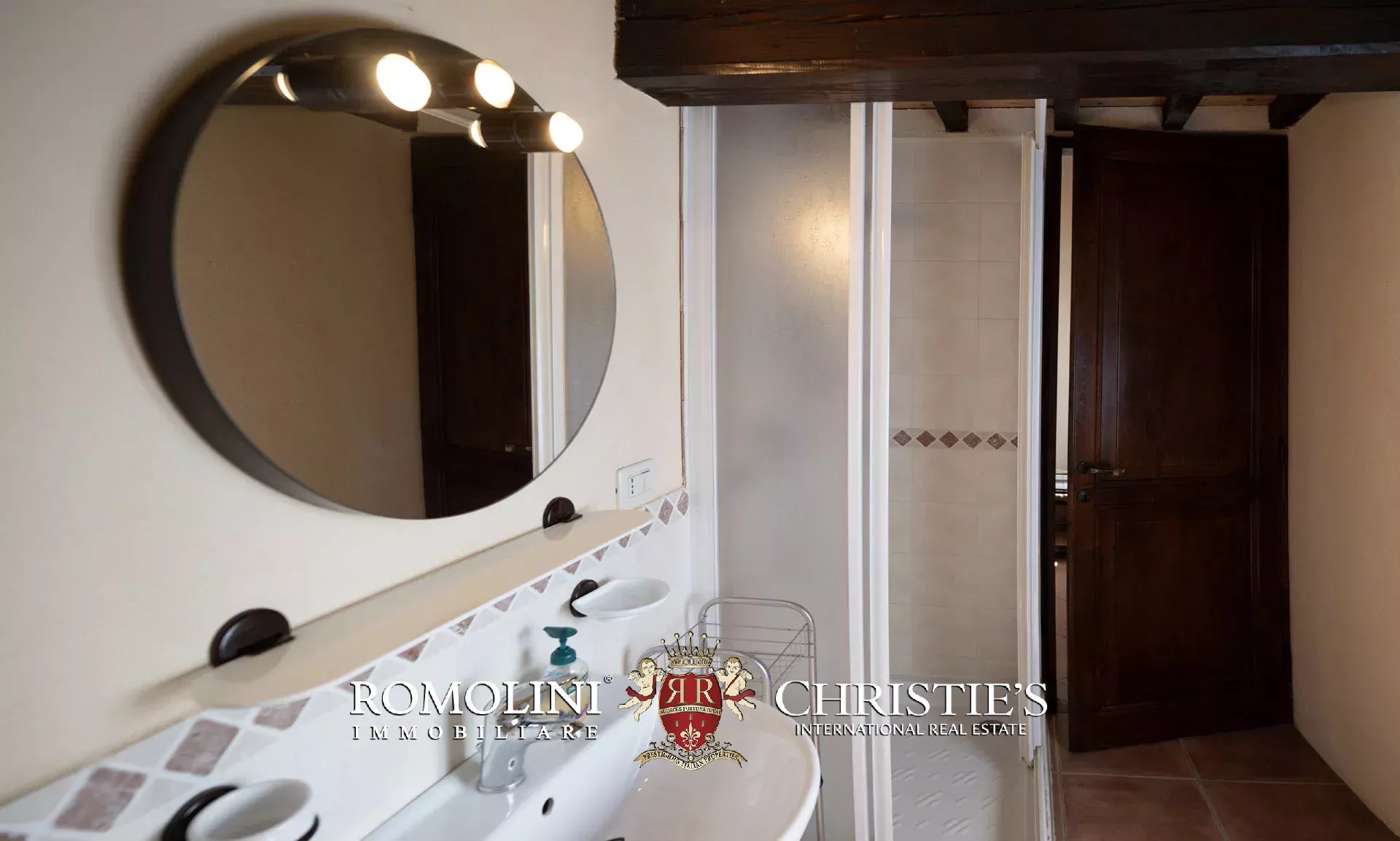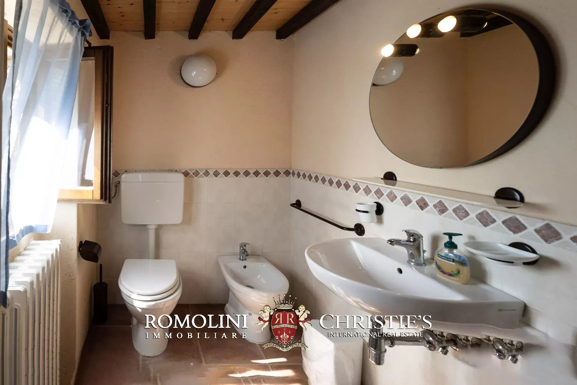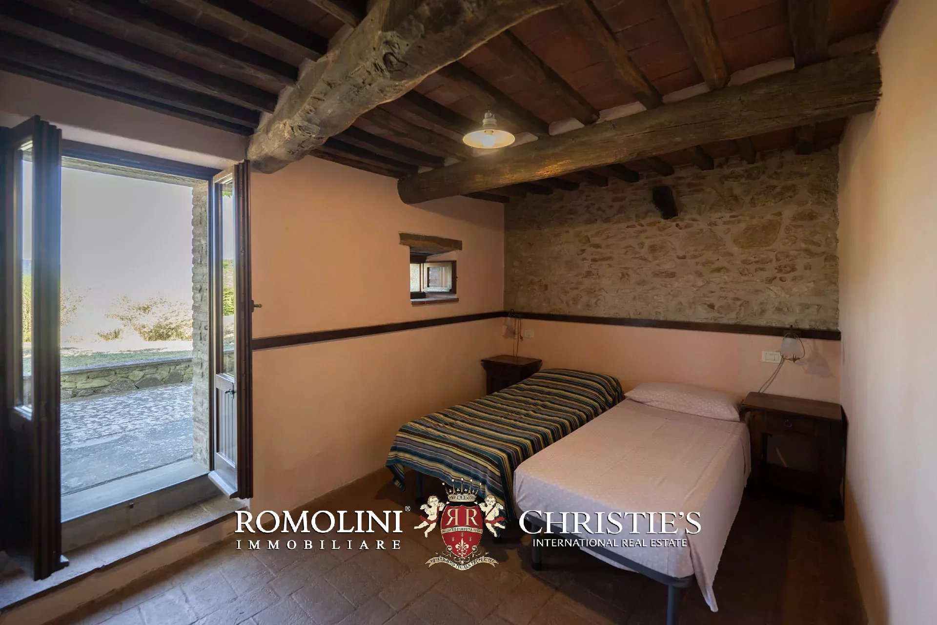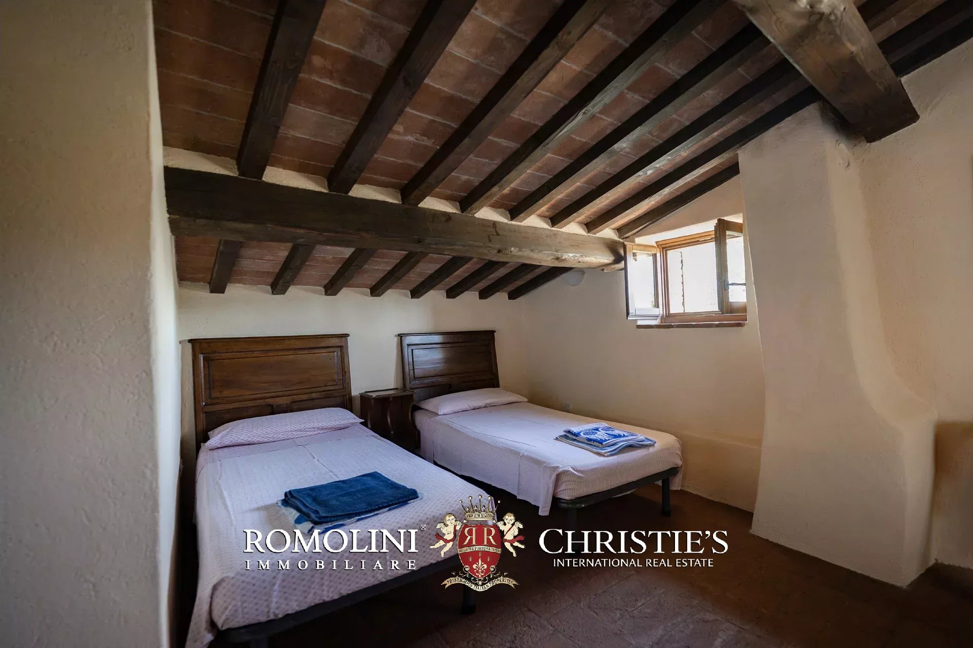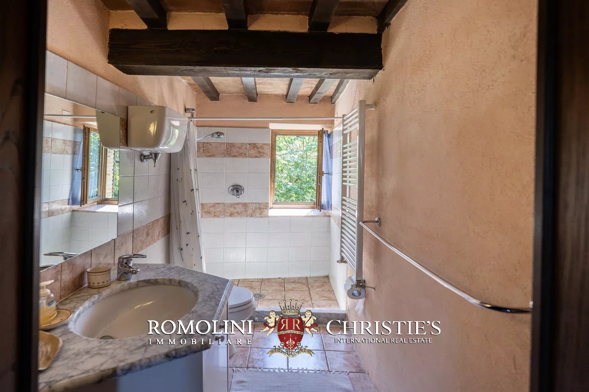 The interior spaces preserve intact the elegance of the original finishes thanks to a careful and respectful restoration. Tuscan terracotta floors, exposed chestnut beams, period fireplaces and stone walls give warmth and authenticity to the rooms. Furnishings, composed partly of early 20th-century furniture and partly of creations by local artisans, are included in the sale. Large openings encourage natural light and frame striking views of the surrounding countryside.