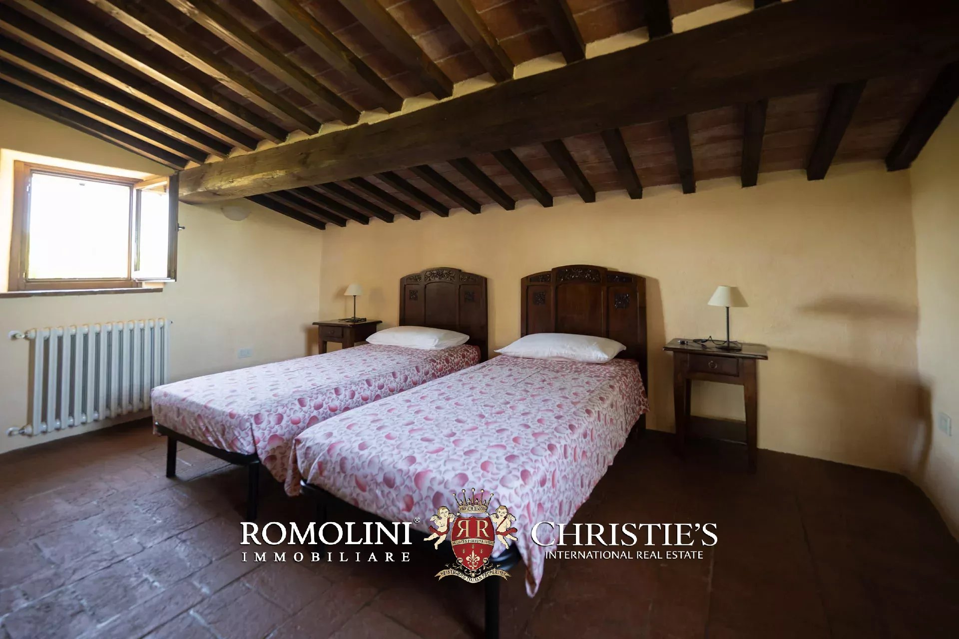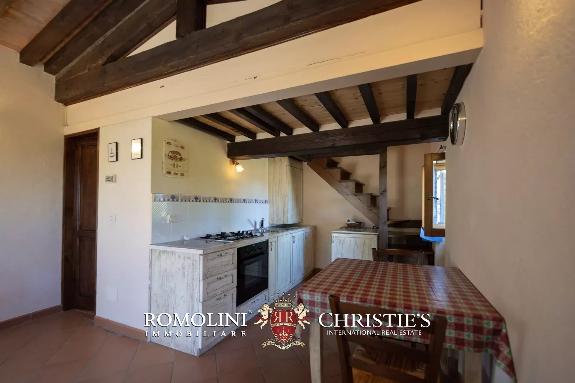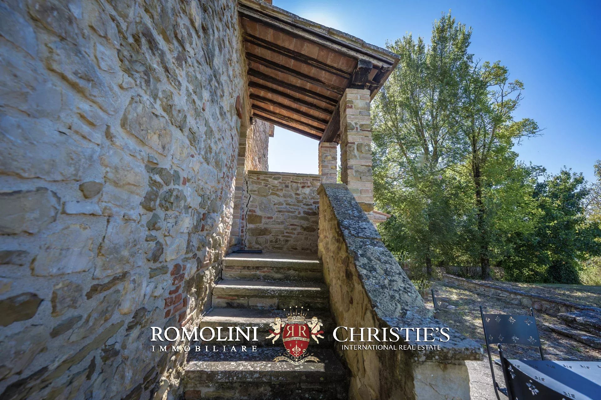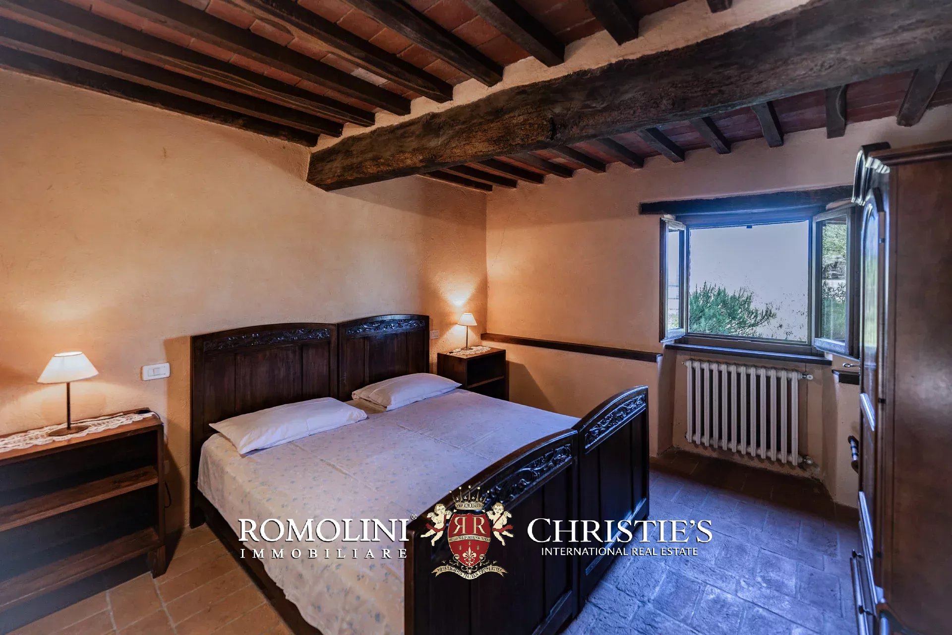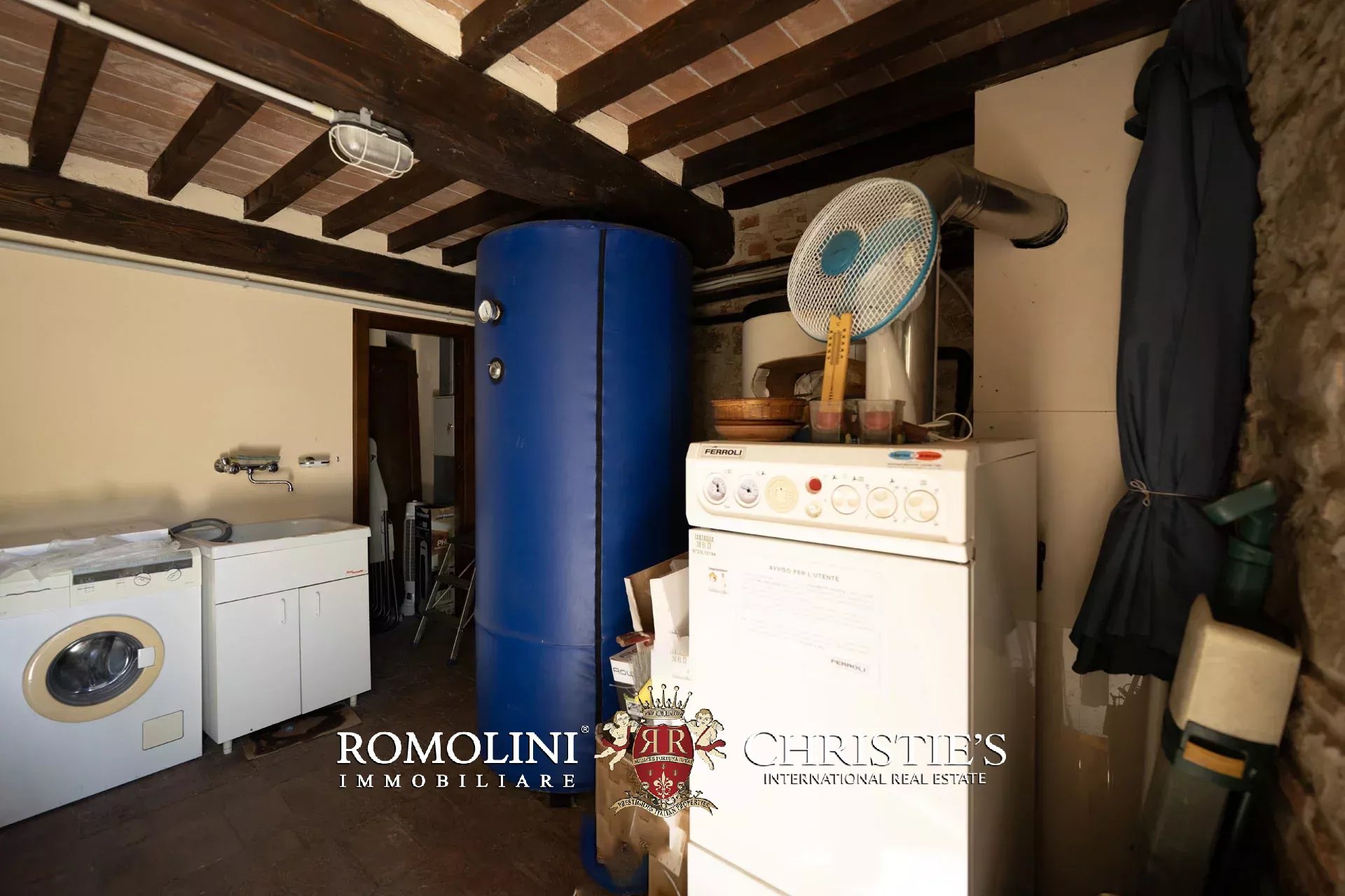 The interior spaces preserve intact the elegance of the original finishes thanks to a careful and respectful restoration. Tuscan terracotta floors, exposed chestnut beams, period fireplaces and stone walls give warmth and authenticity to the rooms. Furnishings, composed partly of early 20th-century furniture and partly of creations by local artisans, are included in the sale. Large openings encourage natural light and frame striking views of the surrounding countryside.