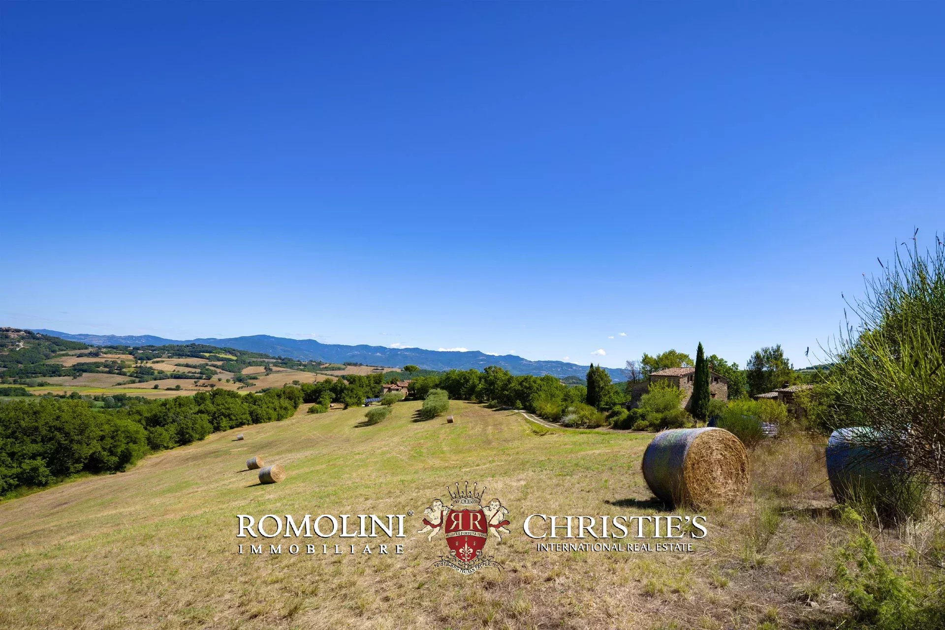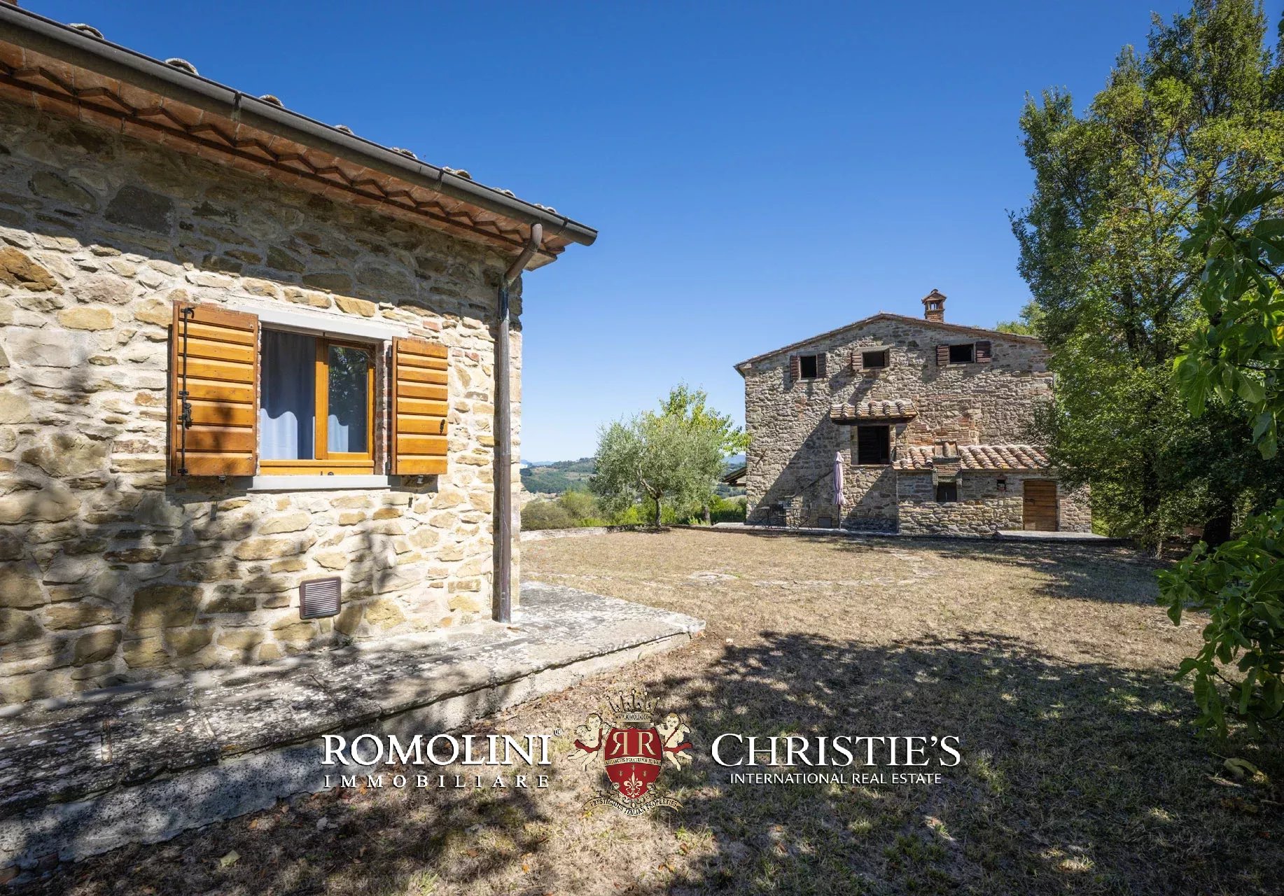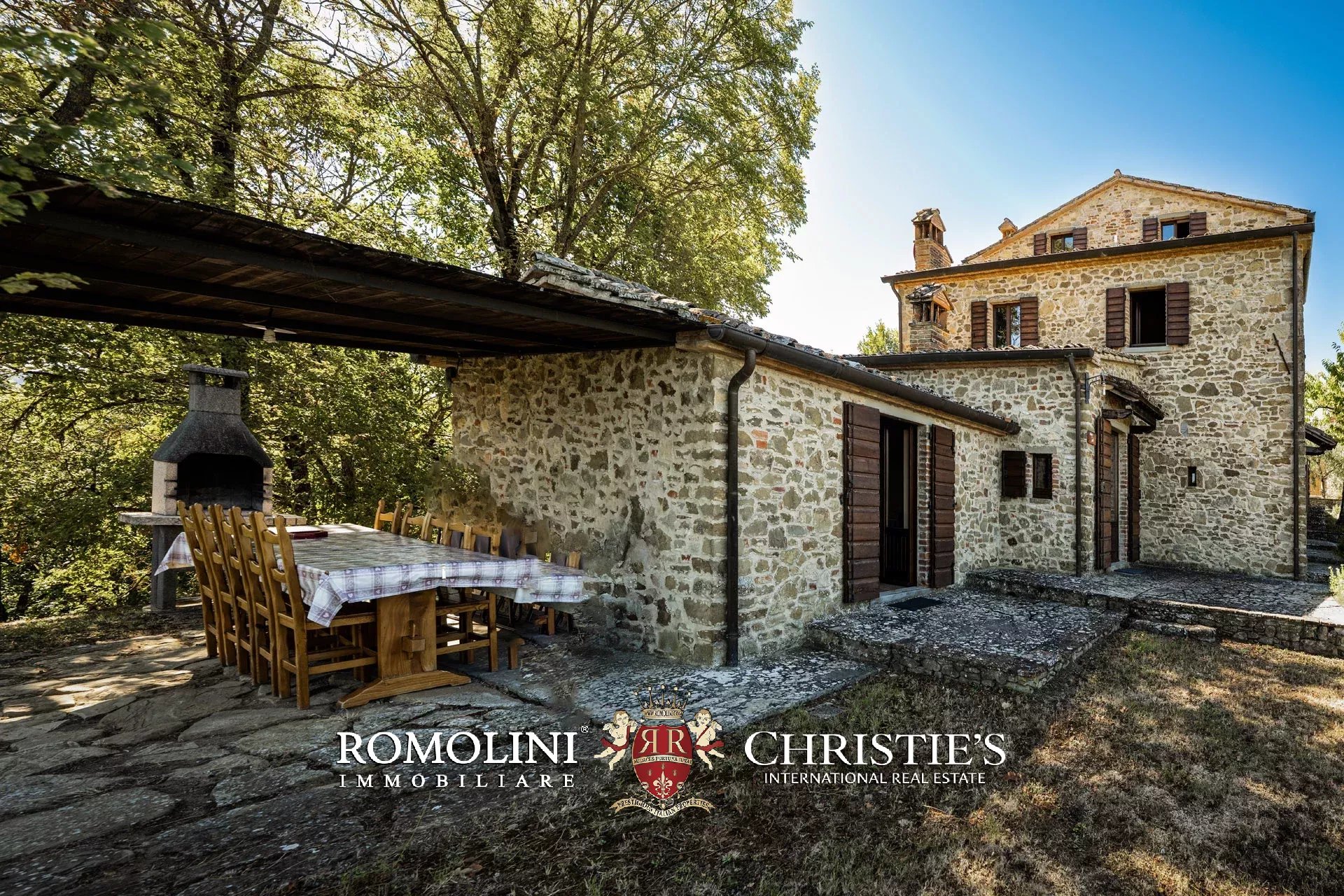 Nestled among the rolling hills of Tiber Valley, in a dominant and panoramic position overlooking the picturesque medieval town of Monterchi, stone farmhouse with dependance for sale. The property is in excellent condition and currently includes four guest apartments immersed in a wooded park of 5,300 m² with swimming pool.