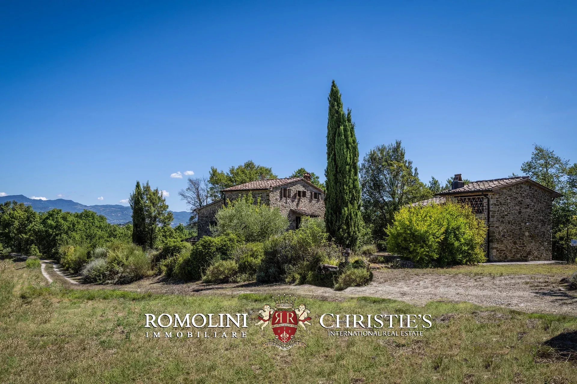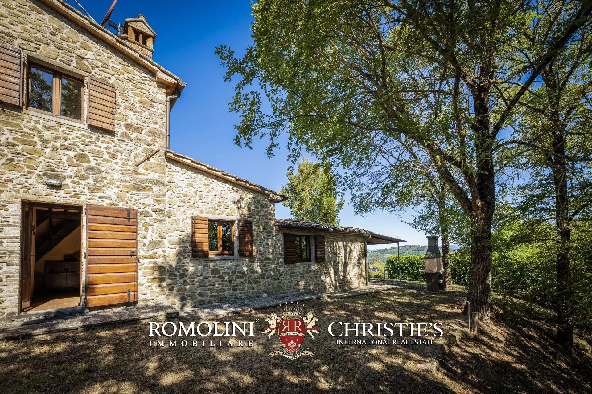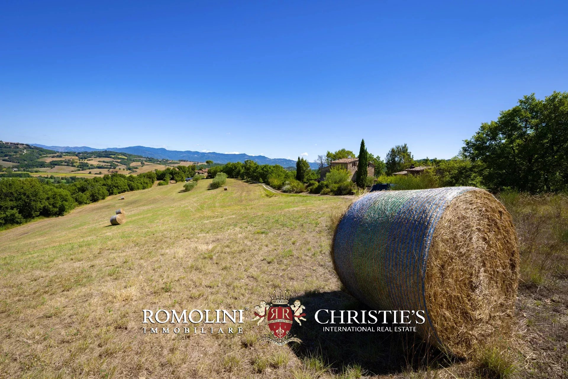 Nestled among the rolling hills of Tiber Valley, in a dominant and panoramic position overlooking the picturesque medieval town of Monterchi, stone farmhouse with dependance for sale. The property is in excellent condition and currently includes four guest apartments immersed in a wooded park of 5,300 m² with swimming pool.