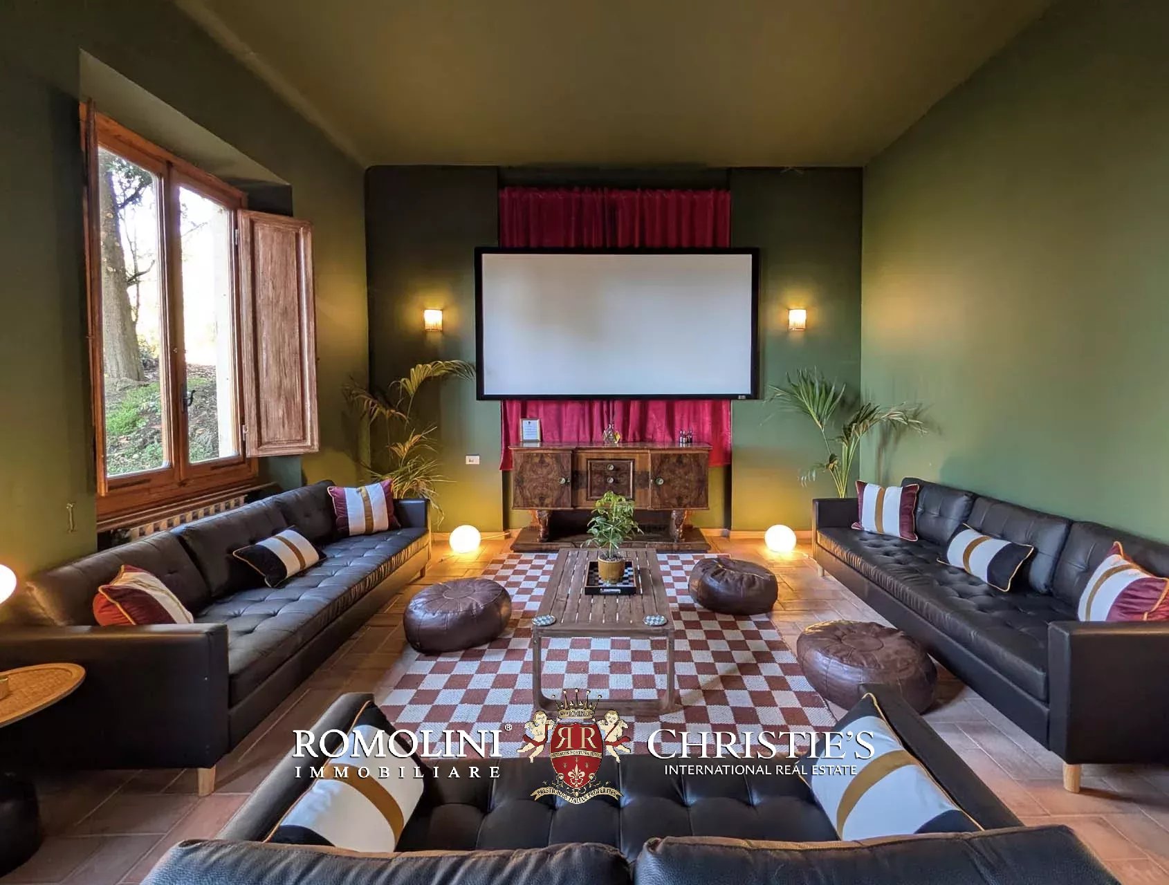 You enter directly into the piano nobile via a grand external staircase, arriving into a reception space that opens into the lounge, dining area, sun room and snug. This beautifully styled open space bathes in exceptional natural light thanks to the nine windows and French doors which these areas share. The corridor beyond connects to the generously sized kitchen & bar, which has its own access to the east-facing terrace for external dining. Continuing on, you find the games room, gym, library, a bathroom, and finally a spacious cinema designed in the art deco style.