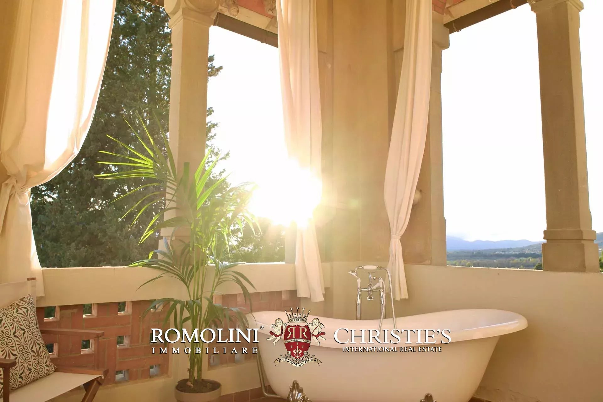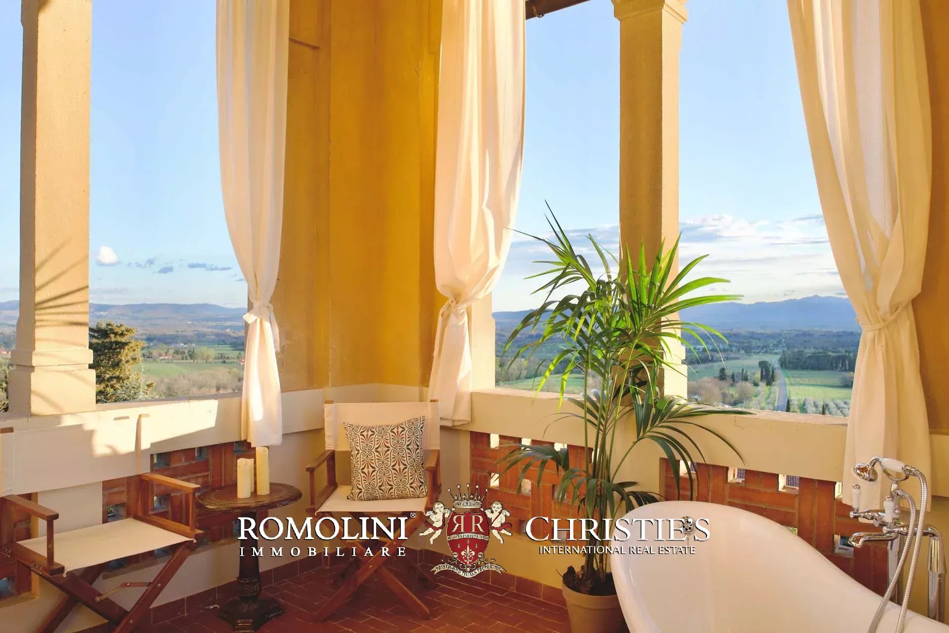 Villa Bellatorre is a restored and fully furnished 5/6-bedroom villa with olive groves just 30 minutes to Arezzo and 45 to Florence and Chianti. Built in the Castello Art Nouveau style, the villa offers unique features like its panoramic open-air bathroom in the tower and a stunning open-plan living space which runs along the entire length of the facade. The numerous terraces and balconies provide sweeping south facing views over the gentle valley and the hills of Chianti beyond, with its pool enjoying exposition to Tuscany’s famous golden sunsets.