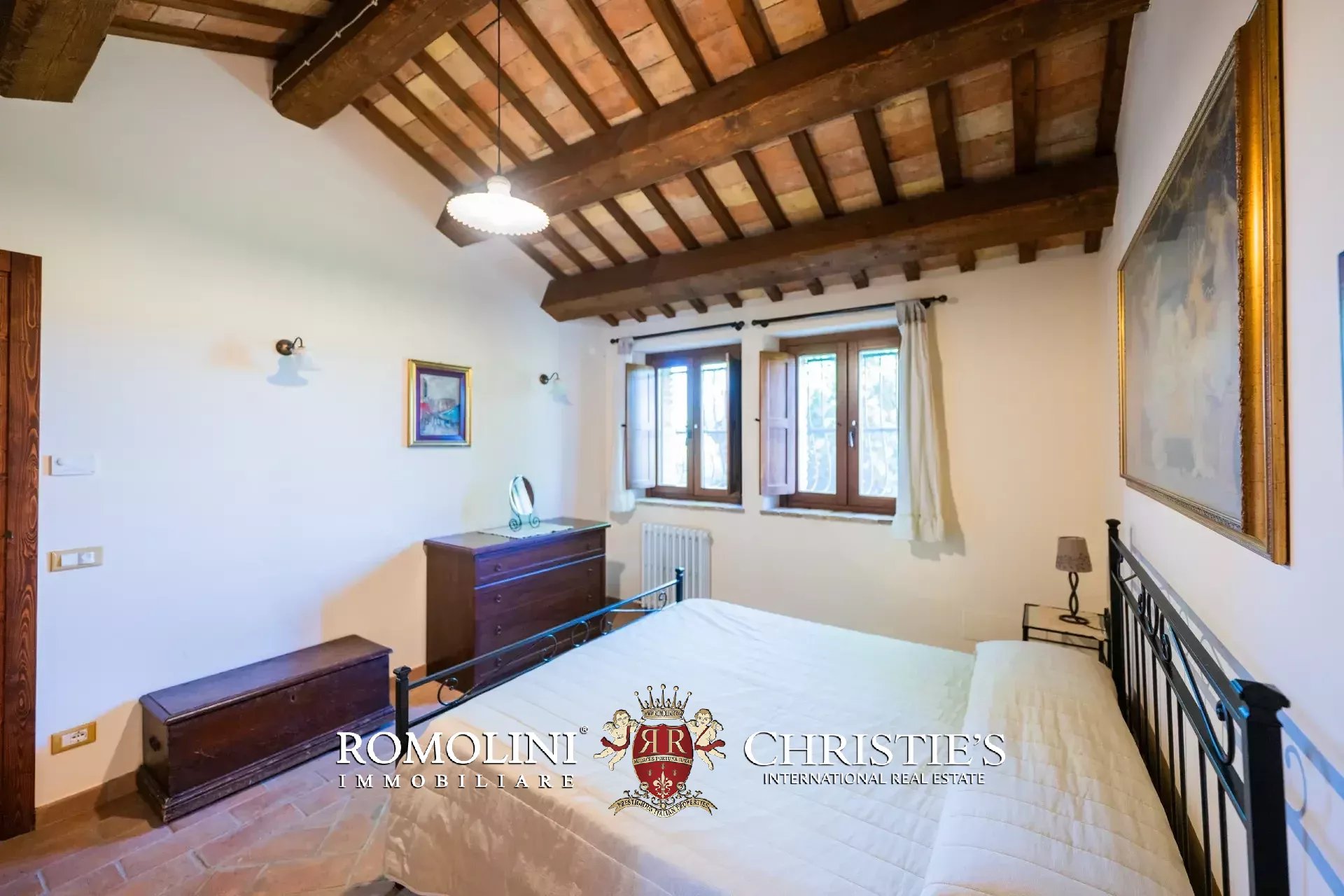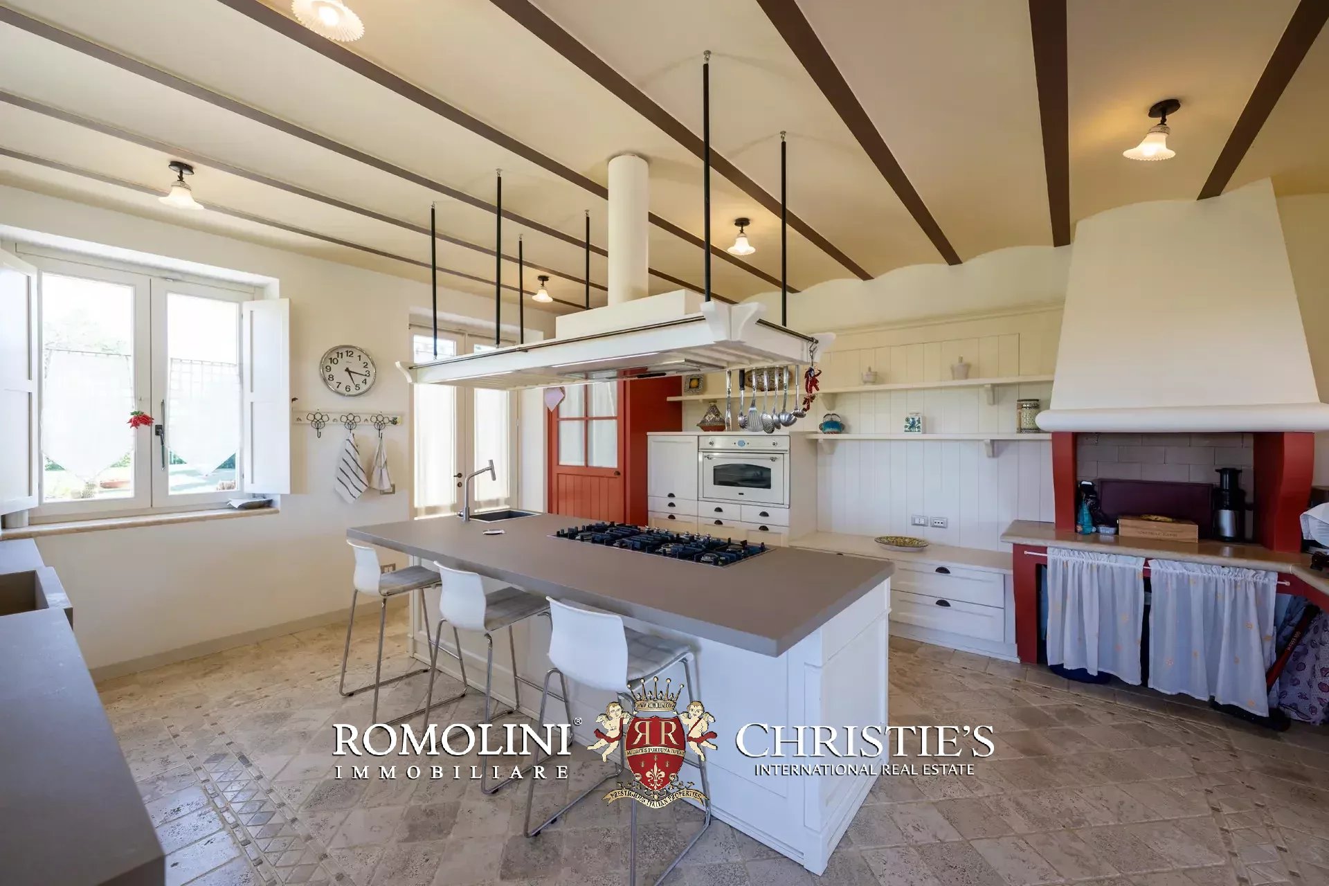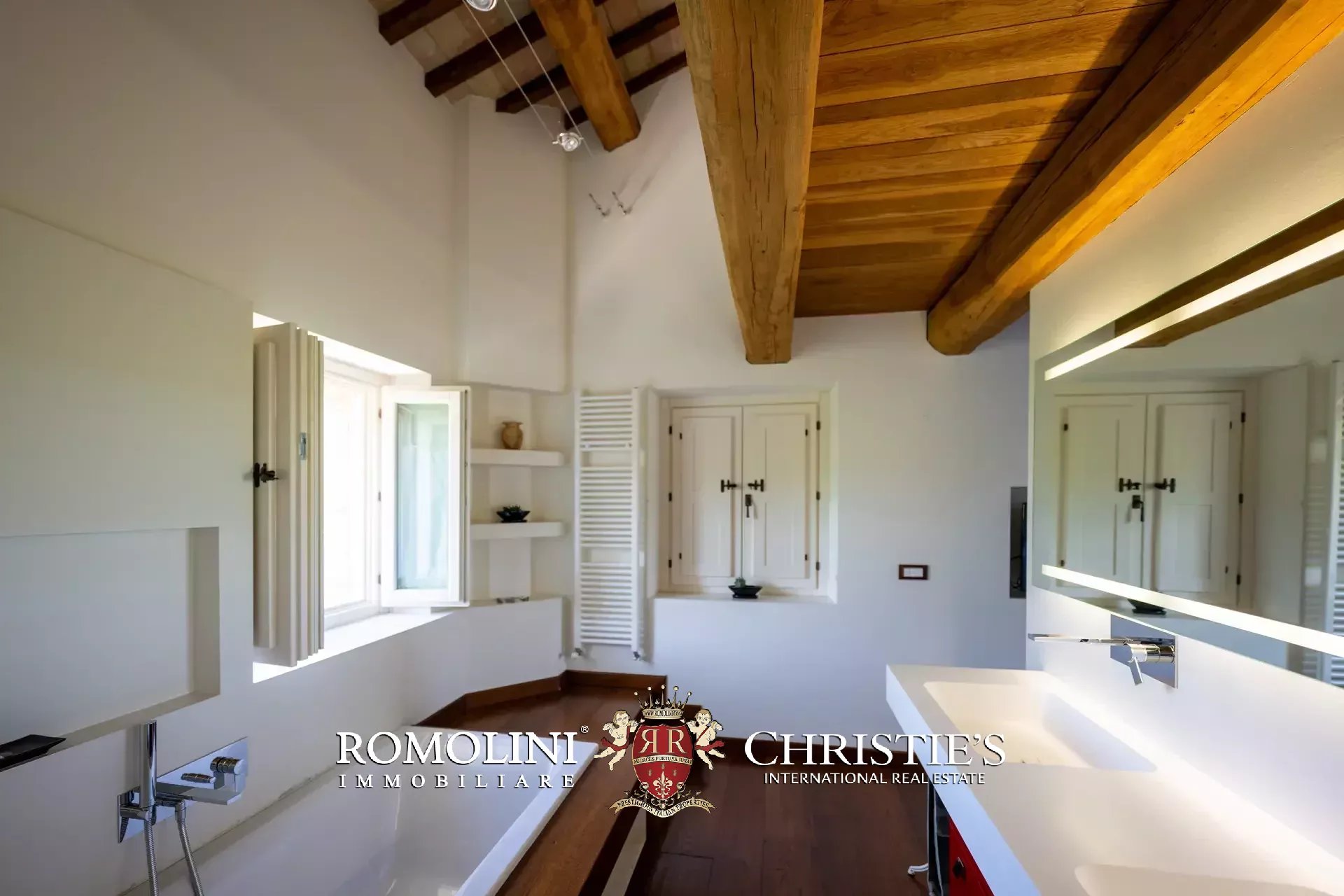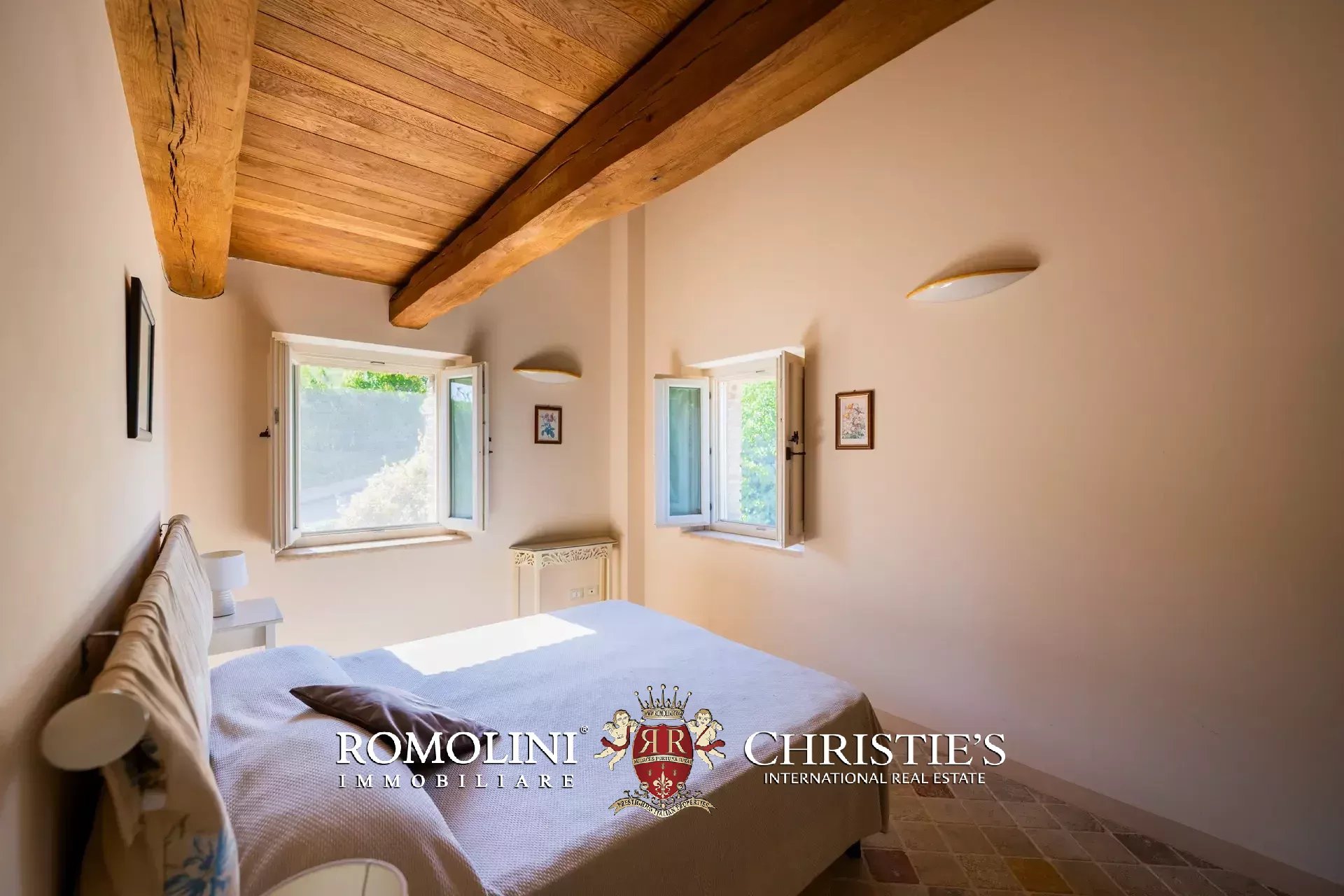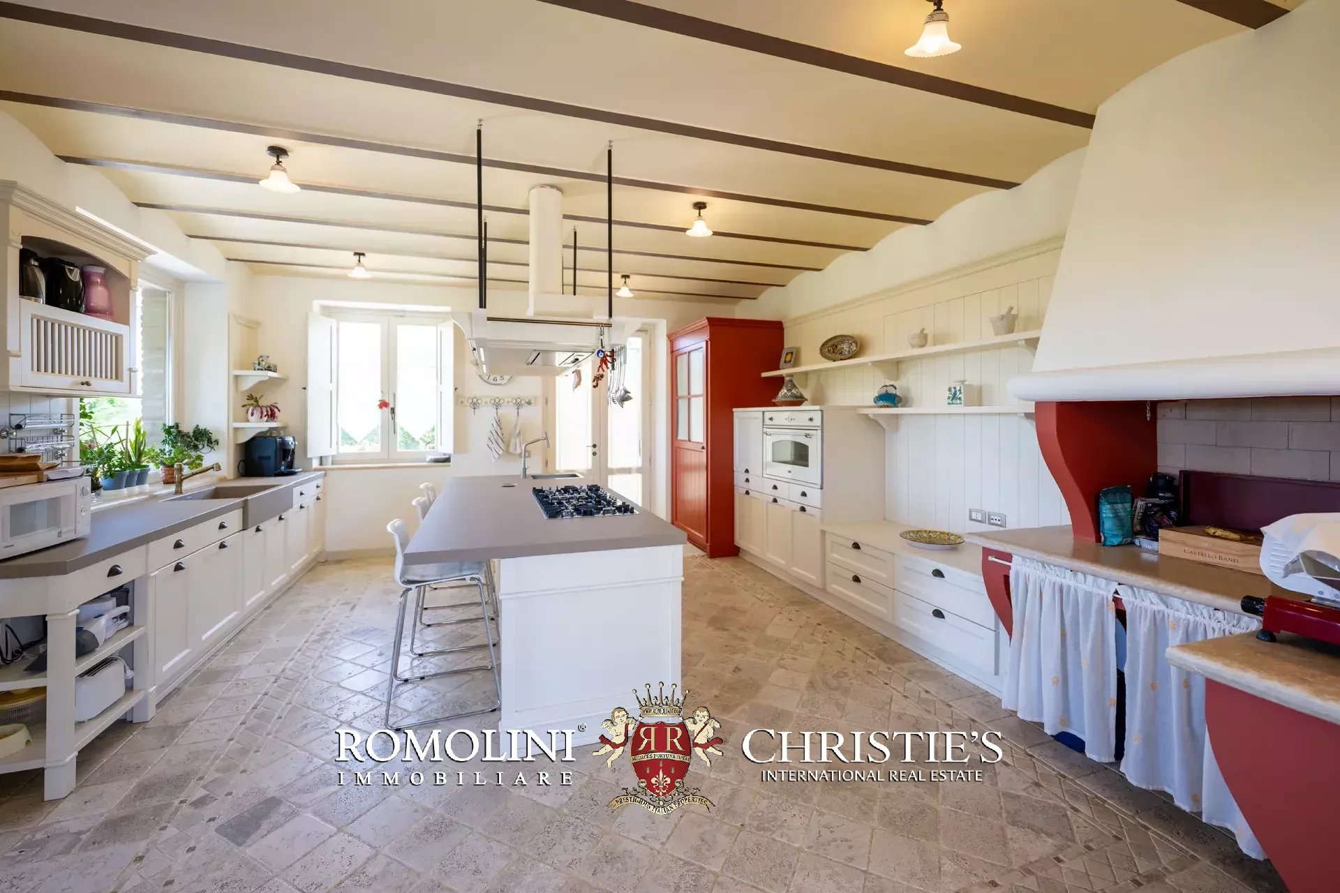 The main villa (442 m² – 4,756 ft², 6 bedrooms and 8 bathrooms) is a large building in Marche style, distinguished by red brick walls outside and elegant finishes inside (travertine floors, oak wooden beams...). The building has four floors: