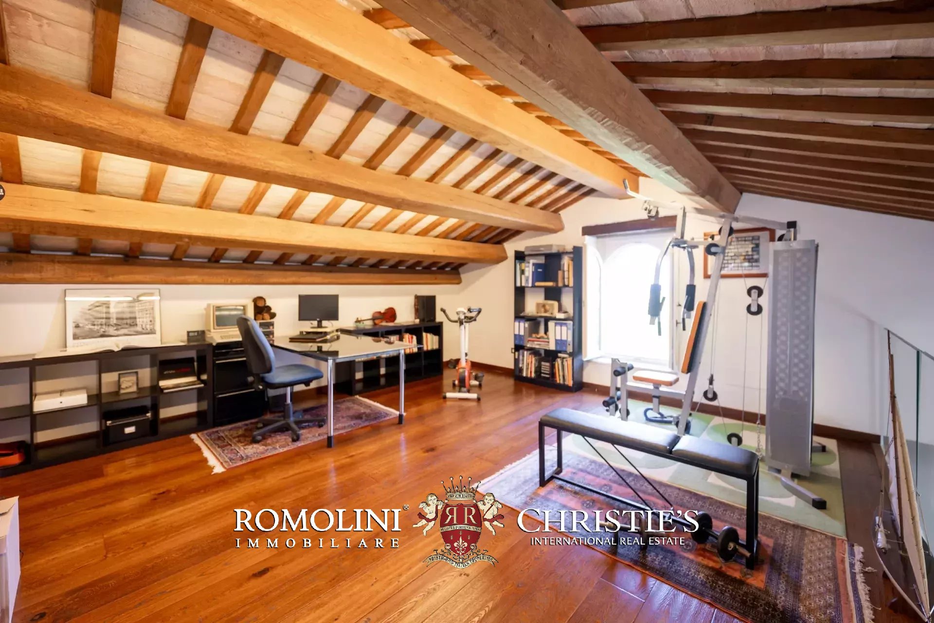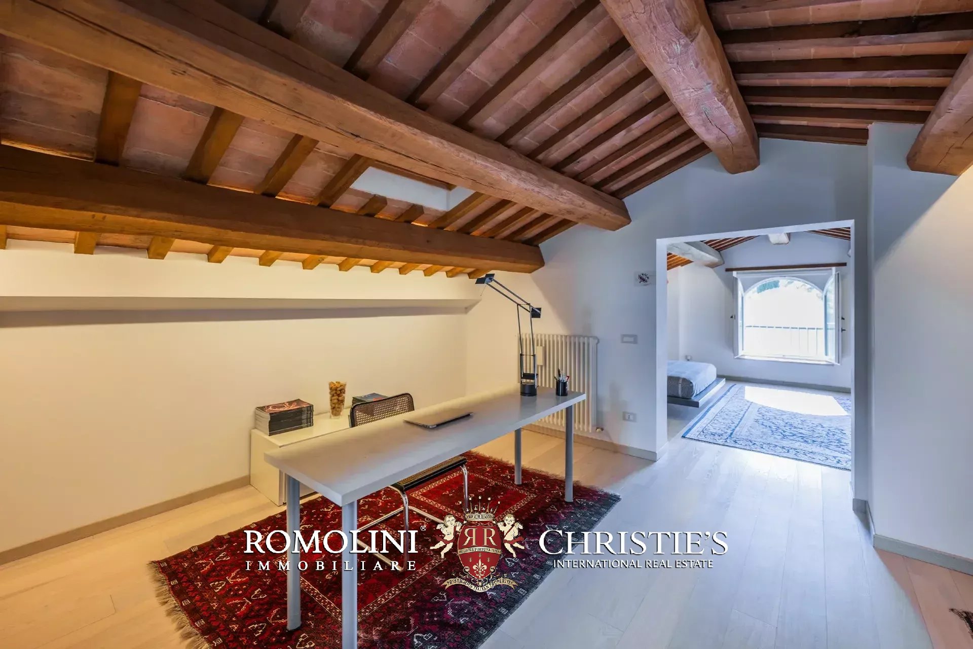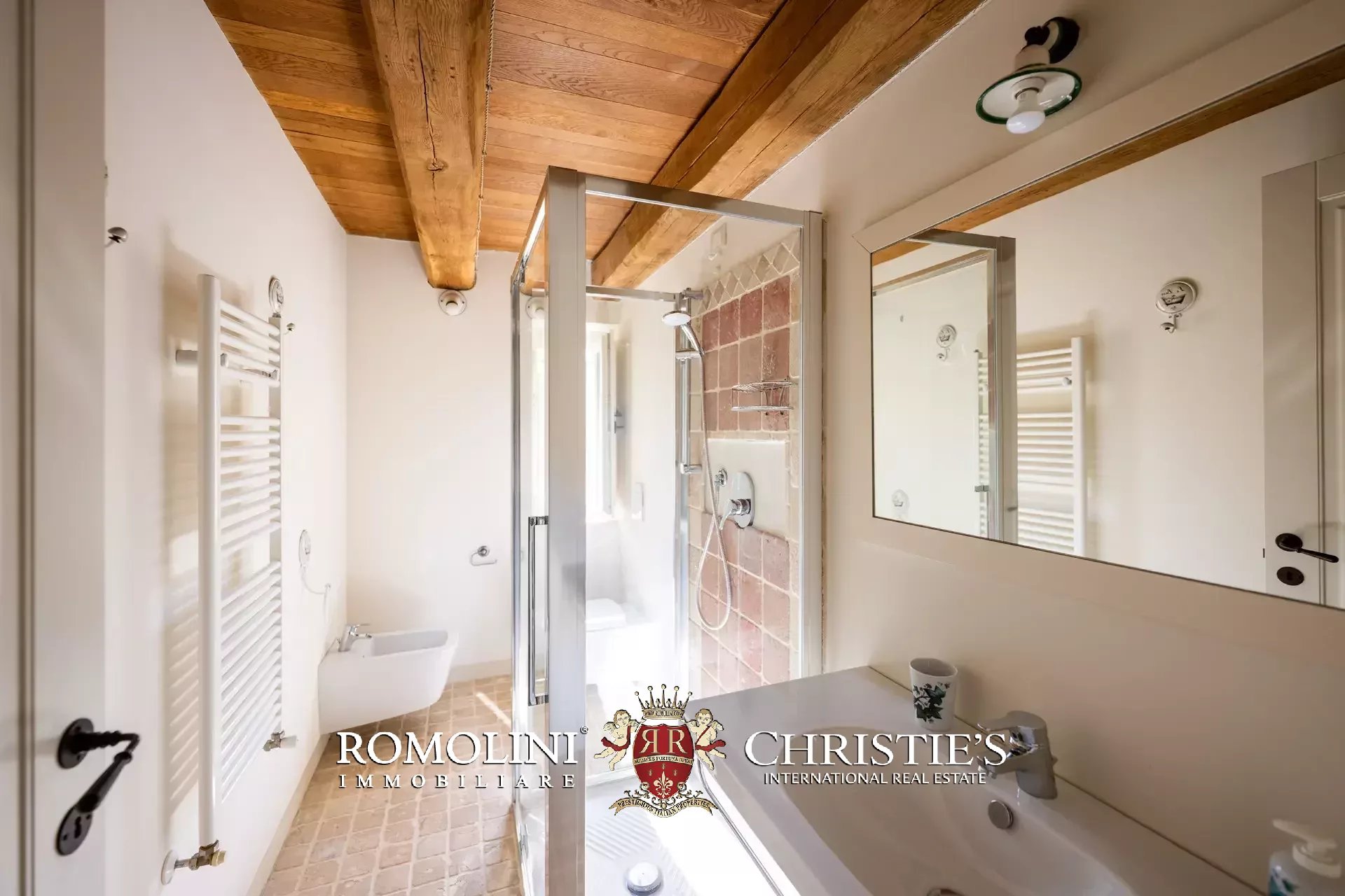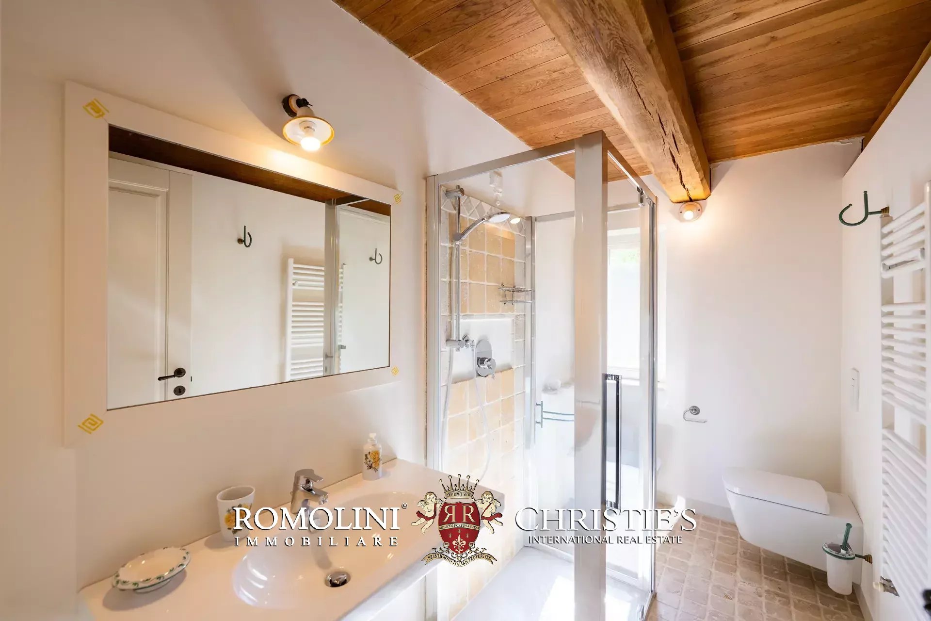 The main villa (442 m² – 4,756 ft², 6 bedrooms and 8 bathrooms) is a large building in Marche style, distinguished by red brick walls outside and elegant finishes inside (travertine floors, oak wooden beams...). The building has four floors: