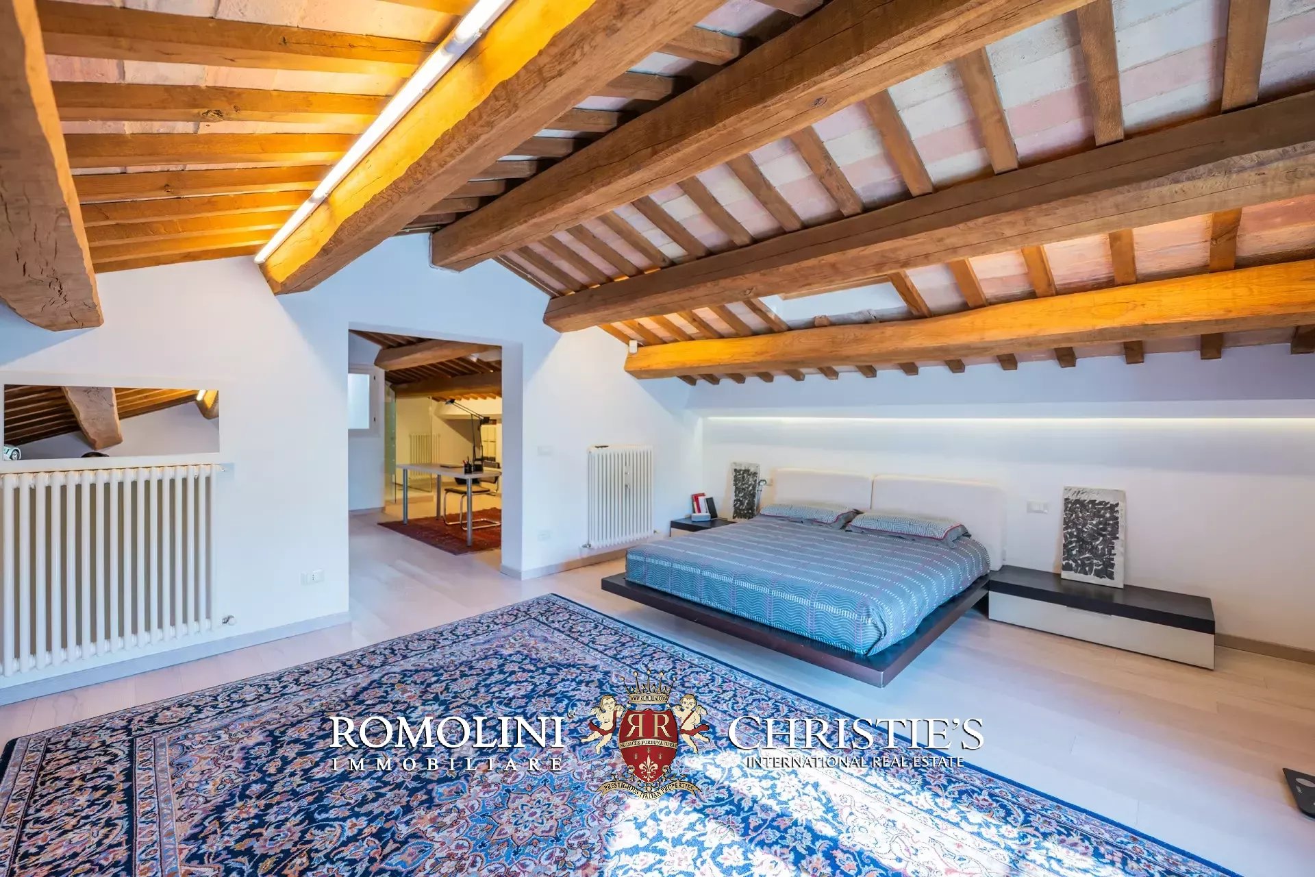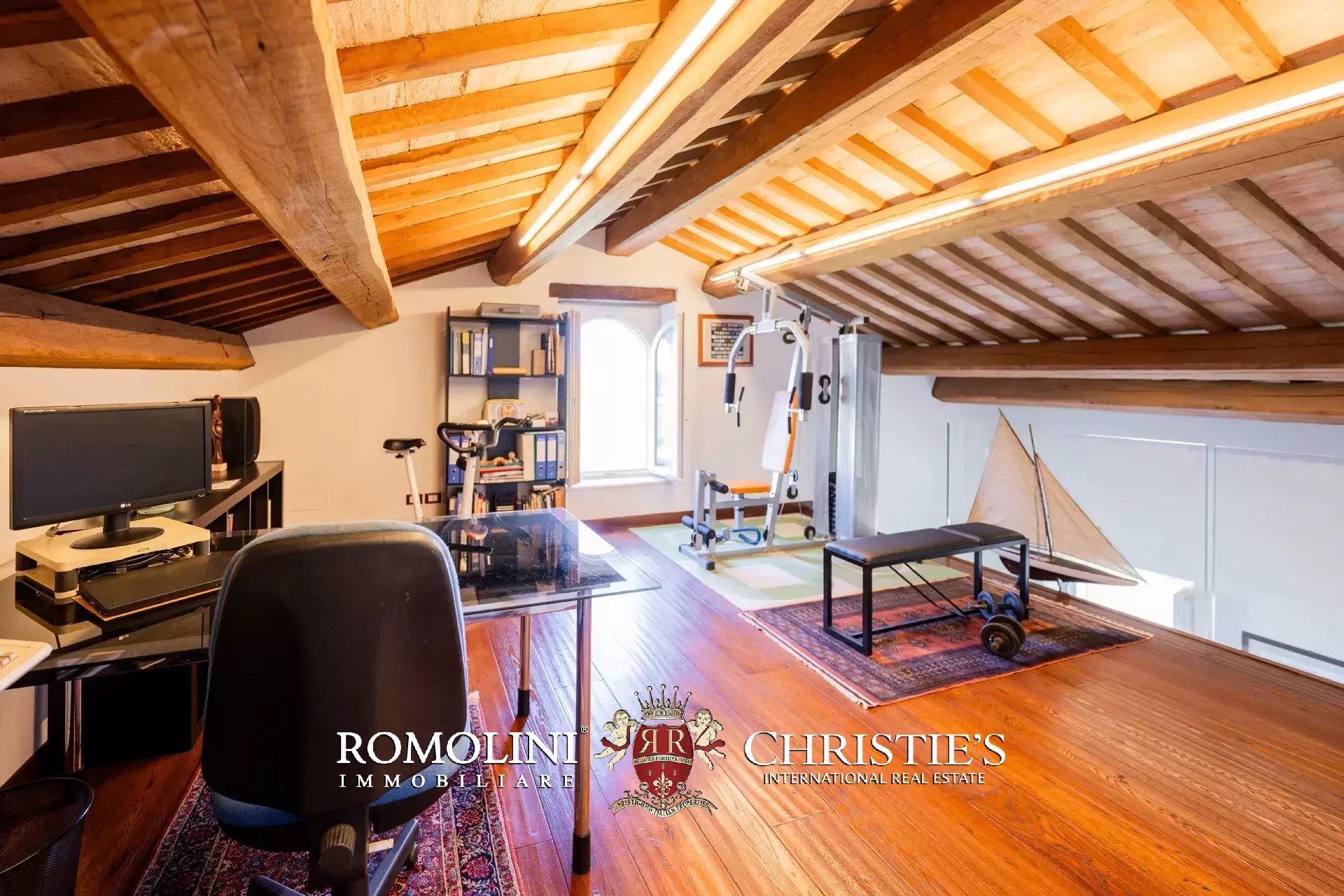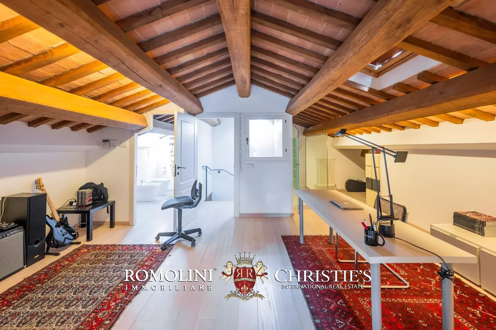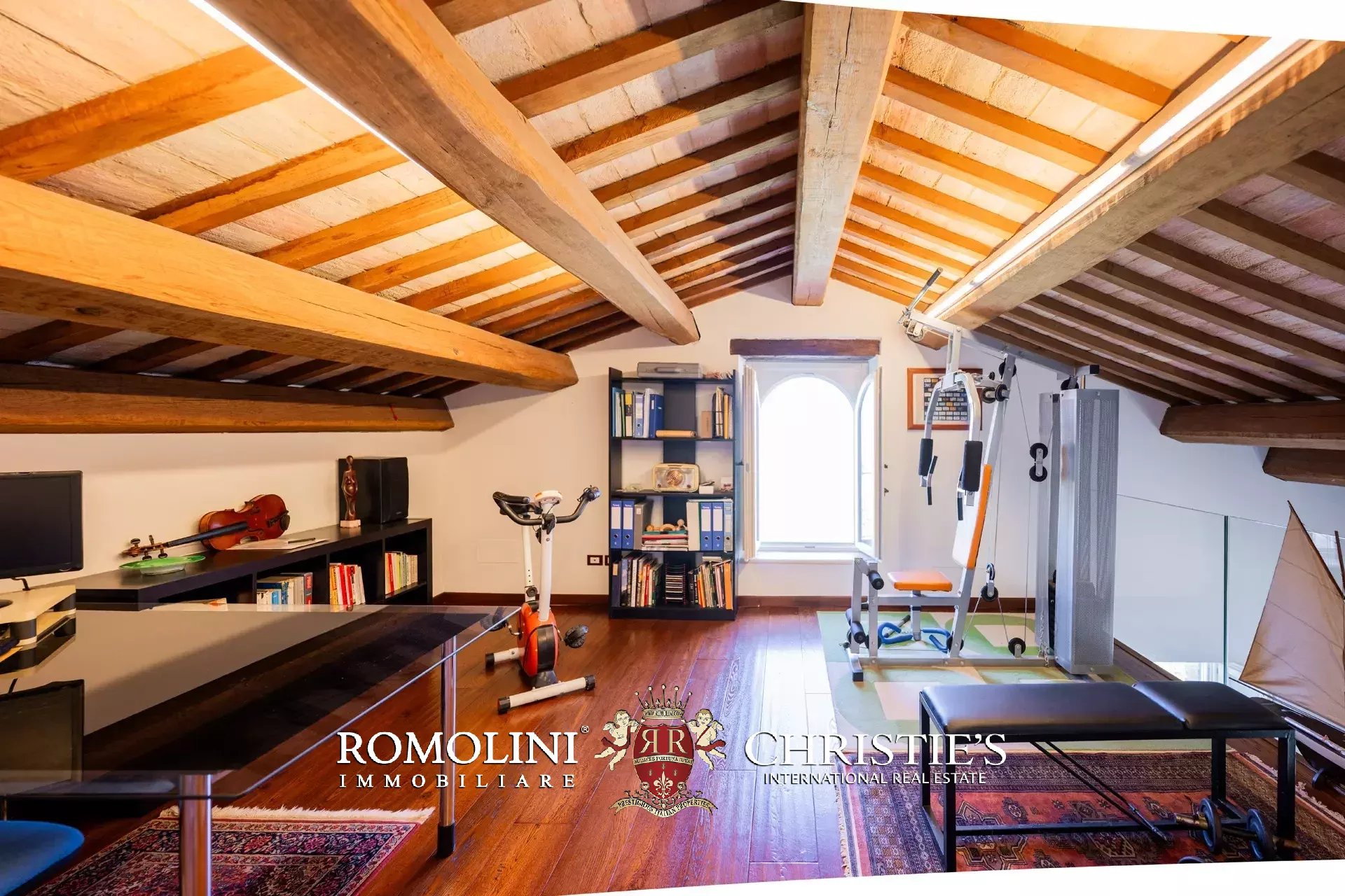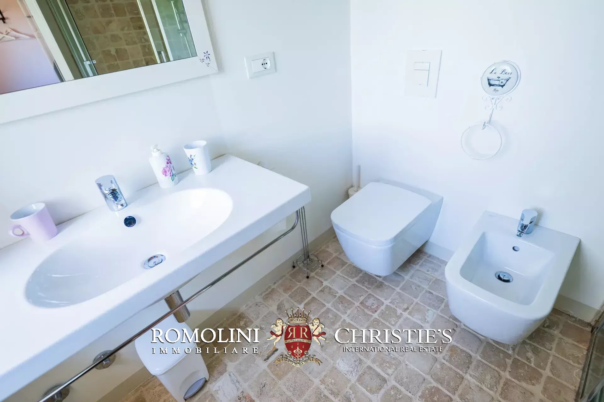 The main villa (442 m² – 4,756 ft², 6 bedrooms and 8 bathrooms) is a large building in Marche style, distinguished by red brick walls outside and elegant finishes inside (travertine floors, oak wooden beams...). The building has four floors:
