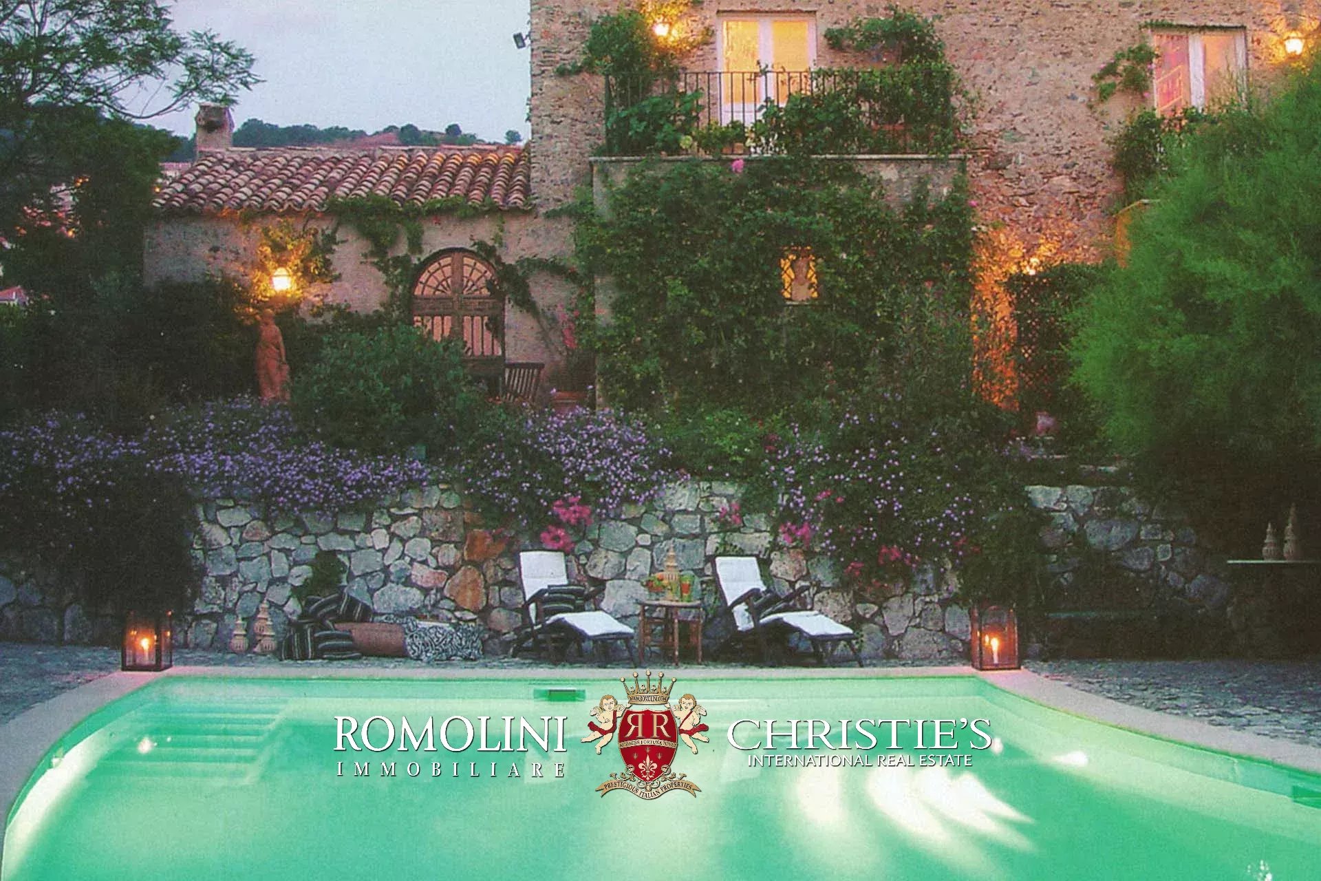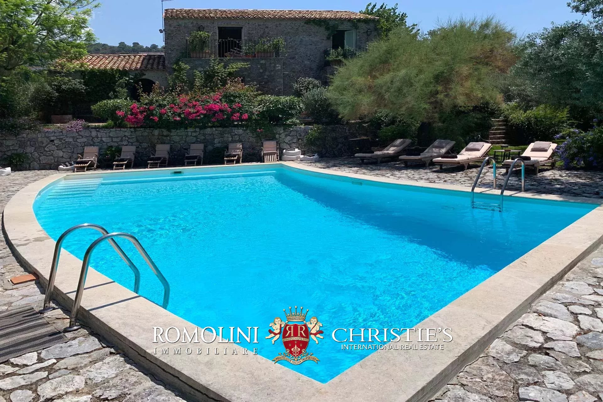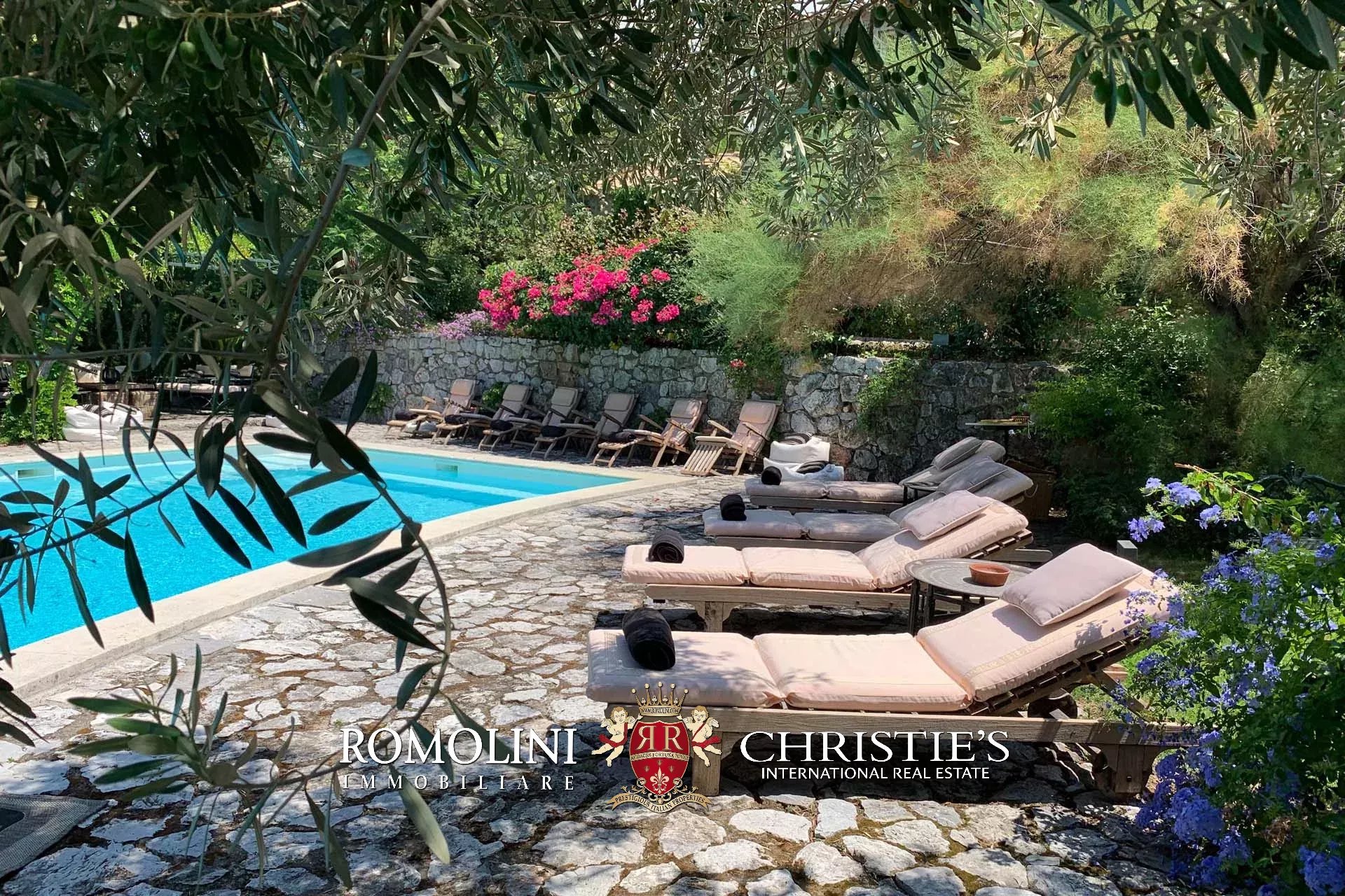 The villa is surrounded by an ample park (roughly 6,800 sqm) with secular oaks, citrus grove and fruit orchard. Among ornamental plants, the following are worth mentioning: roses, palms, Bougainvillea, honeysuckles and Carissae. The pool area is set amidst Mediterranean vegetation and olive trees. Here one can also find a parking area and graveled walkways crossing green areas. The swimming pool (roughly 100 sqm) follows the shape of the terrain and is paved in San Lucido stone so that it perfectly blends with the surrounding landscape. The pool is provided with gazebo, dressing room, bathroom and technical room.