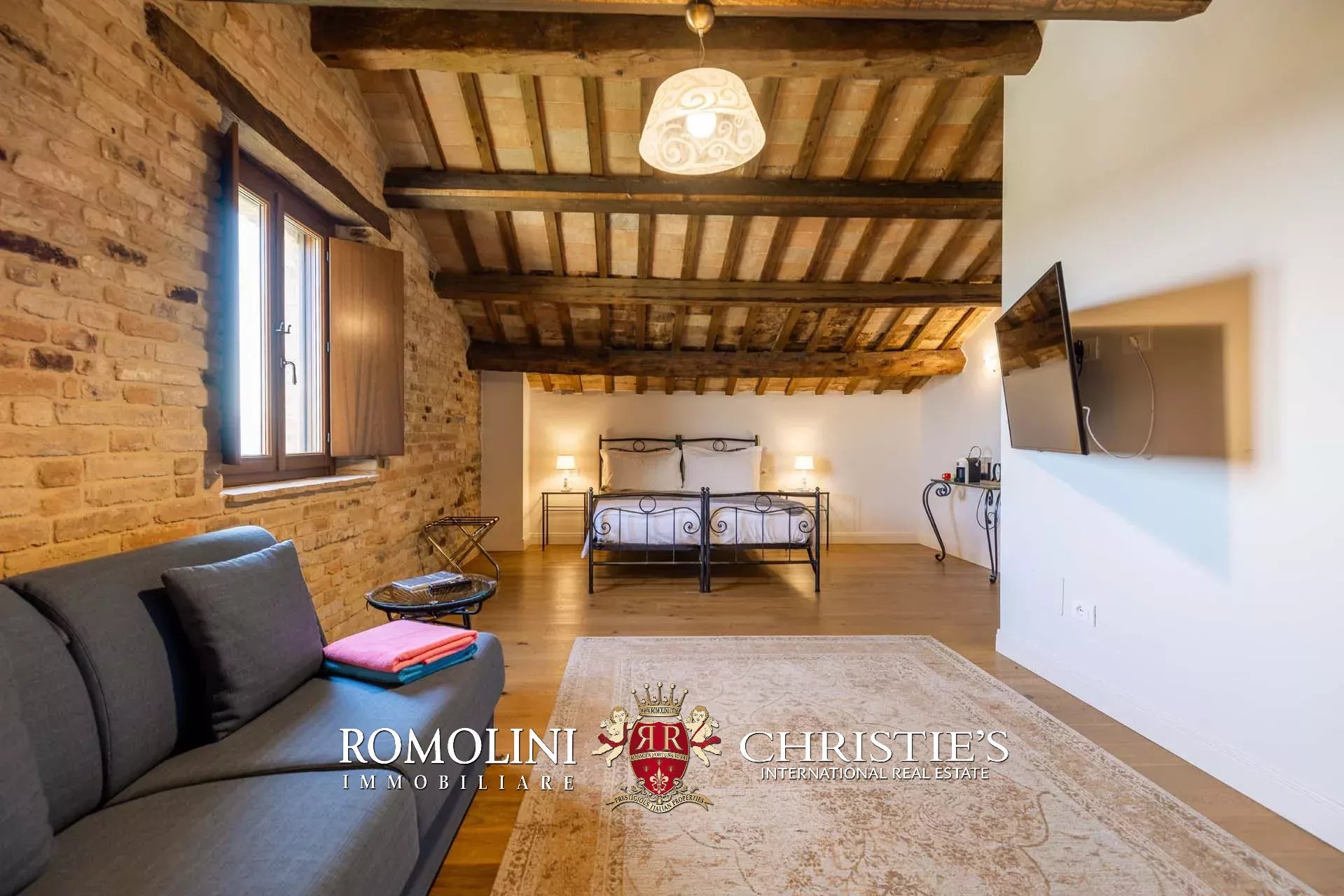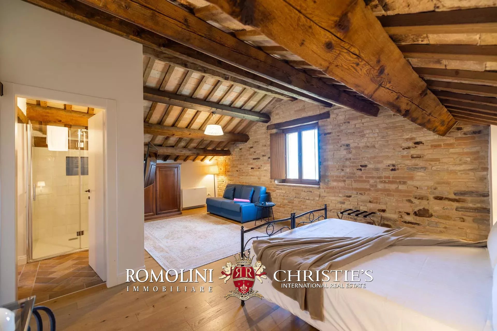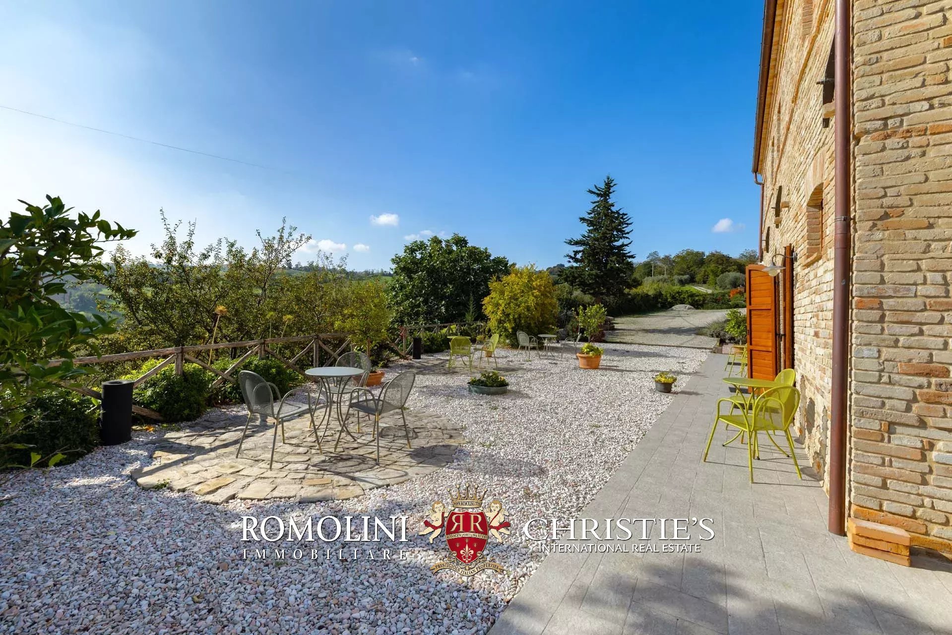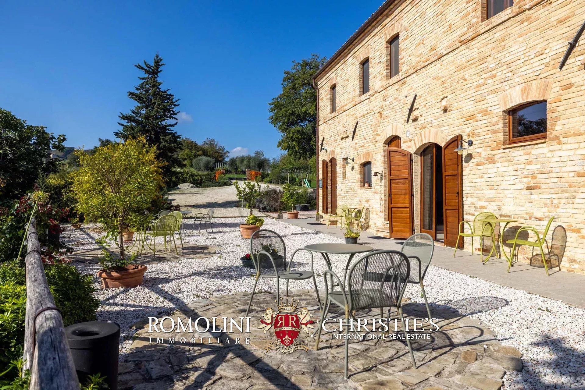In the hills of Marche, about 30 km from the Adriatic Sea, renovated farmhouse with swimming pool for sale. The property consists of two buildings (nearly 600 m² in total) that house seven guest rooms, plus two currently used by the owners. The 13,300-m² garden surrounding the buildings houses fruit trees, a sauna with whirlpool and the 14 × 6-m swimming pool.