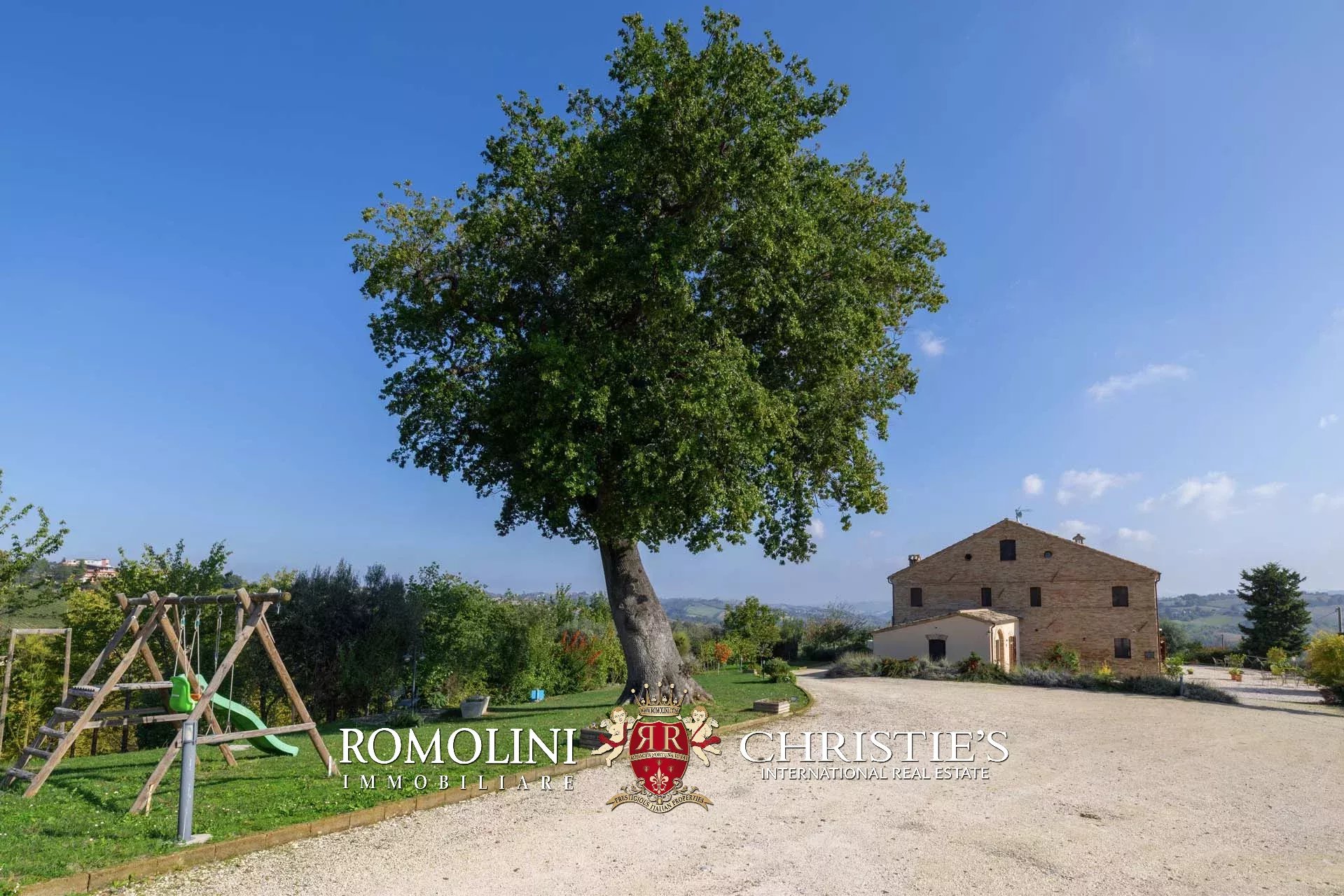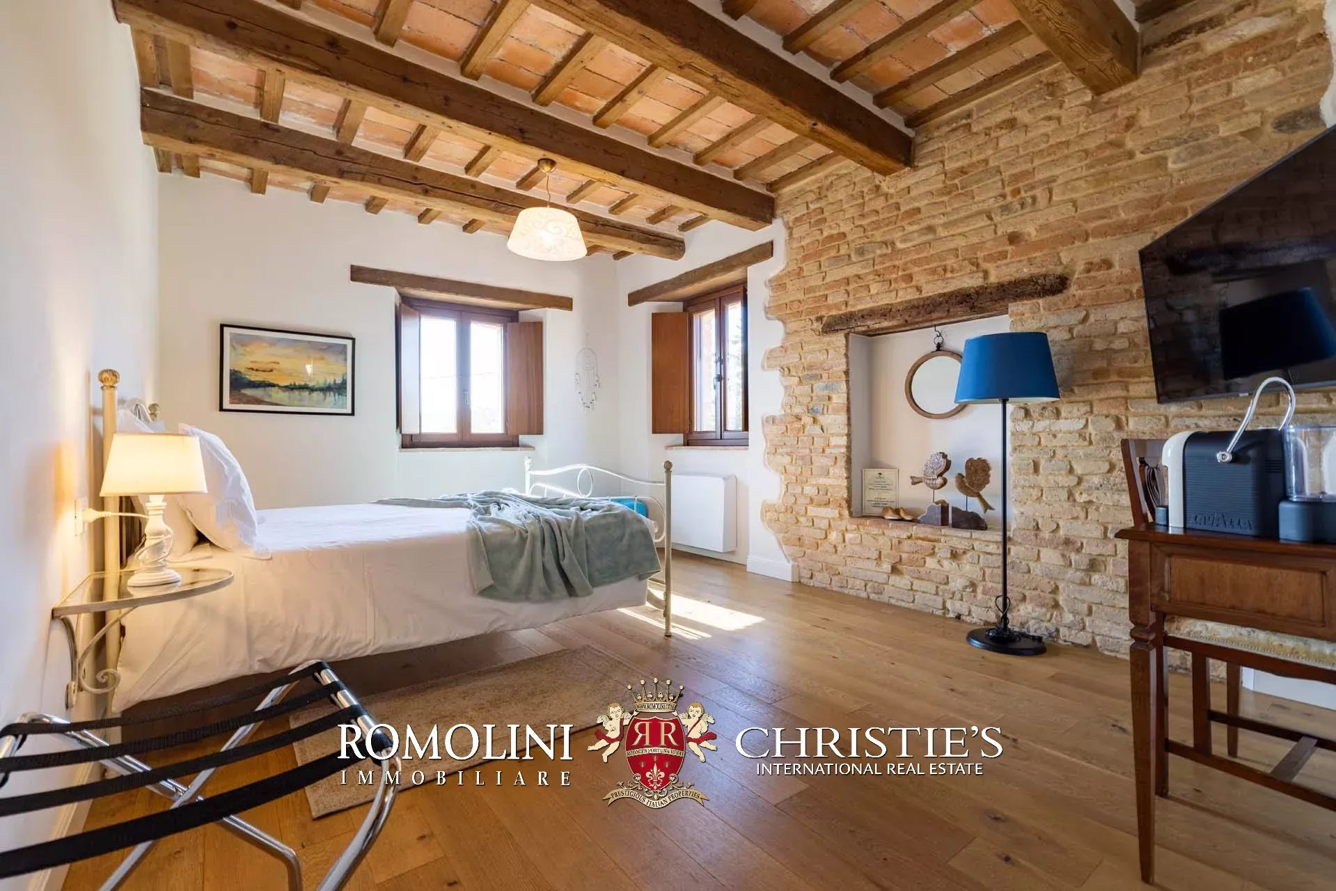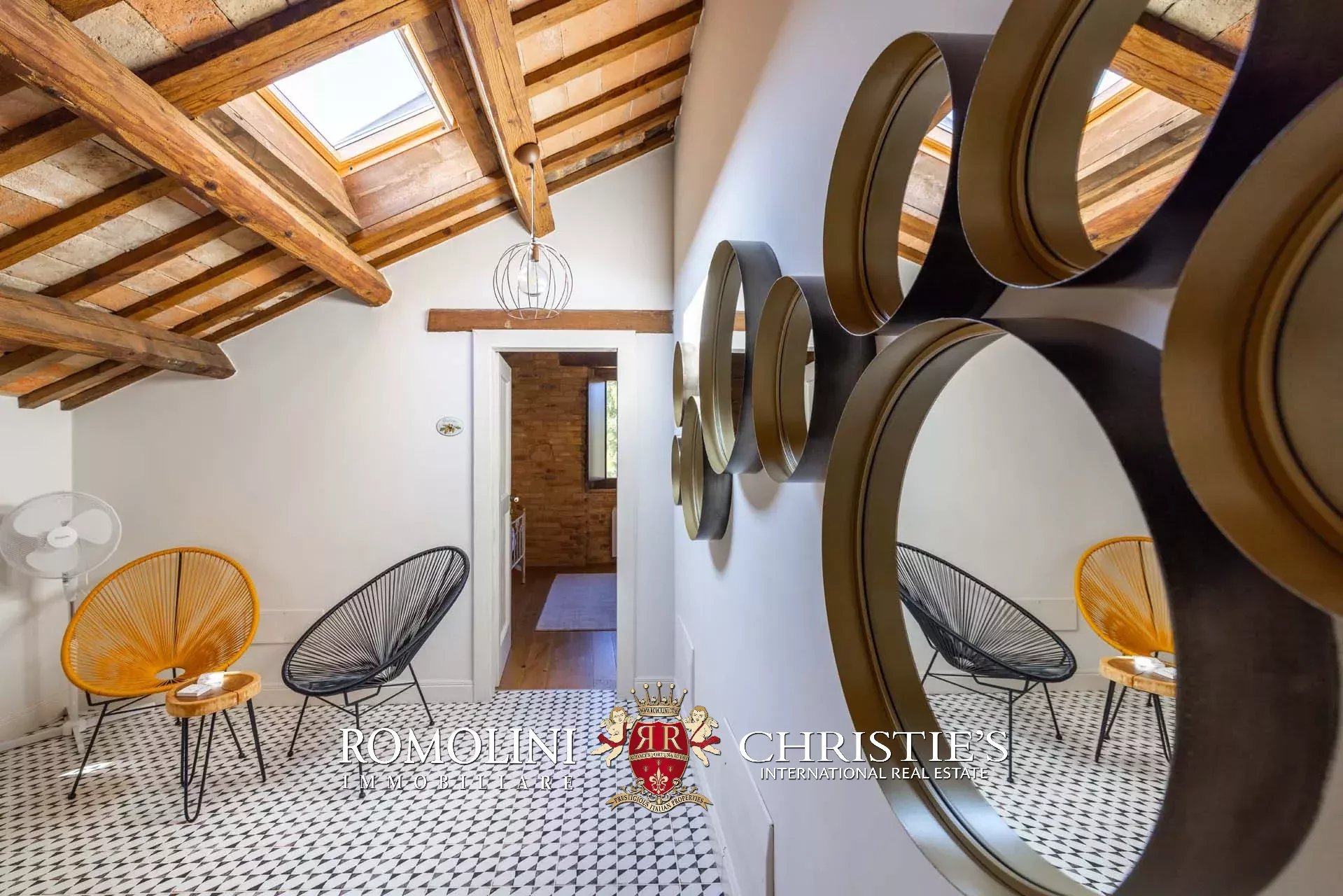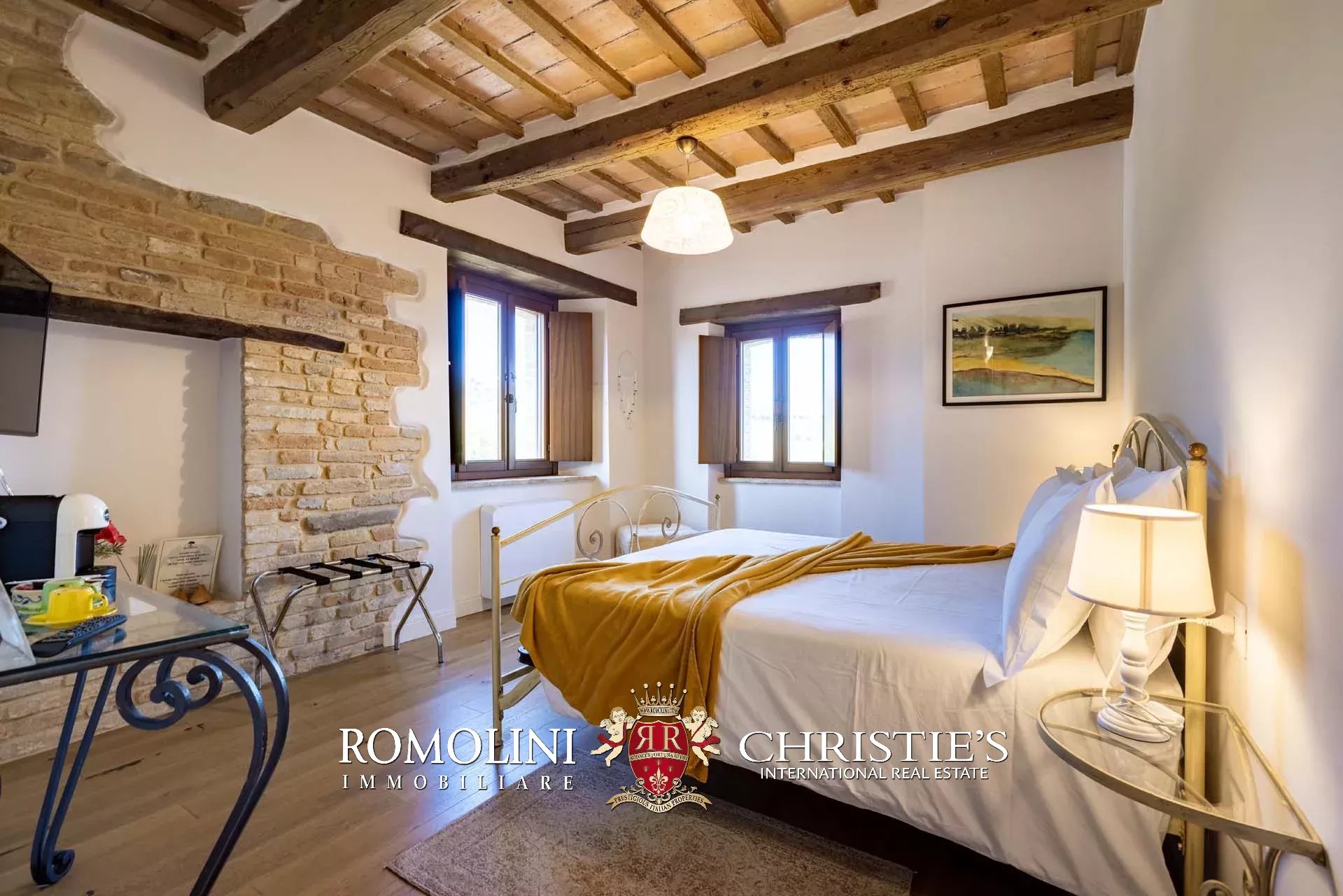 In the hills of Marche, about 30 km from the Adriatic Sea, renovated farmhouse with swimming pool for sale. The property consists of two buildings (nearly 600 m² in total) that house seven guest rooms, plus two currently used by the owners. The 13,300-m² garden surrounding the buildings houses fruit trees, a sauna with whirlpool and the 14 × 6-m swimming pool.