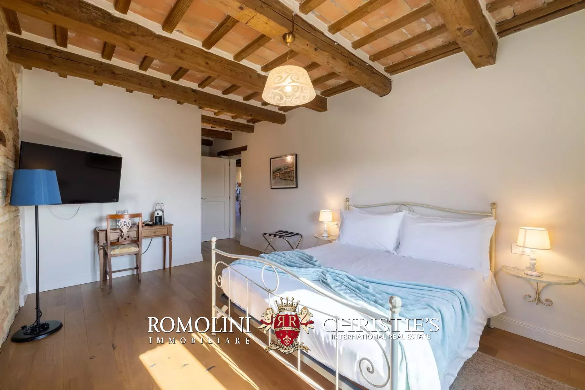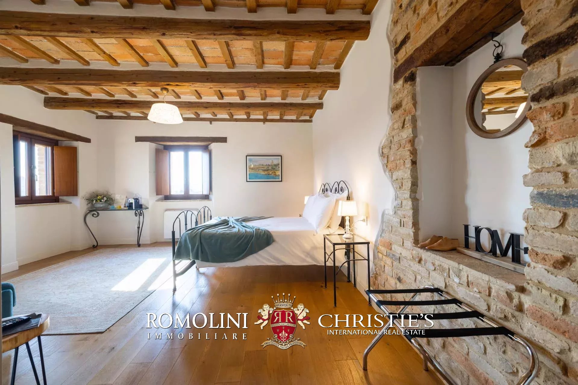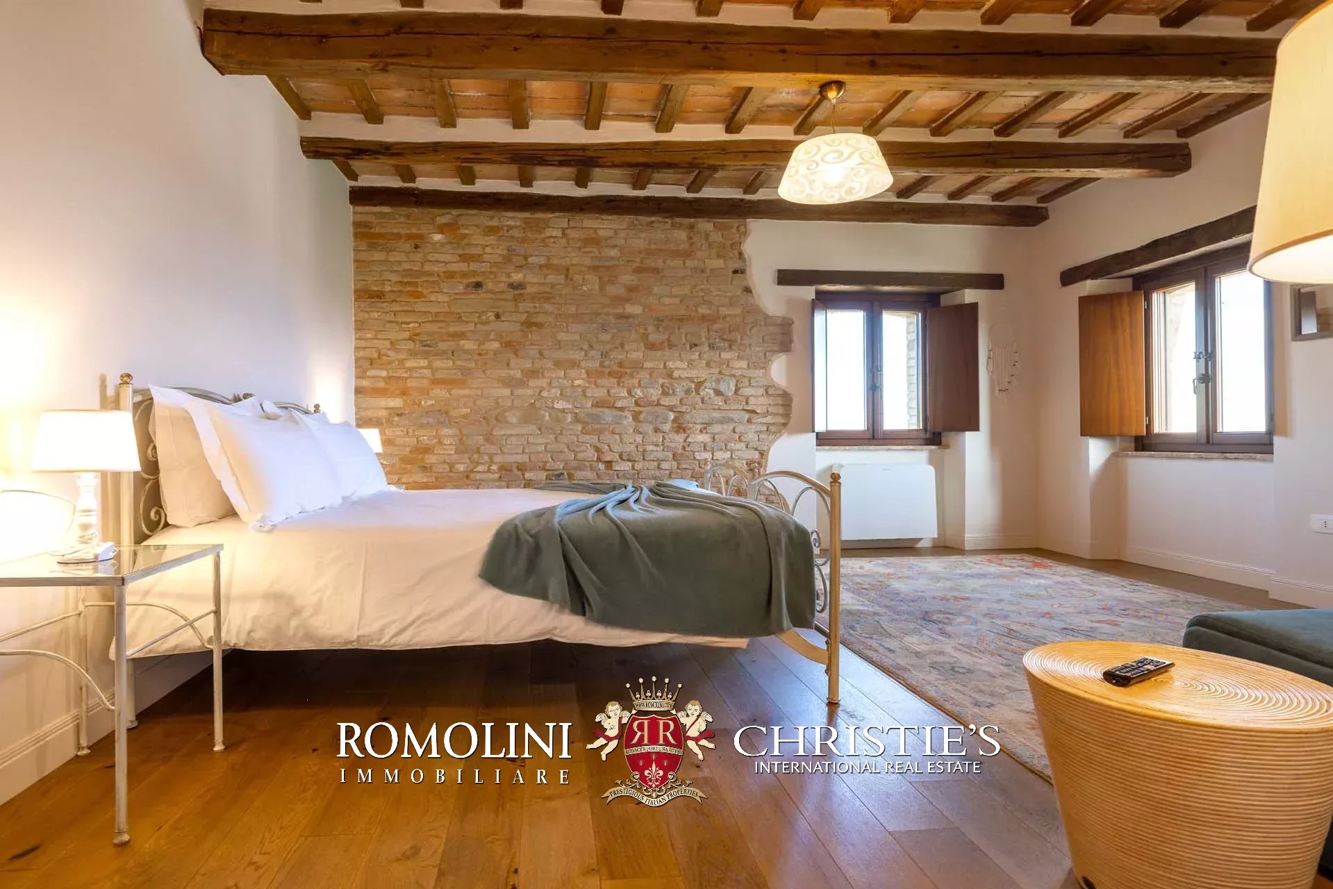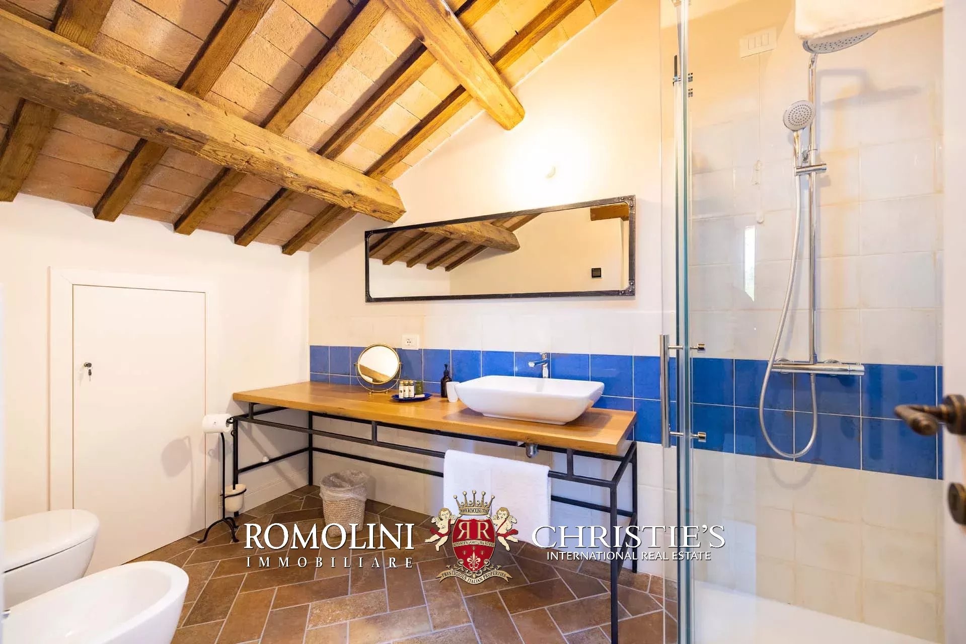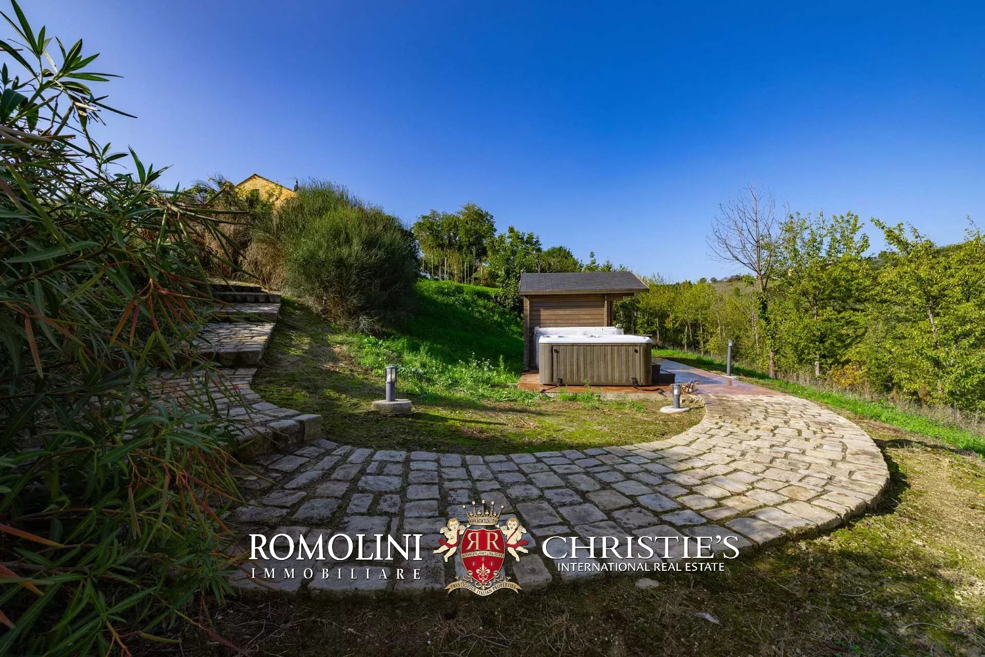 In the hills of Marche, about 30 km from the Adriatic Sea, renovated farmhouse with swimming pool for sale. The property consists of two buildings (nearly 600 m² in total) that house seven guest rooms, plus two currently used by the owners. The 13,300-m² garden surrounding the buildings houses fruit trees, a sauna with whirlpool and the 14 × 6-m swimming pool.