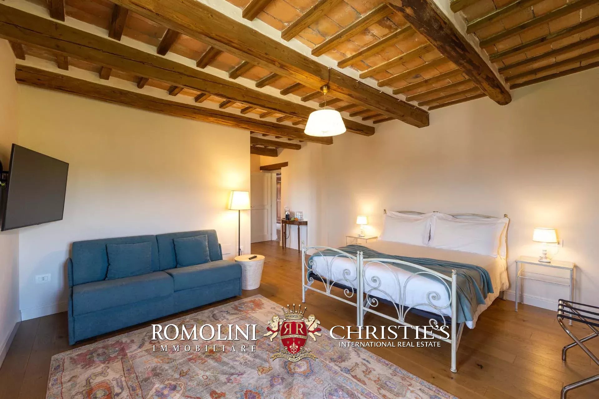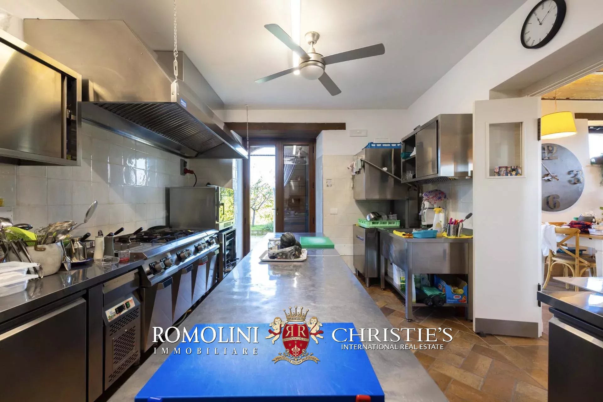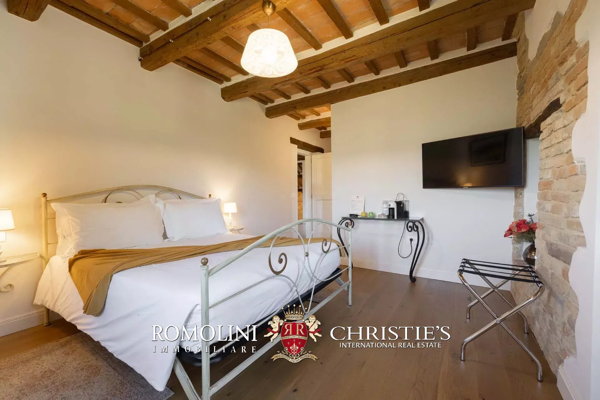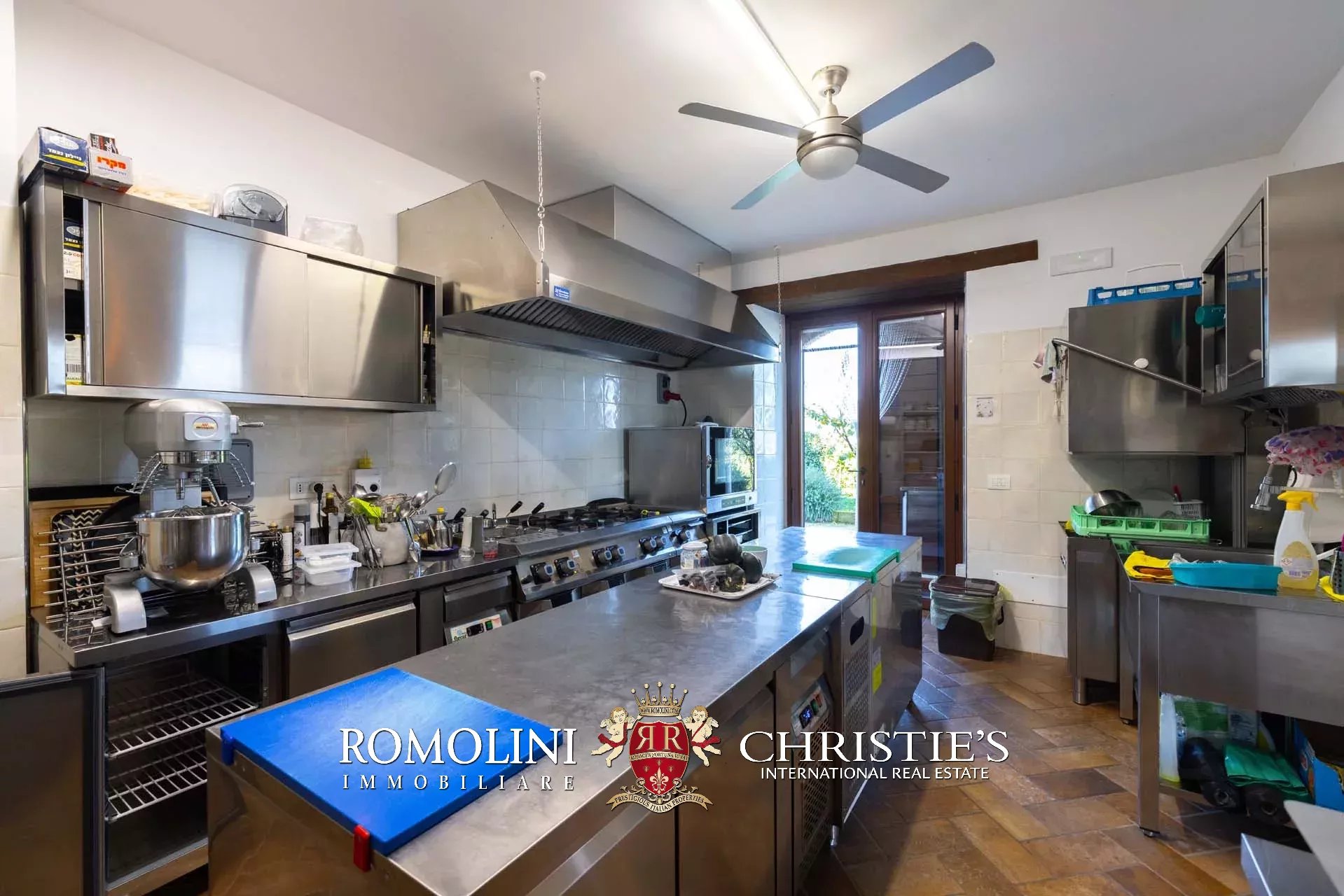 In the hills of Marche, about 30 km from the Adriatic Sea, renovated farmhouse with swimming pool for sale. The property consists of two buildings (nearly 600 m² in total) that house seven guest rooms, plus two currently used by the owners. The 13,300-m² garden surrounding the buildings houses fruit trees, a sauna with whirlpool and the 14 × 6-m swimming pool.