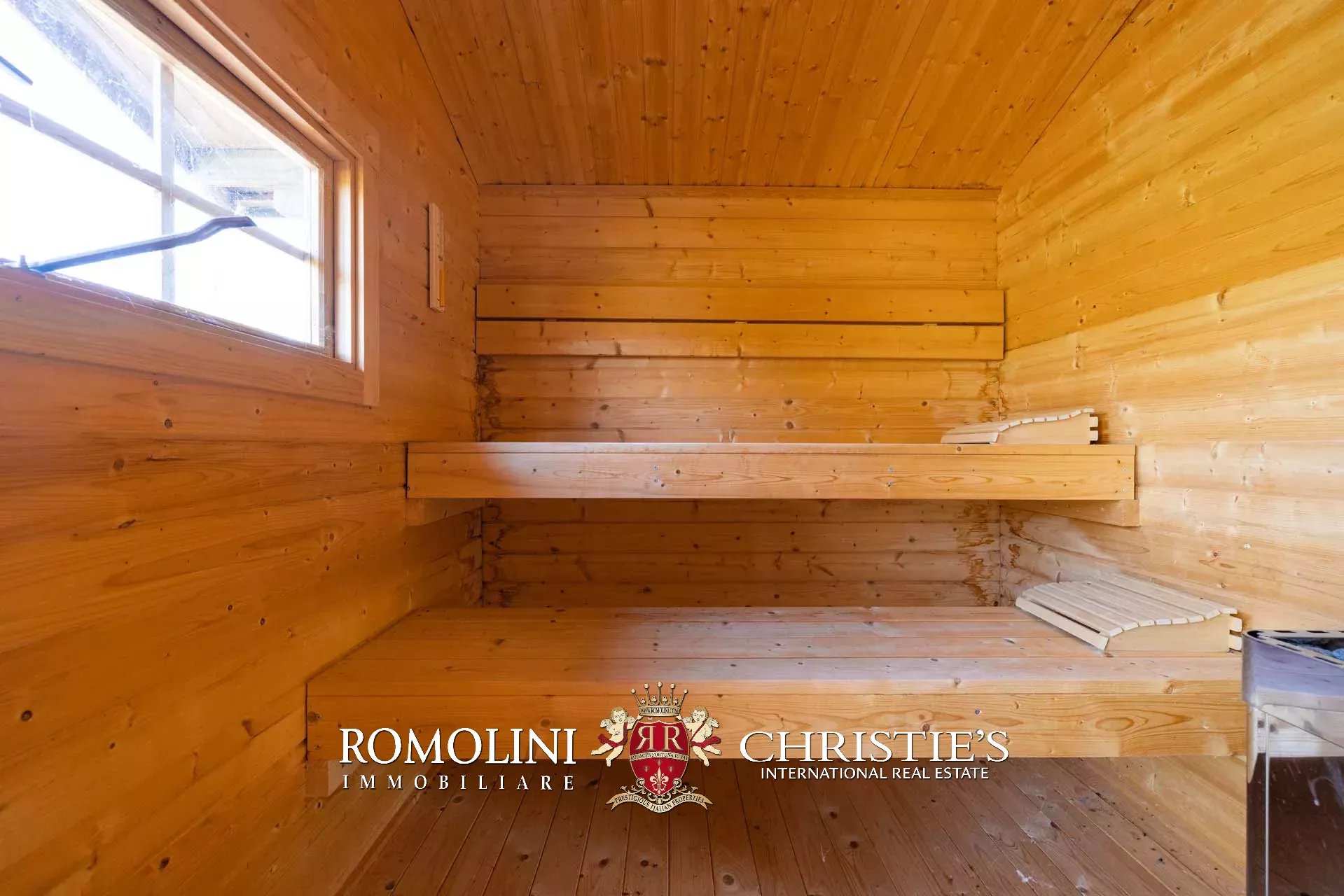 The buildings are surrounded by a well-maintained garden of 13,340 m² (3.2 acres), mostly flat and enriched by 39 centuries-old olive trees, vines and fruit trees (cherry, pear and apple trees) as well as berry bushes. Between the two buildings is the 14 × 6 m swimming pool surrounded by a stone solarium with umbrellas and sunbeds. Slightly downstream from the house is a sauna with a hot tub.