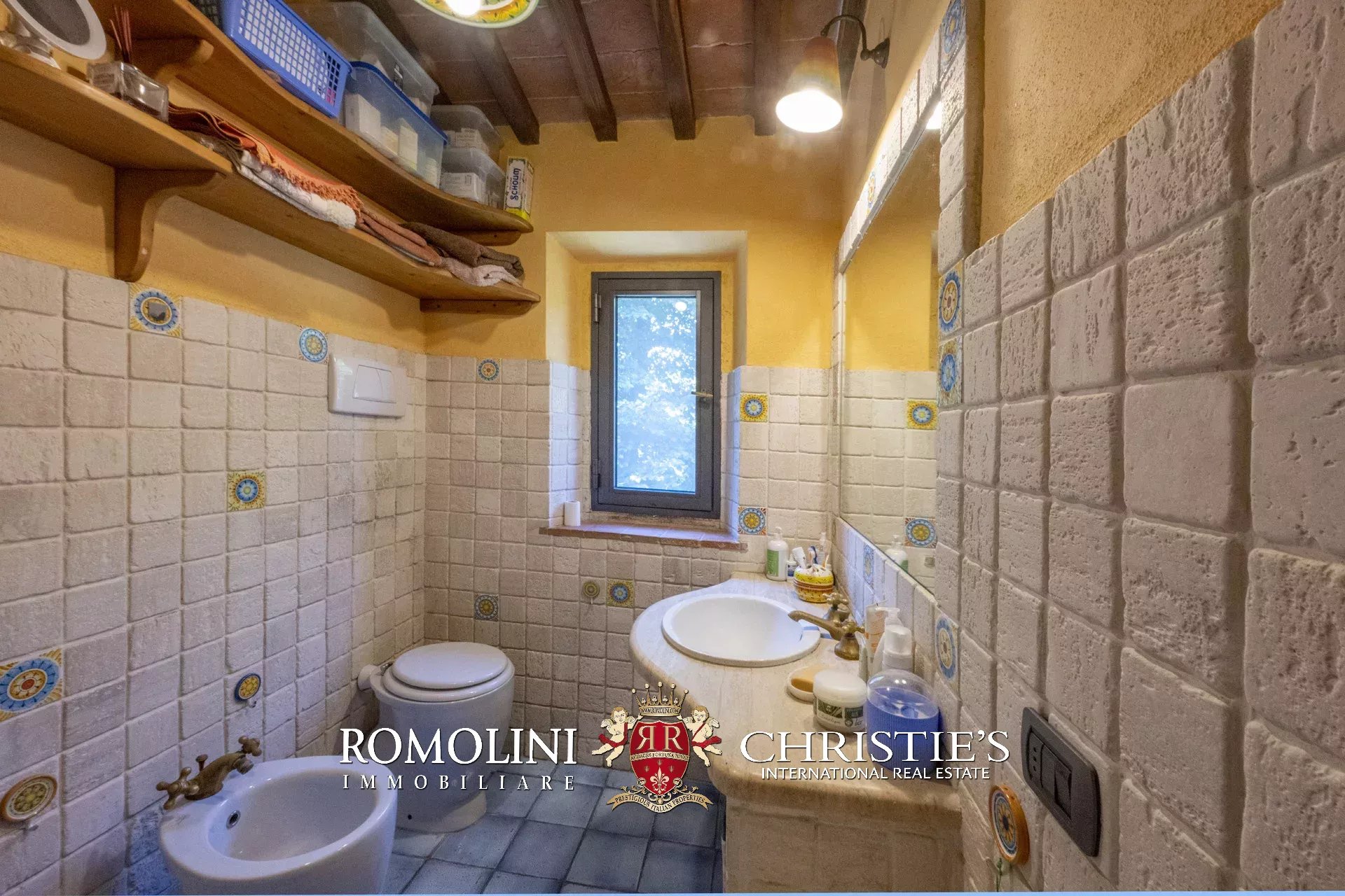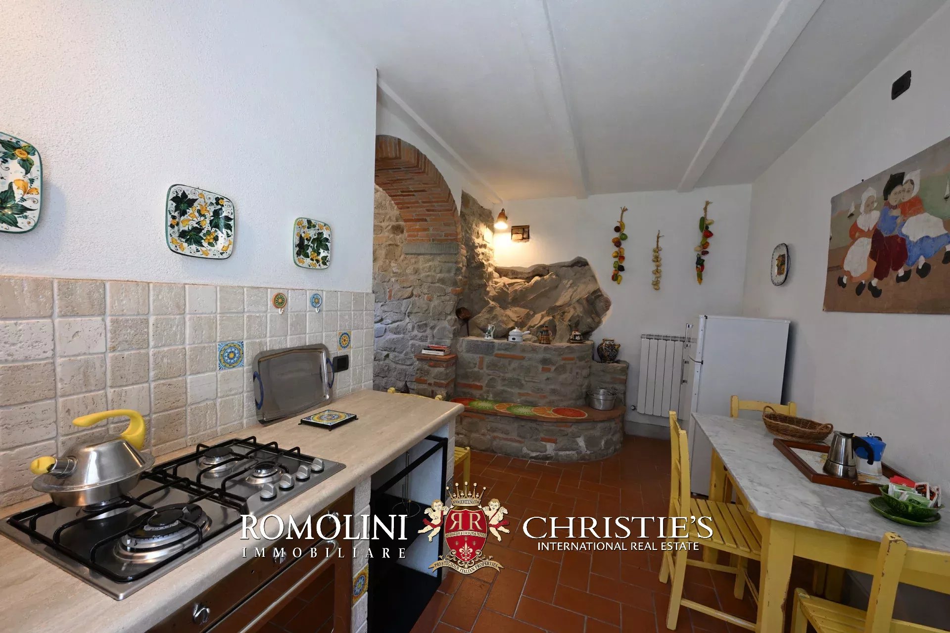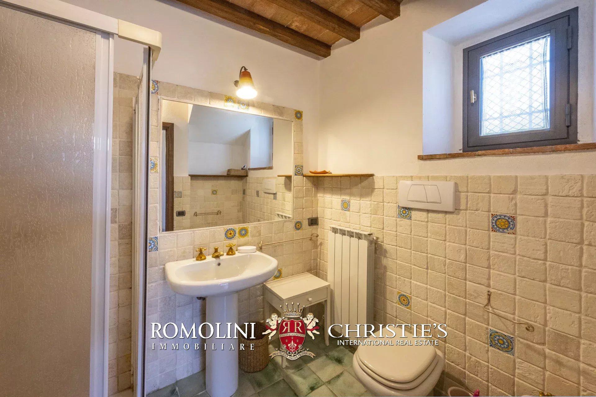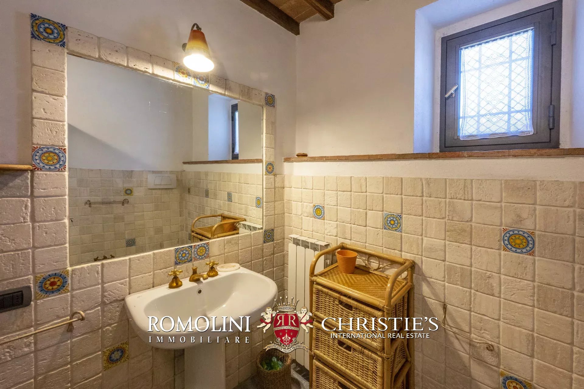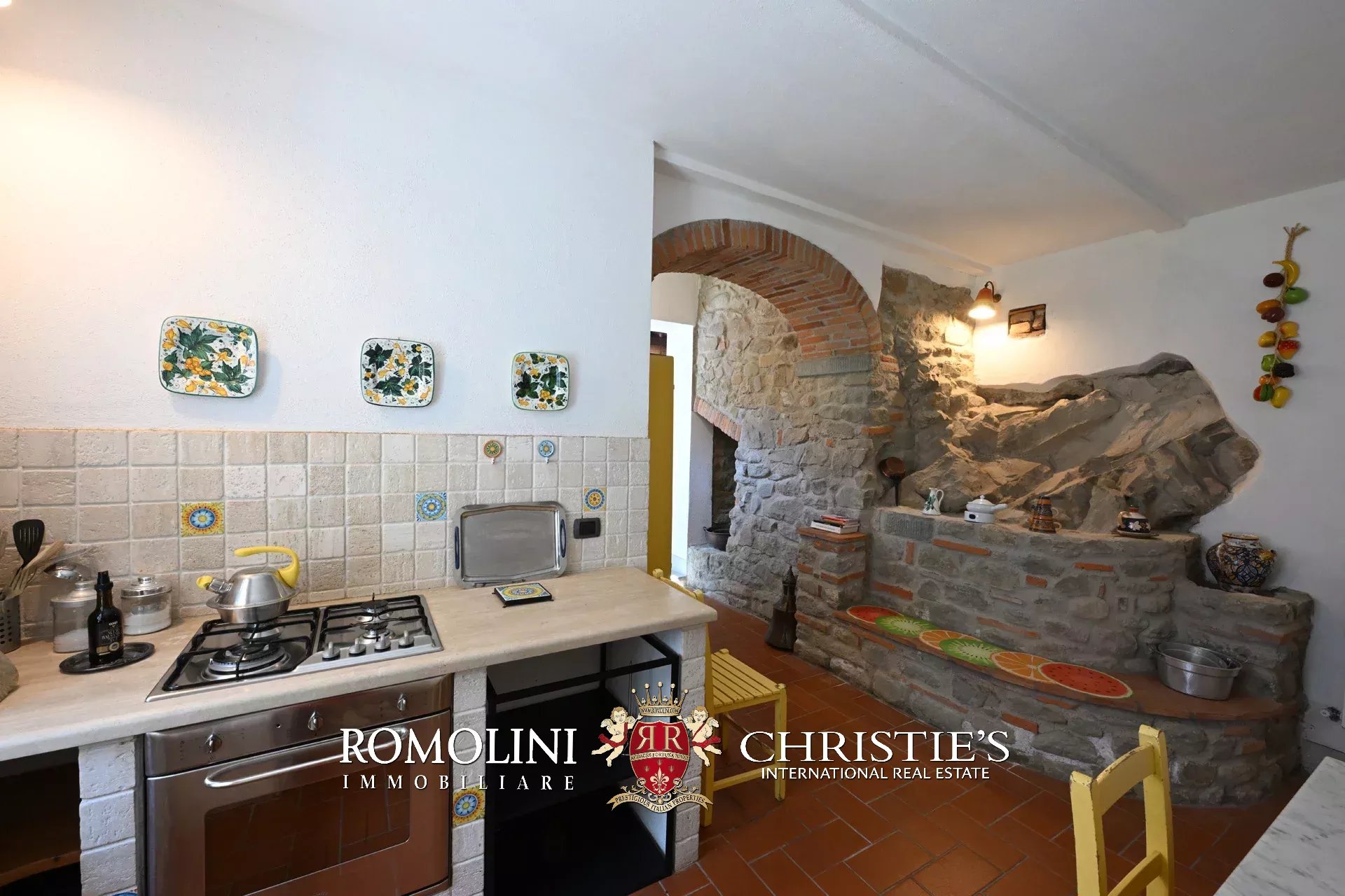Original and typical Tuscan materials were used in the renovation, maintaining the historic integrity of the building. The tiles in the bathrooms and kitchens are rough travertine, the masonry kitchen countertops are smooth travertine, and the floors are terracotta. Handcrafted ceramic decorations and untreated brass faucets add a touch of authenticity and refinement to the interiors, creating an environment that reflects the rustic Tuscan style.