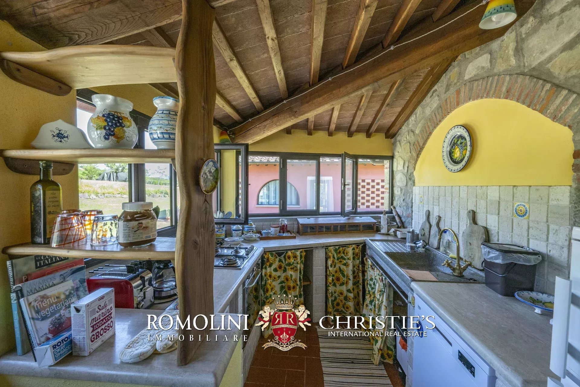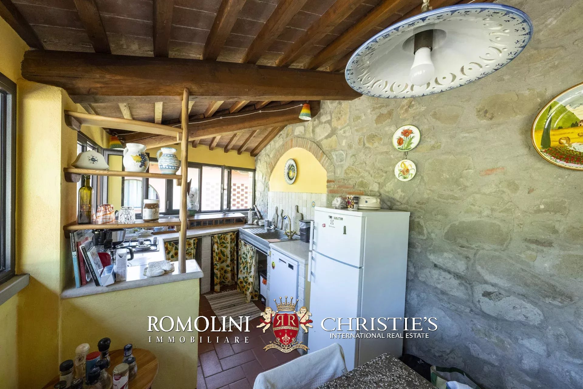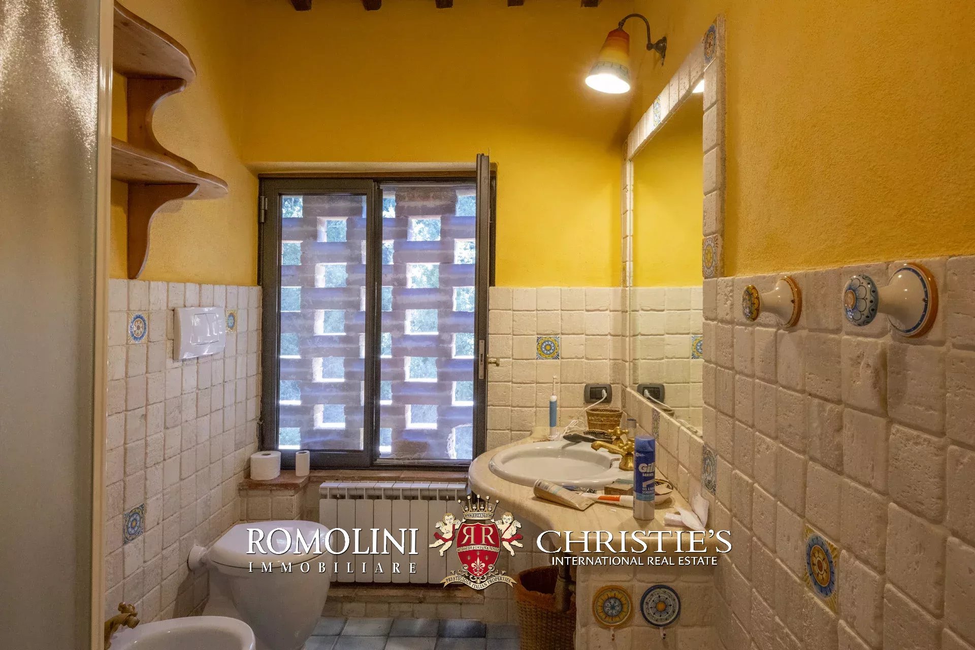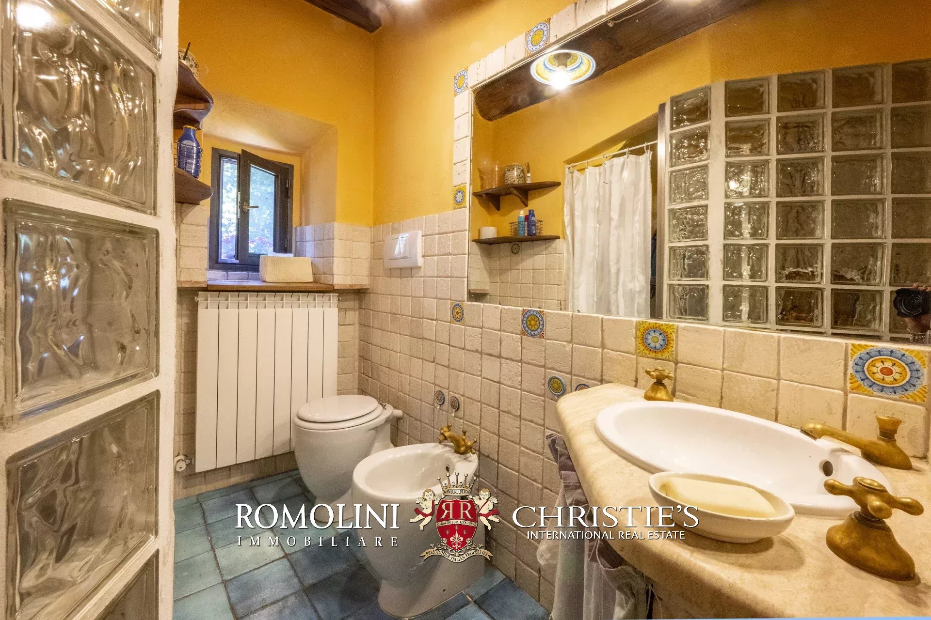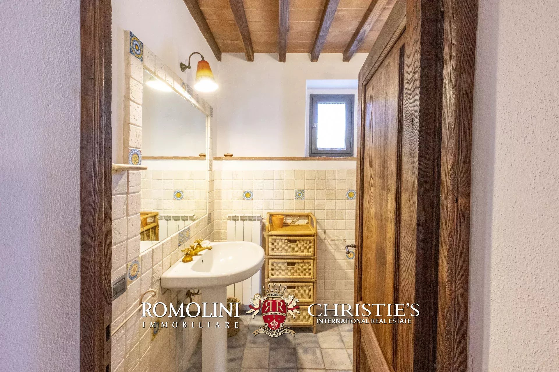 Original and typical Tuscan materials were used in the renovation, maintaining the historic integrity of the building. The tiles in the bathrooms and kitchens are rough travertine, the masonry kitchen countertops are smooth travertine, and the floors are terracotta. Handcrafted ceramic decorations and untreated brass faucets add a touch of authenticity and refinement to the interiors, creating an environment that reflects the rustic Tuscan style.