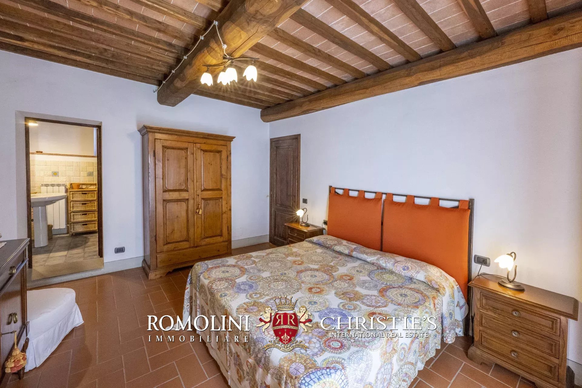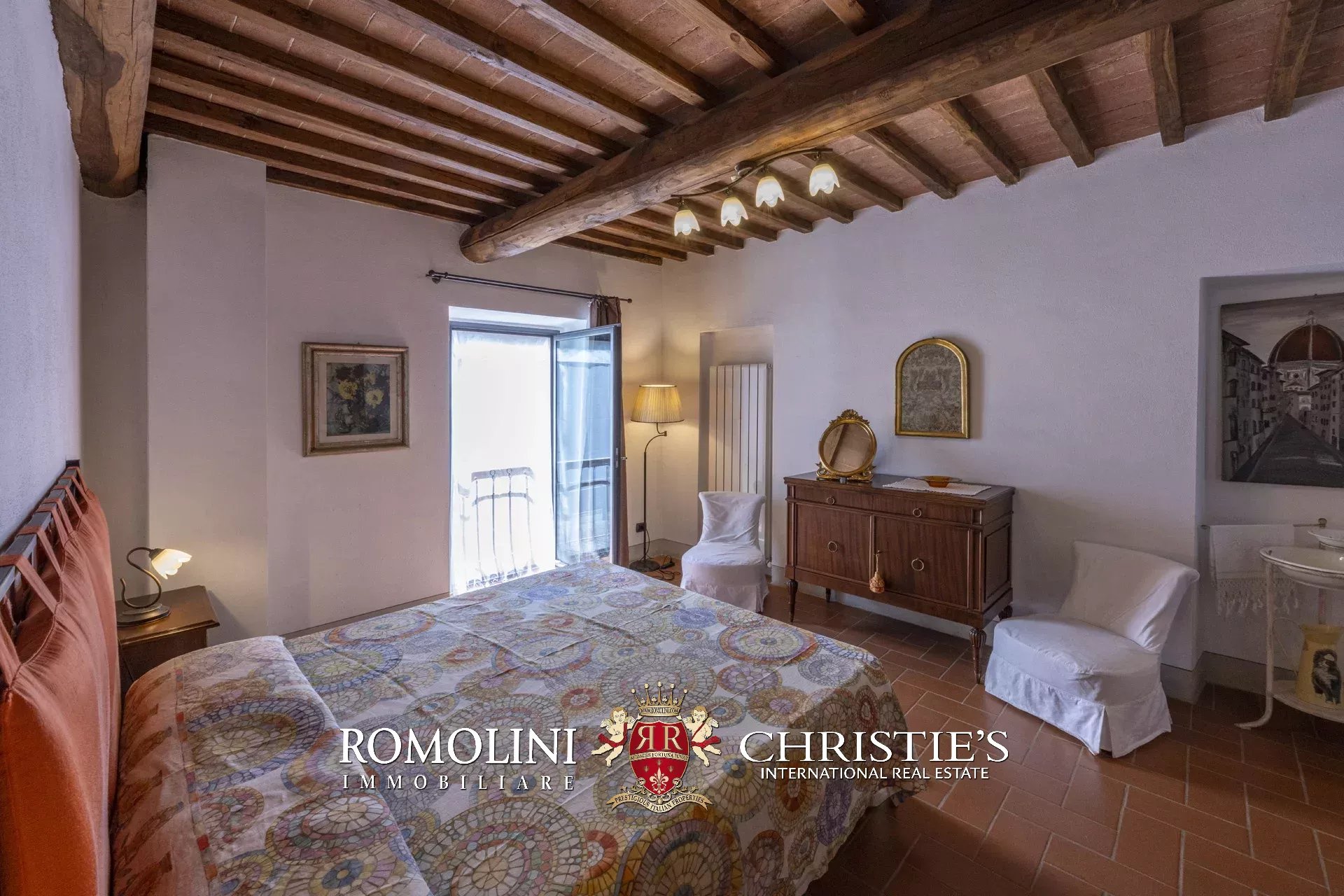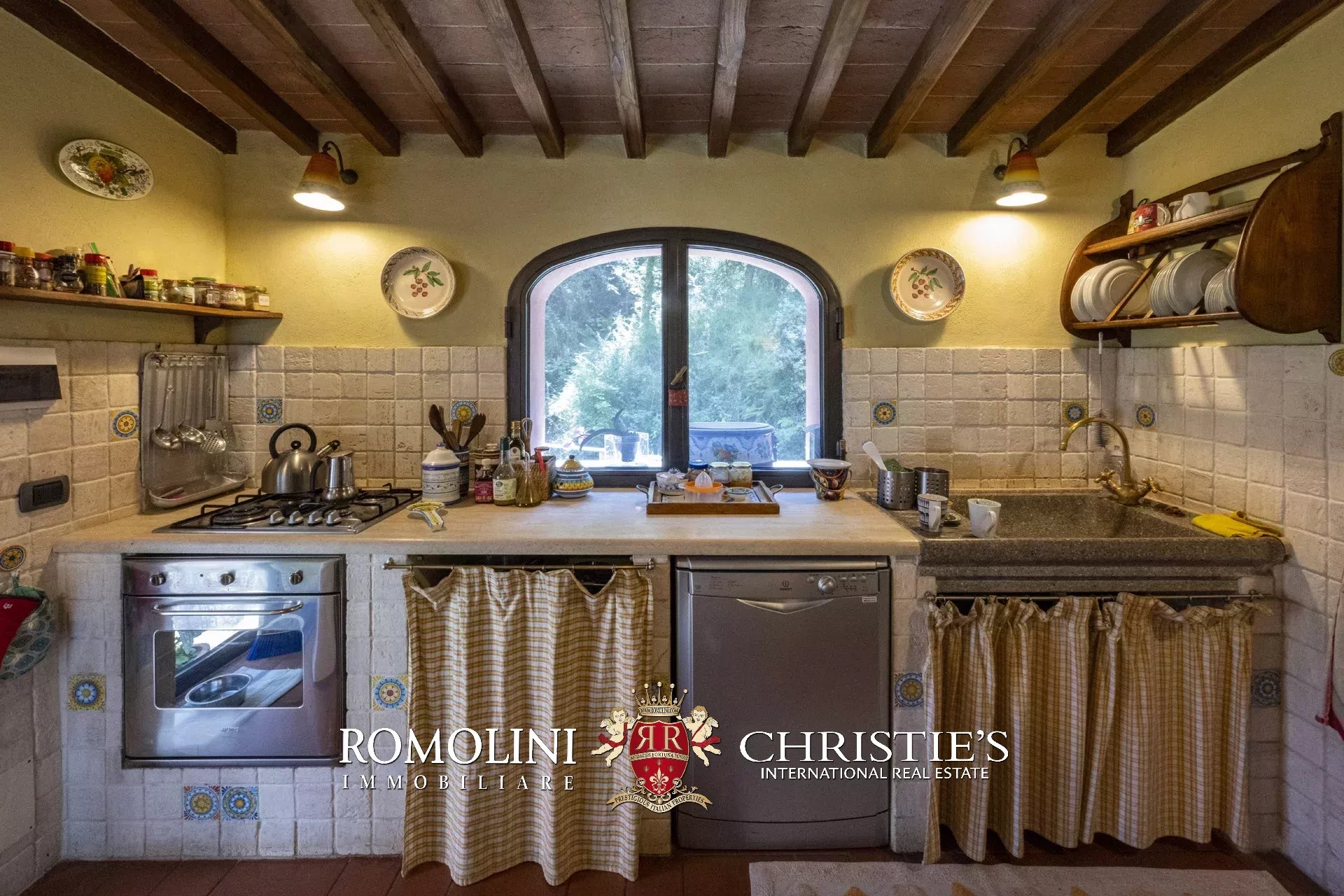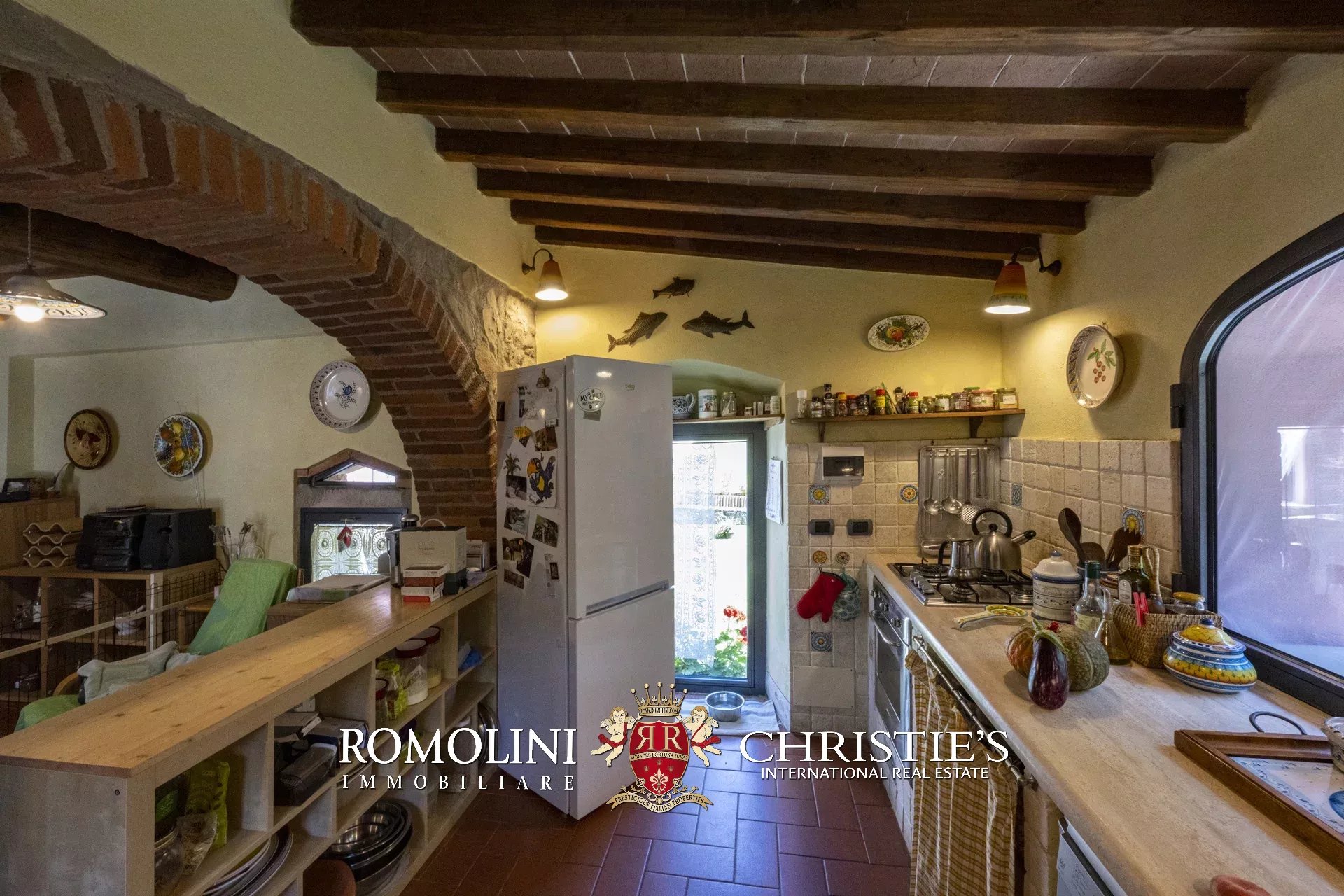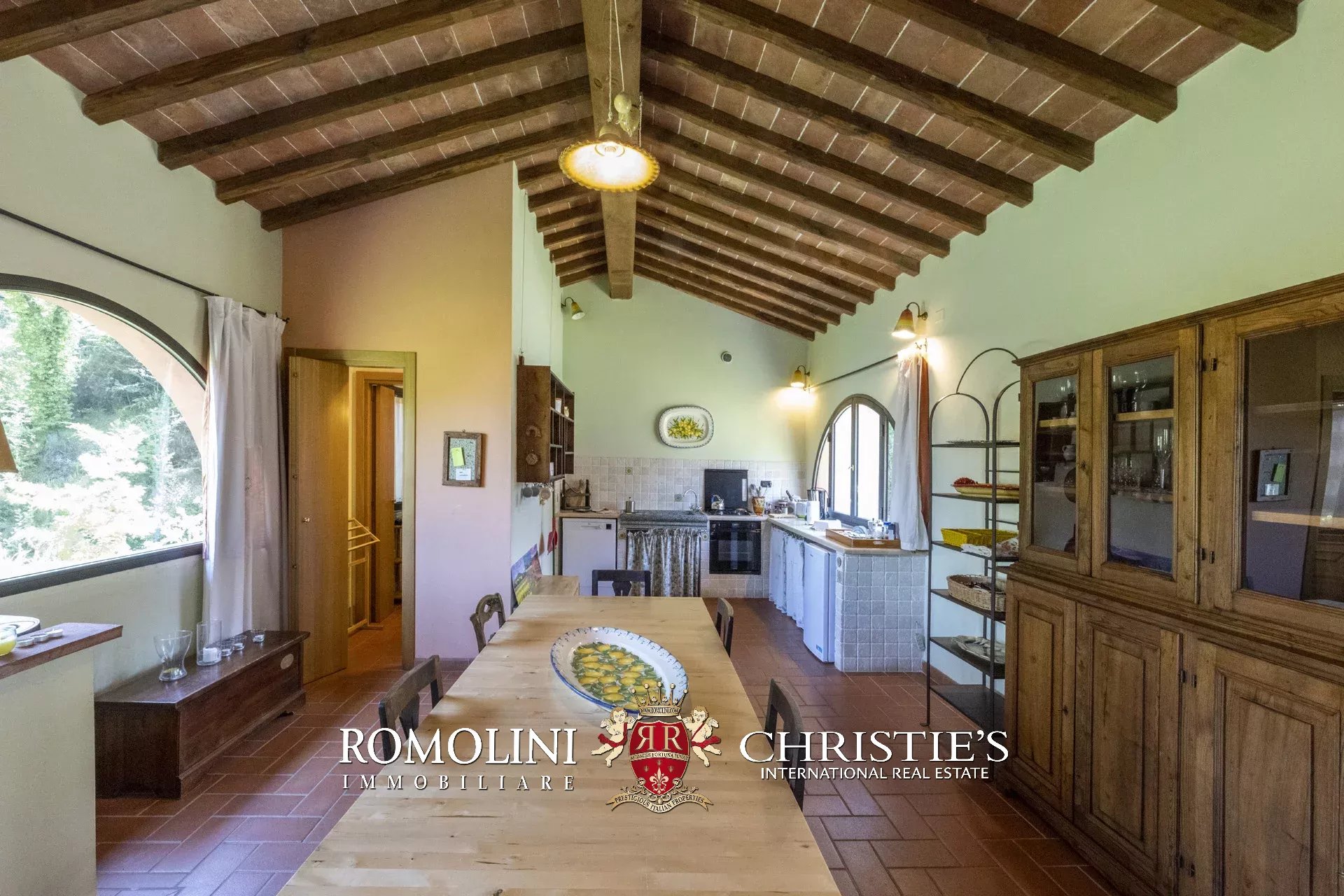 Original and typical Tuscan materials were used in the renovation, maintaining the historic integrity of the building. The tiles in the bathrooms and kitchens are rough travertine, the masonry kitchen countertops are smooth travertine, and the floors are terracotta. Handcrafted ceramic decorations and untreated brass faucets add a touch of authenticity and refinement to the interiors, creating an environment that reflects the rustic Tuscan style.