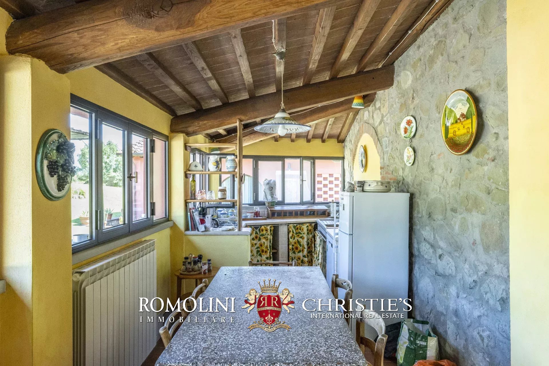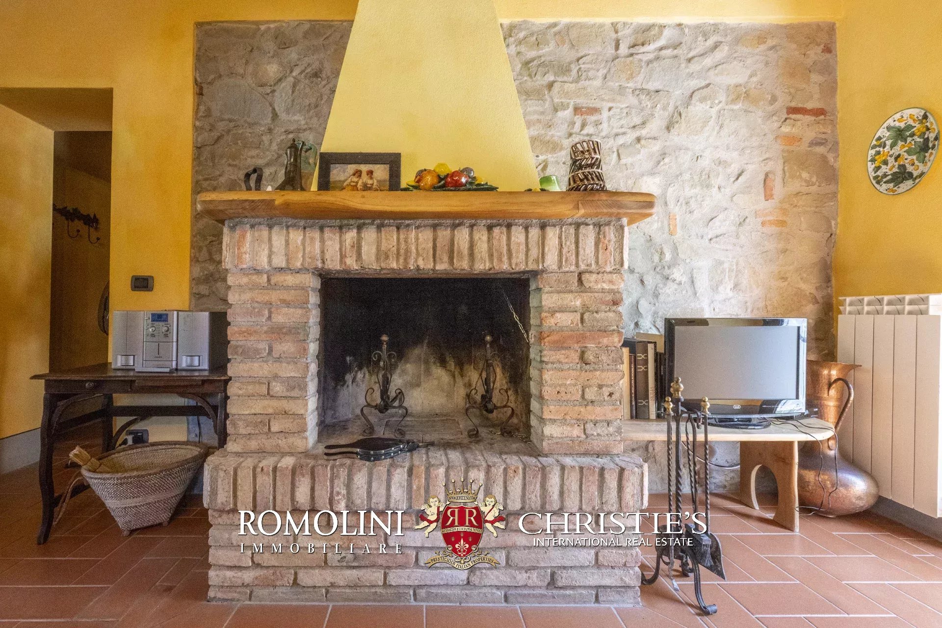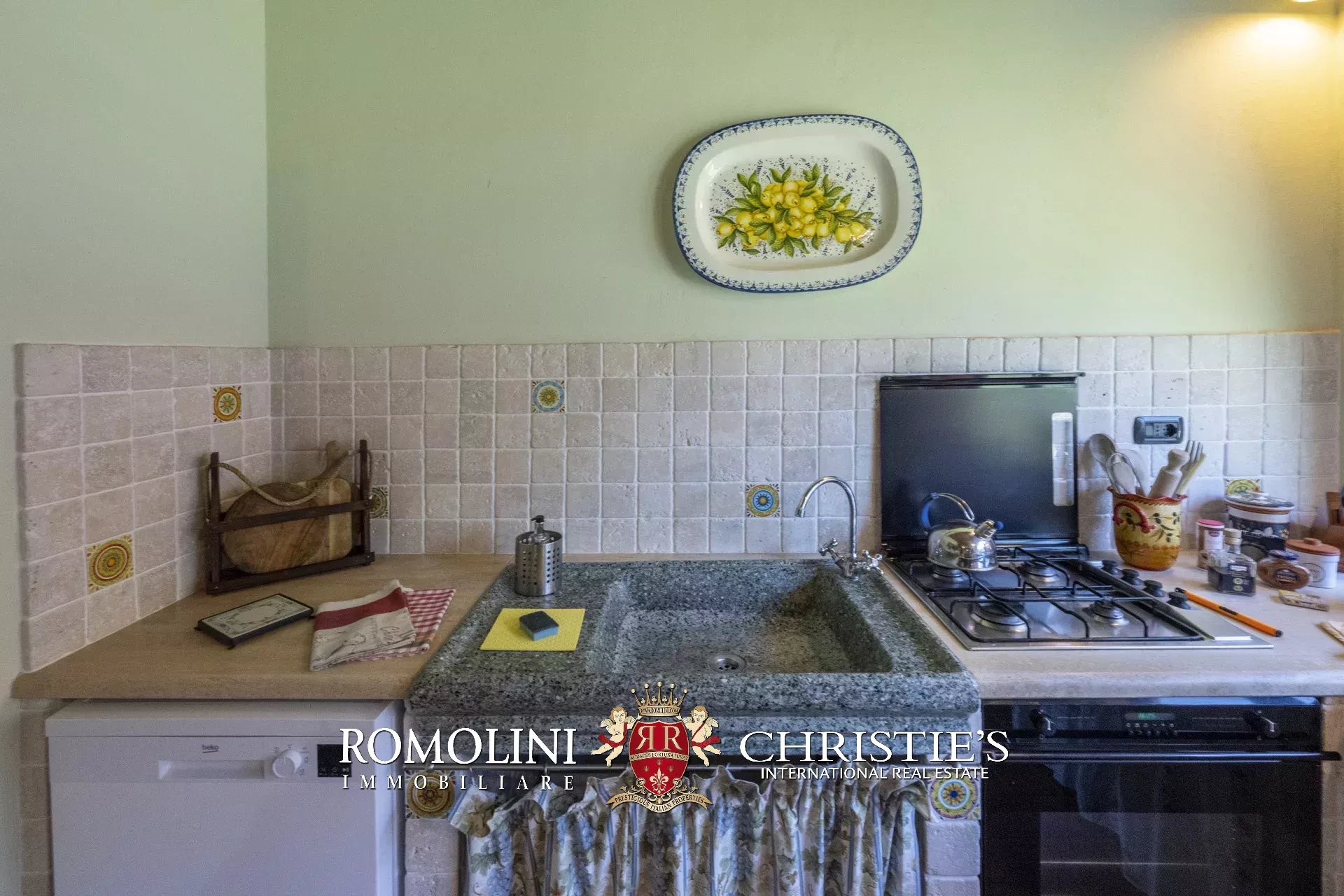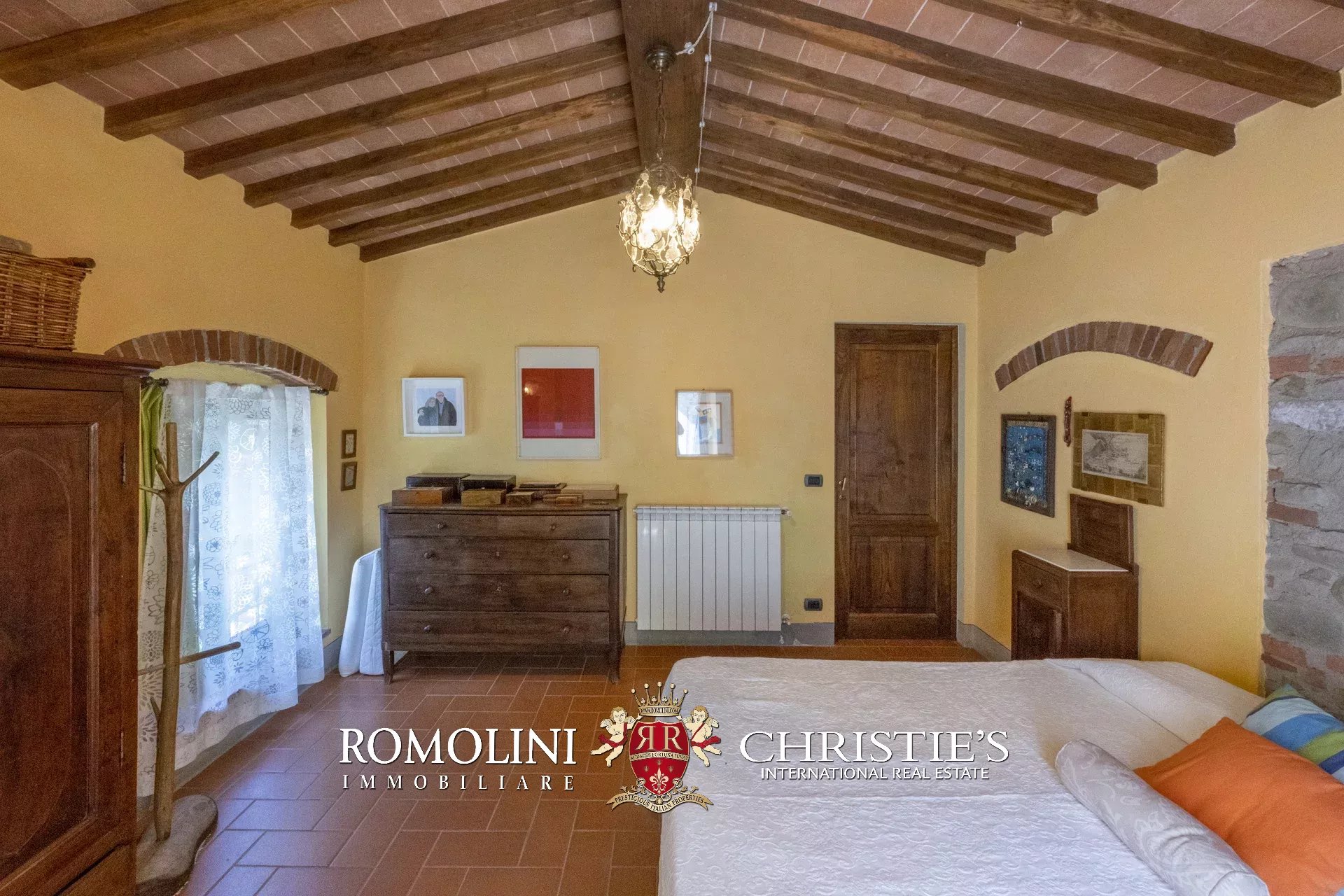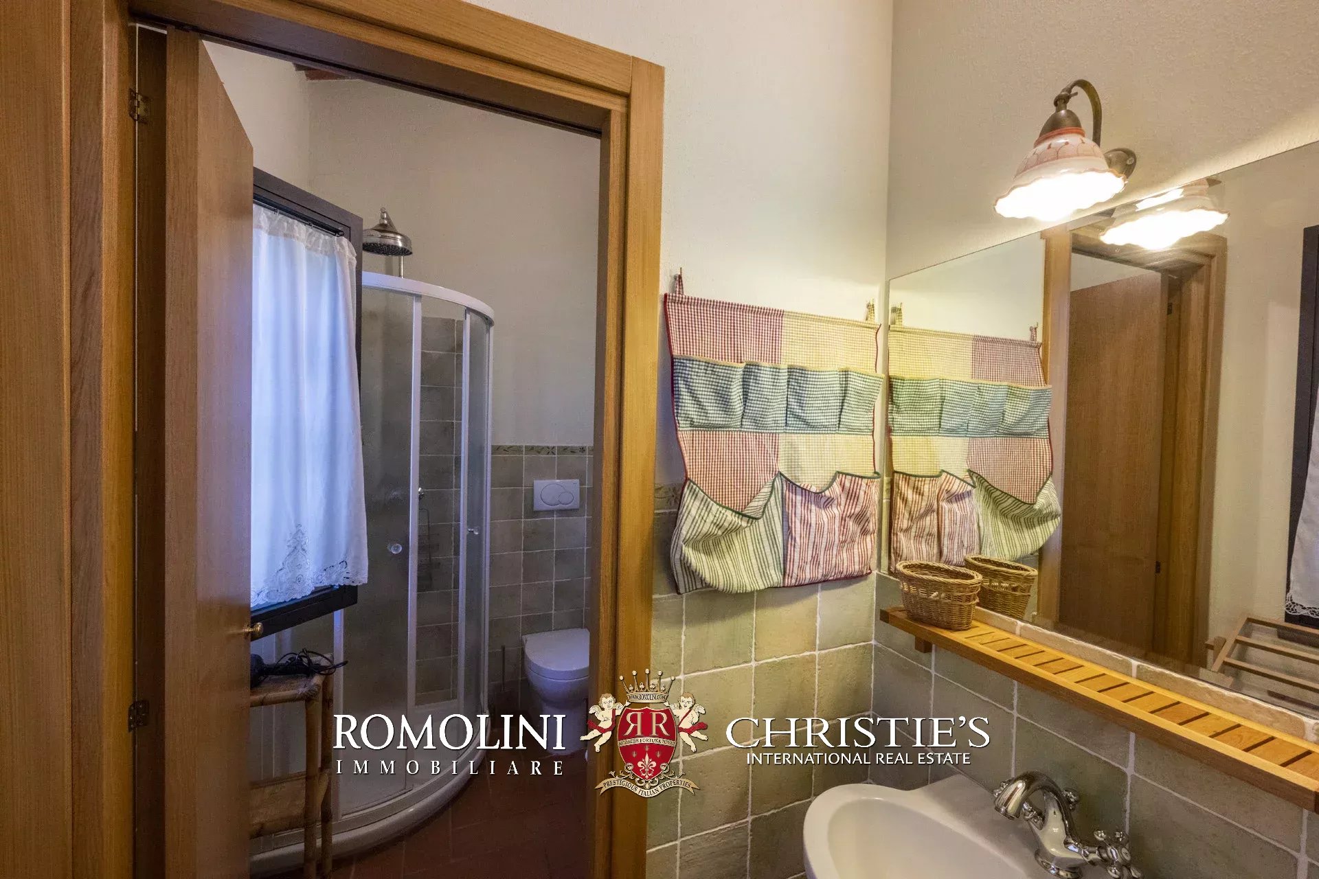 Original and typical Tuscan materials were used in the renovation, maintaining the historic integrity of the building. The tiles in the bathrooms and kitchens are rough travertine, the masonry kitchen countertops are smooth travertine, and the floors are terracotta. Handcrafted ceramic decorations and untreated brass faucets add a touch of authenticity and refinement to the interiors, creating an environment that reflects the rustic Tuscan style.