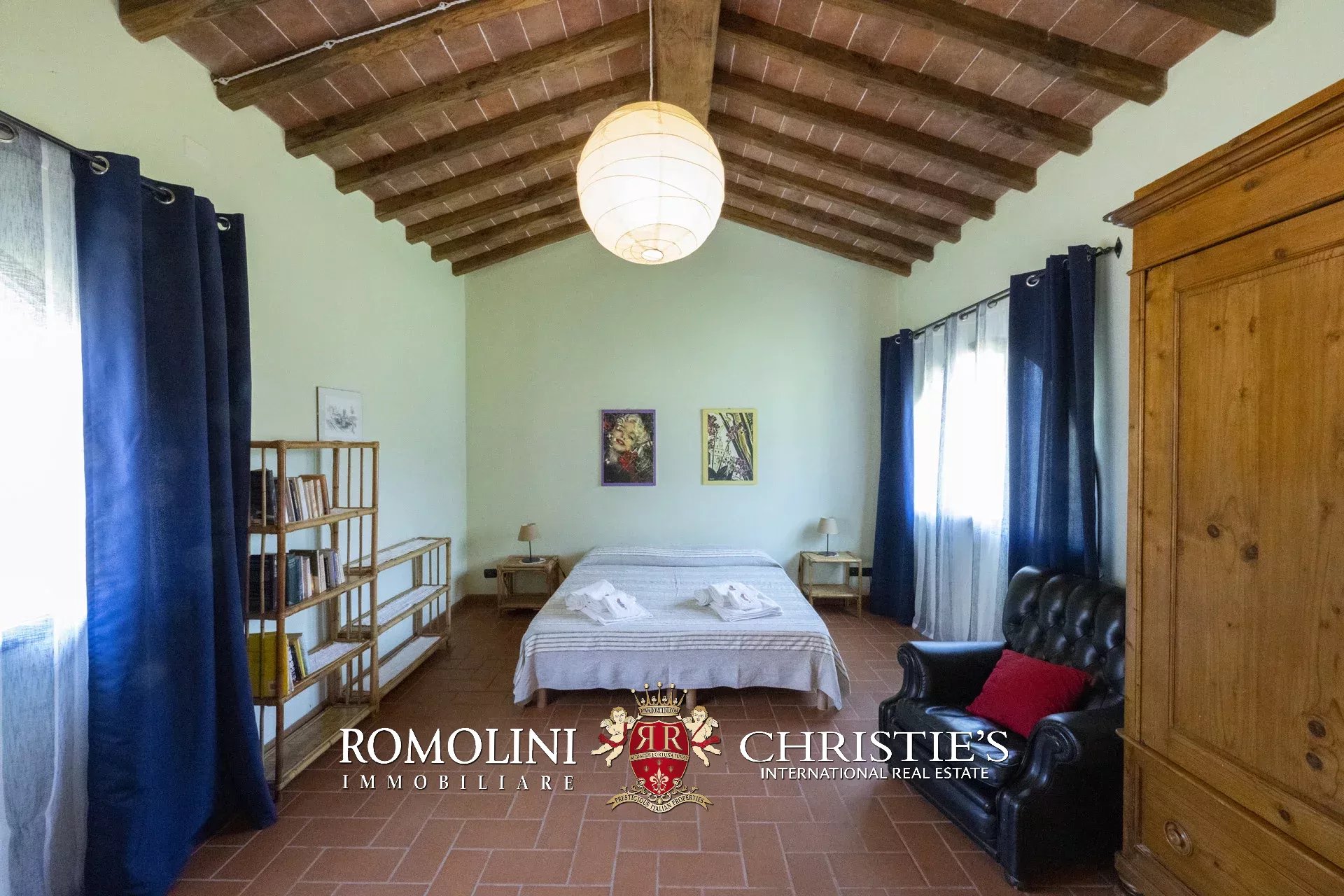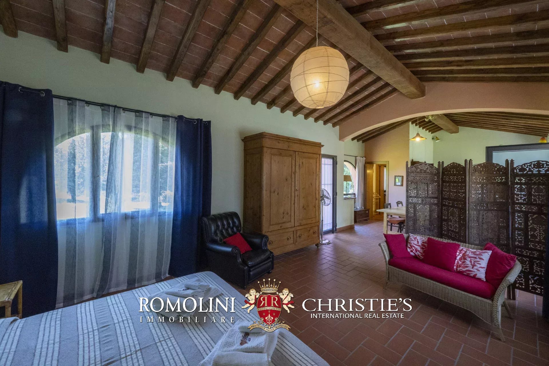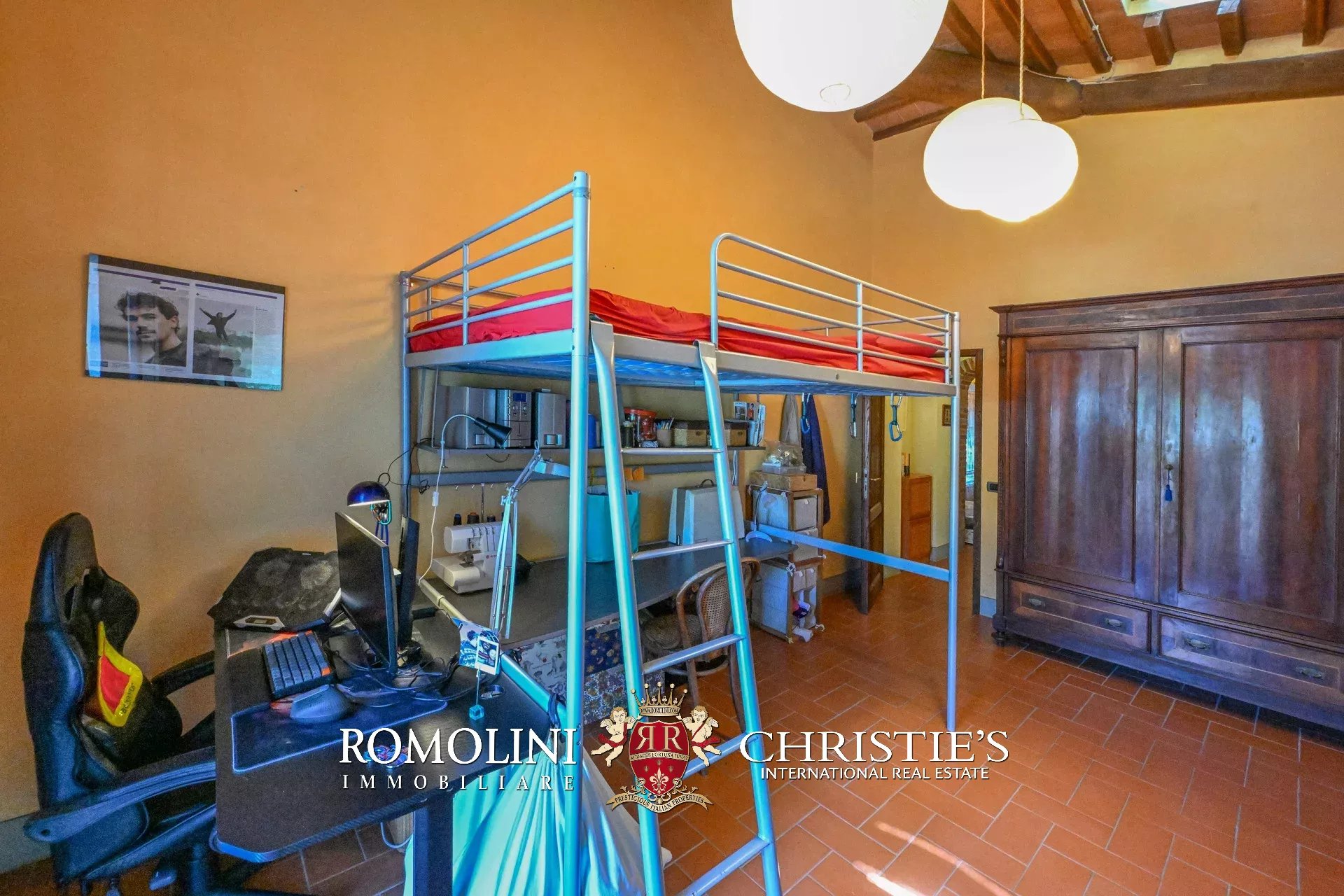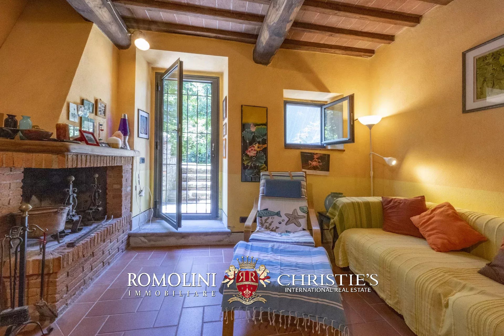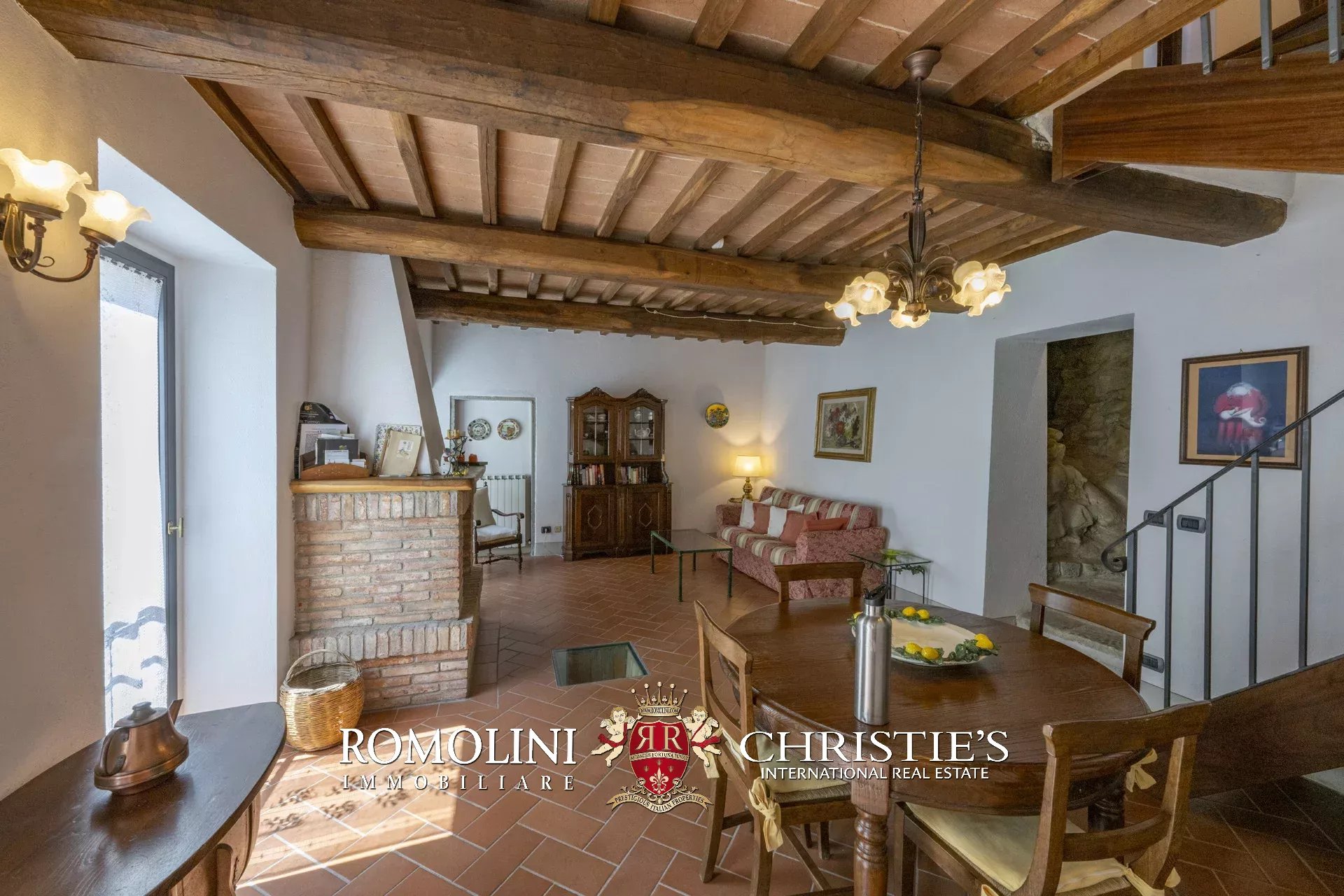 Original and typical Tuscan materials were used in the renovation, maintaining the historic integrity of the building. The tiles in the bathrooms and kitchens are rough travertine, the masonry kitchen countertops are smooth travertine, and the floors are terracotta. Handcrafted ceramic decorations and untreated brass faucets add a touch of authenticity and refinement to the interiors, creating an environment that reflects the rustic Tuscan style.