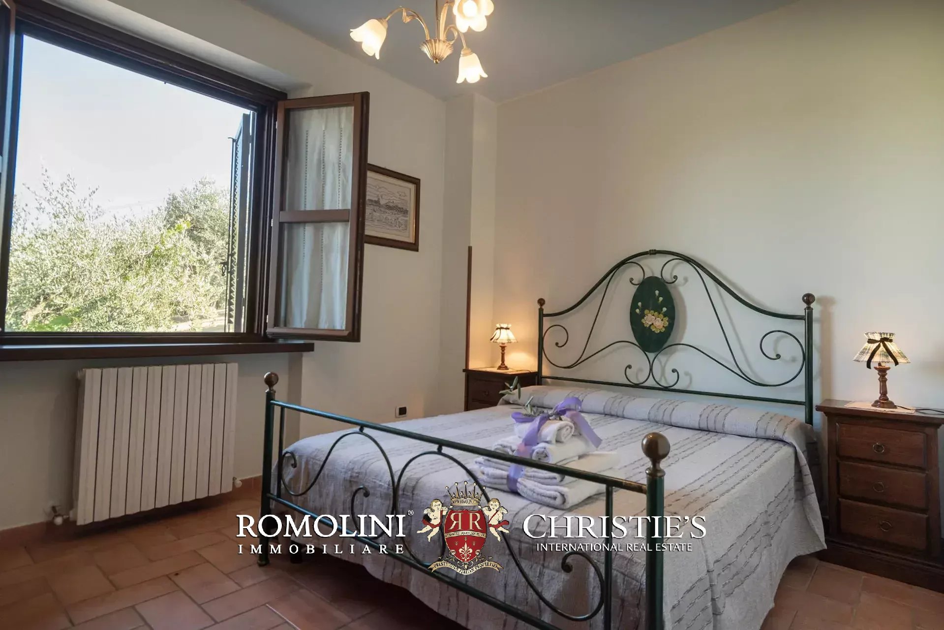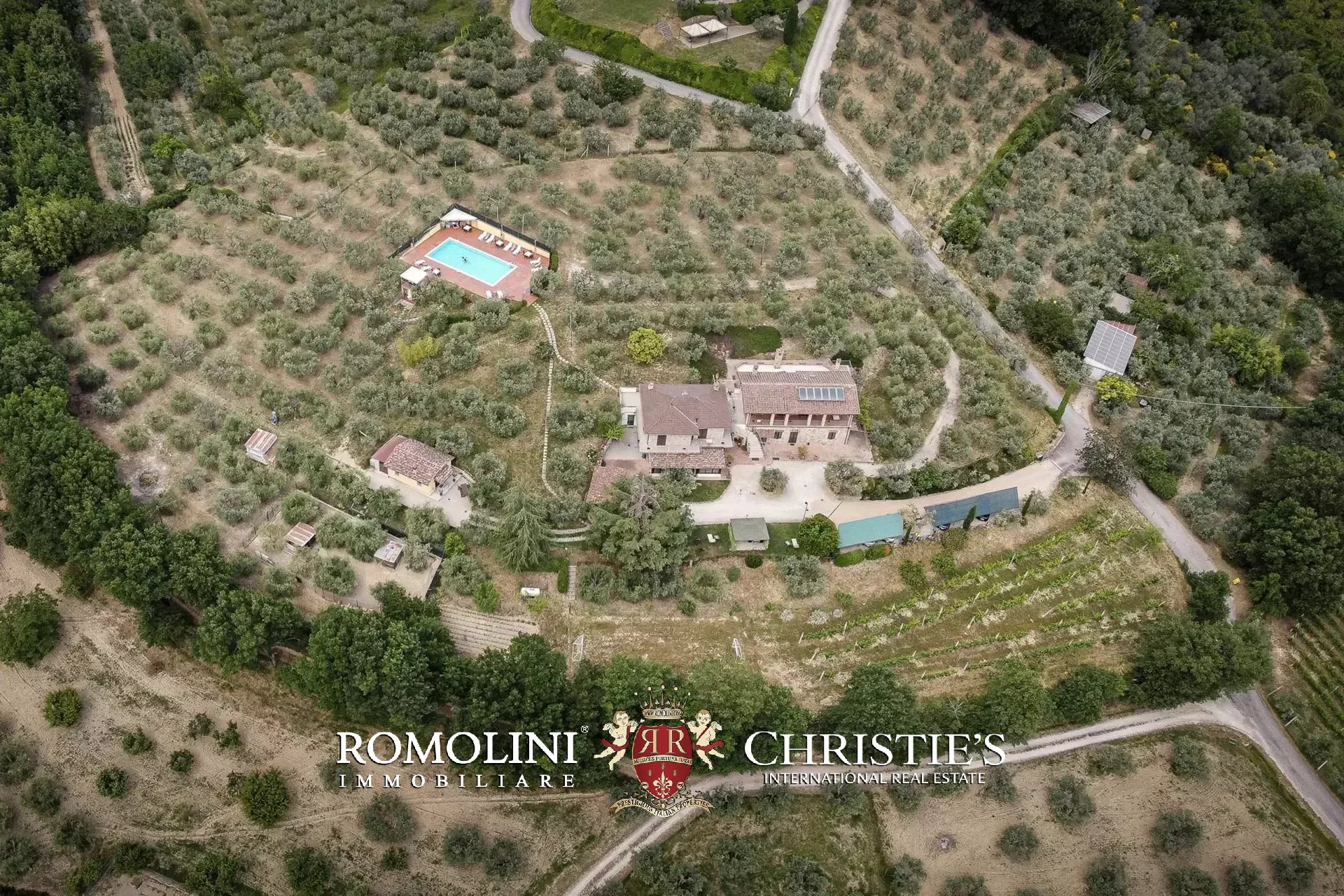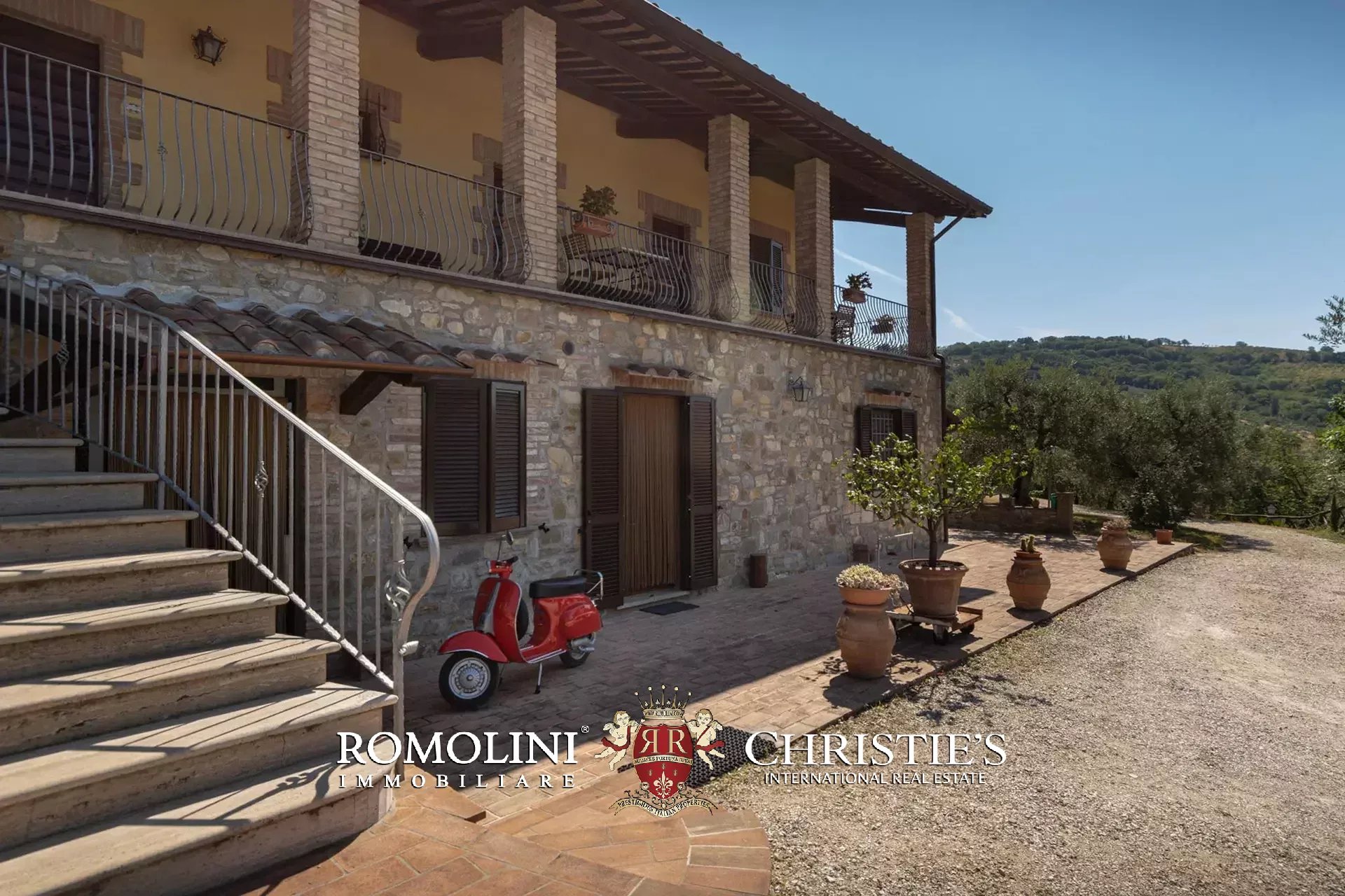 The property is set in a fully fenced plot of 15,000 m², with access through an automatic gate. The land hosts about 350 olive trees in production and a small vineyard, which allow the production of organic olive oil and DOC wine (Merlot, Grechetto and Sangiovese).