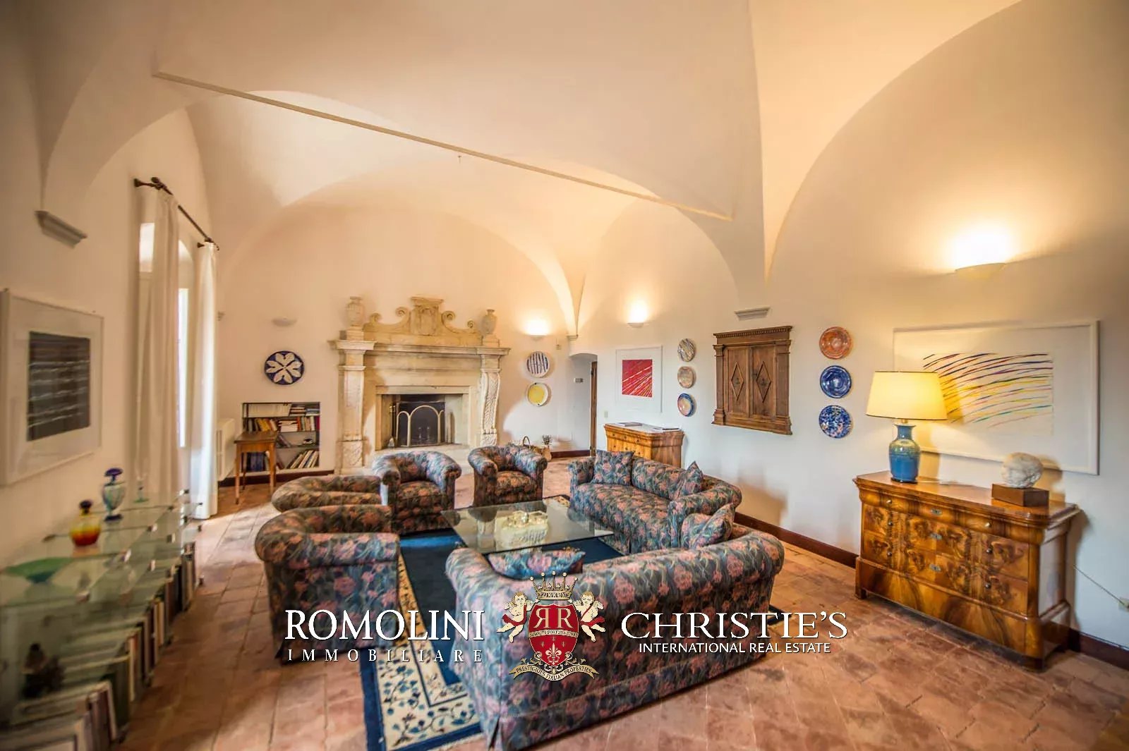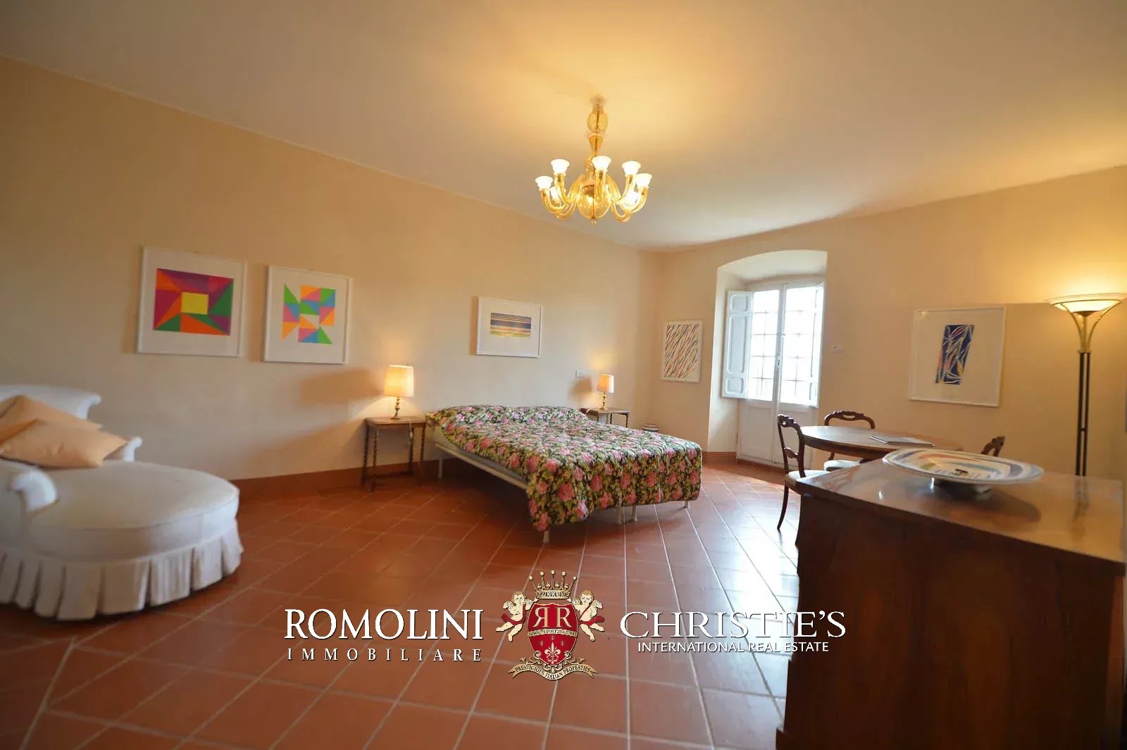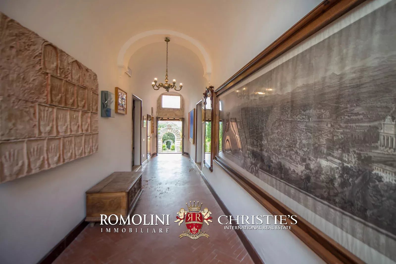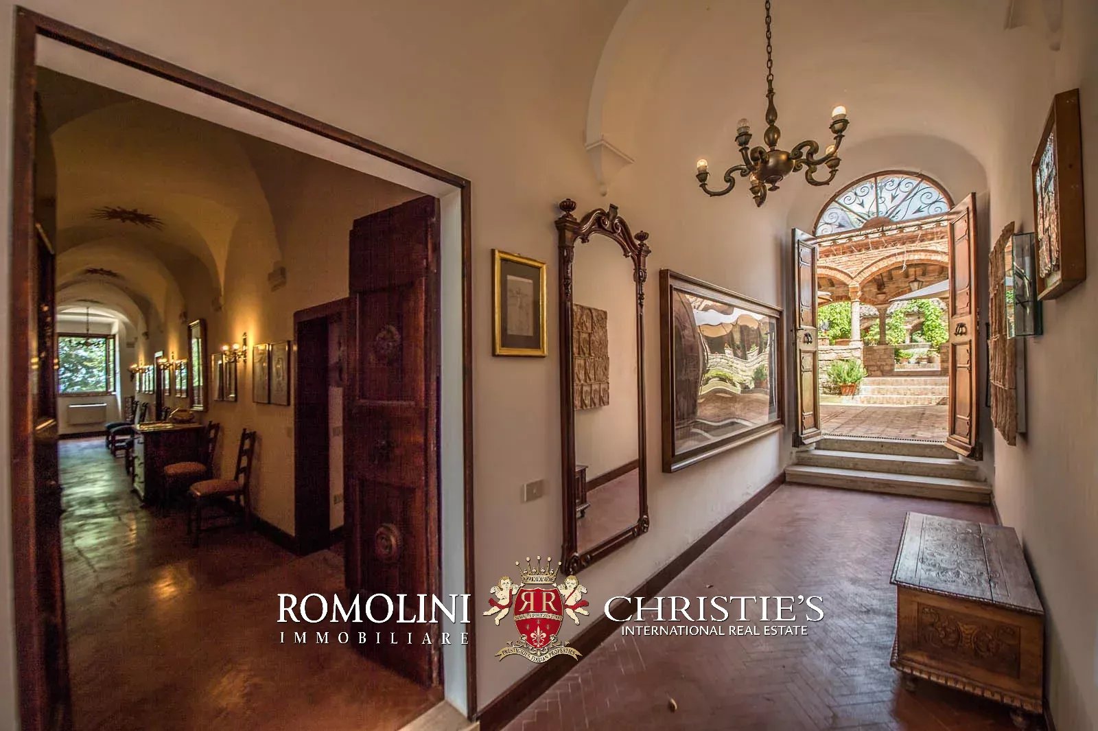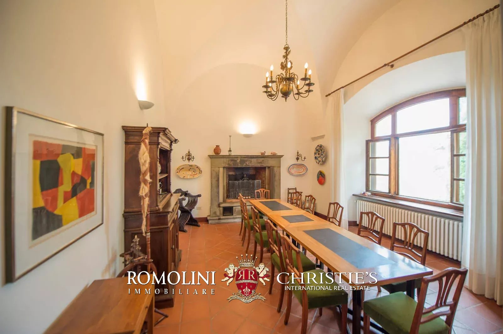 • Ground floor: long hallway, studio with bathroom, ample living room with fireplace and frescoes (formerly a refectory, with access onto the panoramic terrace), fine dining room, kitchen with service room, laundry and a covered terrace linked to the pantry;