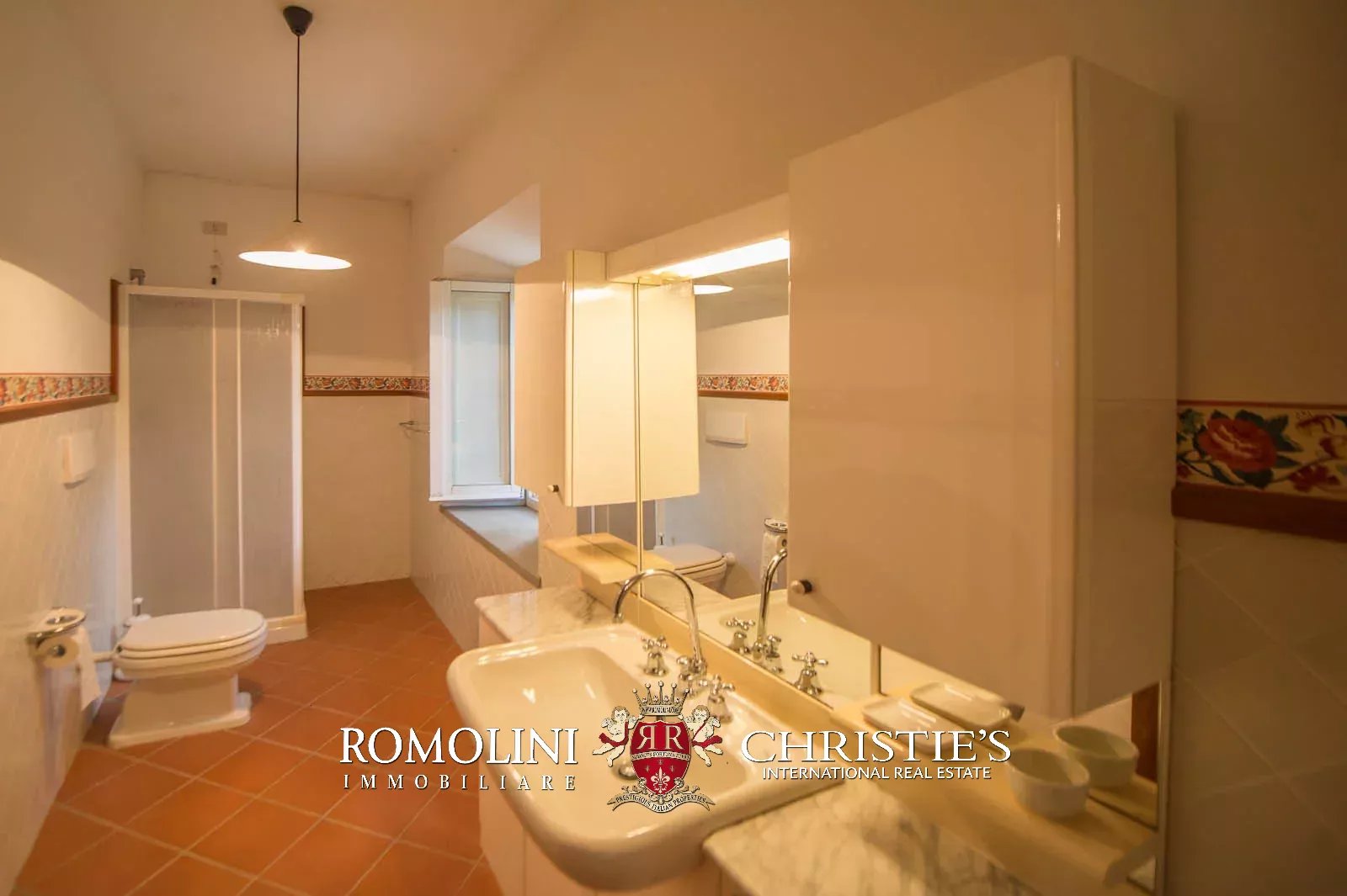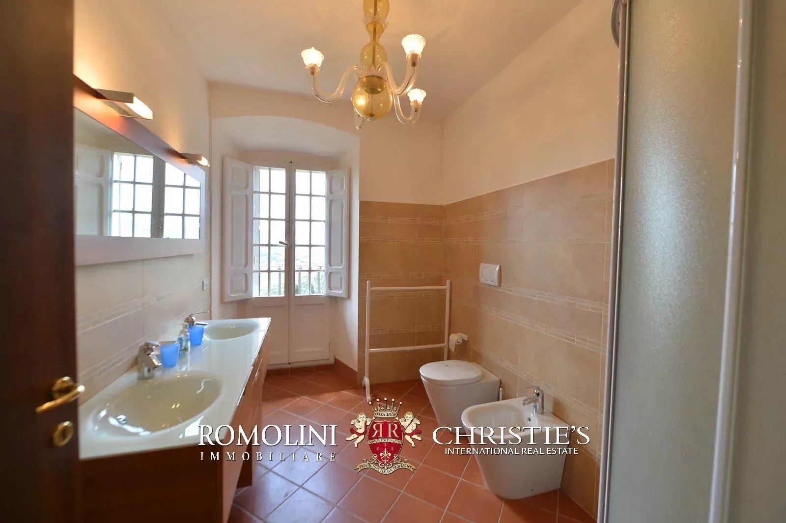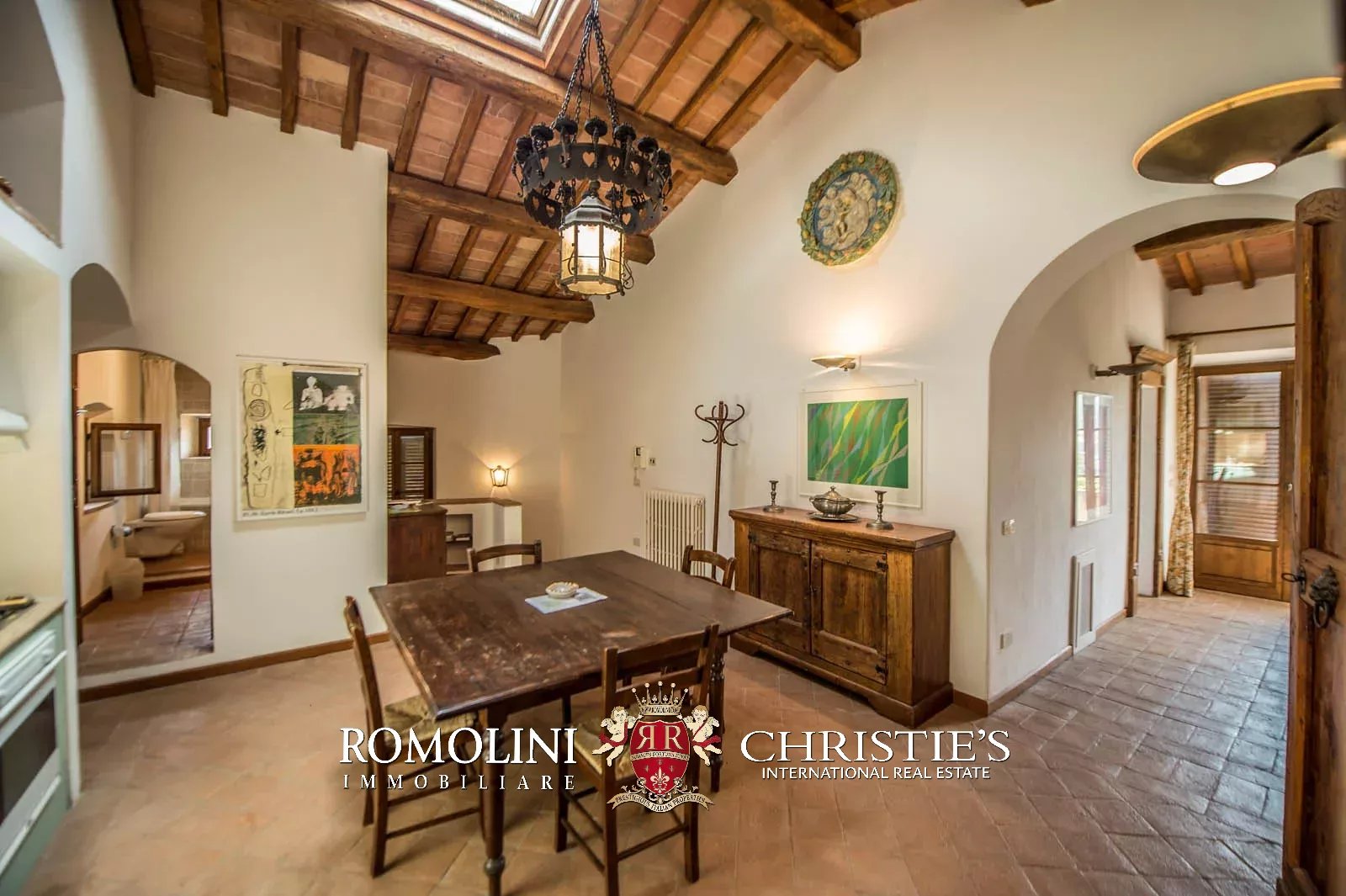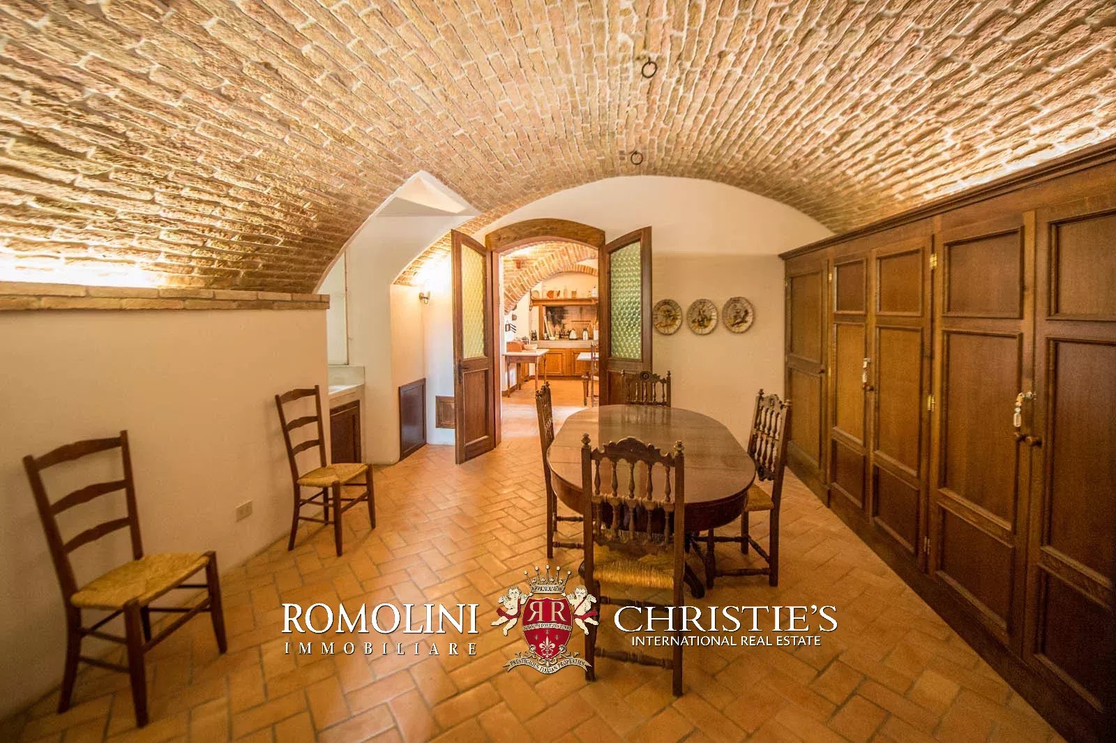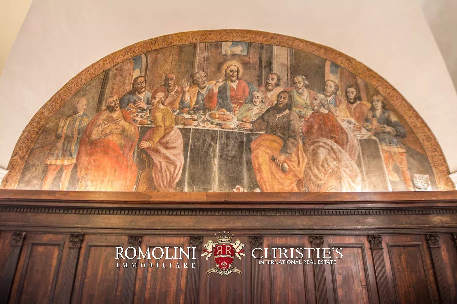 • Ground floor: long hallway, studio with bathroom, ample living room with fireplace and frescoes (formerly a refectory, with access onto the panoramic terrace), fine dining room, kitchen with service room, laundry and a covered terrace linked to the pantry;