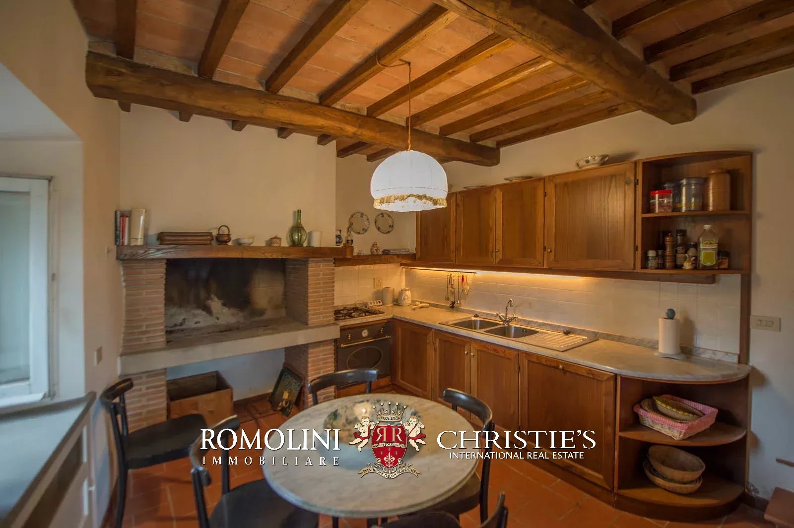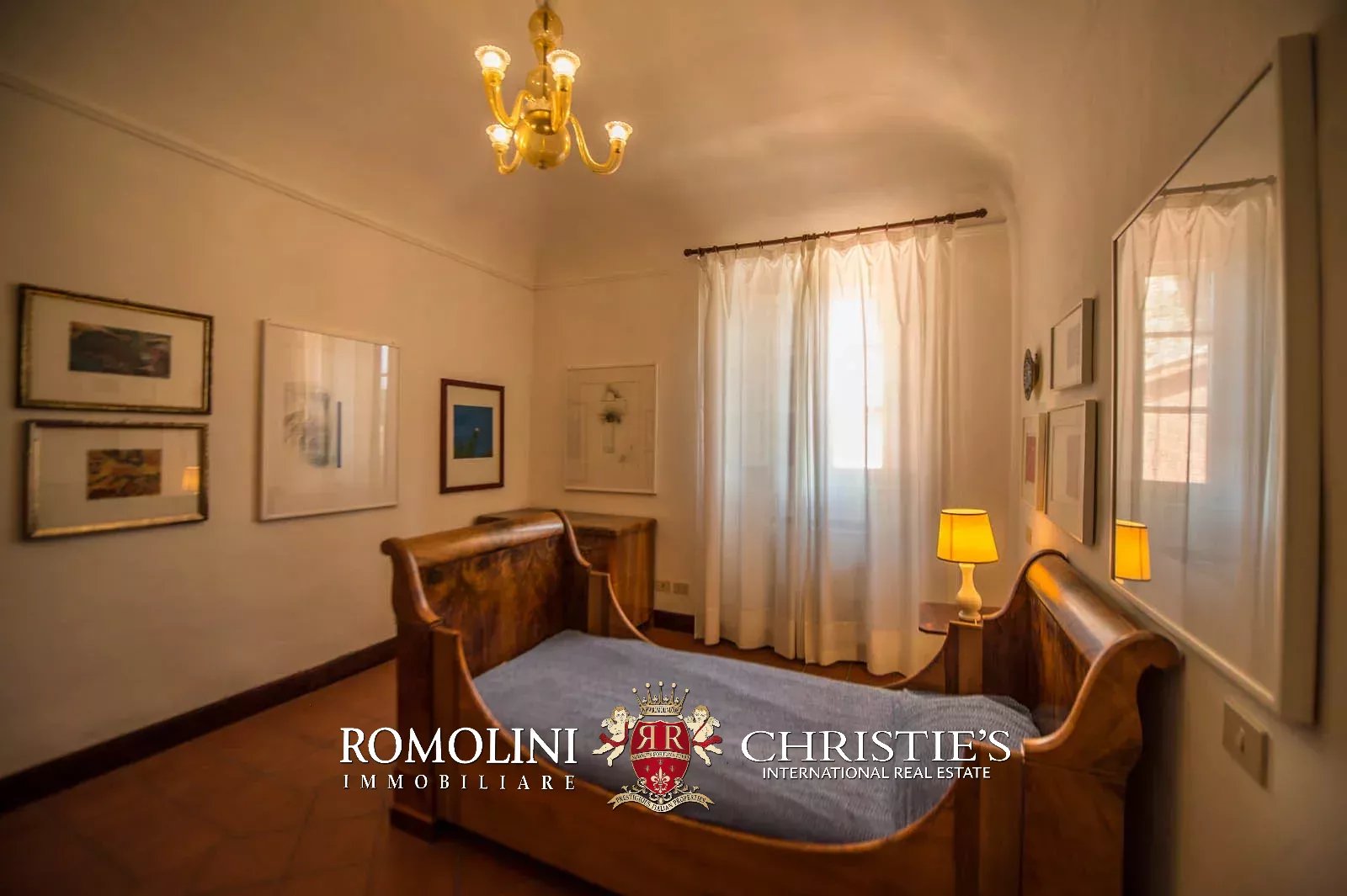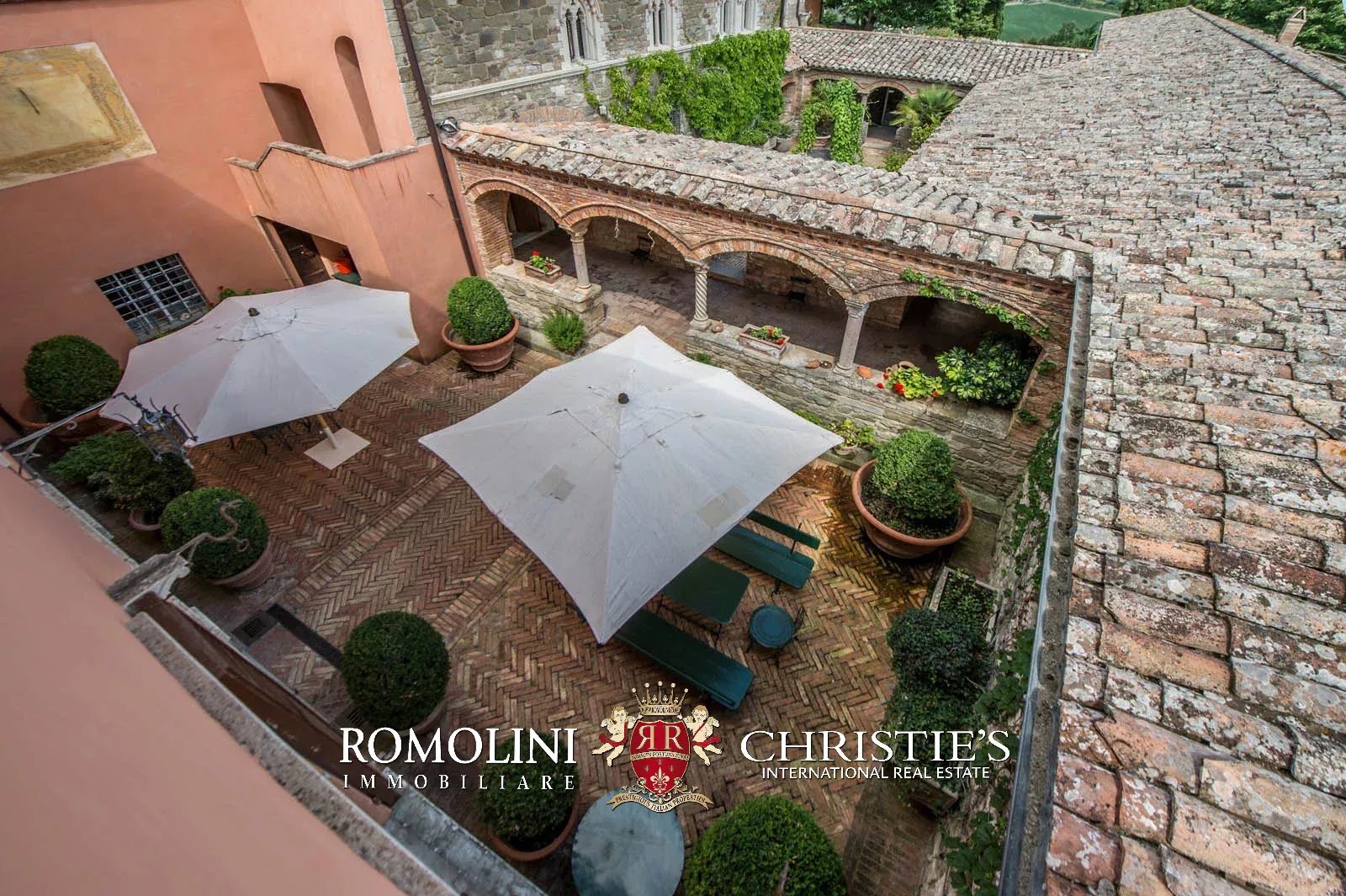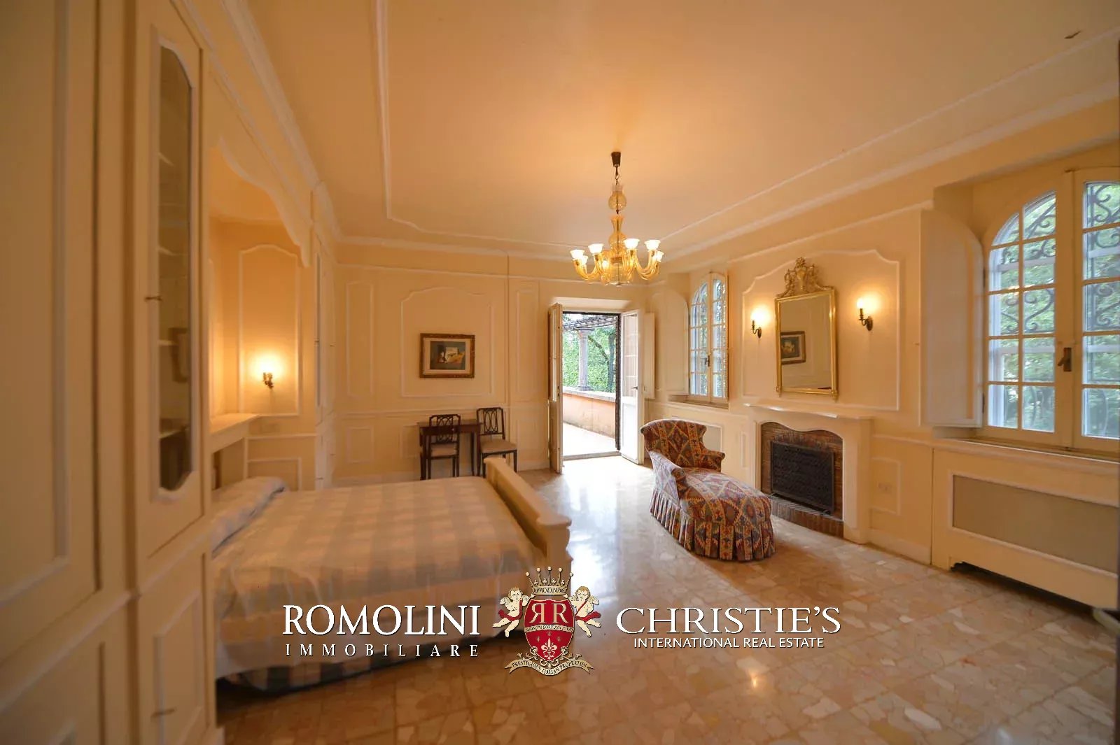 • Ground floor: long hallway, studio with bathroom, ample living room with fireplace and frescoes (formerly a refectory, with access onto the panoramic terrace), fine dining room, kitchen with service room, laundry and a covered terrace linked to the pantry;