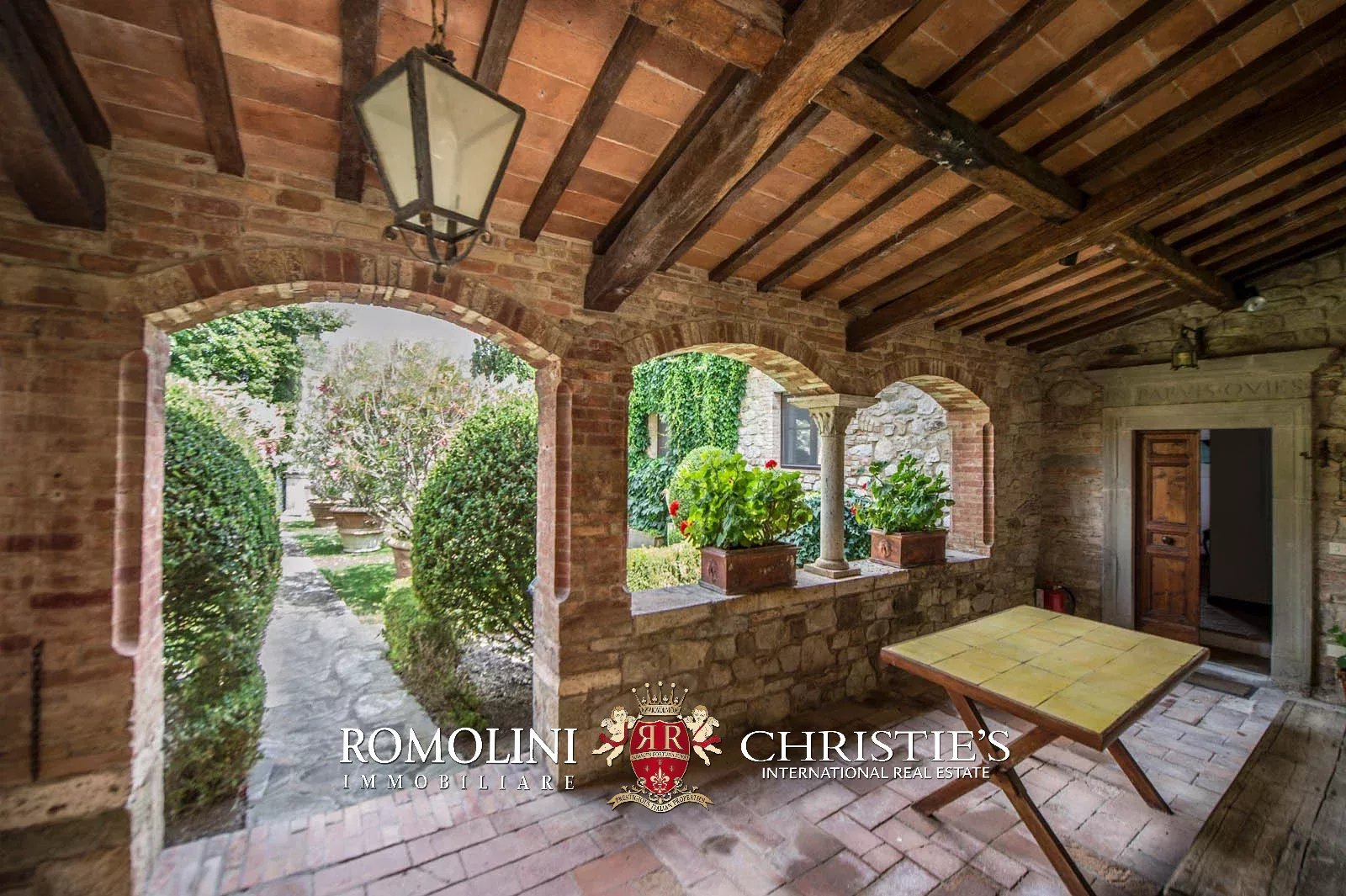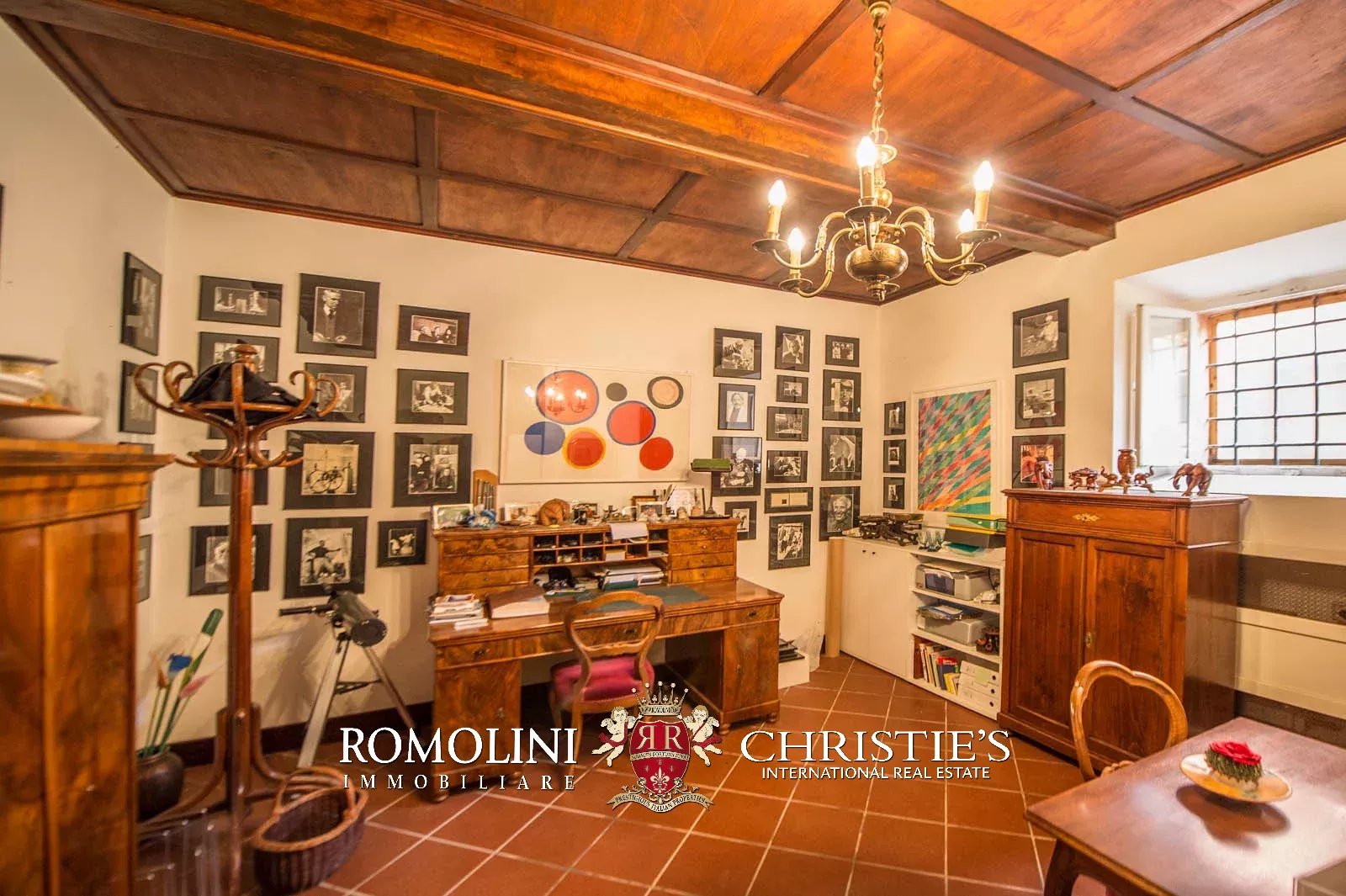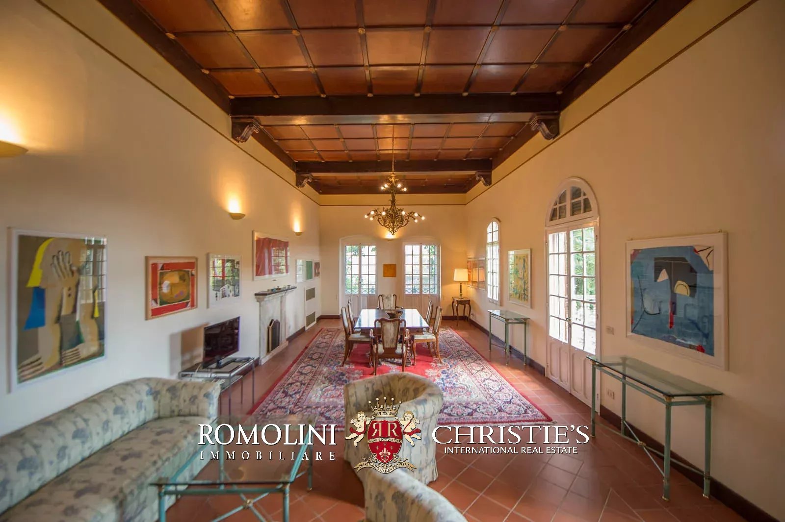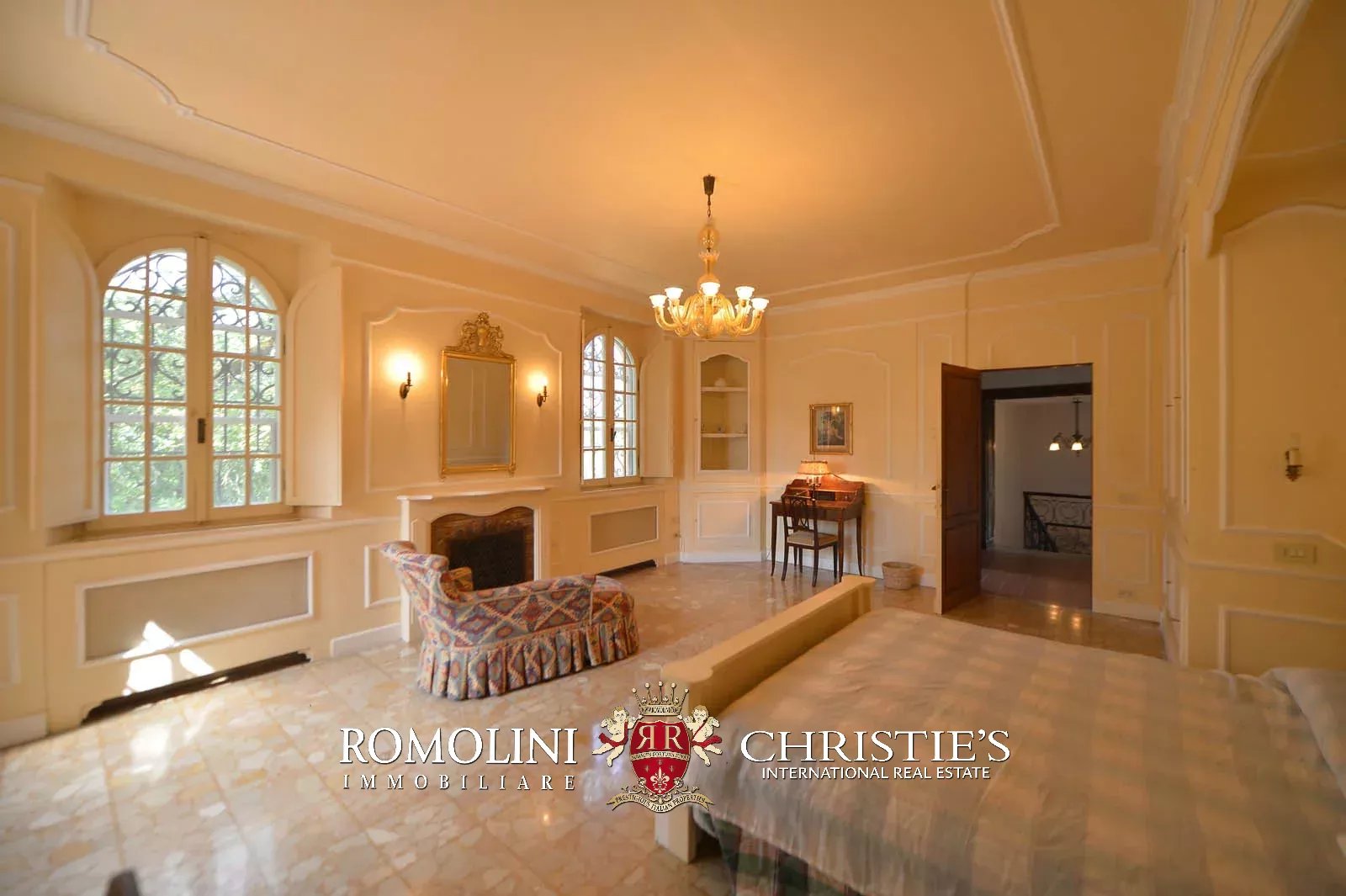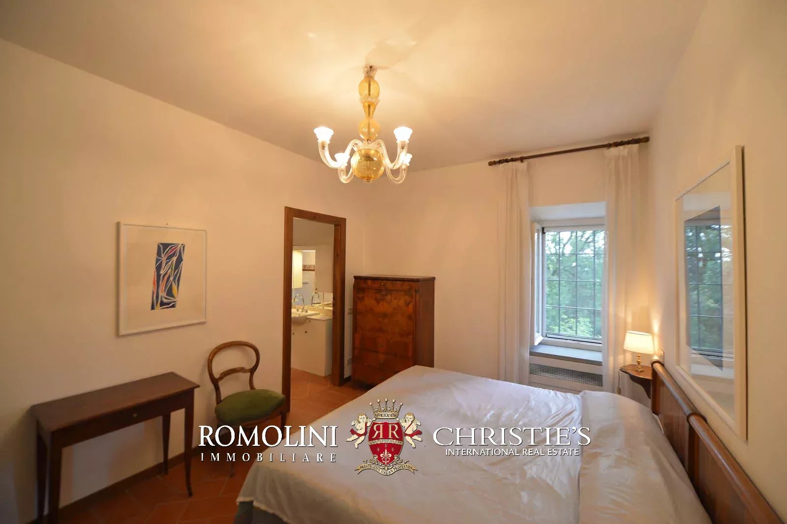• Ground floor: long hallway, studio with bathroom, ample living room with fireplace and frescoes (formerly a refectory, with access onto the panoramic terrace), fine dining room, kitchen with service room, laundry and a covered terrace linked to the pantry;