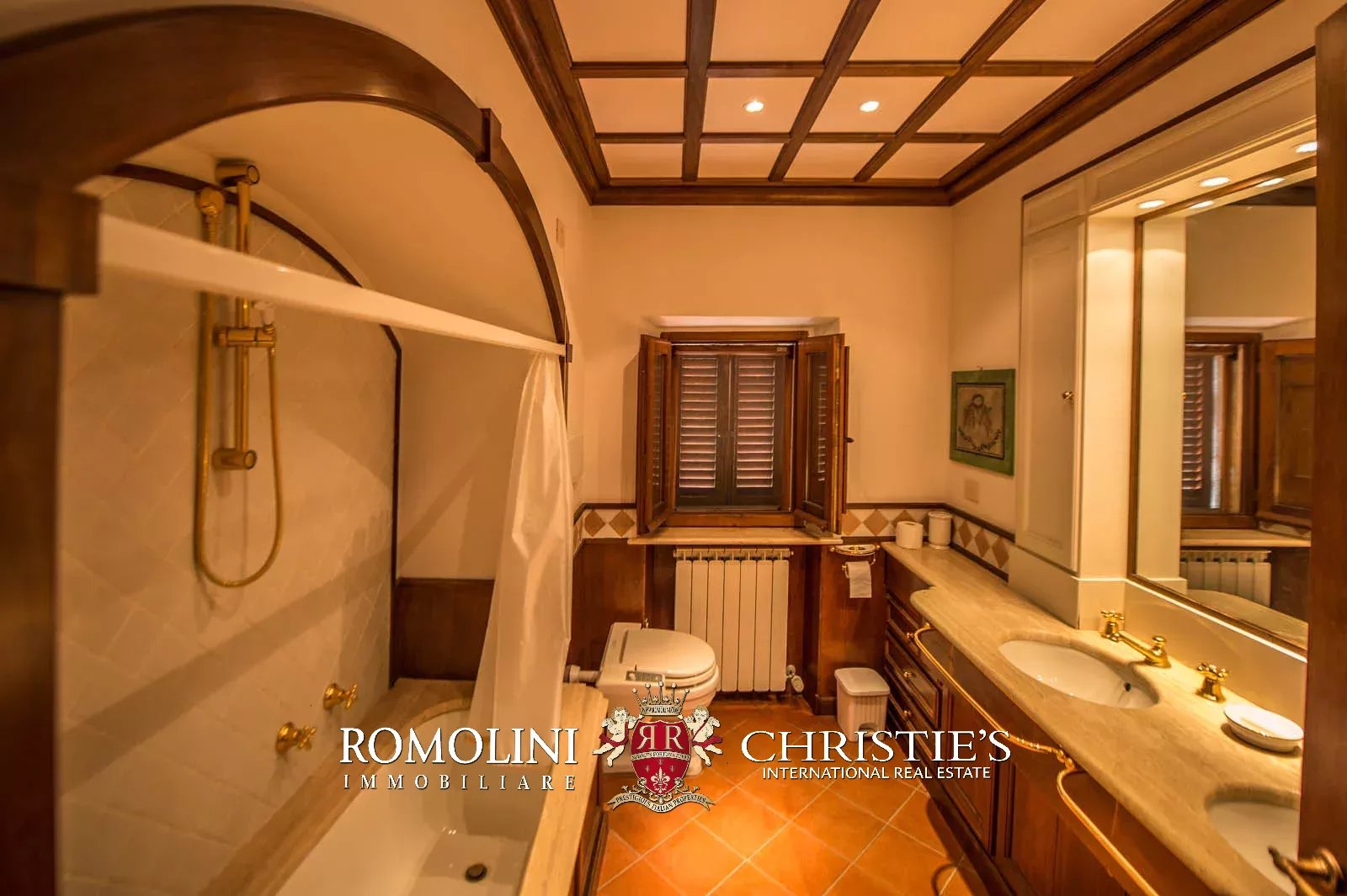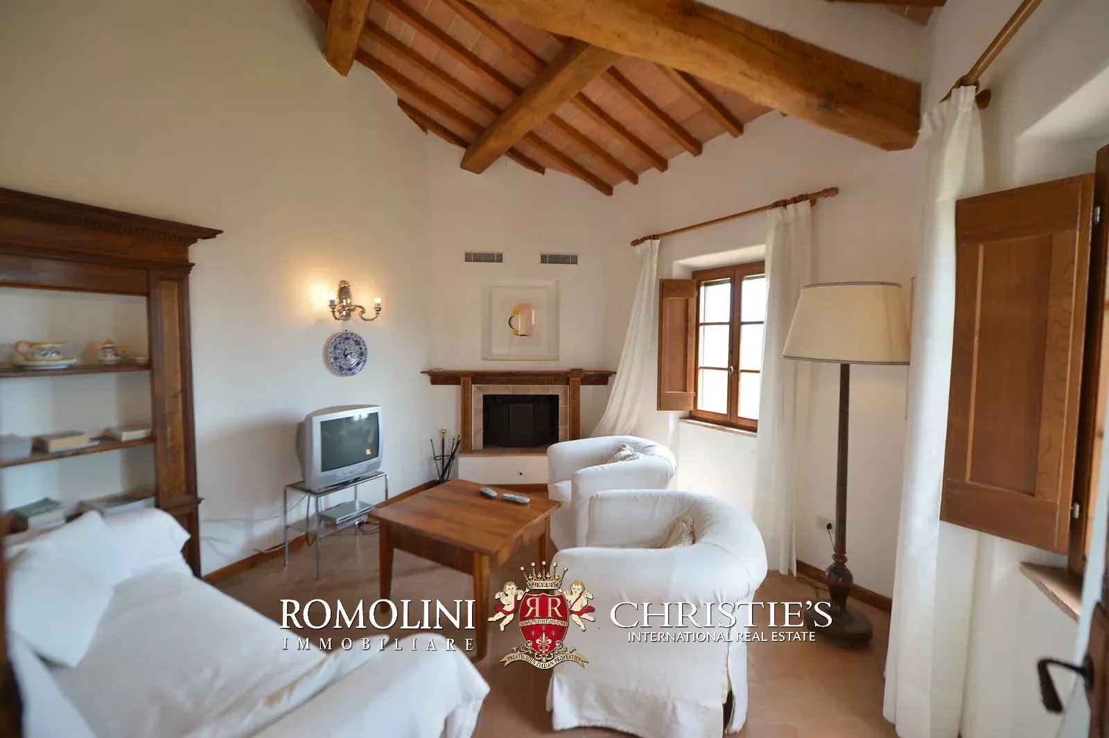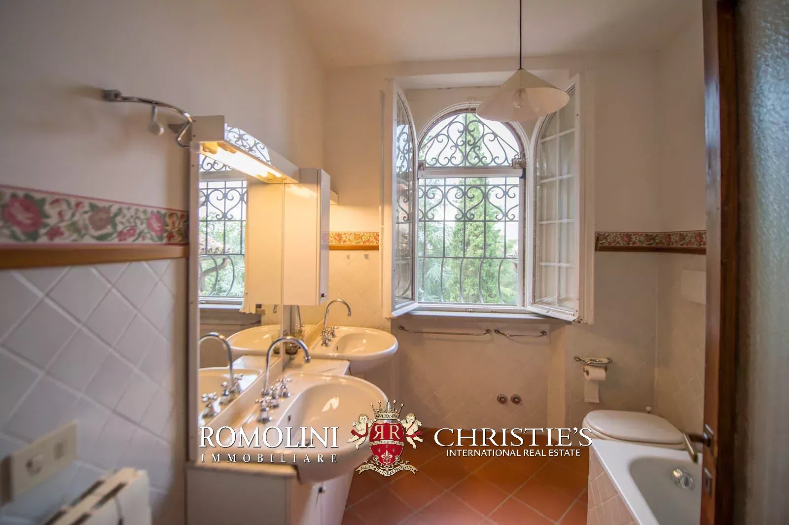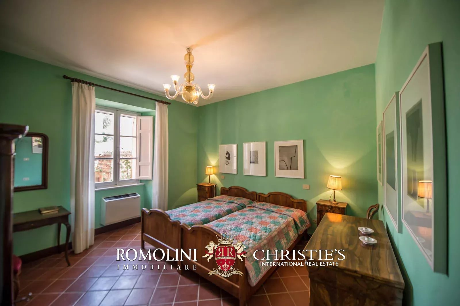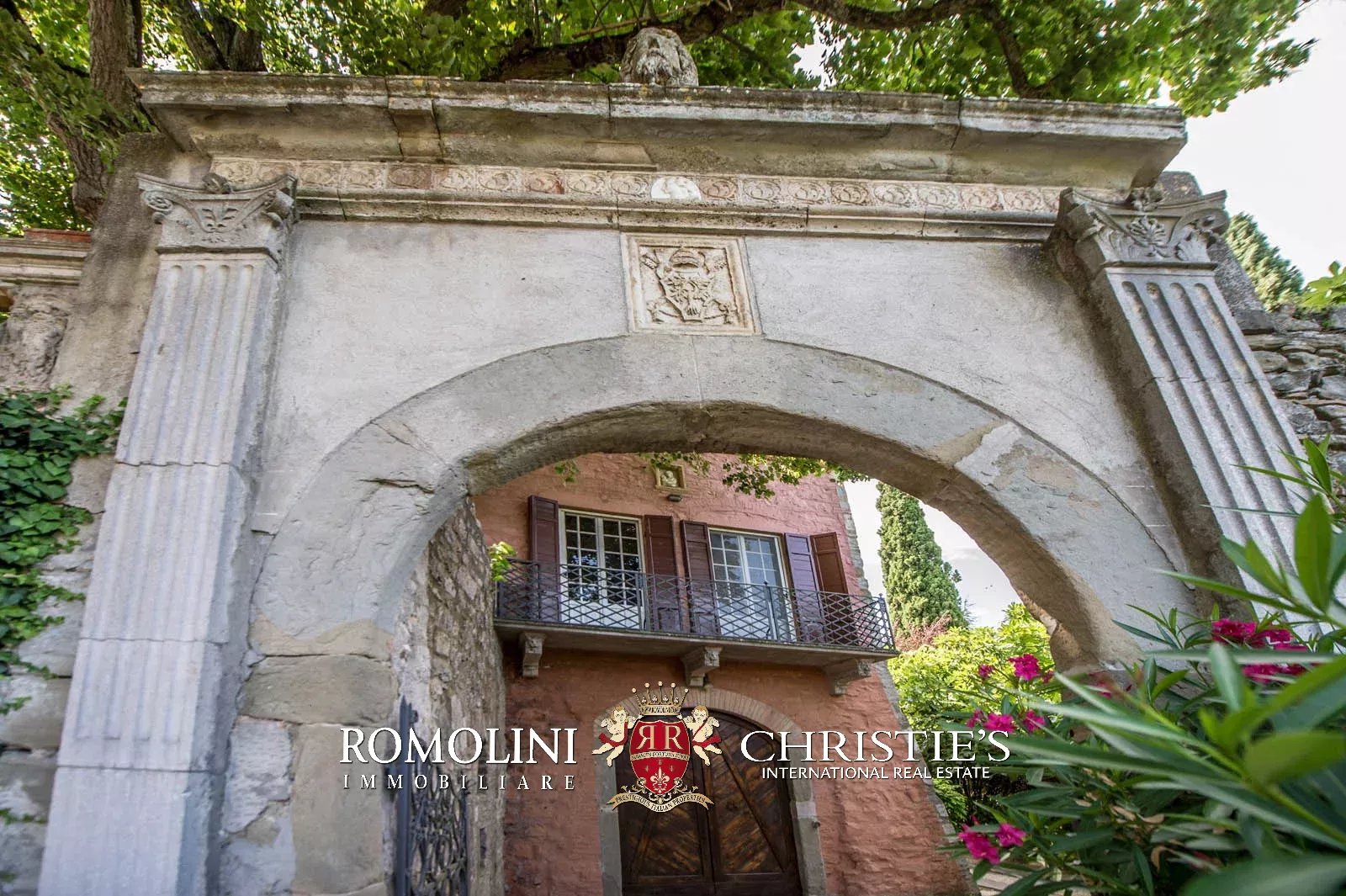 • Ground floor: long hallway, studio with bathroom, ample living room with fireplace and frescoes (formerly a refectory, with access onto the panoramic terrace), fine dining room, kitchen with service room, laundry and a covered terrace linked to the pantry;