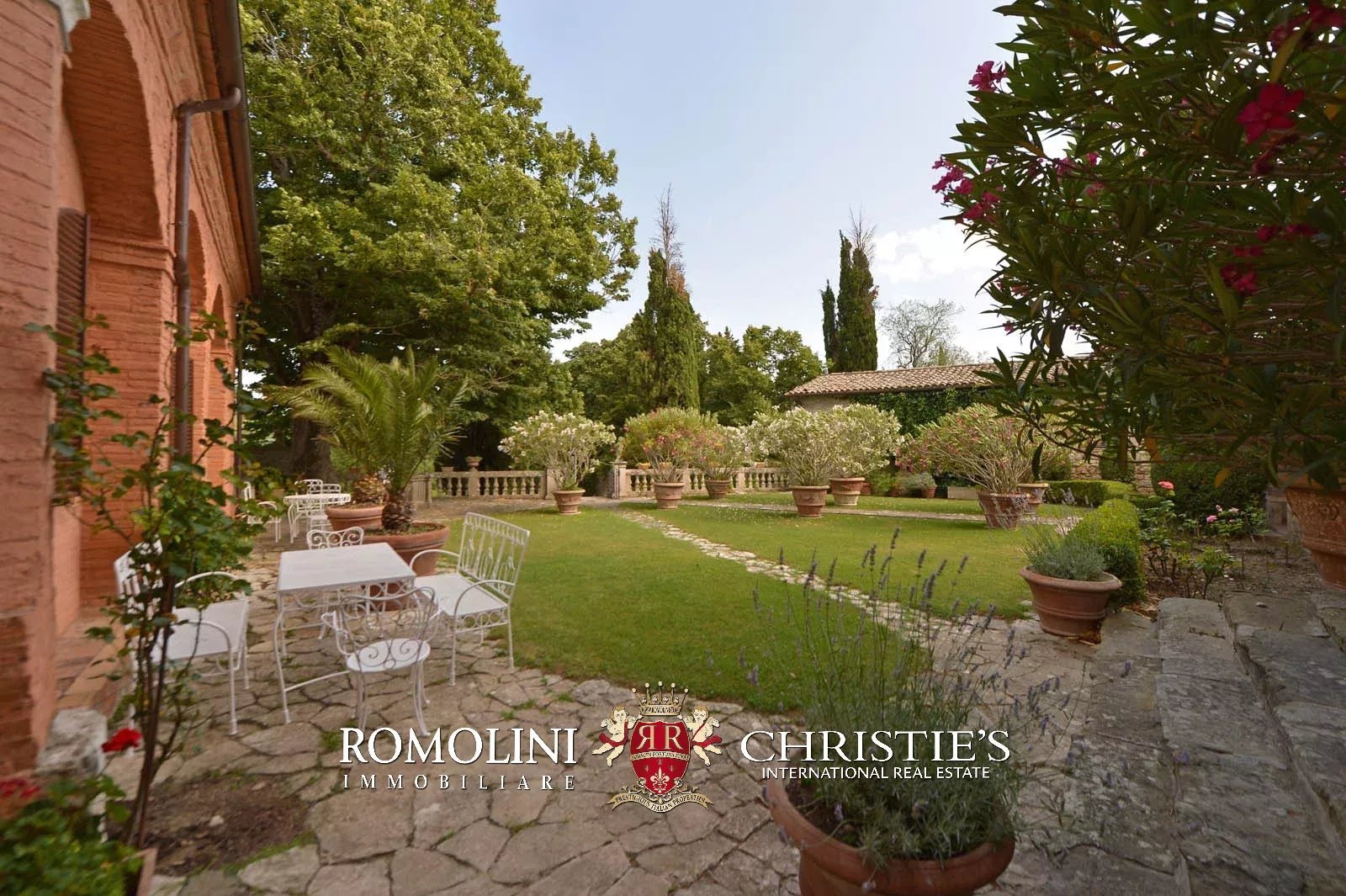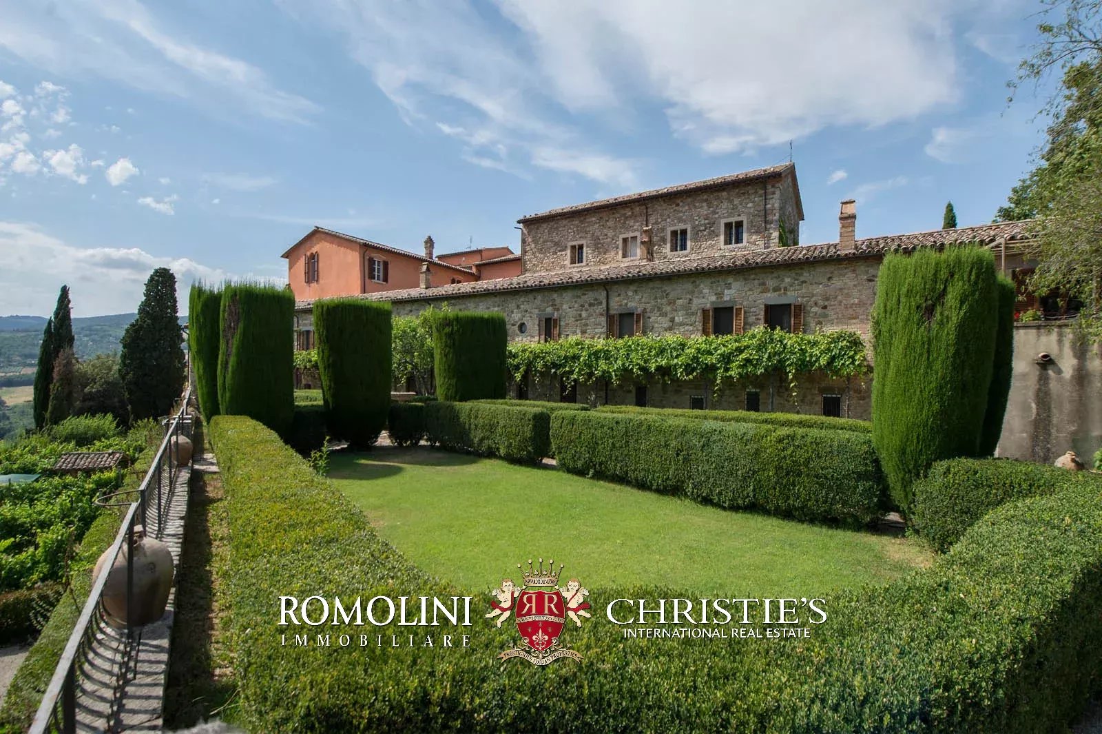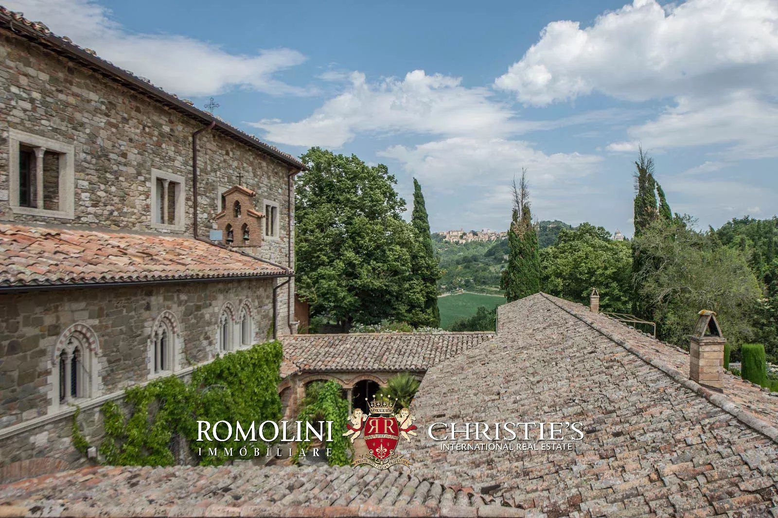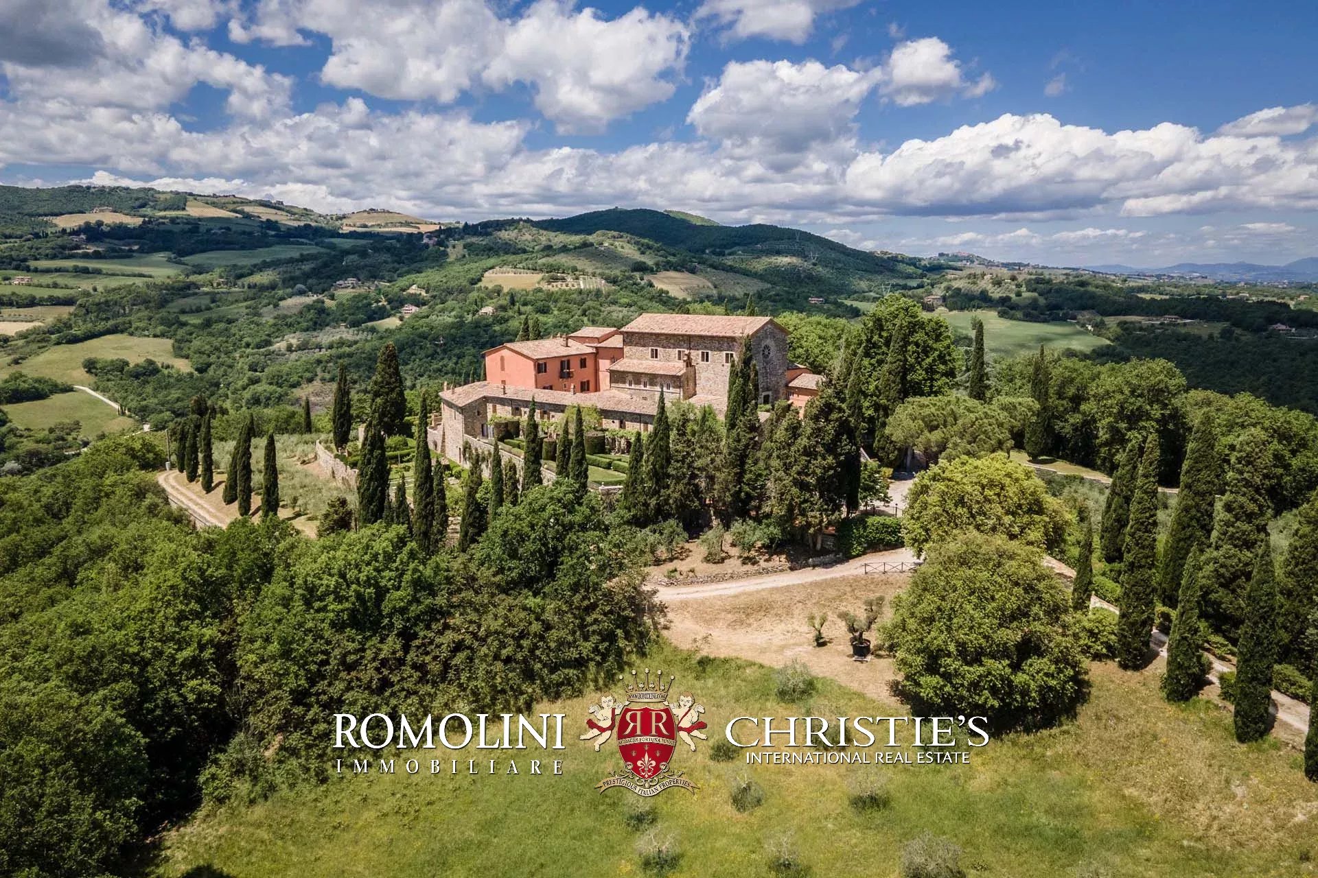 The convent is located in a hilly and very panoramic position, well exposed to the sun and blessed with excellent privacy. The property can be accessed via two separate entrances leading to two parking areas. Both roads are embellished by two rows of cypresses.