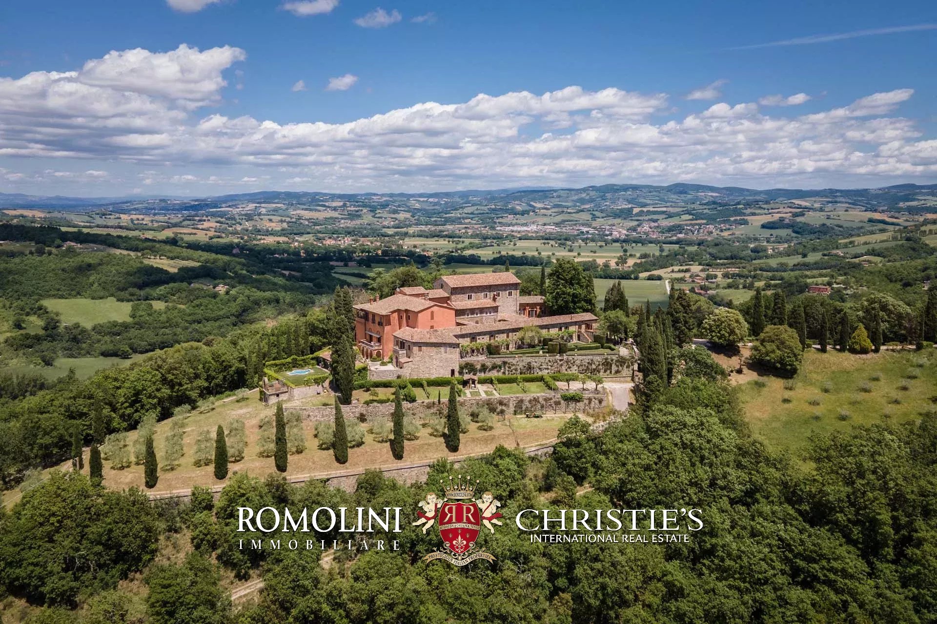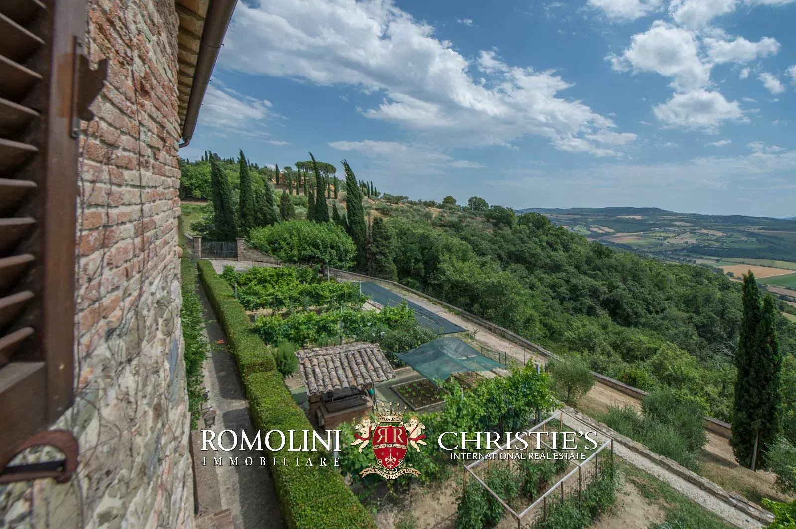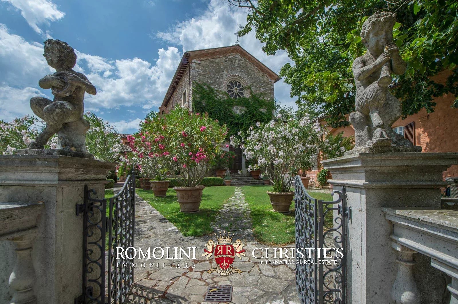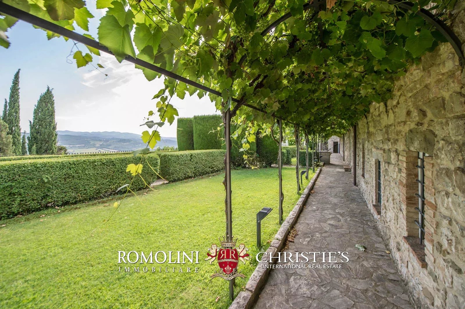 The convent is located in a hilly and very panoramic position, well exposed to the sun and blessed with excellent privacy. The property can be accessed via two separate entrances leading to two parking areas. Both roads are embellished by two rows of cypresses.