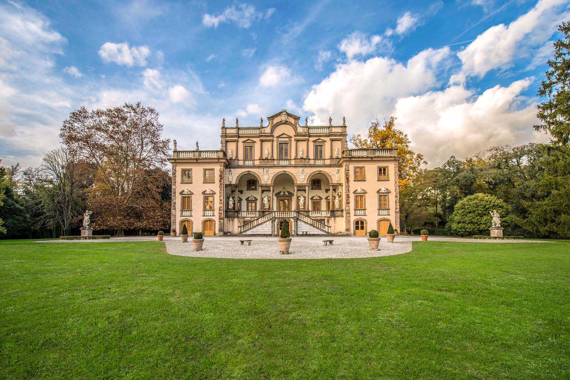 Not far from the charming Renaissance city of Lucca lies a work of architectural art, rich in history and ripe with potential. Occupying a sunny position within lush park-like grounds, this stunning period villa is an elegant example of 17th- and 18th-century style, and showcases frescoed reception halls and baroque detailing across its four levels. Behind the stately façade, the 22,725 sqft (2,112 sqm) interiors include 11 bedrooms and nine baths, along with a vast array of reception, dining, and reading rooms.