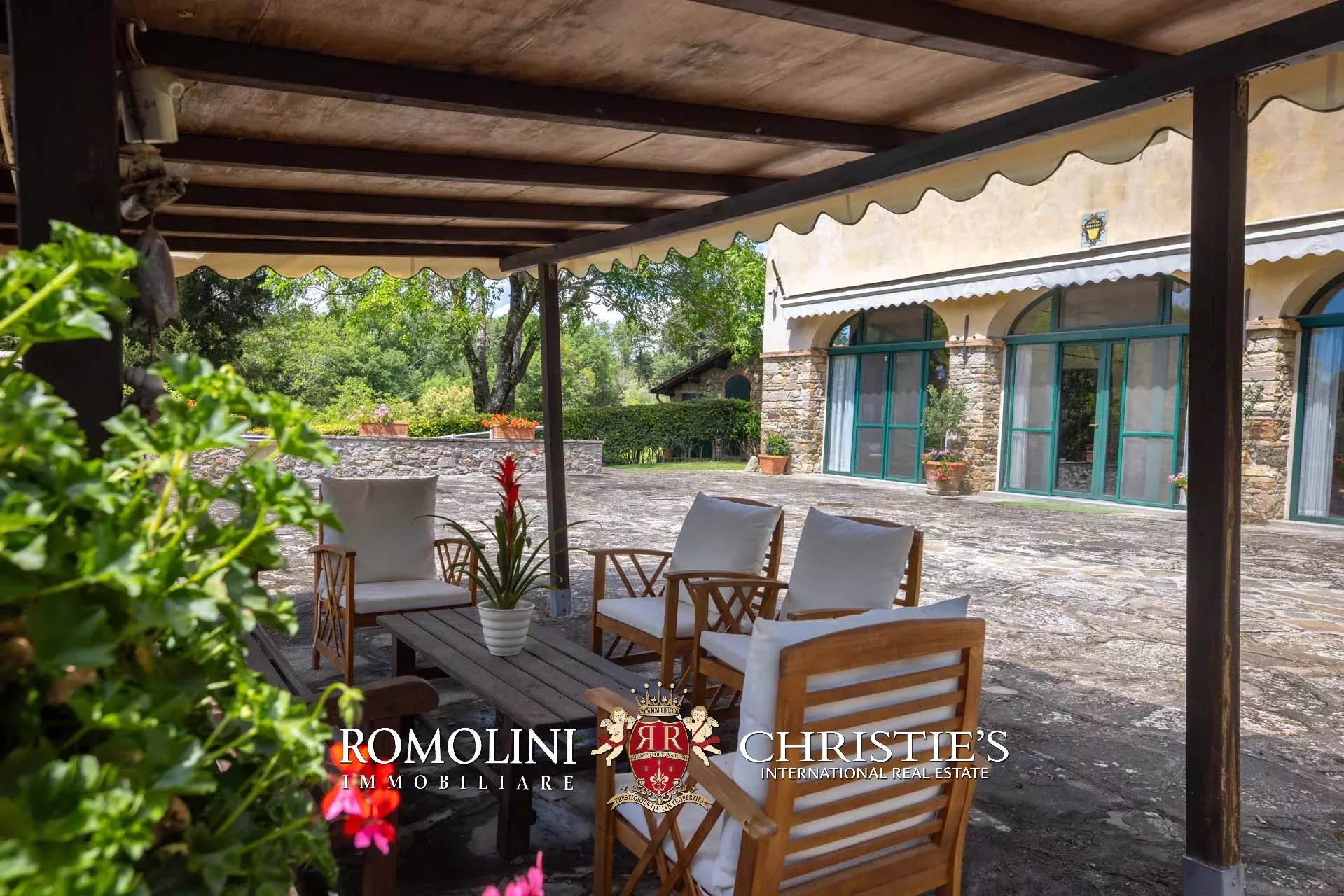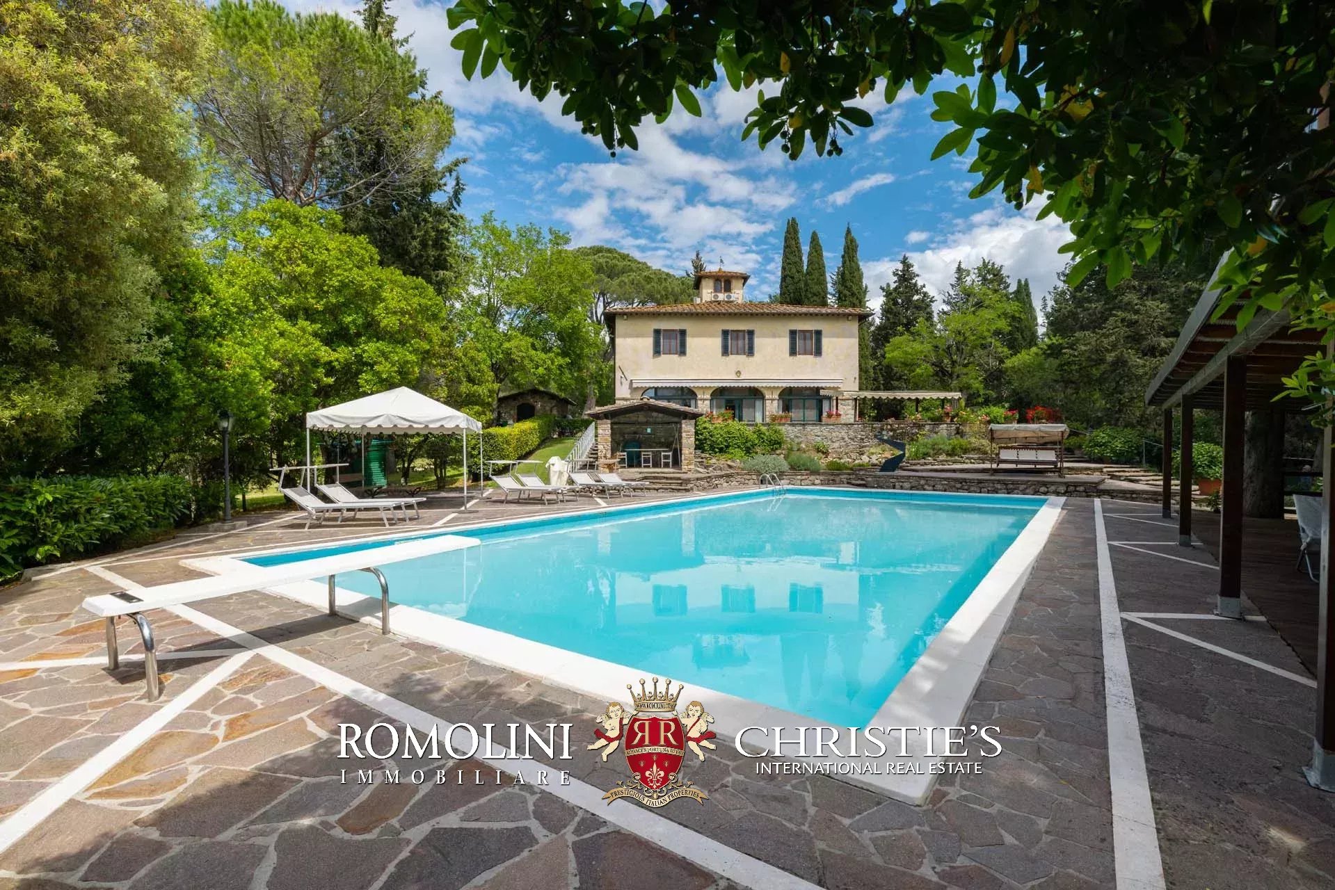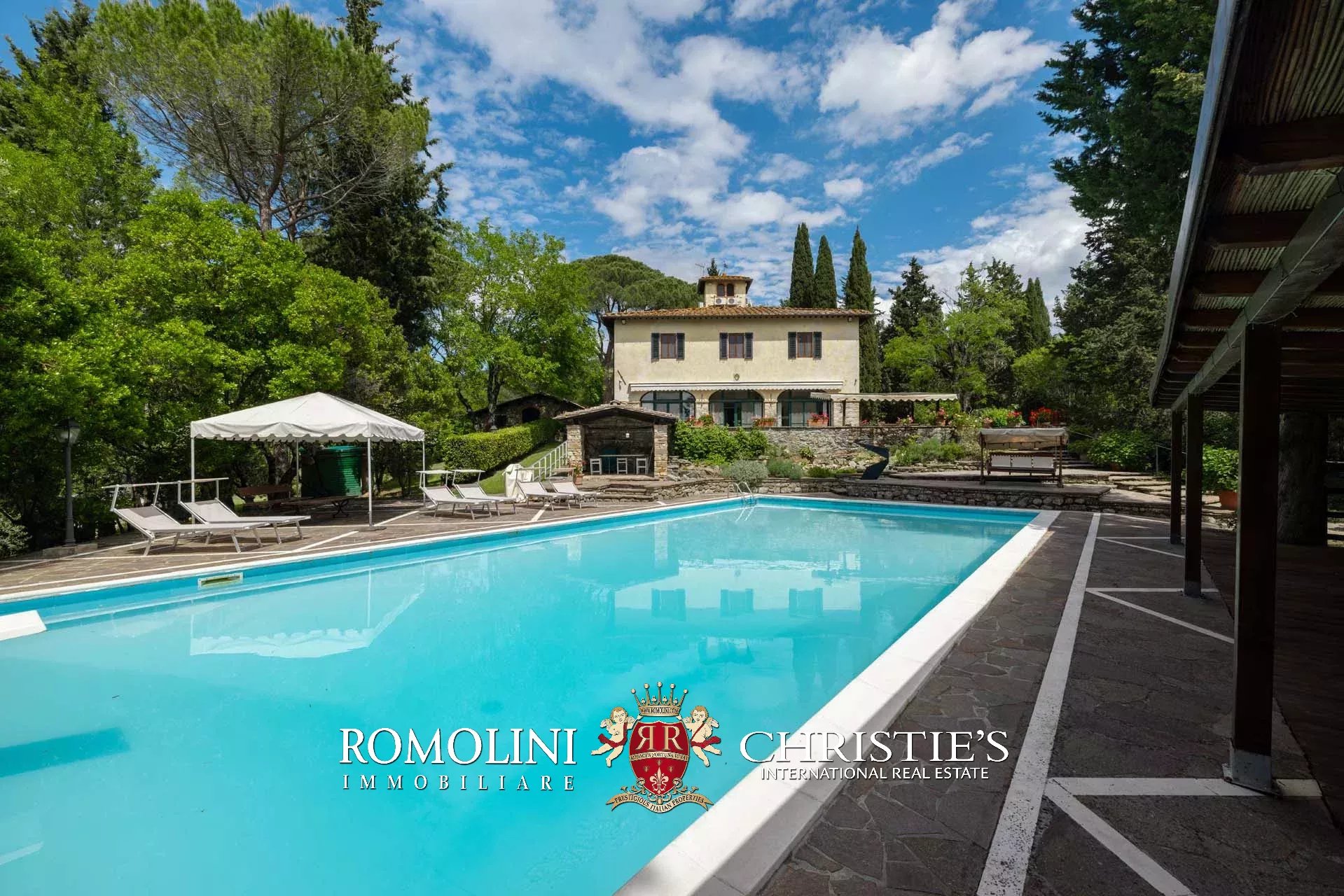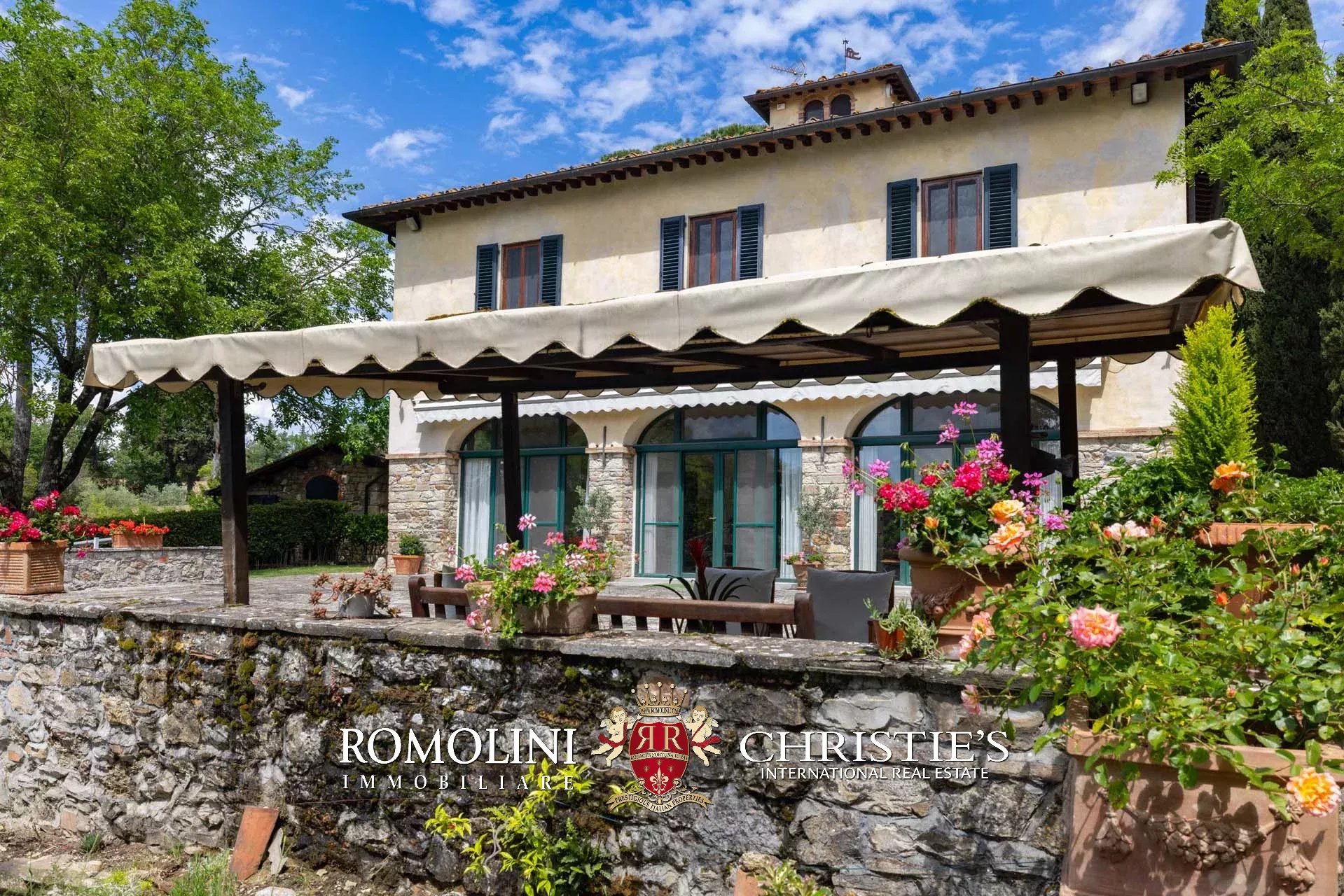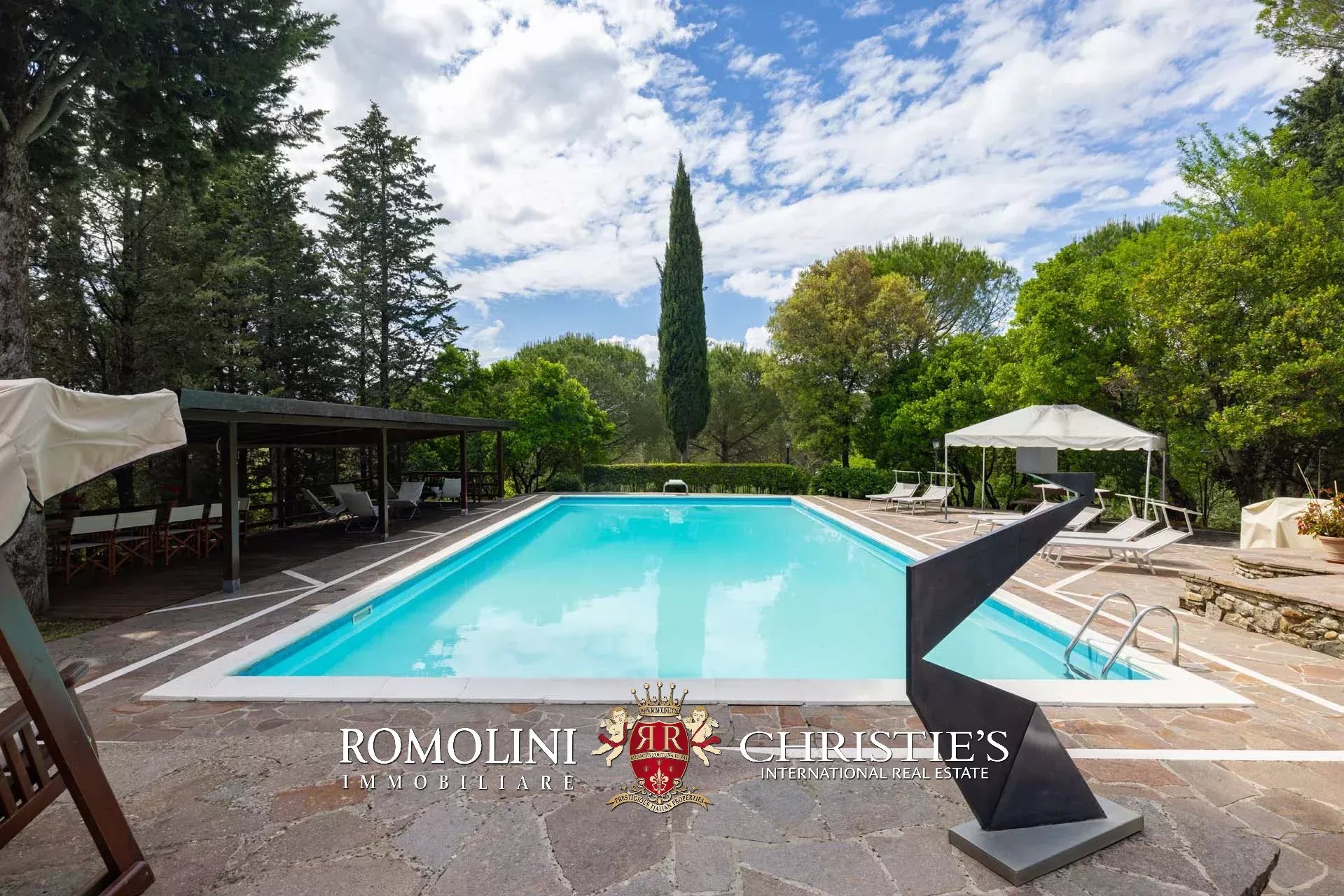 On the hills of the Chianti Classico region, not far from San Casciano and Tavarnelle, luxury villa with swimming pool for sale. The property (over 500 sqm in total) has been renovated in classical style by the current owners and is perfect both as a private residence and holiday home, thanks to its very convenient location in Tuscany. The 3.4 hectares of land surrounding the buildings include a well-maintained wooded park with a 17 × 8 m swimming pool and a small olive grove.