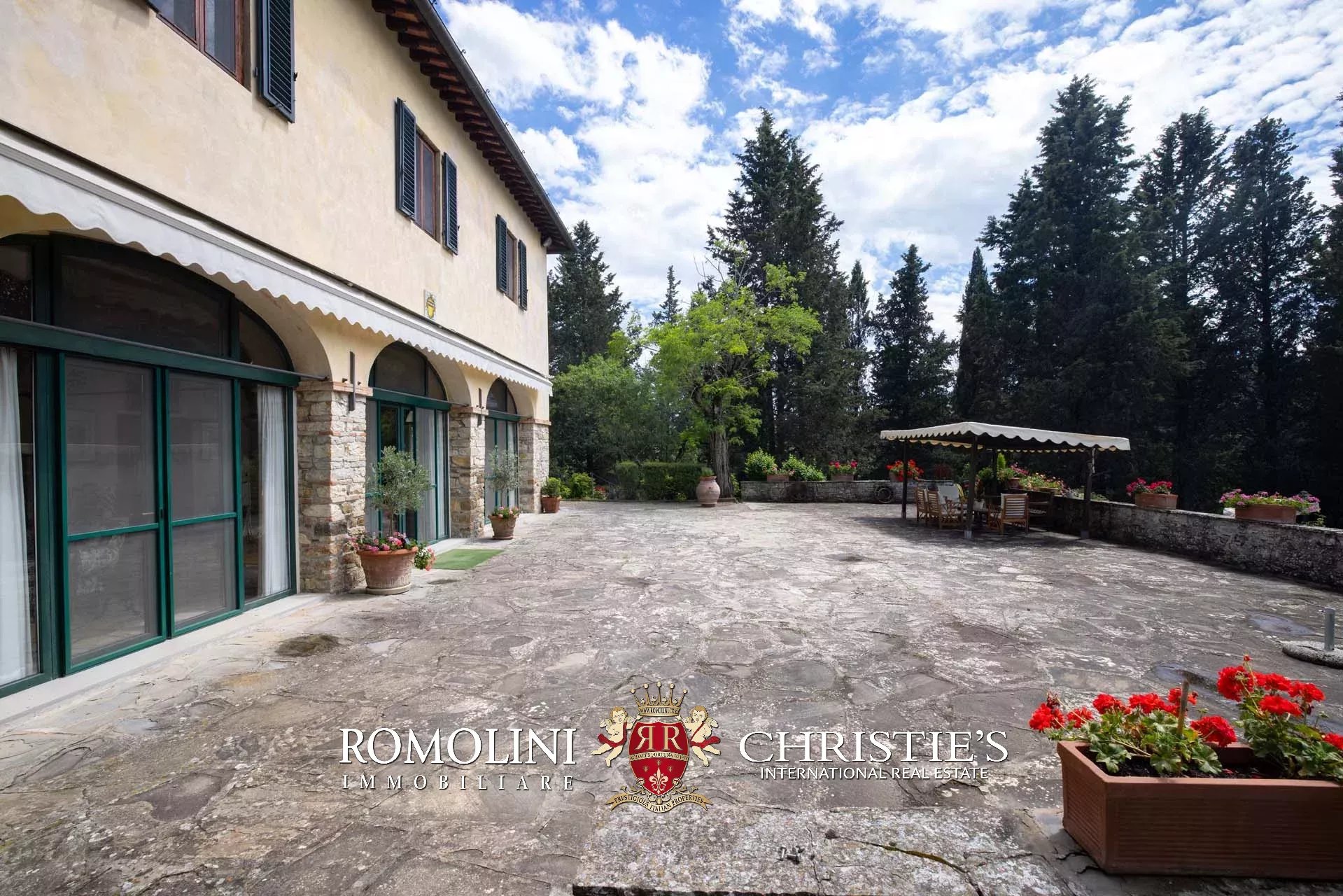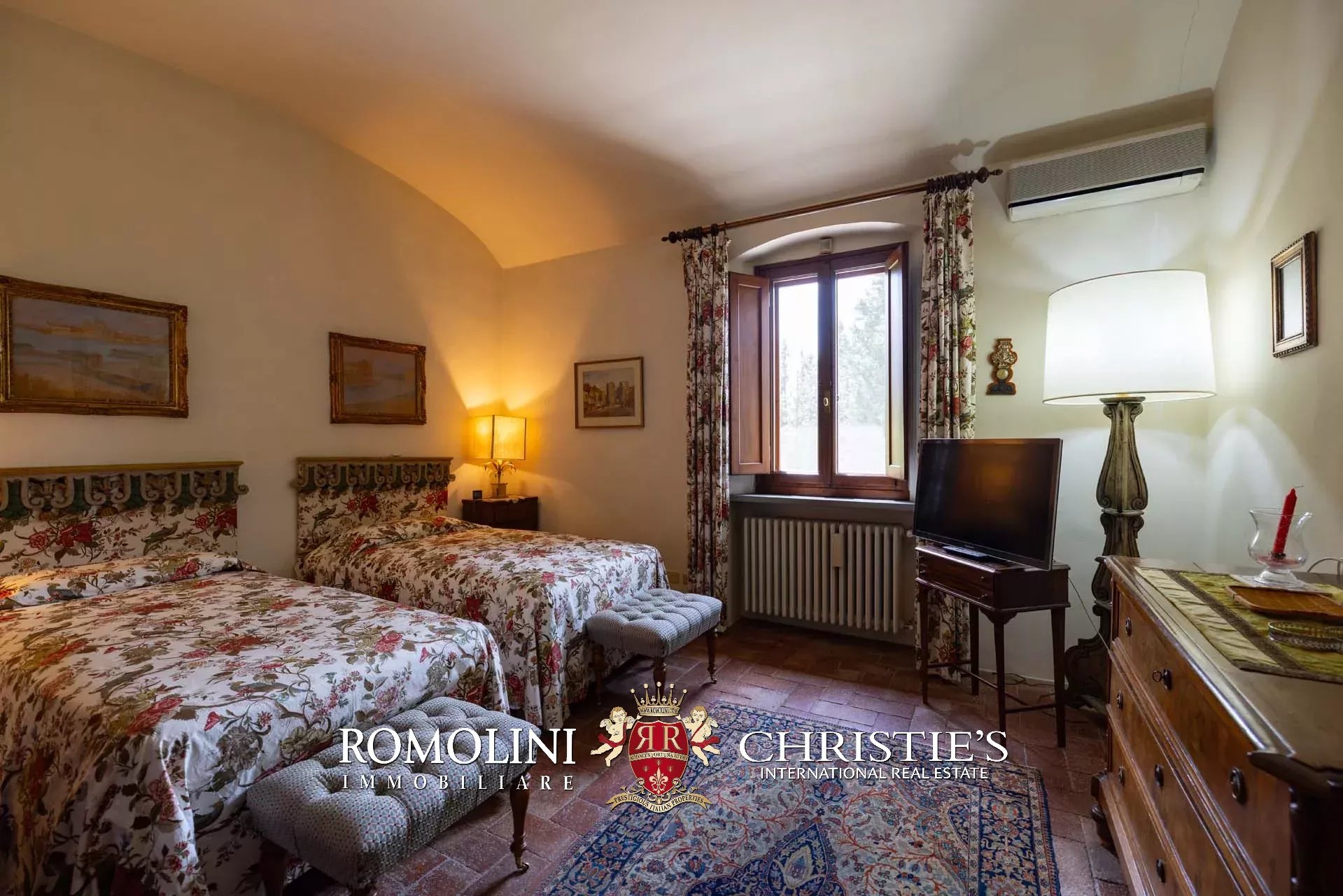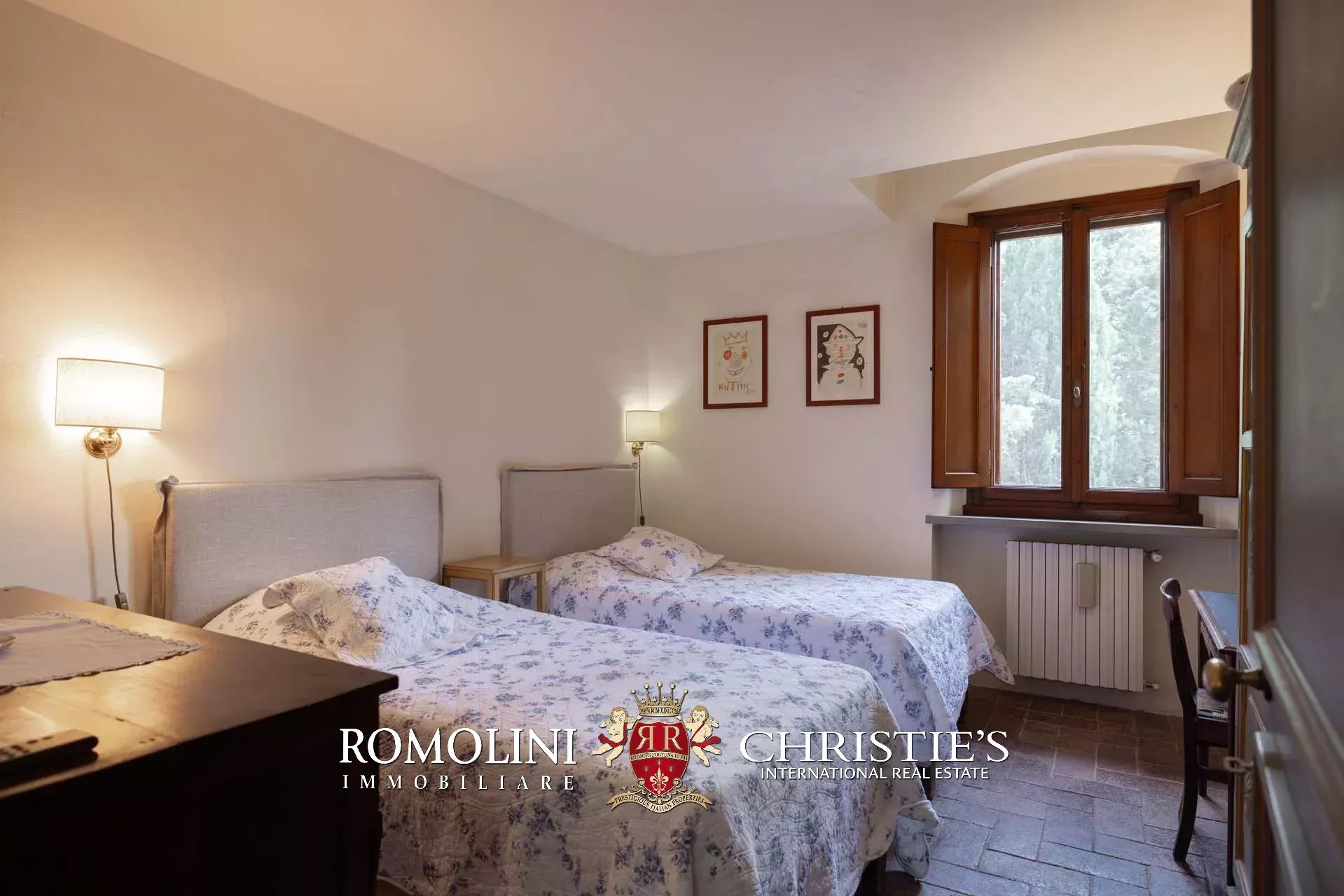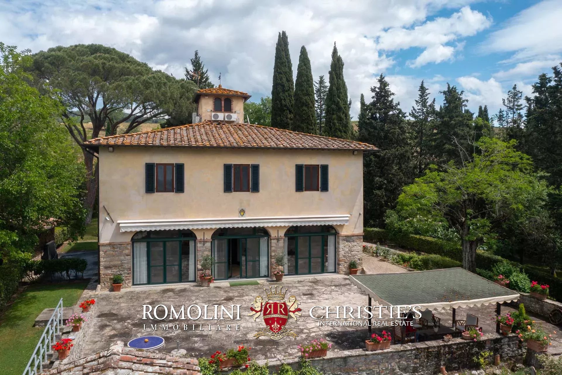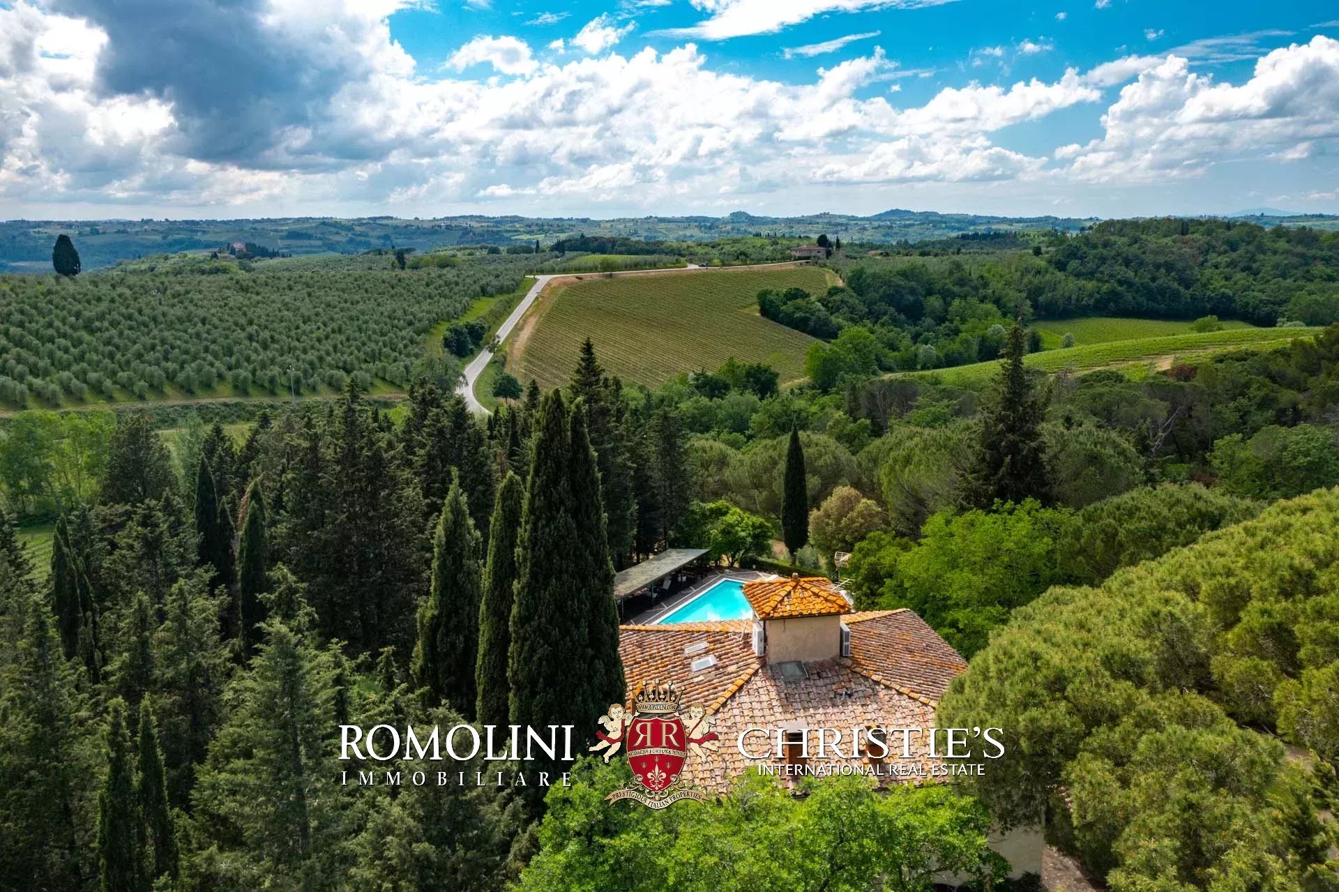 On the hills of the Chianti Classico region, not far from San Casciano and Tavarnelle, luxury villa with swimming pool for sale. The property (over 500 sqm in total) has been renovated in classical style by the current owners and is perfect both as a private residence and holiday home, thanks to its very convenient location in Tuscany. The 3.4 hectares of land surrounding the buildings include a well-maintained wooded park with a 17 × 8 m swimming pool and a small olive grove.