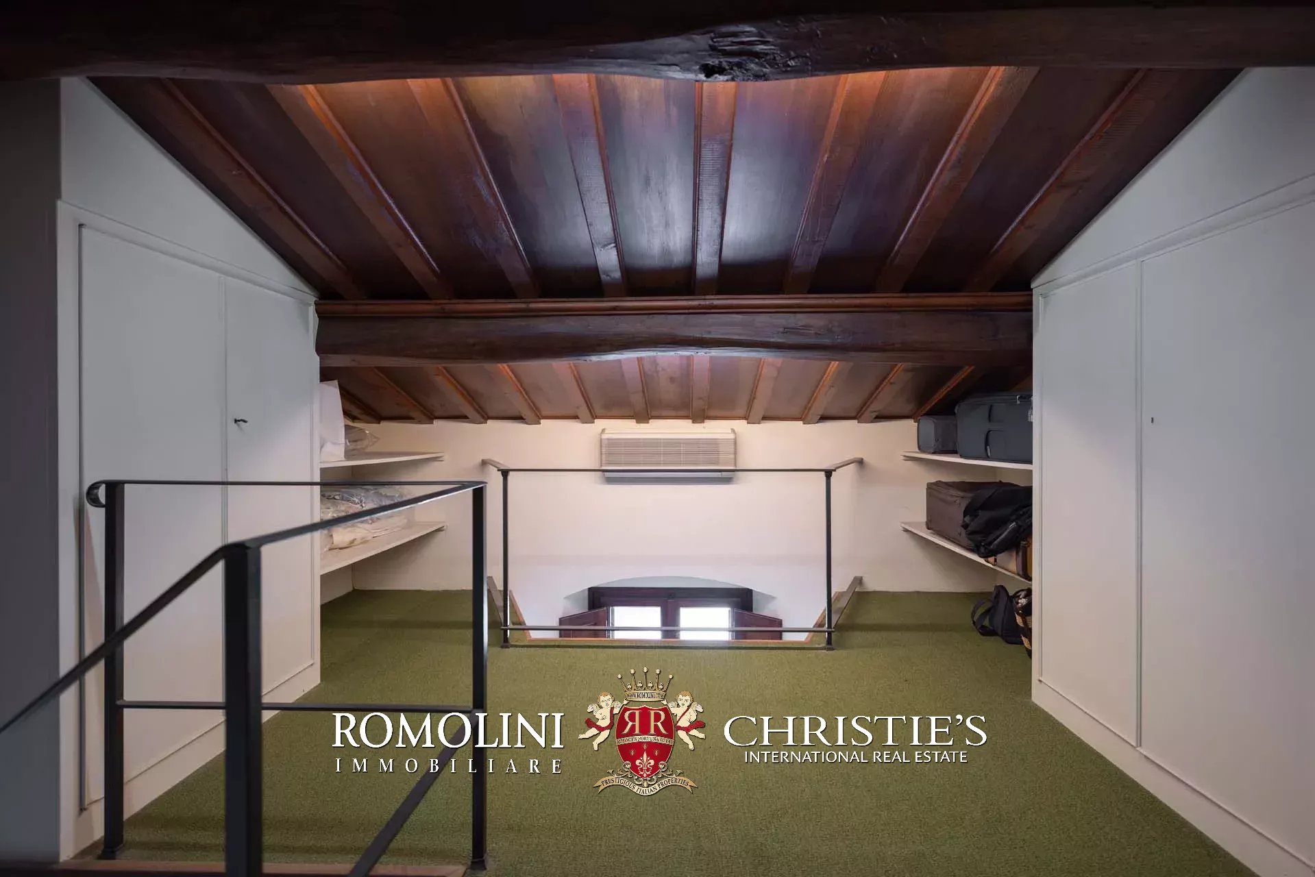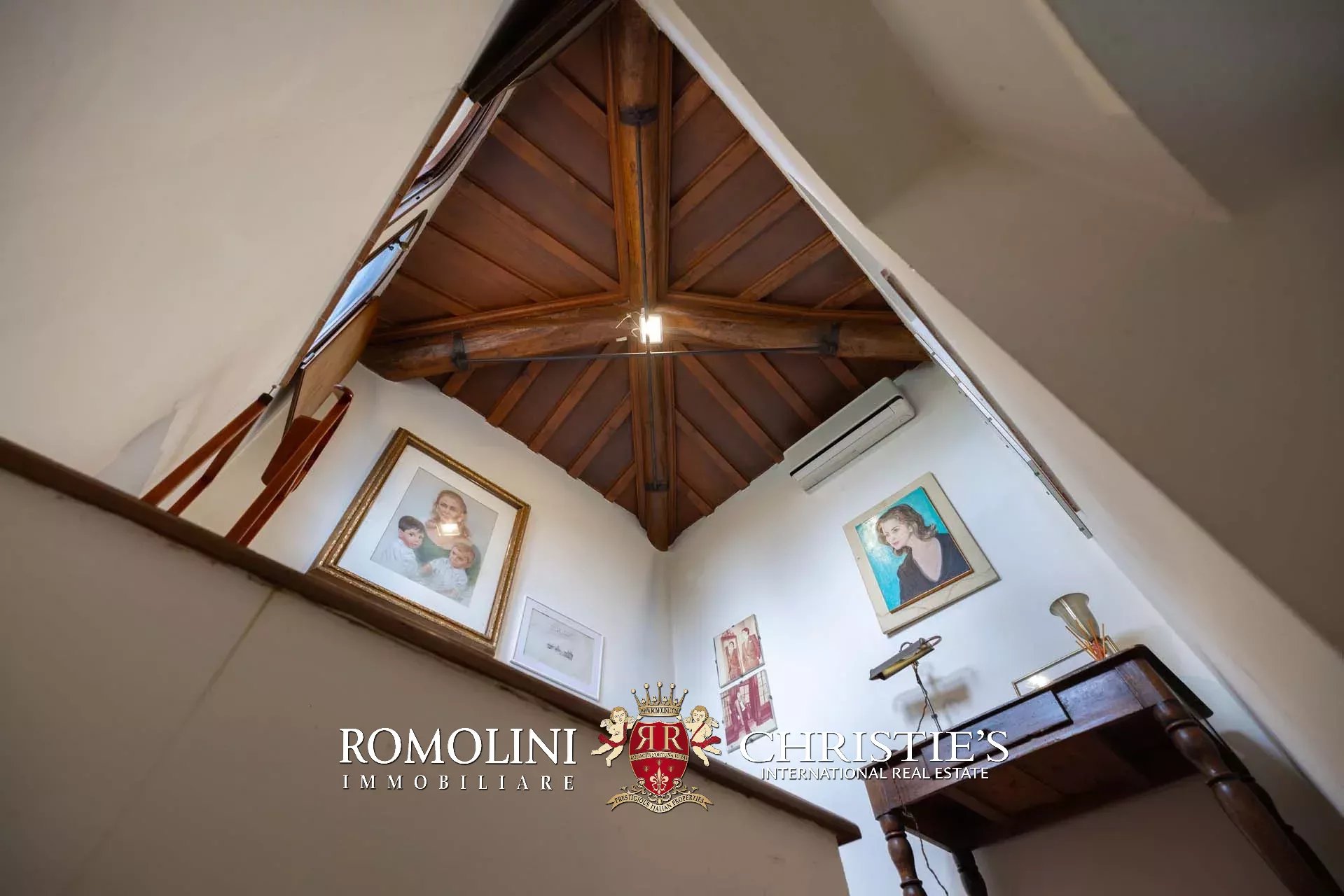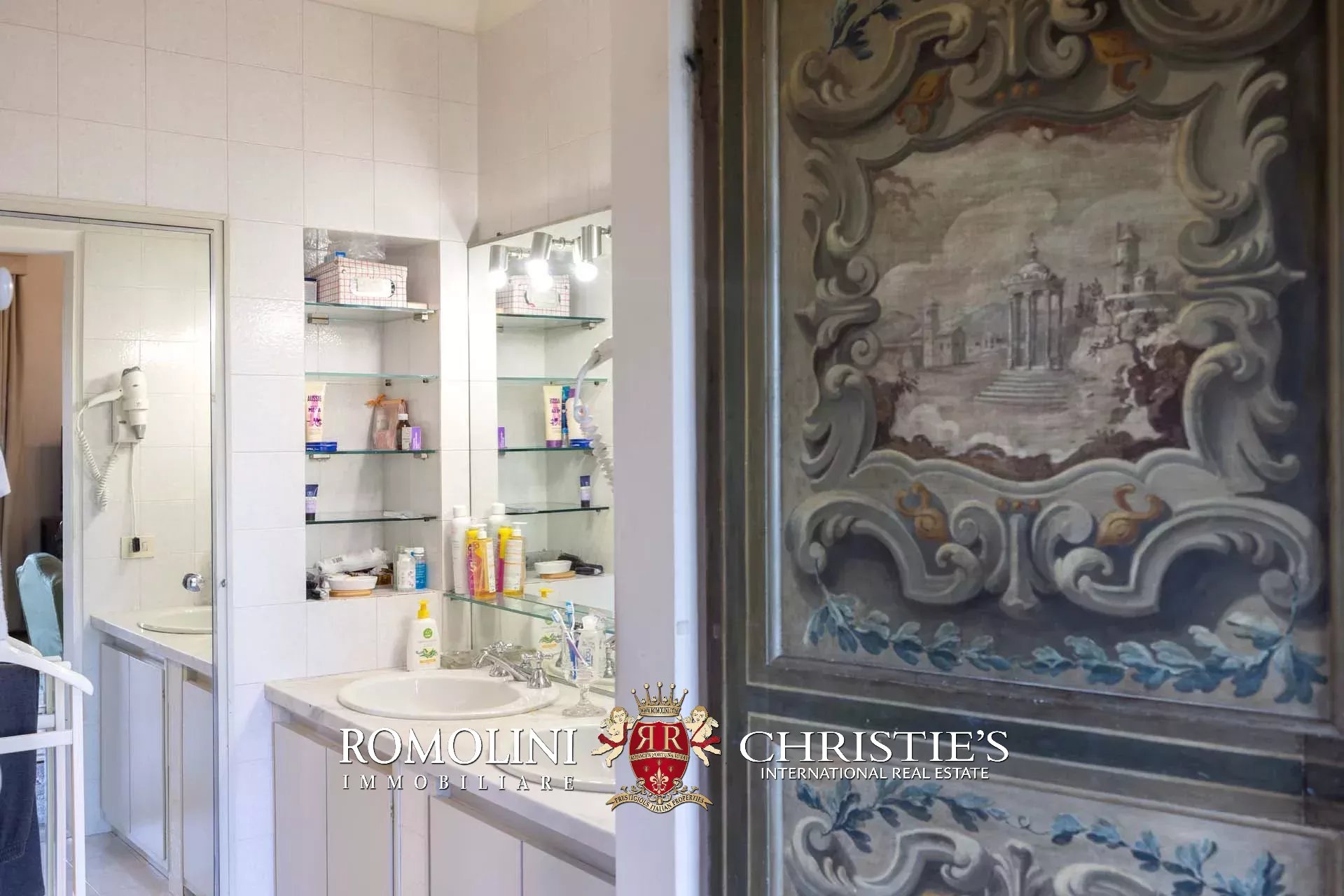 The villa (418 m² – 4,497 ft², 4 bedrooms and 4 bathrooms) is a square building structured on four floors plus a panoramic turret. On the ground floor is the bright living area consisting of a glazed loggia with tables, living room with fireplace, dining room, kitchen with pantry and service bathroom along the staircase. On the first floor is the sleeping area consisting of a large master suite with fireplace (living room, bedroom and private bathroom), three bedrooms, two bathrooms and a spacious walk-in wardrobe. On the top floor there are attic rooms, partially habitable and convertible into additional bedrooms and/or playrooms, and the turret. From the ground floor, the staircase also descends to the basement cellars, consisting of two rooms.