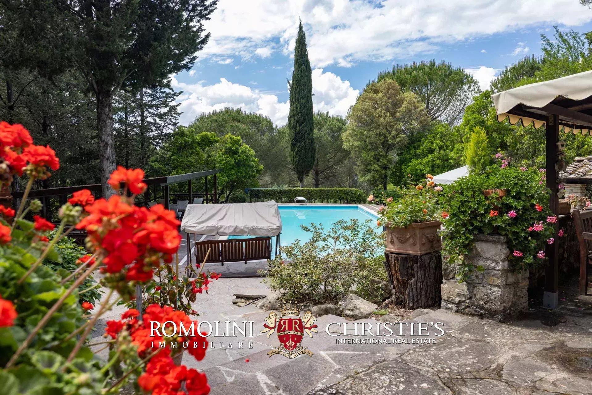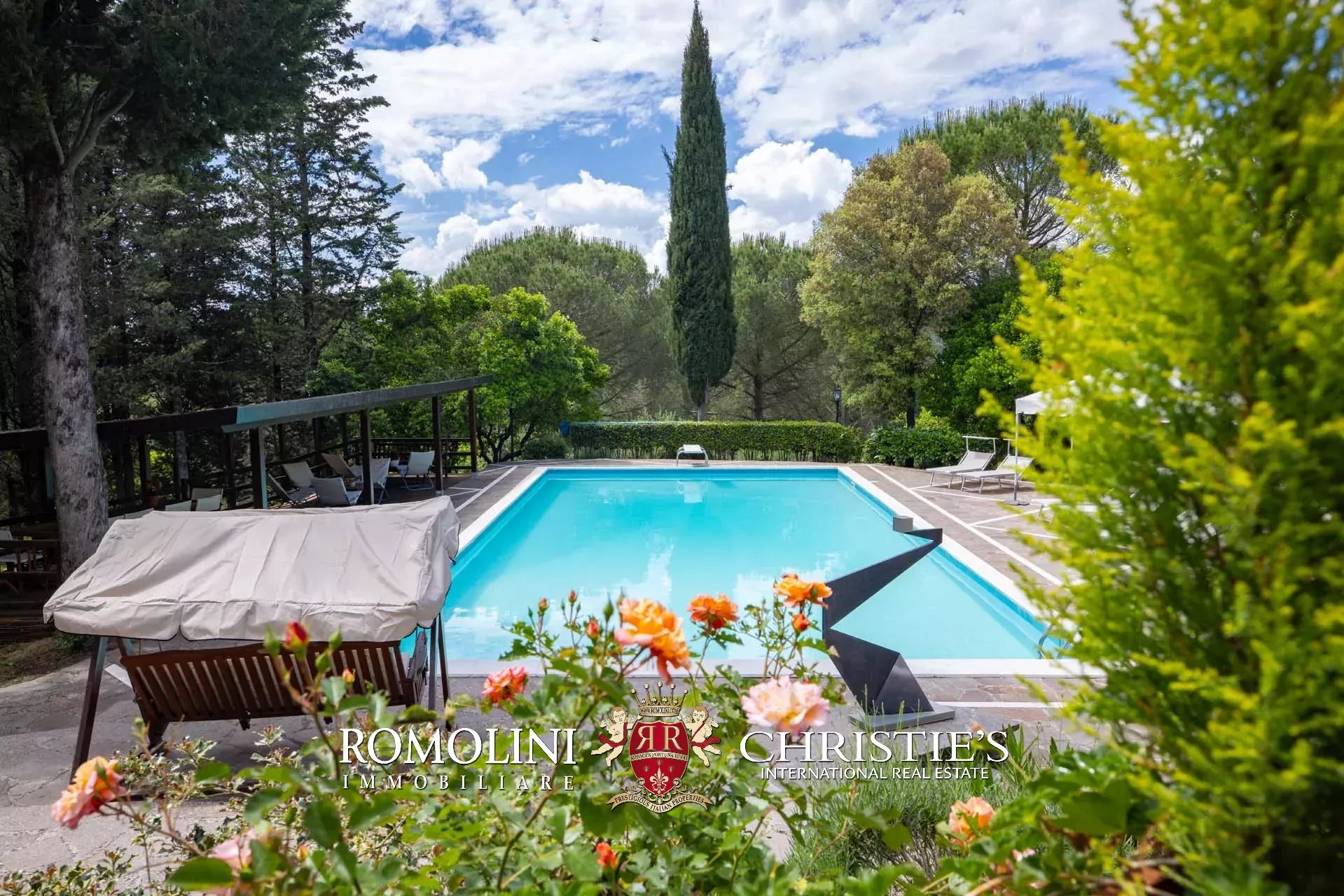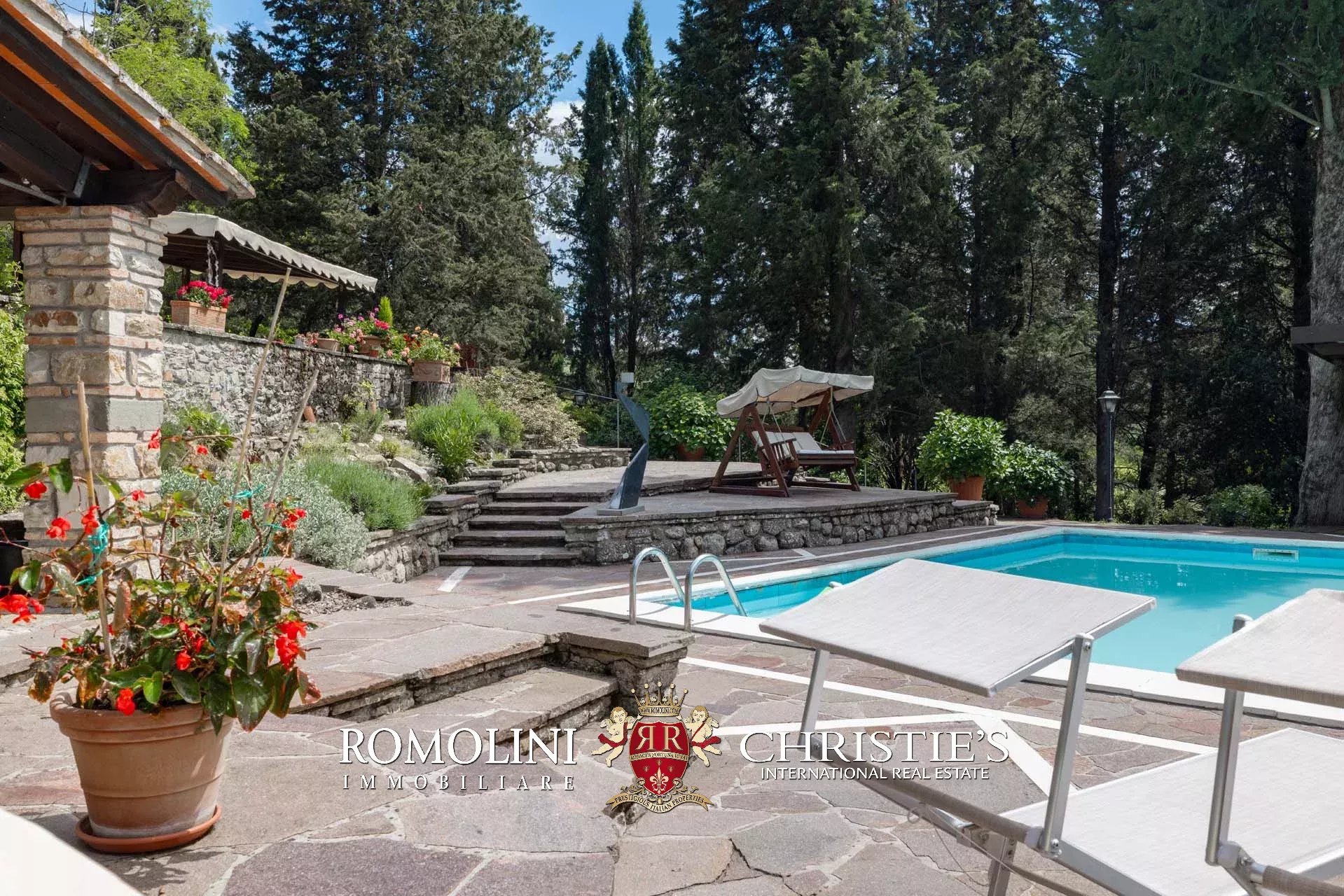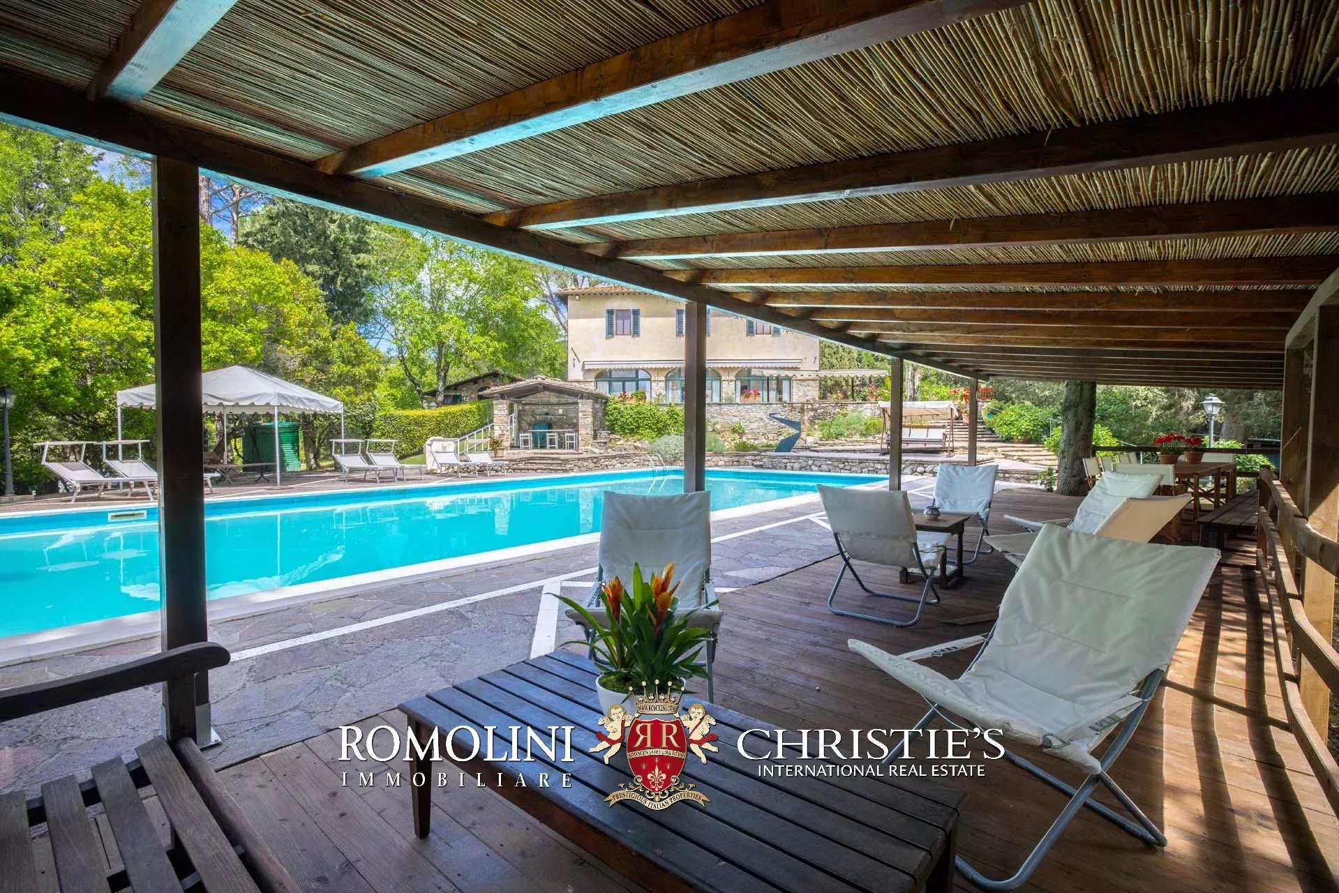 The villa is surrounded by a wooded park of 12,600 m², flat and with many shaded spots in which to spend the hot summer days out of the sun. Immediately in front of the building, surrounded by a stone-paved solarium, there is also a 17 × 8 m swimming pool with a shading canopy that is very suitable for aperitifs and al fresco dining.