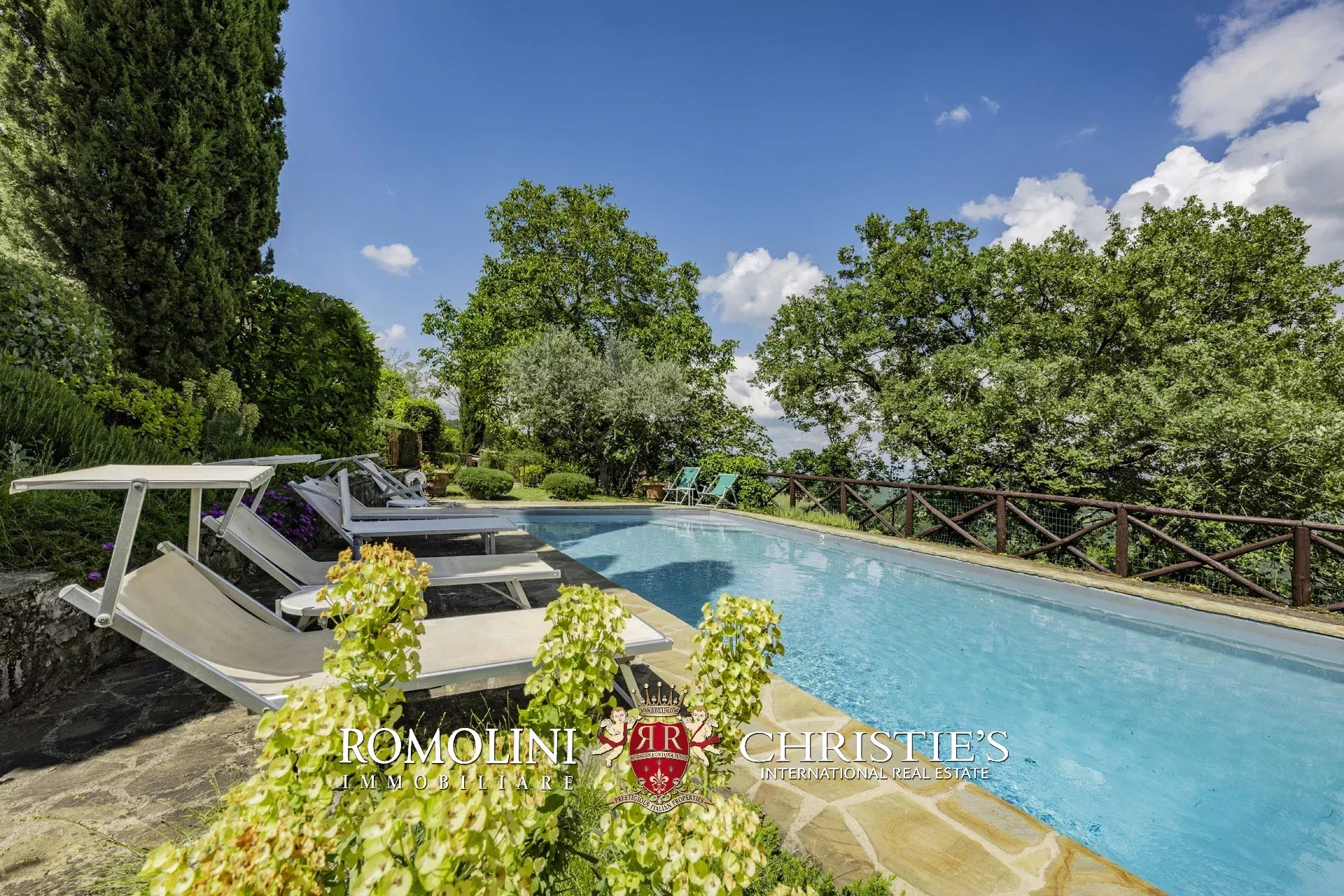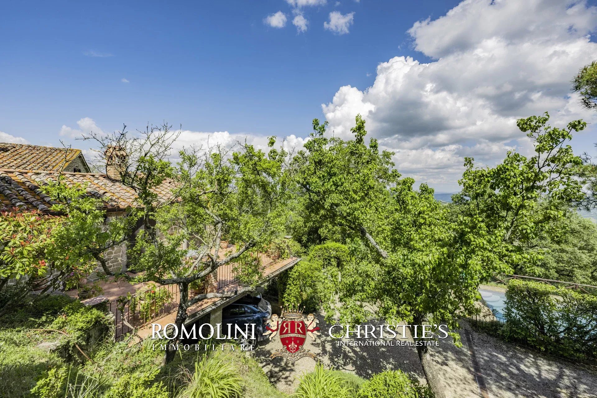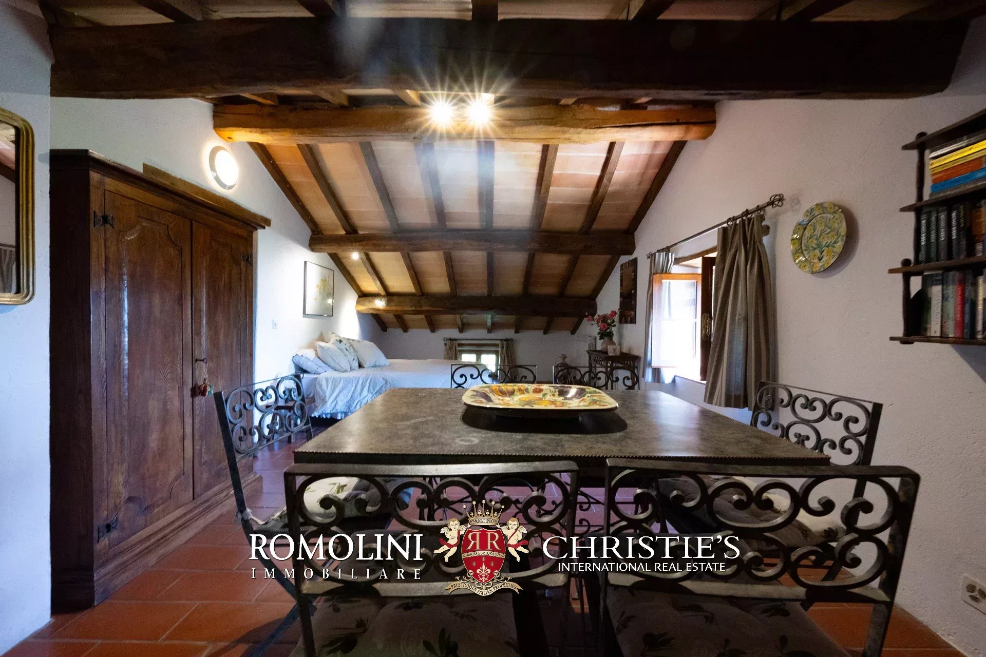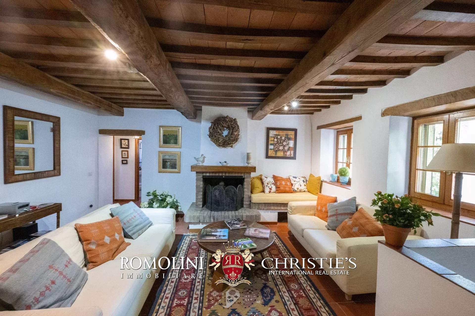A mature garden full of flowers and fourteen different types of trees, extending 1,300 m² around the residence, completes the property together with a 12 × 5 m swimming pool. The estate also includes 1.2 hectares of terraced land used as a vineyard and olive grove, creating a harmonious and productive landscape that further enhances the property.