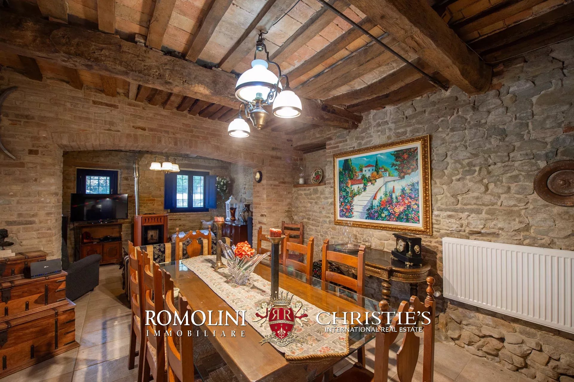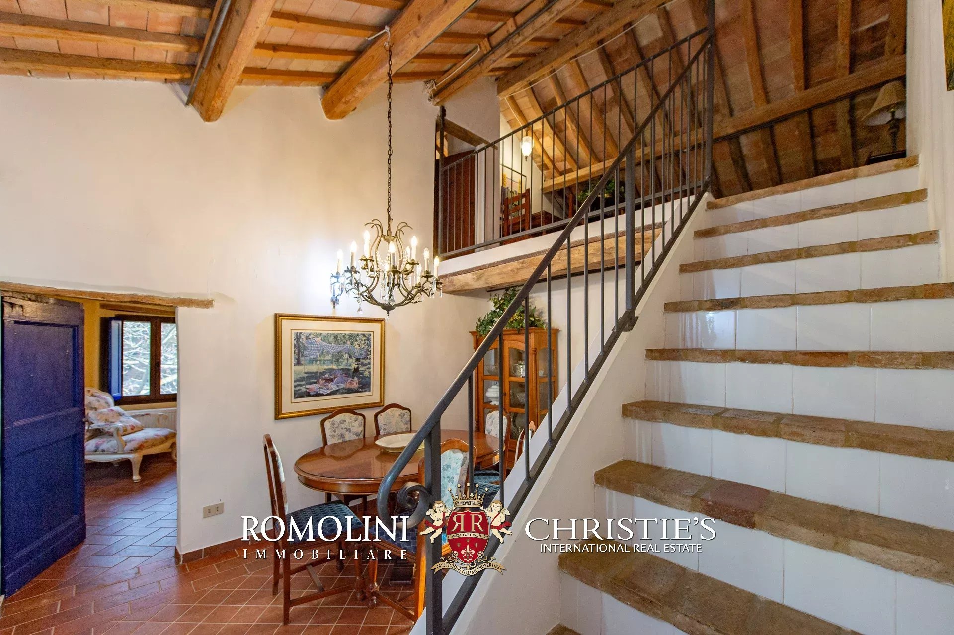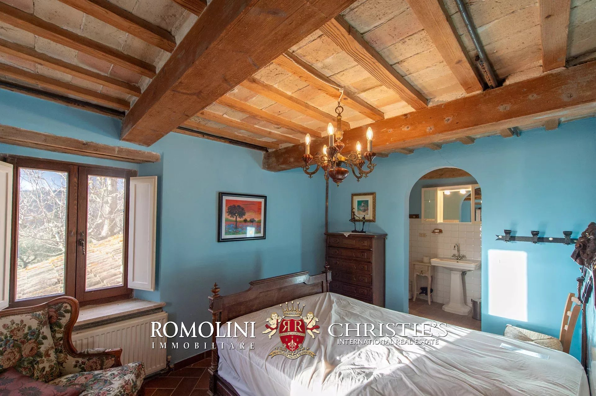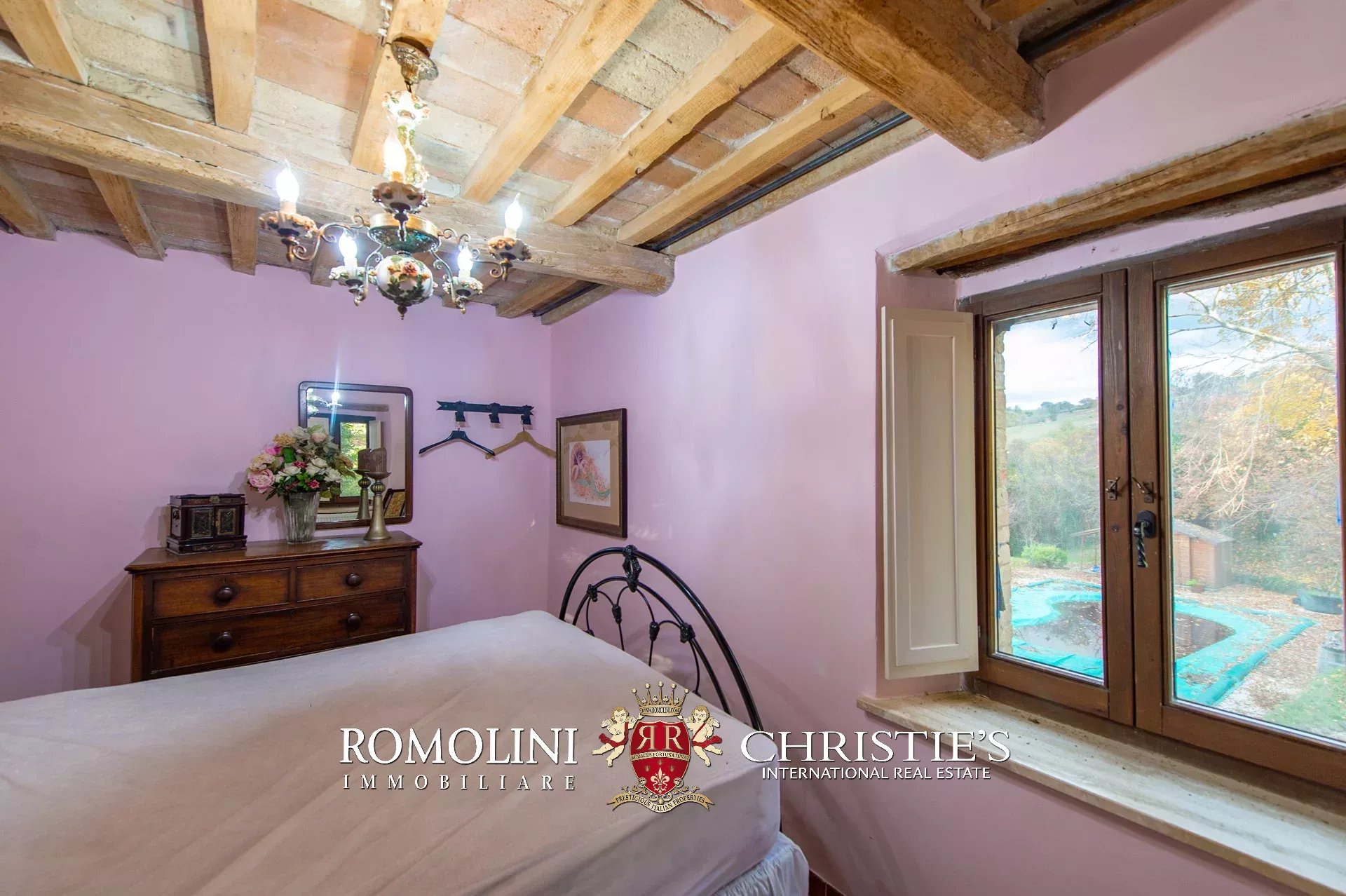 The farmhouse, a 266-m² countryside building with six bedrooms and four bathrooms, spans three floors and can be easily divided into two guest apartments. Renovated in the 1990s by the current owners, it retains rustic charm. The property includes a warehouse, a 3,200-m² garden, and an 8 × 4 m swimming pool with panoramic hill views.
