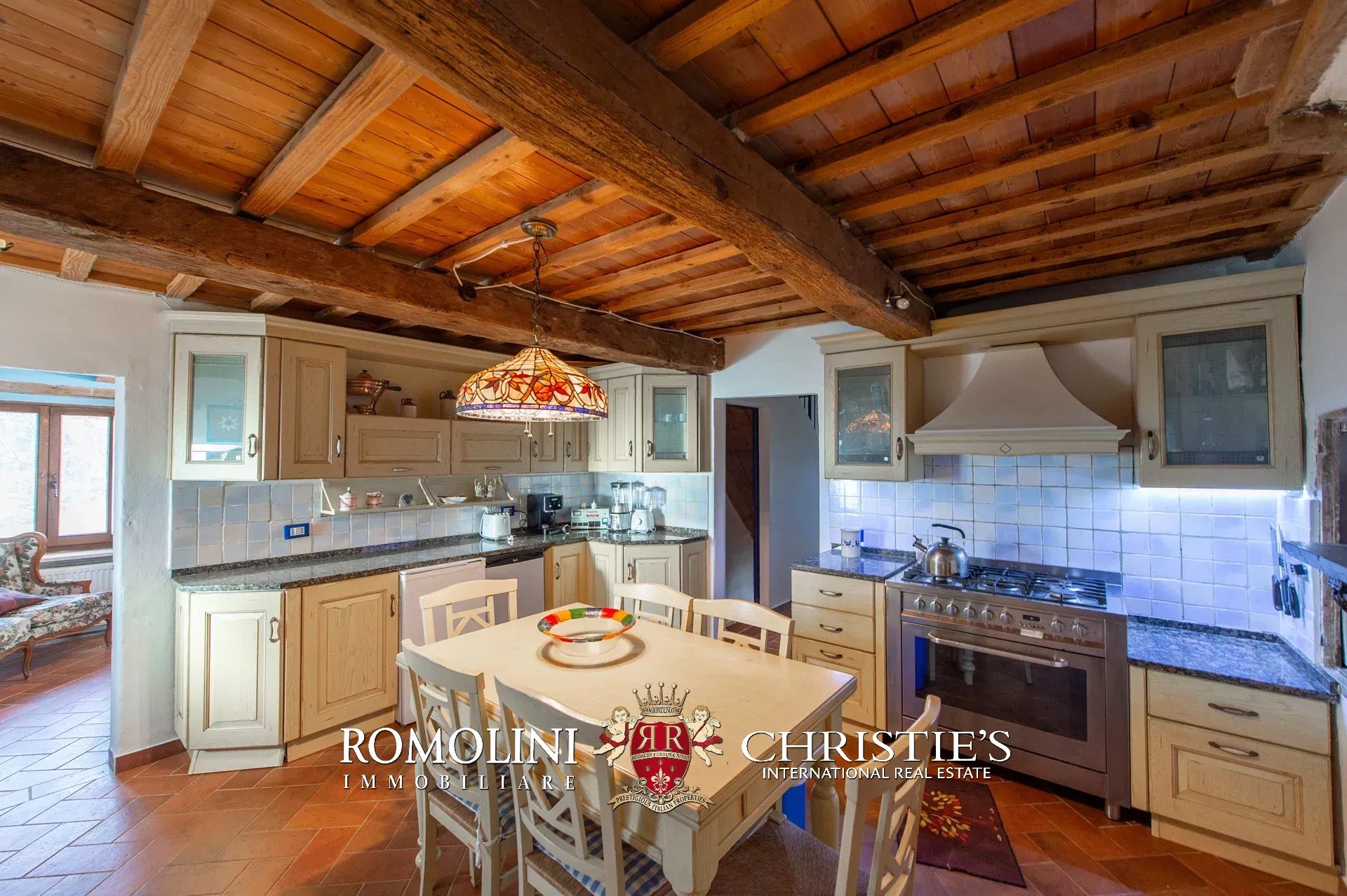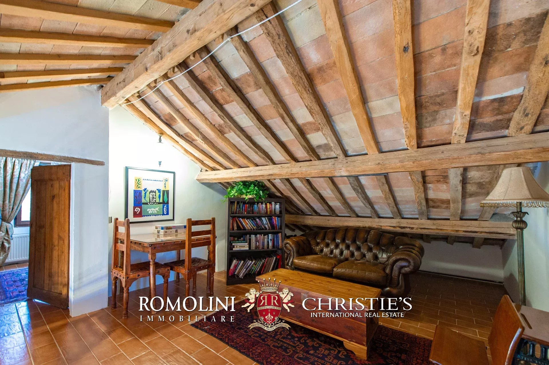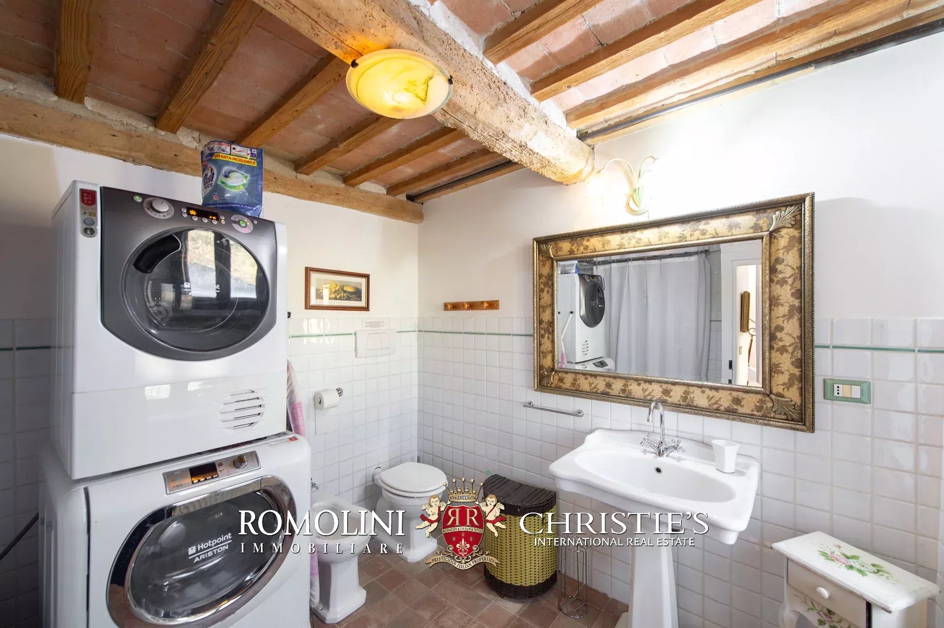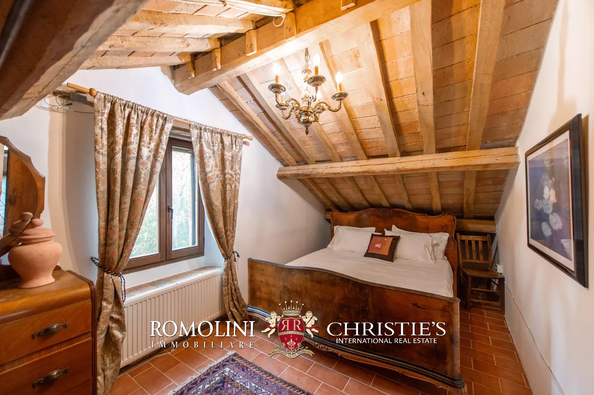 The farmhouse, a 266-m² countryside building with six bedrooms and four bathrooms, spans three floors and can be easily divided into two guest apartments. Renovated in the 1990s by the current owners, it retains rustic charm. The property includes a warehouse, a 3,200-m² garden, and an 8 × 4 m swimming pool with panoramic hill views.