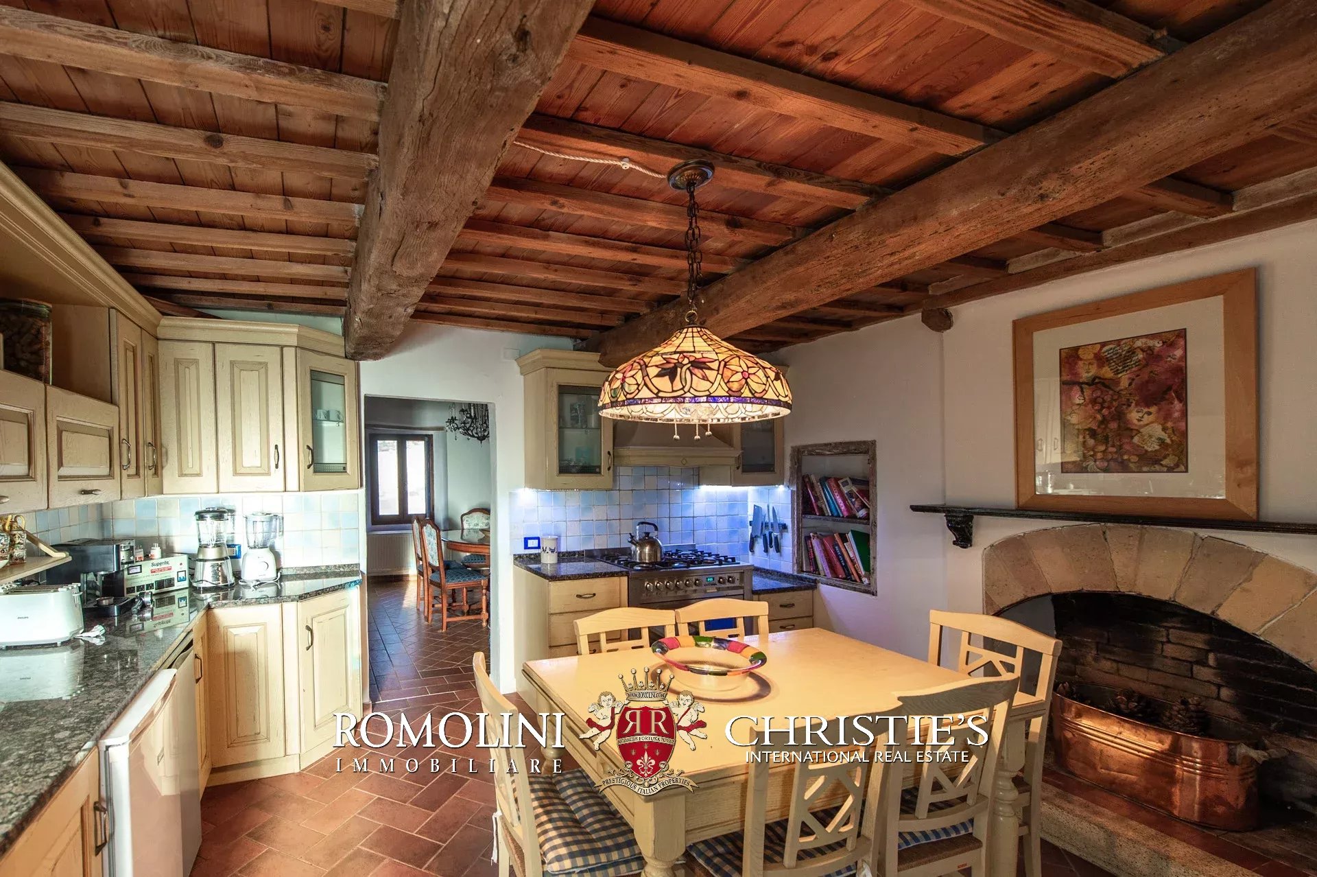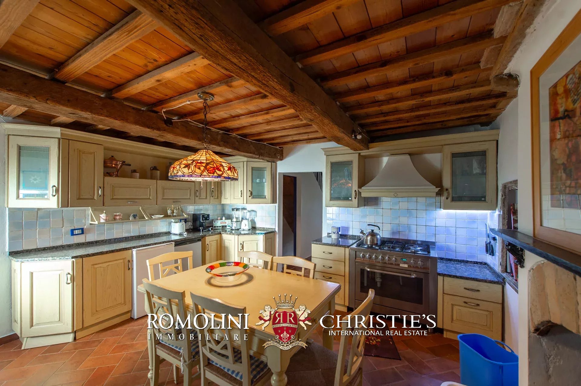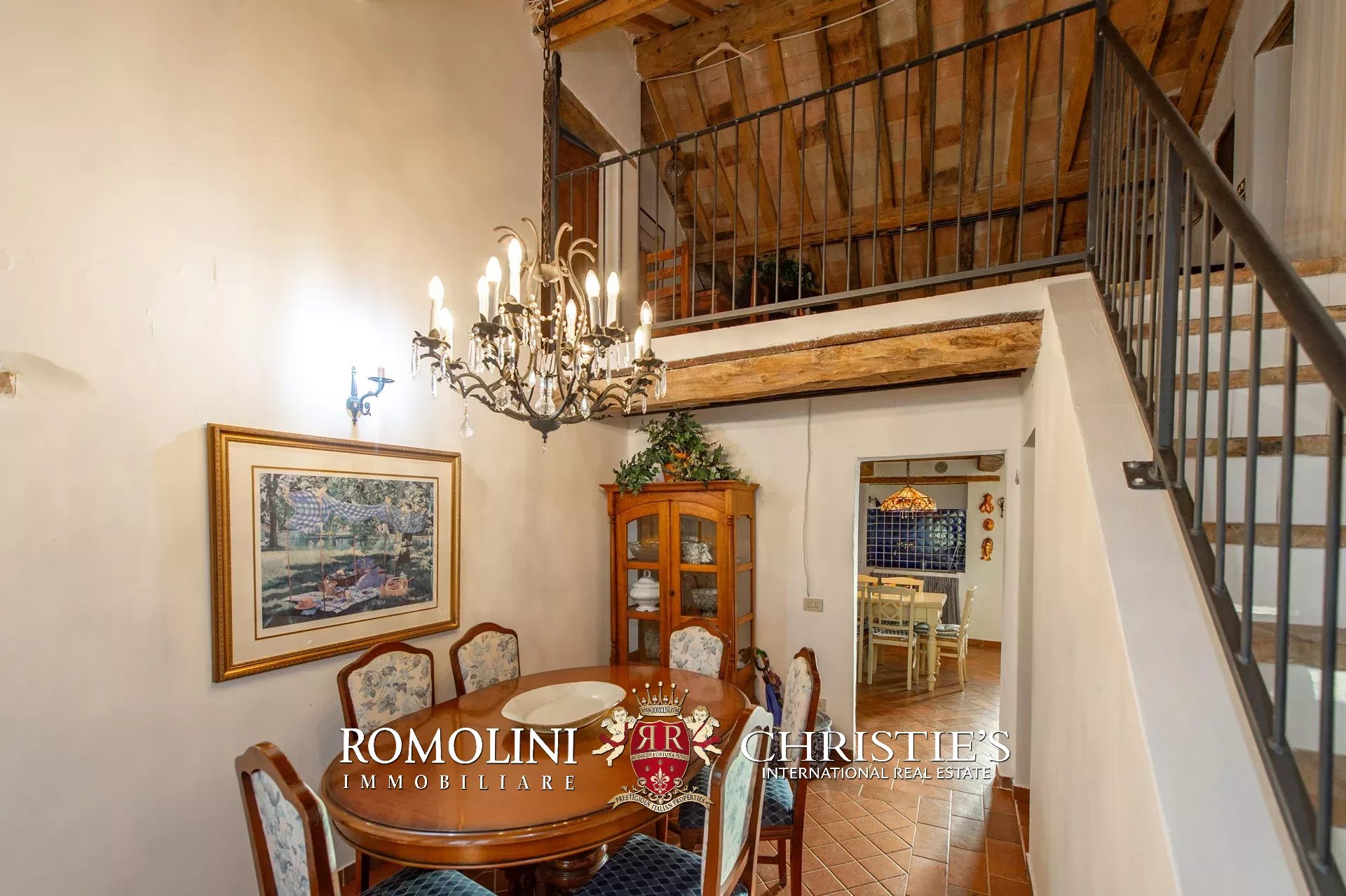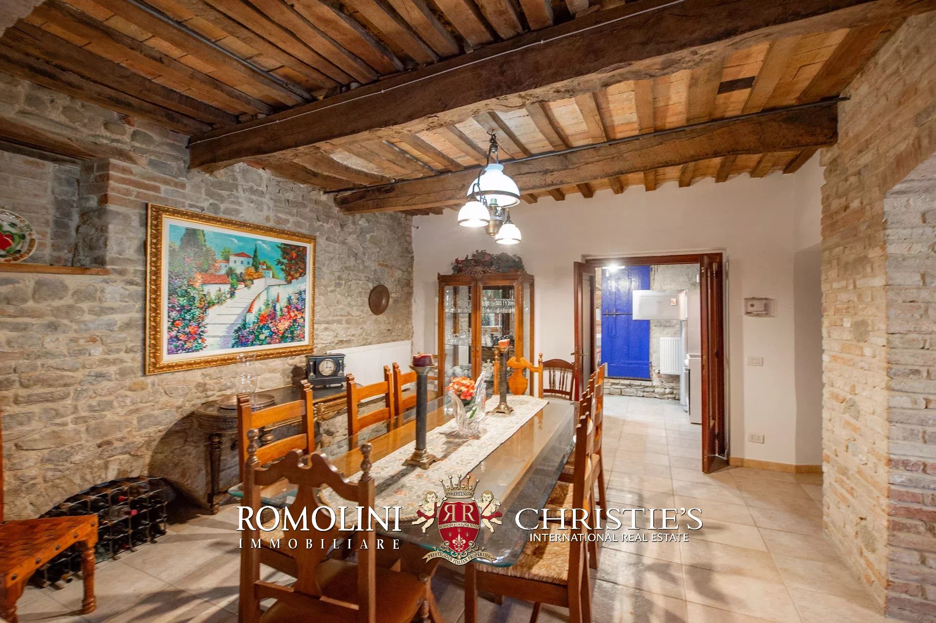 The farmhouse, a 266-m² countryside building with six bedrooms and four bathrooms, spans three floors and can be easily divided into two guest apartments. Renovated in the 1990s by the current owners, it retains rustic charm. The property includes a warehouse, a 3,200-m² garden, and an 8 × 4 m swimming pool with panoramic hill views.