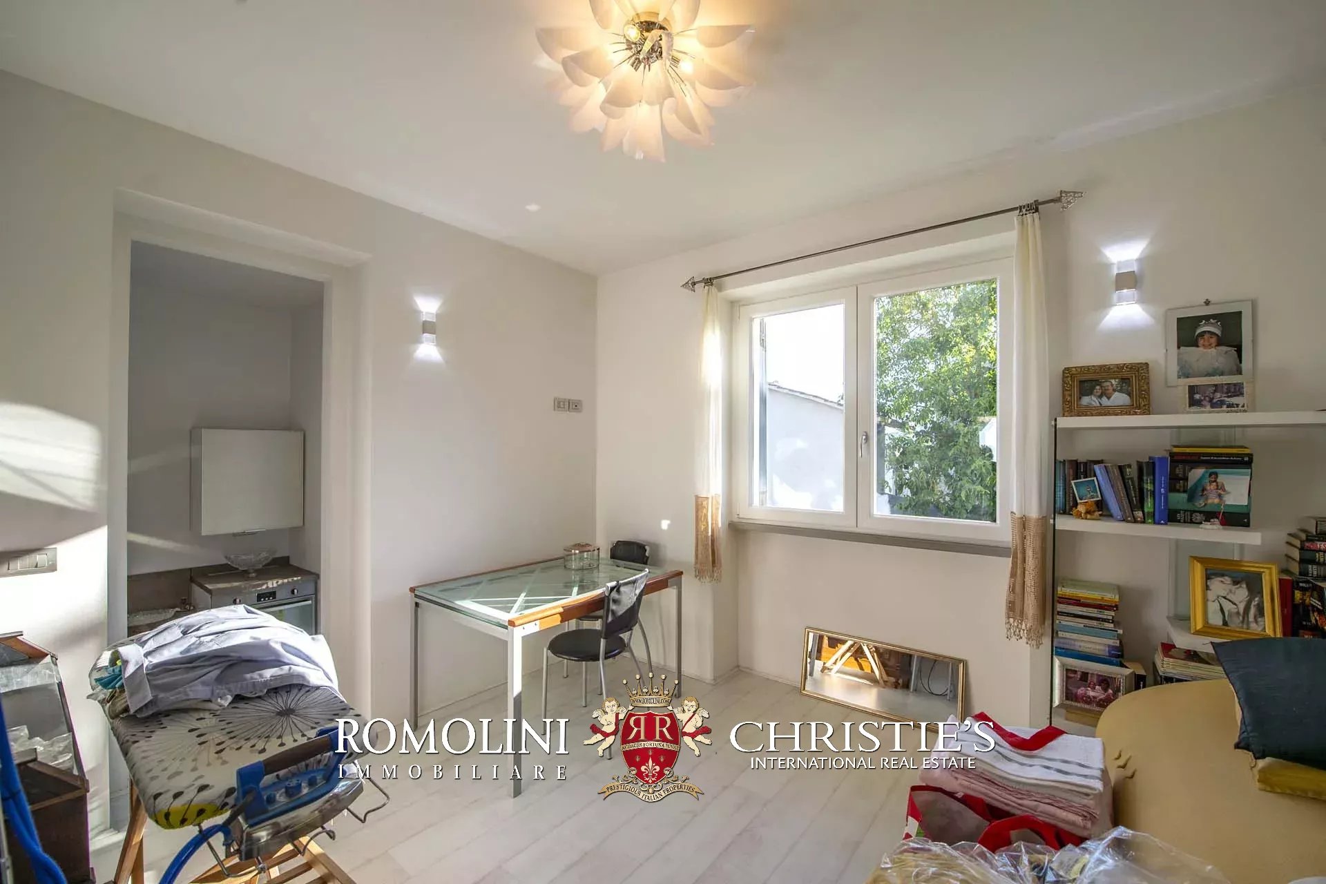 The villa features 300 sqm of outdoor space, almost entirely paved. From the entrance gate, a ramp leads down to the basement where one can find the garage (37 sqm).
