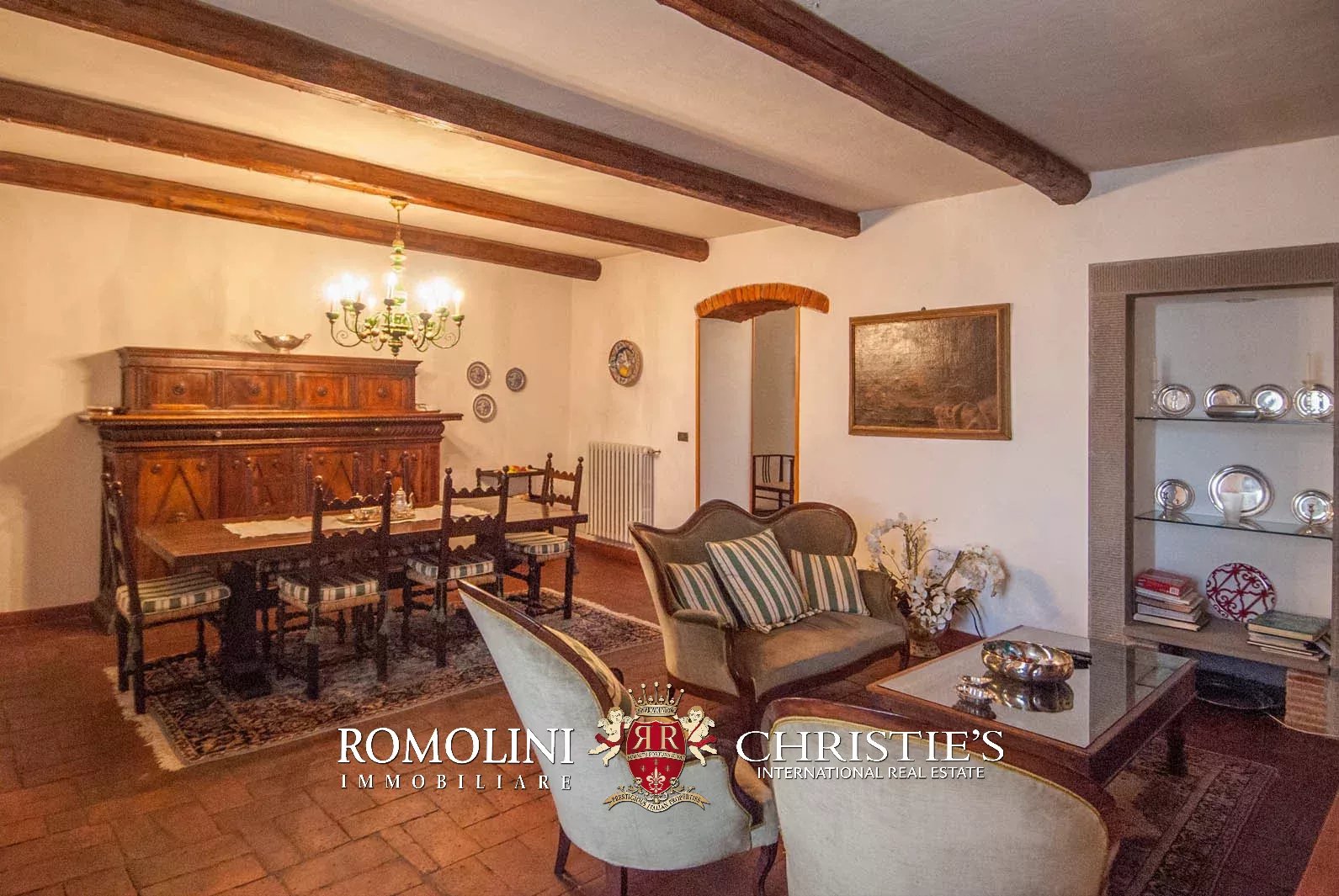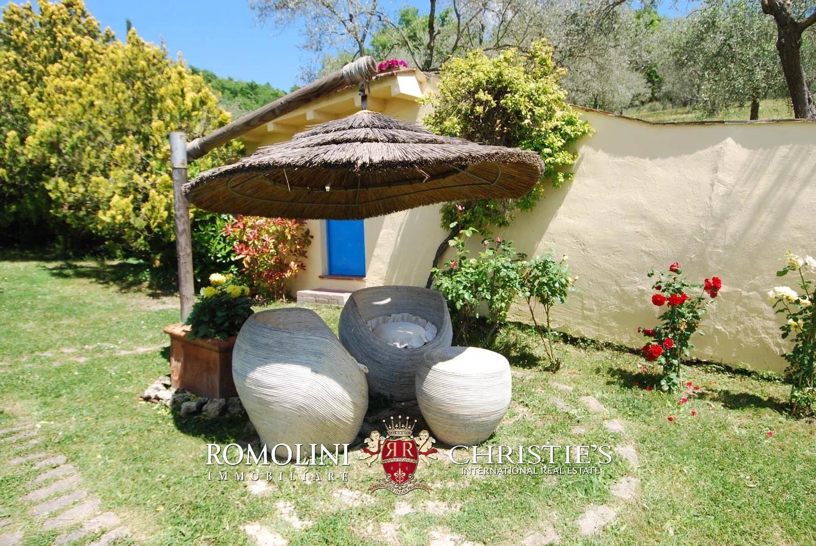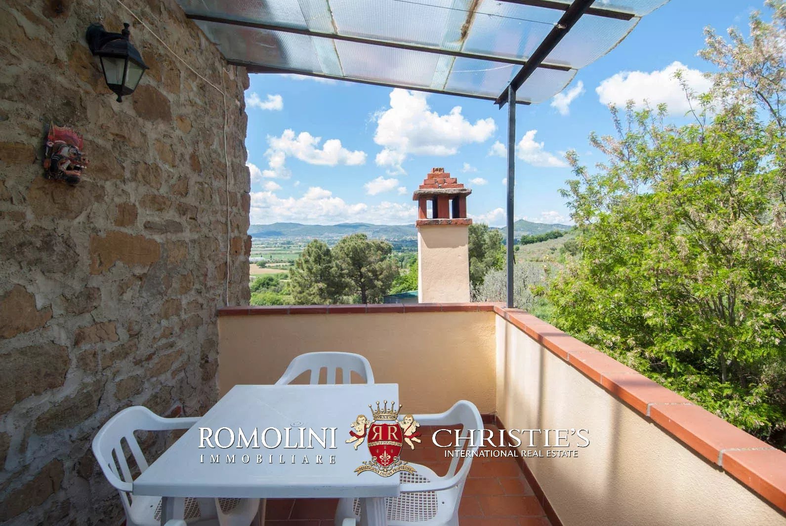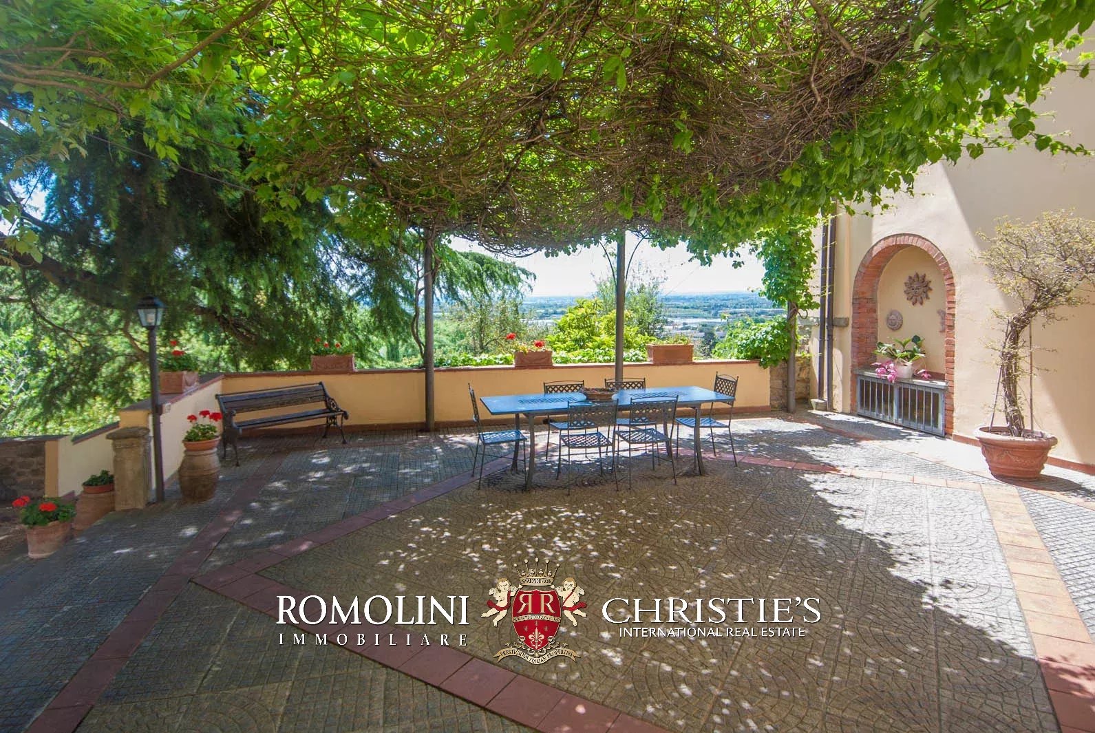 Externally, the villa is surrounded by a fenced land of 1.5 hectares (3.7 acres), partially covered in woodlands and olive grove. The covered terrace at the first floor offers a wonderful vista on the surrounding landscape.