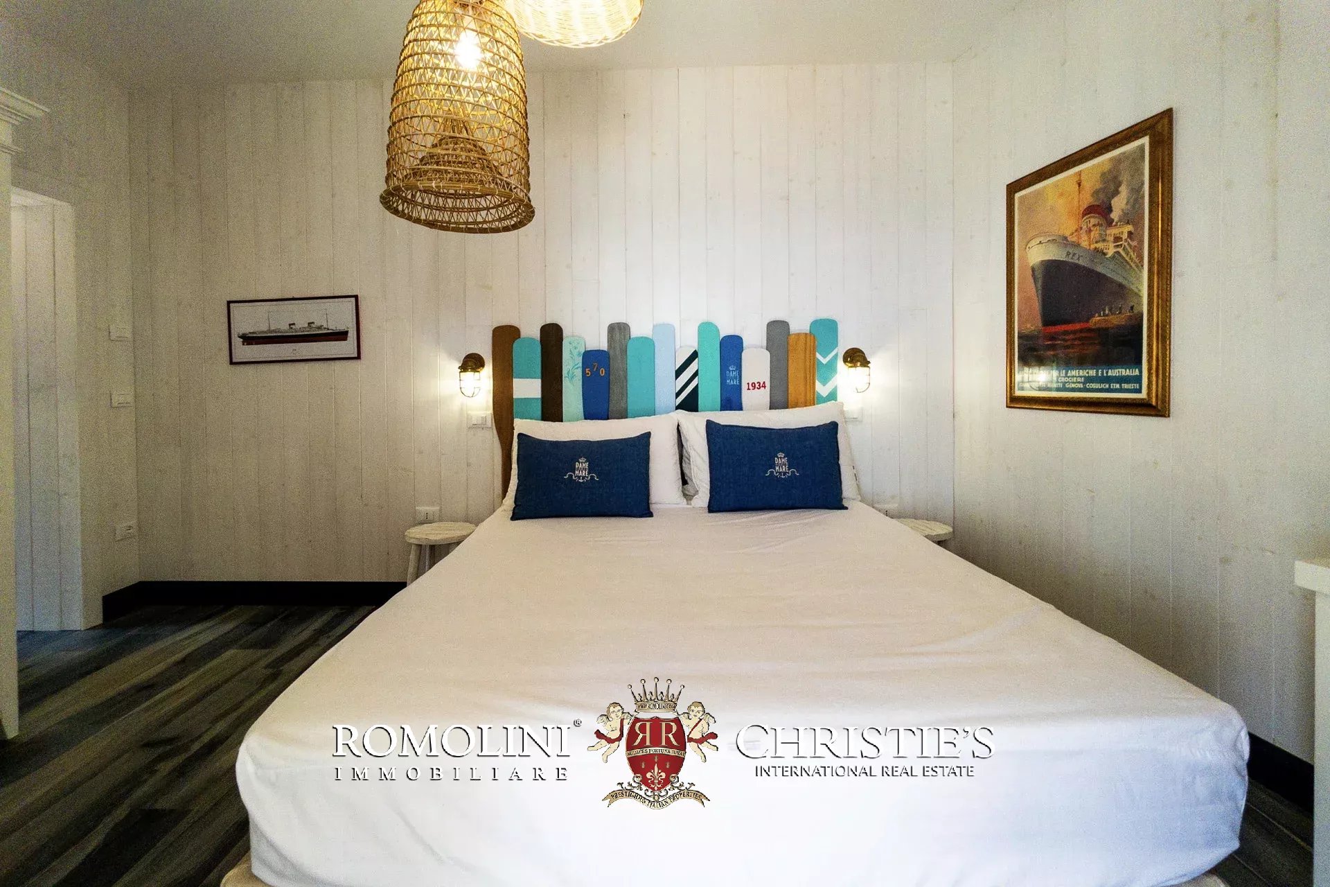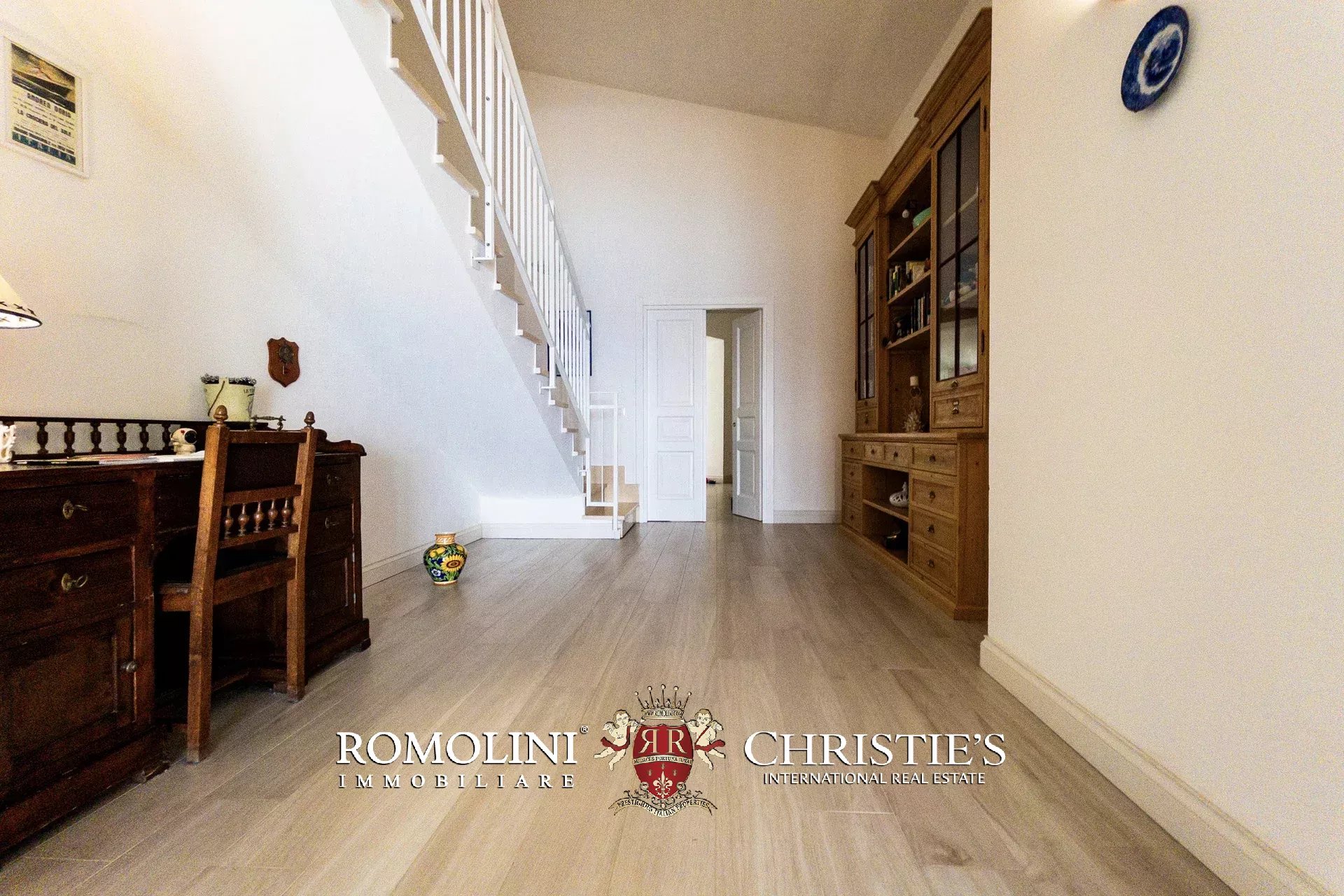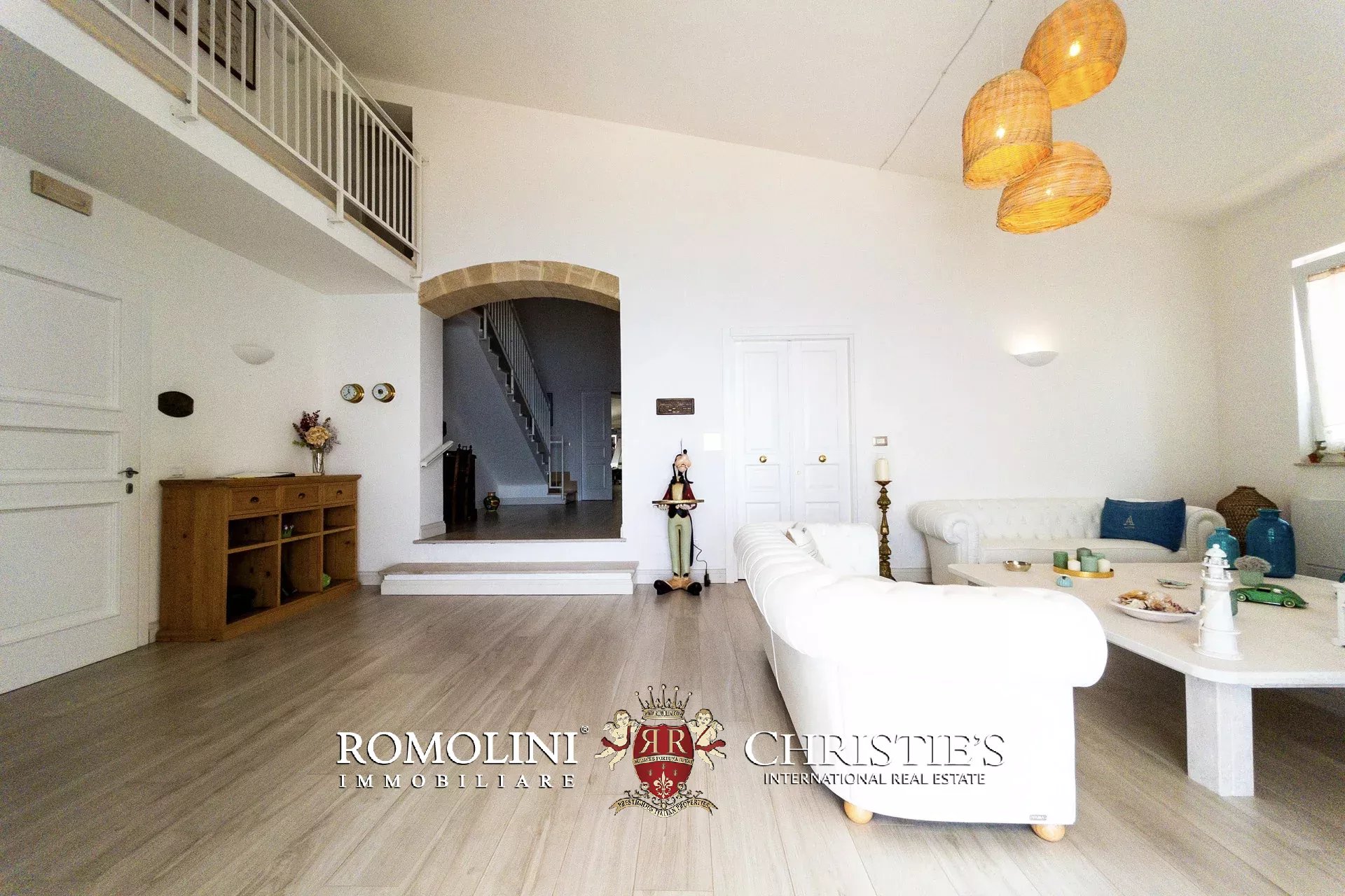 The first floor hosts the heart of the residence: a bright living area consisting of a fully equipped eat-in kitchen, a large dining room, and an elegant living room, characterized by large openings towards a porch with a rare sea view. A large outdoor pathway crosses the property, directly connecting the backyard garden and creating a refined separation between the living area and the sleeping area.