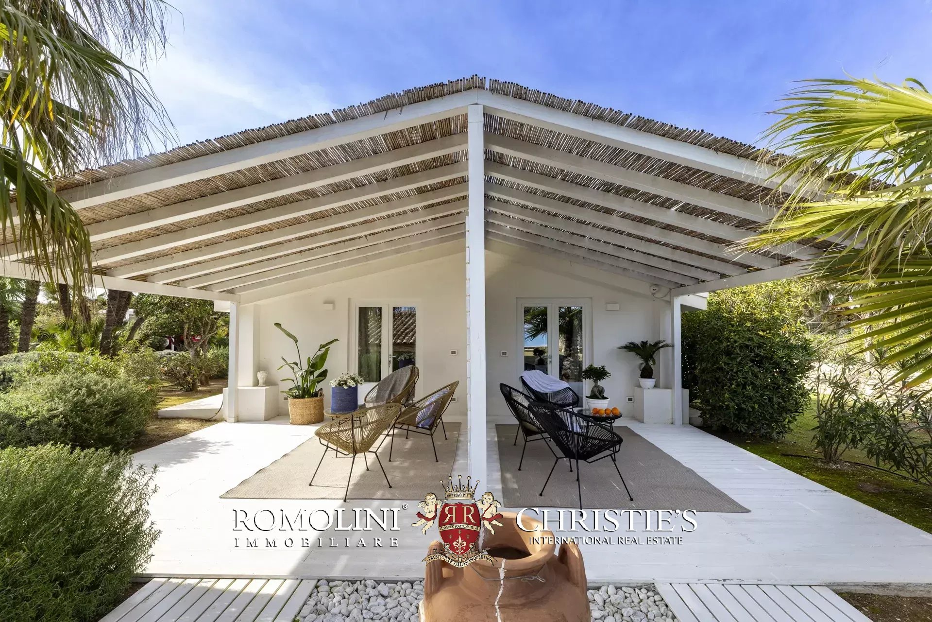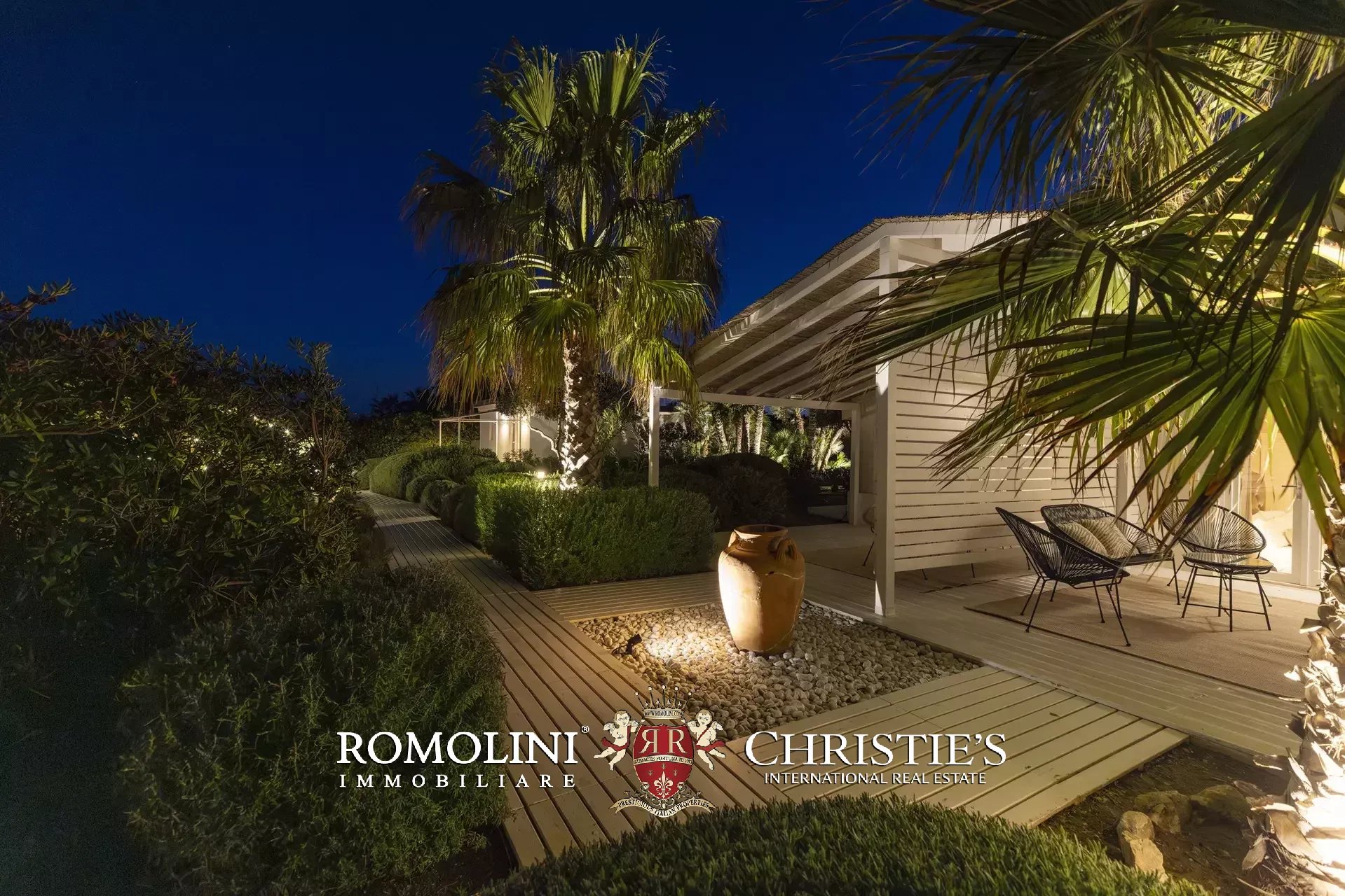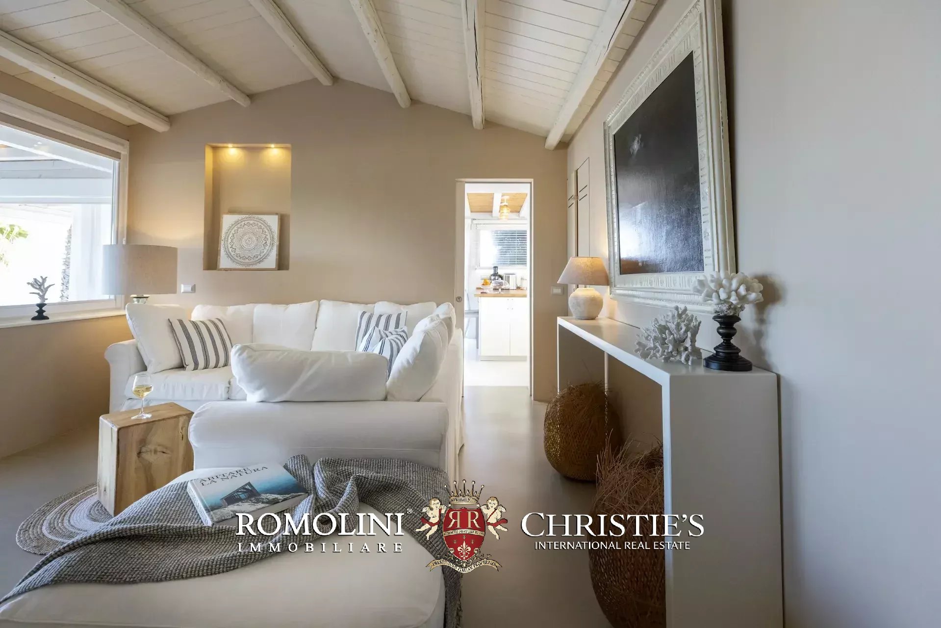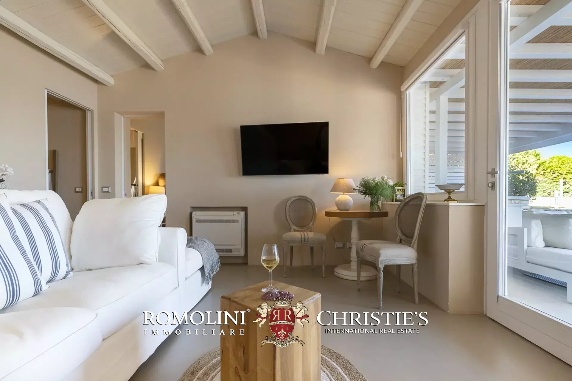 The outdoor spaces, the real strength of the property, extend over approximately 2,700 m² of Mediterranean garden, cared for and rich in aromatic essences, lawns, and seasonal flowering. From the automatic gate, access a large terraced area with covered and uncovered parking spaces, from which wooden walkways, stone pathways, and pebble terraces connect the various housing units. Each room has its own whitewashed wooden private terrace, furnished with shaded areas and spaces dedicated to relaxation.