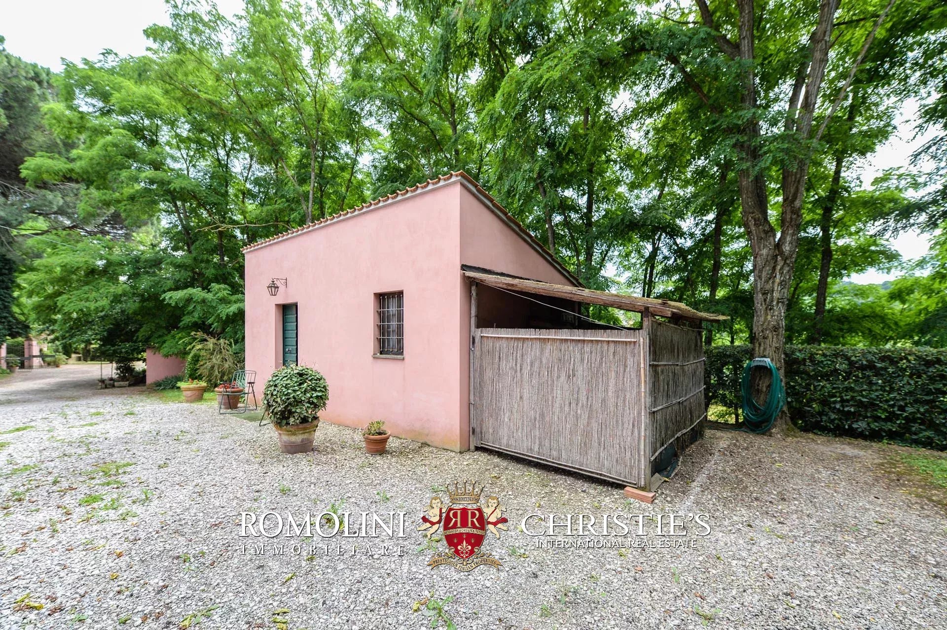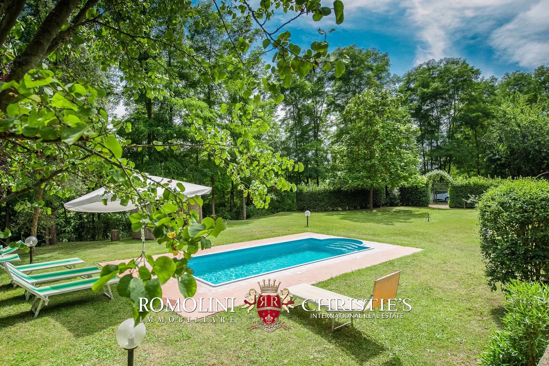 La villa è circondata da 7.200 mq di terreno con un comodo piazzale in ghiaia di fronte alla casa che può essere usato come parcheggio per le auto. Il giardino occupa circa 5.000 mq. A breve distanza dalla casa si trova la piscina 10 x 5 m con solarium in erba circondato da siepi.