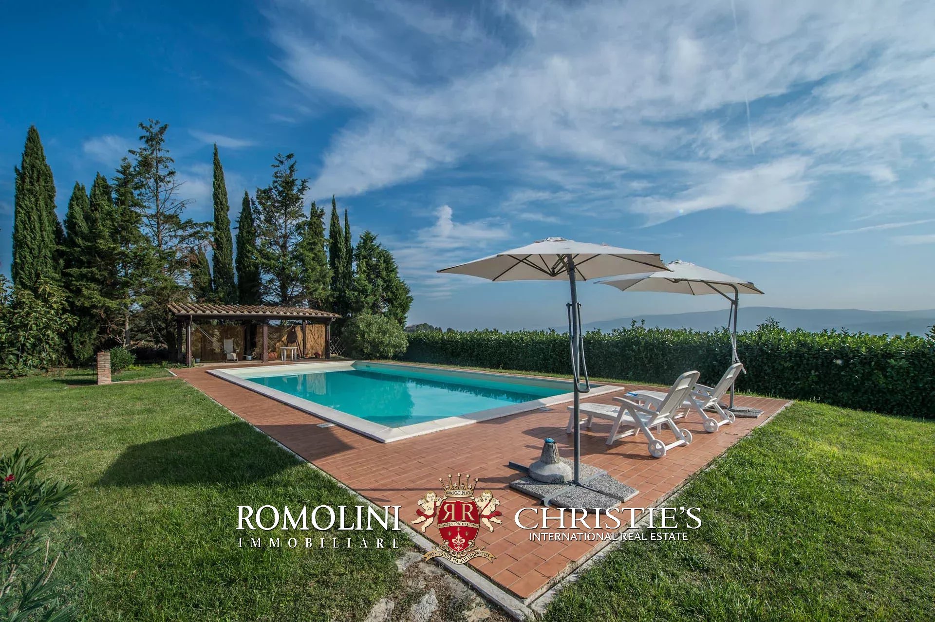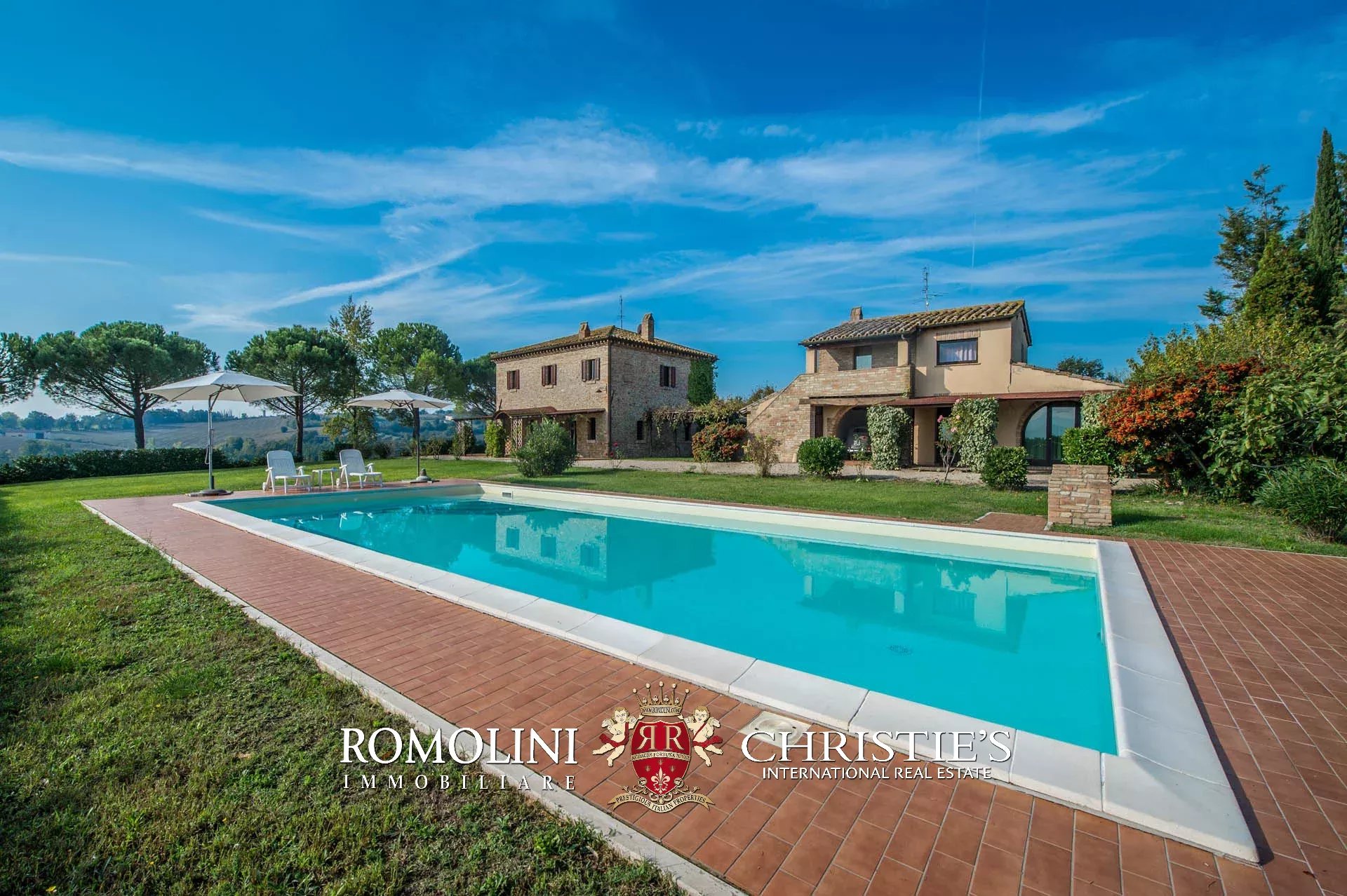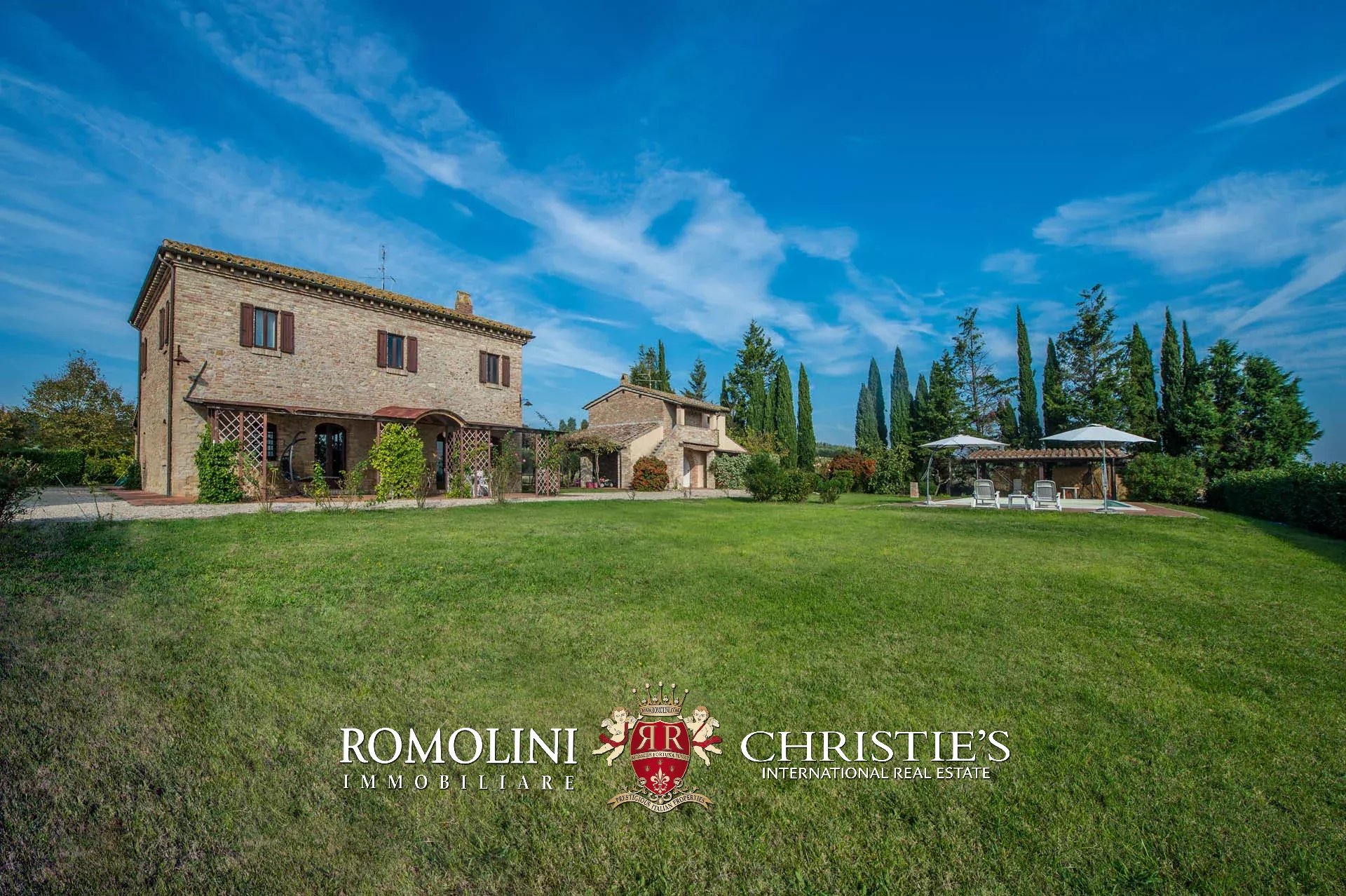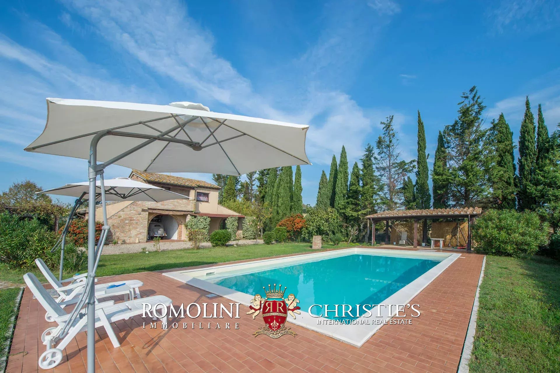 Il casale e la dependance sono dotati entrambi di portico pavimentato. Poco lontano dall’edificio, accanto alla piscina 13 x 6,5 m si trova una pergola in legno. Il giardino, ben curato, circonda il casale e misura circa 4.000 mq.
