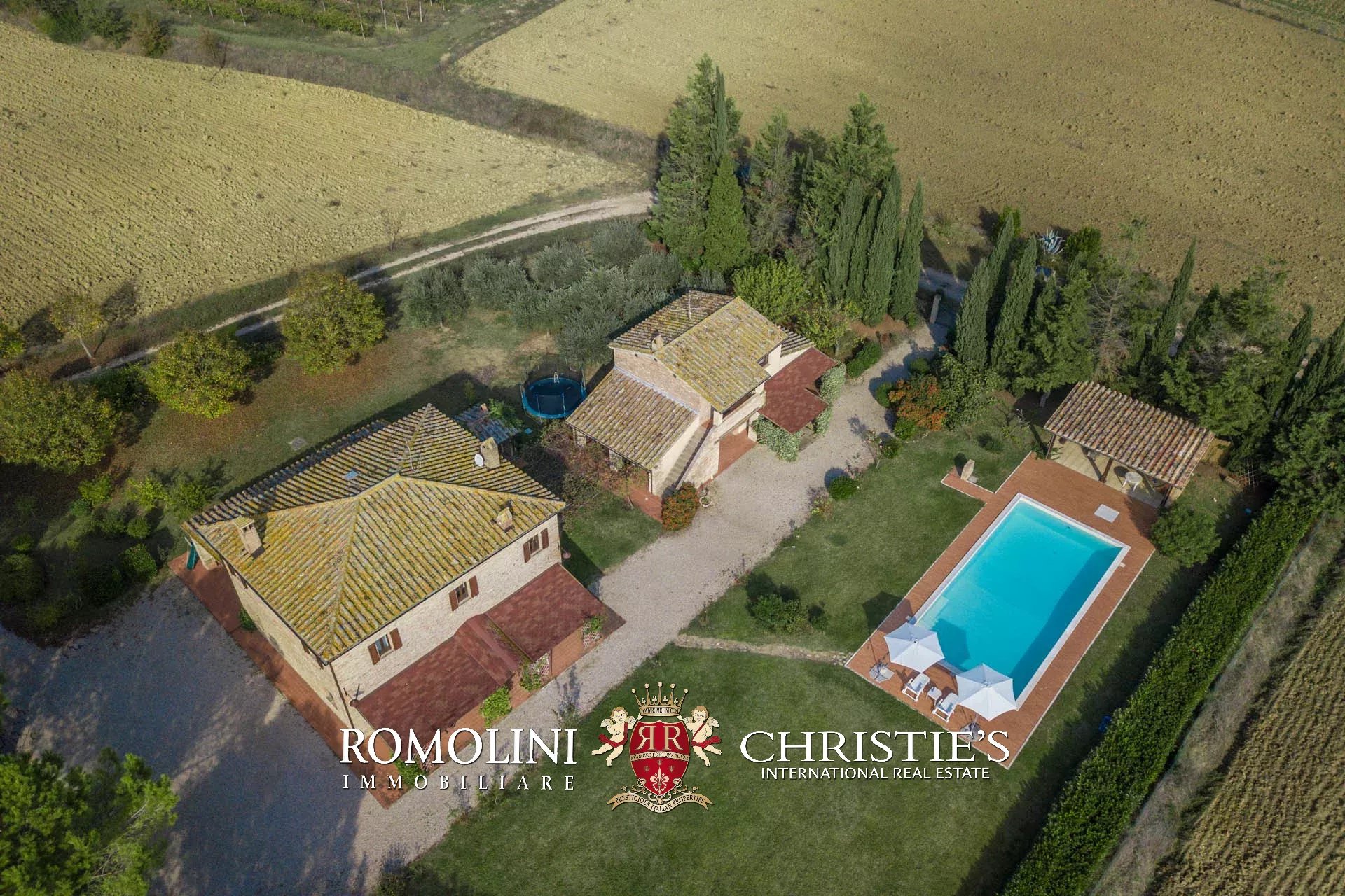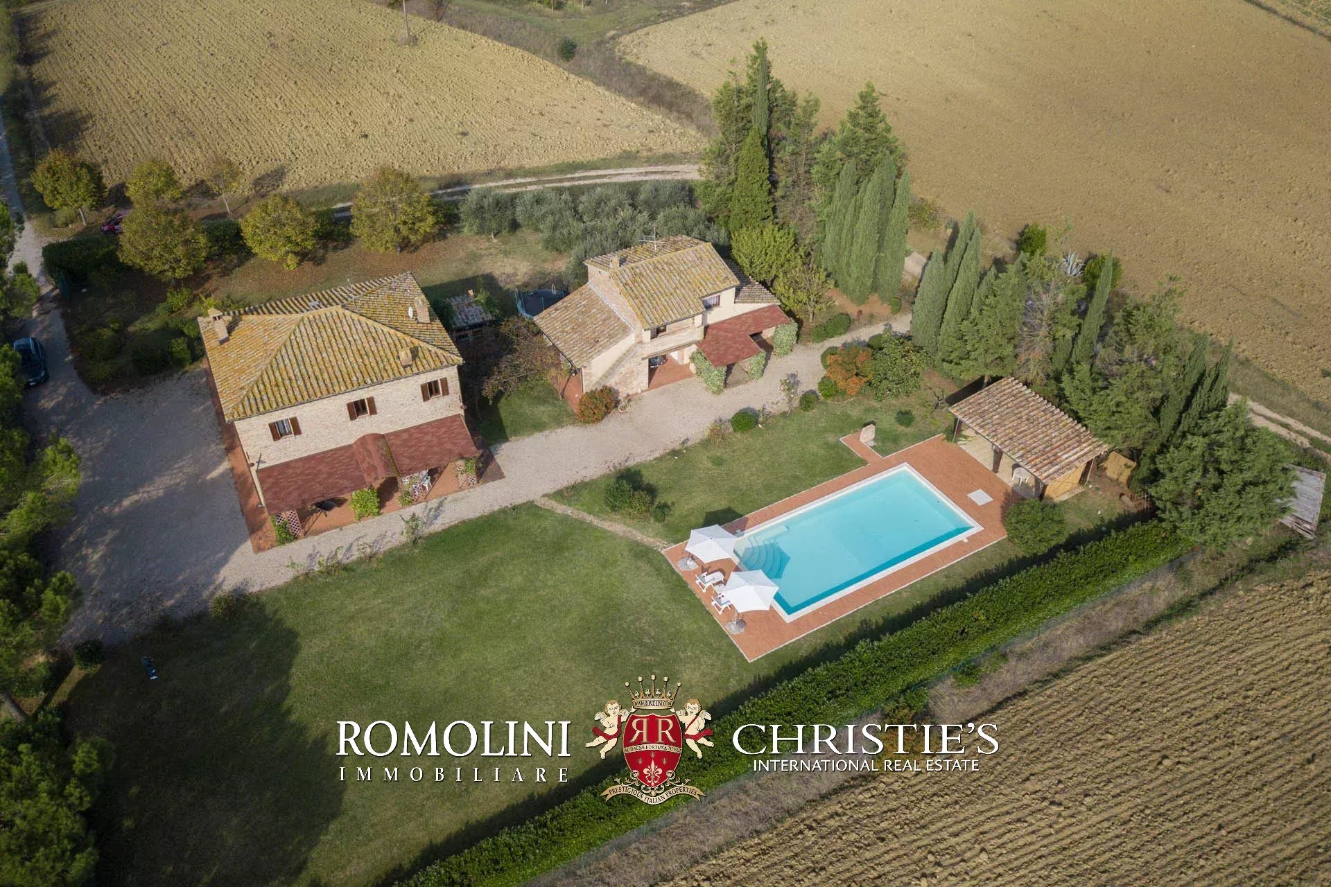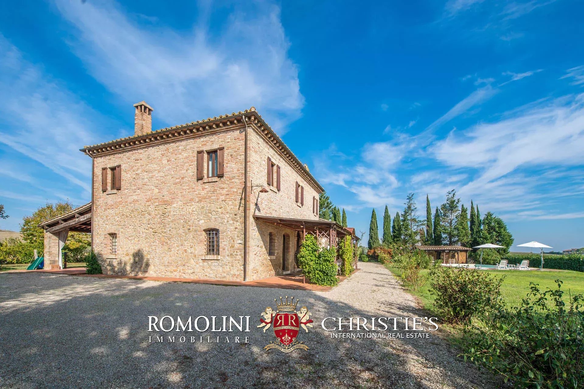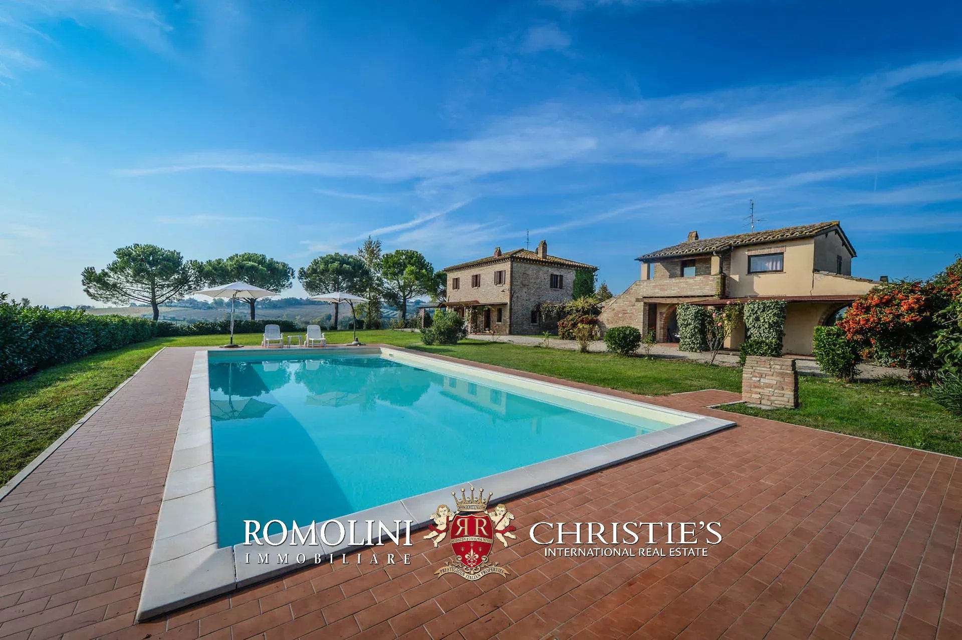 Il casale e la dependance sono dotati entrambi di portico pavimentato. Poco lontano dall’edificio, accanto alla piscina 13 x 6,5 m si trova una pergola in legno. Il giardino, ben curato, circonda il casale e misura circa 4.000 mq.