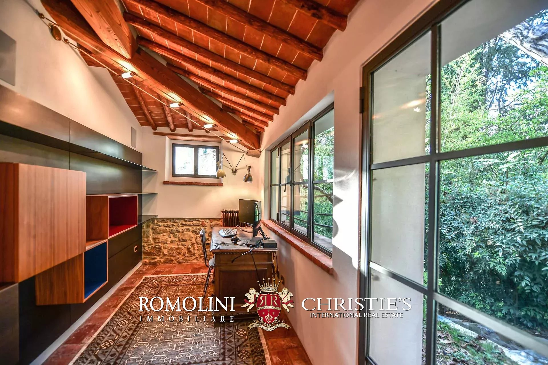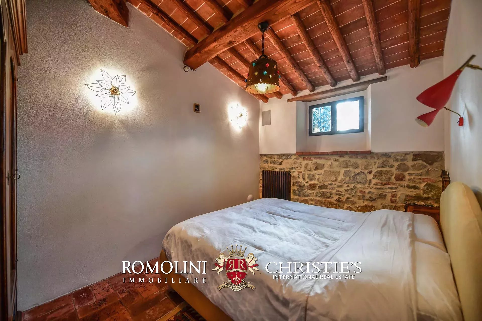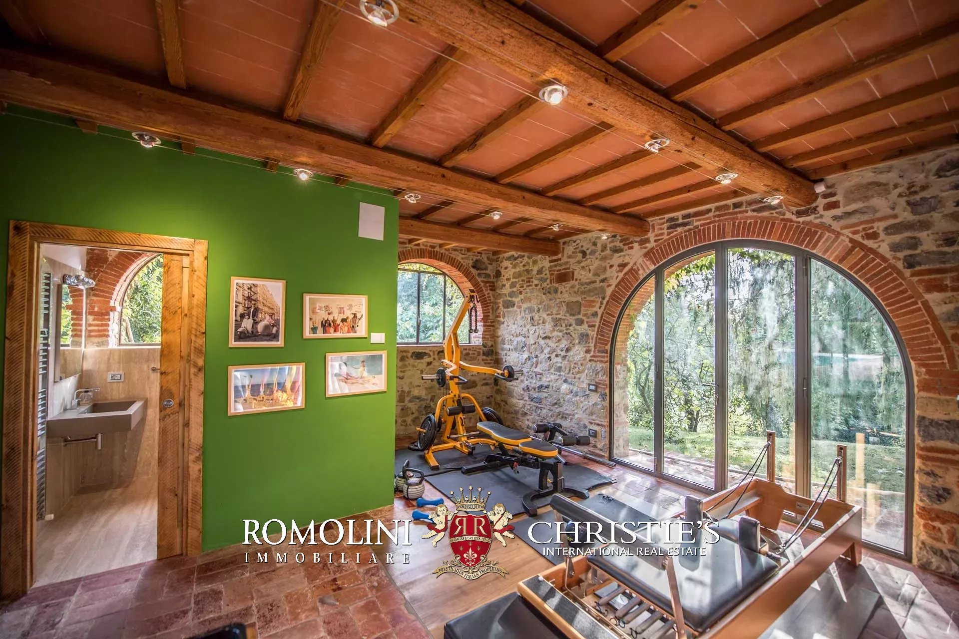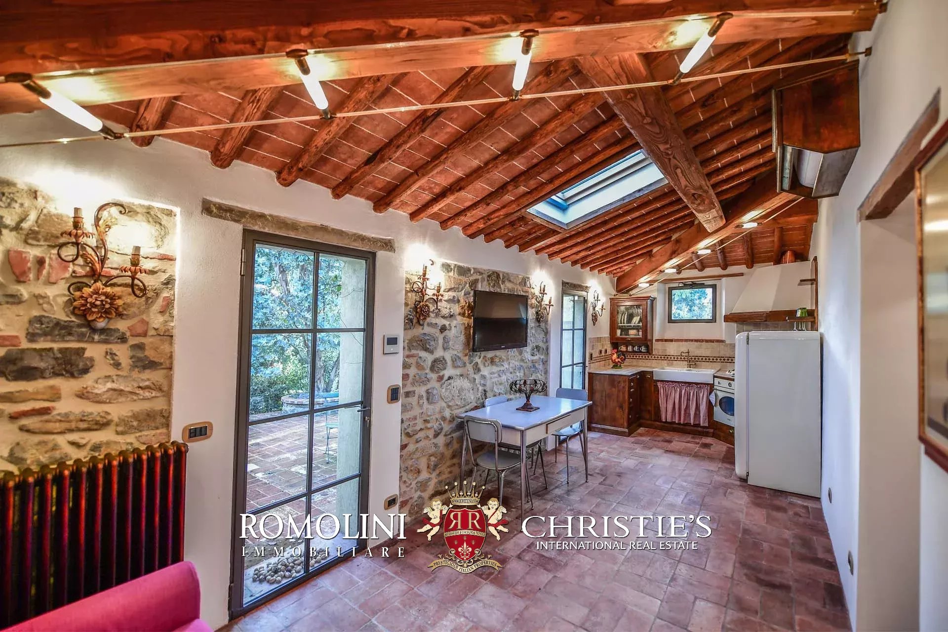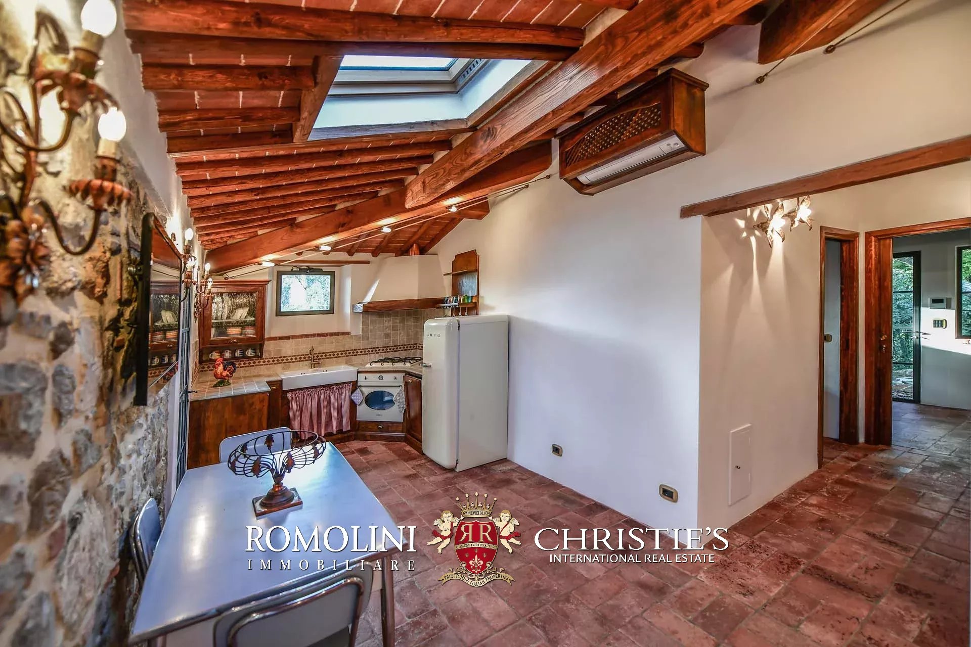 Recentemente ristrutturata dai nuovi proprietari, la villa ha mantenuto il suo aspetto rurale con pavimenti in cotto, travi in legno, archi, un imponente camino in pietra, una scala in pietra, un portico e una loggia chiusa da ampie vetrate che ne permettono l’uso anche in inverno.